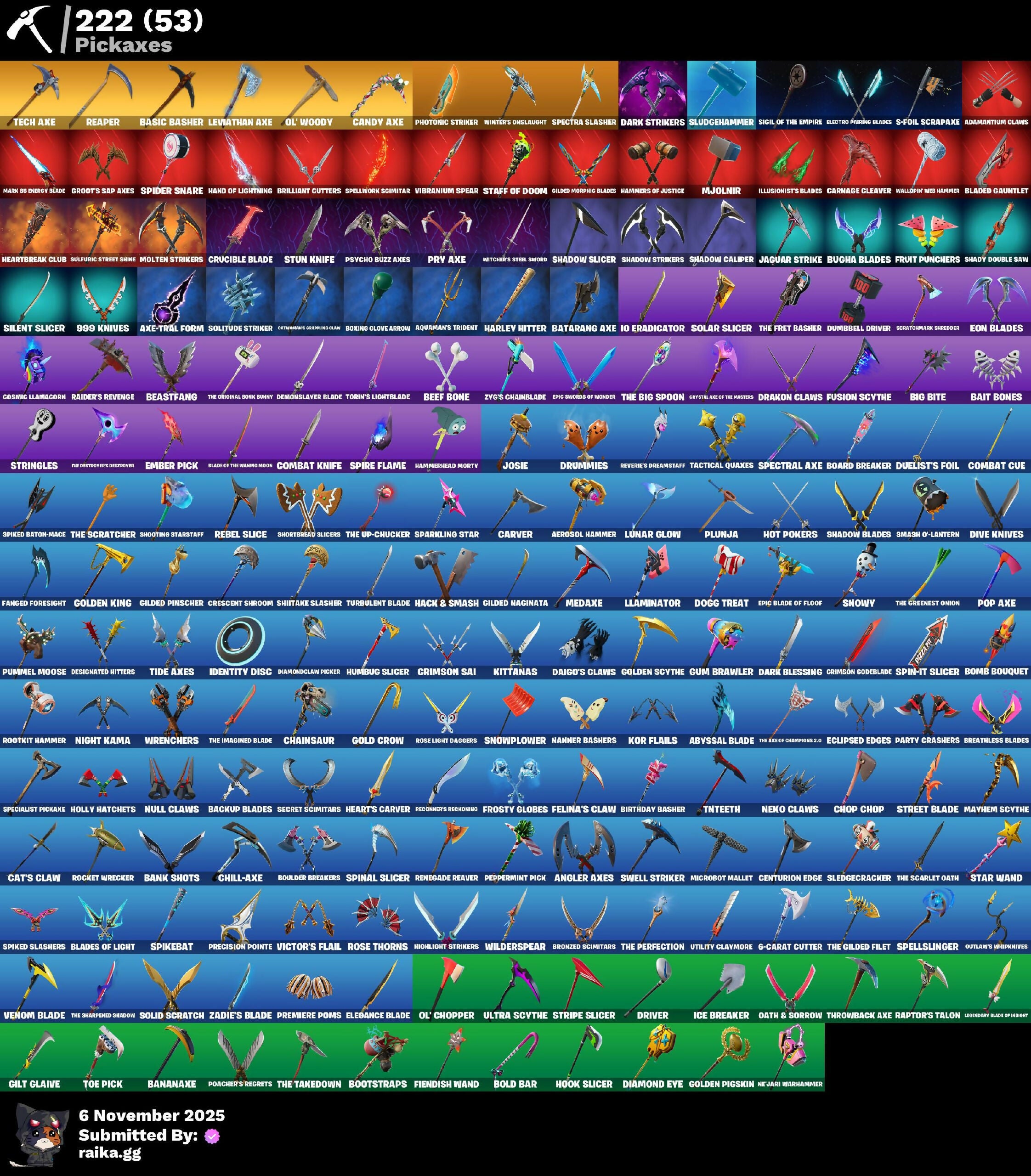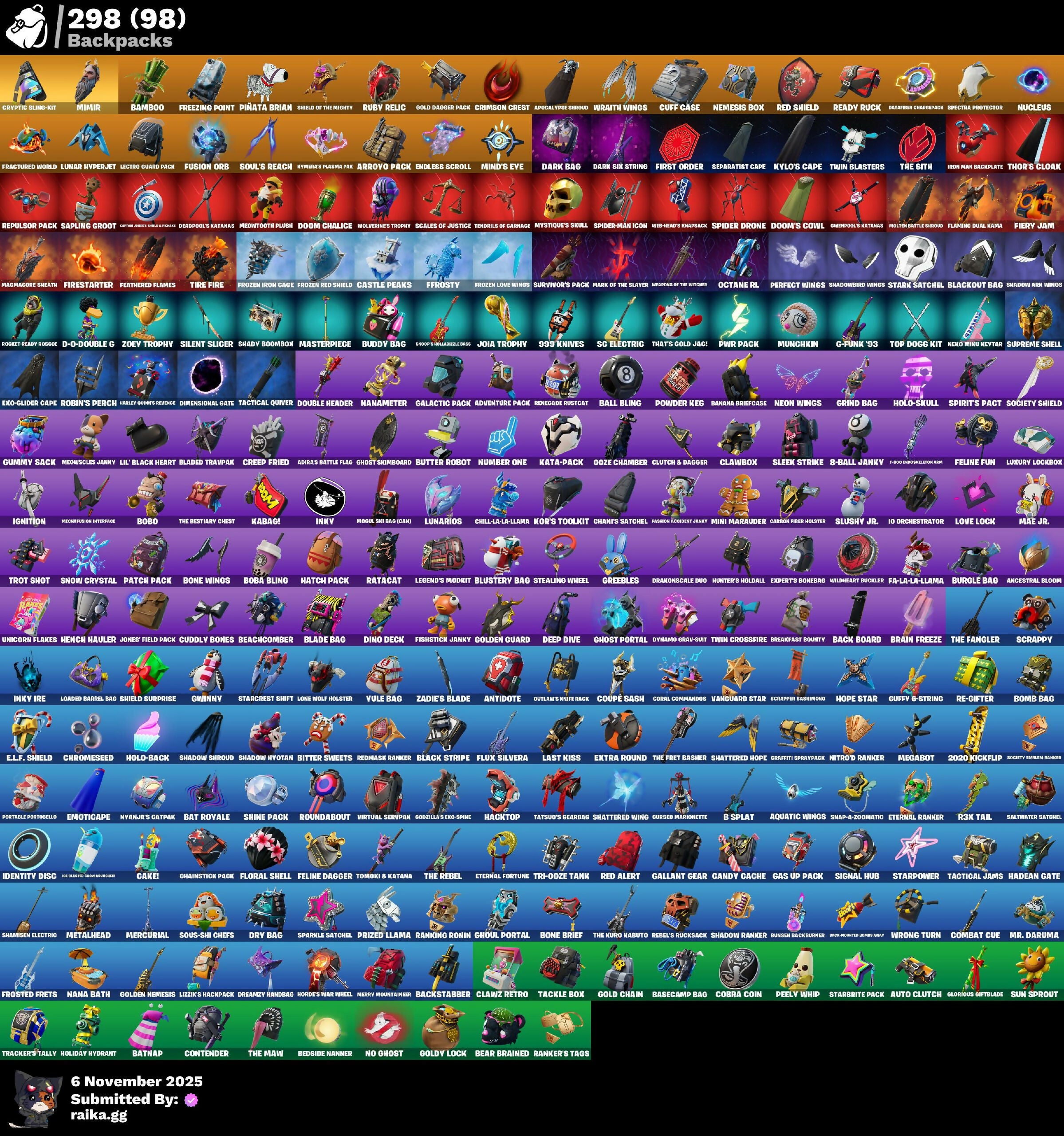 1-Ball, 10 Orchestrator, 2020 Kickflip, 6-Carat Cutter, 7-Boo Endoskeleton Janky, 8-Ball Janky, 8-Ball vs Scratch, 999 Knives, A Warrior Prepares, Absenz, Abyssal Blade, Adamantium Claws, Adira's Battle Flag, Adventure Pack, Aerial Assault Bomber, Aerial Assault Trooper, Aerosol Hammer, Agent Jones, Agent Peely, Air Shredder, All Star, Ancestral Bloom, Andy Fanderson, Angler Axes, Antidote, Antonia, Apocalypse Shroud, Aquaman, Aquaman's Trident, Aquatic Wings, Arctic Adeline, Armored Batman Zero, Arroyo Pack, Assault Trooper, Astro Antidote, Astro Jack, Astroworld Cyclone, Aura, Auto Clutch, Axe-Tral Form, Azaraha Metro Ventights, B Splat, B.R.U.T.E. Gunner, Back Board, Backstabber, Backup Blades, Bait Bones, Balance Board, Ball Bling, Bamboo, Banana Briefcase, Bananaxe, Bank Shots, Baron's Hoard, Basecamp Bag, Basic Basher, Bat Royale, Batarang Axe, Batnap, Battle Call, Beachcomber, Bean Bag, Bear Brained, Beast Boy & Raven, Beastfang, Beatzbunny, Bedside Nanner, Beef Bone, Beep Beep, Behold!, Bhangra Boogie, Big Bite, Big Flake, Billy Bounce, Birthday Basher, Bitter Sweets, Black Stripe, Blackout Bag, Blade Bag, Blade of the Waning Moon, Bladed Gauntlet, Bladed Traypak, Blades of Light, Blaze, Blizzabelle, Blustery Bag, Board Breaker, Boba Bling, Bobo, Boing!, Bold Bar, Bomb Bag, Bomb Bouquet, Bombs Away!, Bone Boss, Bone Brief, Bone Ravage, Bone Wings, Boogie Down, Boomin', Boots 'n' Cats, Bootstraps, Boulder Breakers, Bounce Berry, Boxing Clove Arrow, Boy's A Liar, Brain Freeze, Breakfast Bounty, Breathless Blades, Brilliant Cutters, Bring It Around, Brite Agent, Brite Bomber, Bronzed Scimitars, Brutus, Buckets, Buddy Bag, Bugha, Bugha Blades, Build Up, Bullet Rider, Bullseye, Bundles, Bunsen Backburner, Burgle Bag, Butter Robot, Cairo, Cake!, Call Me, Cameo vs Chic, Candy Axe, Candy Cache, Captain America, Captain America's Shield & Shield's Perch, Carbon Fiber Holster, Cardistry, Carnage, Carnage Cleaver, Carver, Cassidy Quinn, Castle Peaks, Cat's Claw, Catwoman's Grappling Claw, Cauldron Chill, Centurion, Centurion Edge, Chainsaur, Chainstick Pack, Chani, Chani's Satchel, Chaos Agent, Chaos Director, Charlotte, Chill Challenger, Chill-Axe, Chill-La-La-Llama, Choice Knit, Chop Chop, Chrome Punk, Chromeseed, Clara, Clawbox, Clawz Retro, Clean Sweep, Cloudycorn, Cluck, Clutch, Clutch & Dagger, Cobra Coin, Codename E.L.F., Coffin, Coin Flip, Combat Cue, Combat Knife, Commandline, Commando, Contender, Coral Commandos, Coral Cruiser, Cosmic Llamacorn, Coupé Sash, Crabby, Crack It, Creep Fried, Crescent Shroom, Crimson Codeblade, Crimson Crest, Crimson Sai, Crowning Achievement, Crucible Blade, Cryptic Coaster, Cryptic Sling-kit, Crystal Axe of the Masters, Cuddly Bones, Cuff Case, Curling Iron, Cursed Marionette, Cyclo Curl, D-O-Double G, Dagger Dance, Daigo, Daigo's Claws, Dark Angular Shift, Dark Bag, Dark Blessing, Dark Bomber, Dark Doggo, Dark Power Choro, Dark Six String, Dark Strikers, Datafiber Chargepack, Daughter Of Thanos, Dazzle, Deadpool, Deadpool's Katanas, Deep Dive, Demonslayer Blade, Desert Dominator, Designated Hitters, Diamond Diva, Diamond Eye, Diamond Throne, Diamondclaw Picker, Dice Roll, Dimensional Gate, Dino Deck, Direct Hit, Diva Fever, Dive Knives, Dizzie, Do The Split, Doctor Doom, Doctor Slone, Dogg Treat, Don't Start Now, Doom Chalice, Doom Slayer, Doom's Cowl, Double Header, Doublecross, Doze Dab, Drakon Claws, Drakon Steel Hybrid, Drakonscale Duo, Dream, Dreamzy Handbag, Drive Shaft, Driver, Droop, Drummies, Dry Bag, Duelist's Foil, Dumbbell Driver, Dummy, Durrr Taisho, Dusty, Dynamo Grav-Suit, Dynamo Tntina, D’ark, E.L.F. Shield, Eclipsed Edges, Electro Pairing Blades, Electro Shuffle, Electro Swing, Elegance Blade, Ember Pick, Emoticape, Empty Out Your Pockets, Endless Scroll, Eon Blades, Epic Blade of Floof, Epic Swords of Wonder, Eternal Fortune, Eternal Ranker, Evasive Maneuvers, Exo-Glider Cape, Expert's Bonebag, Explorer Emilie, Extra Round, Fa-La-La-Llama, Fabio Sparklemane, Fade, Fanged Foresight, Fashion & Accident Janky, Feathered Flames, Felina, Felina's Claw, Feline Dagger, Feline Fun, Festival Phaedra, Fiendish Wand, Fiery Jam, Finger Wag, Firestarter, First Order, First Order Stormtrooper, Fish Thicc, Fishskull, Fishstick, Fishstick Janky, Fist Bump, Flaky Feast, Flaming Dual Kama, Flashback Breakdown, Flippin' Away, Floral Shell, Flux Silvera, Focused, Foil Flex, Fractured World, Freezing Point, Fright Funk, Front Page Pose, Frostbite, Frosted Frets, Frosty, Frosty Globes, Frozen Fishstick, Frozen Iron Cage, Frozen Love Ranger, Frozen Love Wings, Frozen Nog Ops, Frozen Raven, Frozen Red Knight, Frozen Red Shield, Fruit Punchers, Fusion, Fusion Orb, Fusion Scythe, G-Funk '93, Galactic Pack, Galaxia, Galaxy Scout, Gallant Gear, Gas Up Pack, Gear Specialist Maya, Geralt of Rivia, Get Griddy, Get Loose, Ghost Portal, Ghost Skimboard, Ghoul Portal, Ghoul Trooper, Gilded Morphic Blades, Gilded Naginata, Gilded Pinscher, Gildhart, Gilt Glaive, Gingerbread Raider, Glorious Giftblade, Go Mufasa, Godzilla Evolved, Godzilla's Exo-Spine, Gold Chain, Gold Crow, Gold Dagger Pack, Gold Kratos, Golden Guard, Golden King, Golden Nemesis, Golden Pigskin, Golden Scythe, Goldy Lock, Graffiti Spraypack, Greebles, Green Arrow, Grimoire, Grind, Grind Bag, Groot, Groot's Sap Axes, Guff Gringle, Guffy 6-String, Guggimon, Guild, Gum Brawler, Gumbo, Gummy Sack, Gwenpool's Katanas, Gwinnvy, Hack & Smash, Hacktop, Hadean Gate, Hammerhead Morty, Hammers of Justice, Hand of Lightning, Hand-Forged, Hang Loose Celebration, Harley Hitter, Harley Quinn's Red Bike, Harlowe, Haruka of the Maghi, Hatch Pack, Have A Seat, Haven, HaxSaur, Head Banger, Heart Sign, Heart's Carver, Heartbreak Club, Heartbreak Ranger, Heartbreak Shuffle, Heartburst, Helichopper, Helsie, Hench Hauler, Hero Baymax, High Five, Highlight Strikers, Holiday Boxy, Holiday Hydrant, Holly Hatchets, Holo-Back, Holo-Skull, Hook Slicer, Hope, Hope Star, Horde's War Wheel, Hot Headed, Hot Pokers, Hot Stuff, Hu