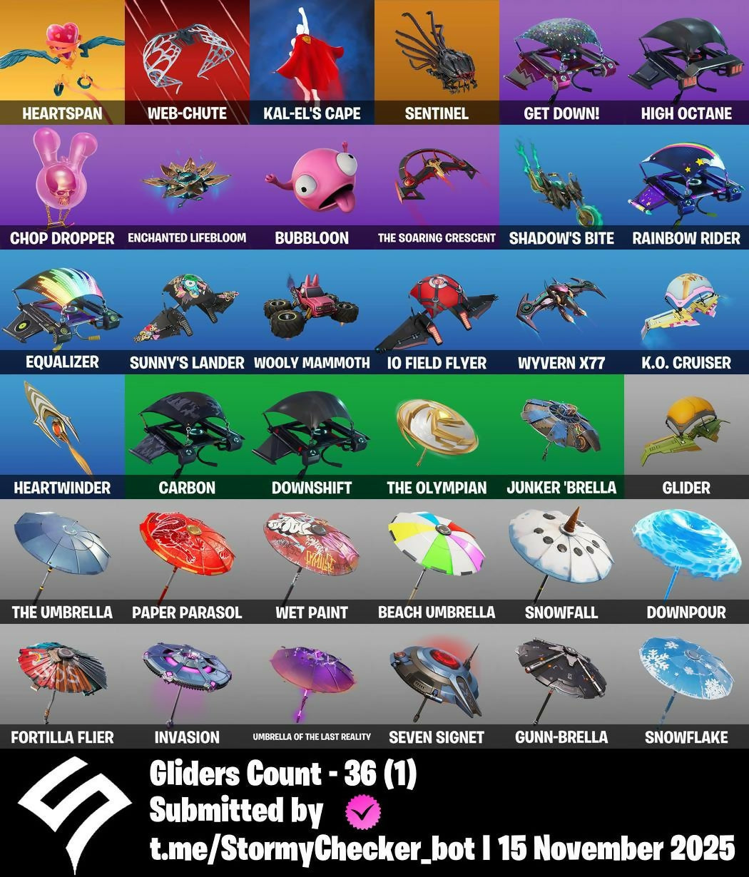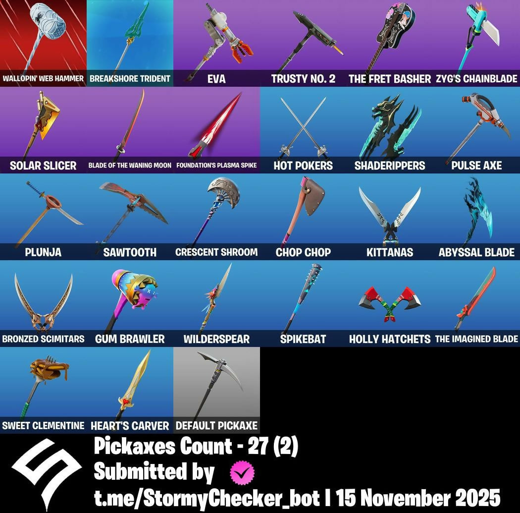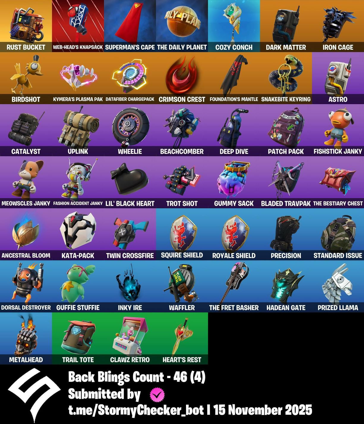 Absenz, Abyssal Blade, Ancestral Bloom, Aphrodite, Astro, Beach Umbrella, Beachcomber, Best Mates, Birdshot, Blade Of The Waning Moon, Bladed Travpak, Blue Squire, Breakshore Trident, Bronzed Scimitars, Bubbloon, Burnout, Carbon, Catalyst, Cerberus, Choice Knit, Chop Chop, Chop Dropper, Clark Kent, Clawz Retro, Clean Sweep, Conch Call, Contract Giller, Cozy Conch, Crackshot, Crescent Shroom, Crimson Crest, Crowning Achievement, Cuddle Hearts, Cyclo Curl, Dance Moves, Dark Matter, Dark Voyager, Datafiber Chargepack, Deep Dive, Default Pickaxe, Dorsal Destroyer, Downpour, Downshift, Elite Agent, Enchanted Lifebloom, Equalizer, Eva, Fashion Accident Janky, Fishstick Janky, Flippin' Away, Flippin' Sexy, Fncs Fit, Fortilla Flier, Foundation's Mantle, Foundation's Plasma Spike, Fresh, Gentleman's Dab, Get Down!, Glider, Golf Clap, Guffie Stuffie, Guggimon, Gum Brawler, Gumbo, Gummy Sack, Gunn-Brella, Hadean Gate, Harlowe, Haven, Heart Sign, Heart's Carver, Heart's Rest, Heartspan, Heartwinder, High Octane, Holly Hatchets, Hot Pokers, I Declare!, IO Field Flyer, Inky Ire, Invasion, Iron Cage, It's... You?, Jubilation, Junker 'Brella, K.O. Cruiser, Kal-El's Cape, Kata-Pack, Kittanas, Kymera, Kymera's Plasma Pak, Lil' Black Heart, Lil' Monster, Lil' Saucer, Love It!, Lt. John Llama, Lunar Charge, Make A Seat, Make It Rain, Meowscles Janky, Metalhead, Mission Specialist, Moonwalker, Mwahaha, Nailed It, Orange Justice, Paper Parasol, Patch Pack, Plunja, Pony Up, Poseidon, Precision, Prized Llama, Pulse Axe, Pure Salt, Rainbow Rider, Raven, Regal Wave, Respect The Peace, Ride The Pony, Rock Paper Scissors, Rocket Rodeo, Rogue Agent, Ronin, Royale Knight, Royale Shield, Rust Bucket, Rust Lord, Salute, Sawtooth, Sentinel, Seven Signet, Shadebox, Shaderippers, Shadow's Bite, Shanta, Ska-stra-terrestrial, Slow Clap, Snakebite Keyring, Snowfall, Snowflake, Solar Slicer, Spider-Man, Spikebat, Squire Shield, Standard Issue, Sunny, Sunny's Lander, Superman's Cape, Sweet Clementine, Sweet Swing, Take A 'Bow, Take The L, Team Mech, Team Monster, The Bestiary Chest, The Daily Planet, The Foundation, The Fret Basher, The Imagined Blade, The Olympian, The Reaper, The Robot, The Soaring Crescent, The Umbrella, The Worm, Trail Tote, Trot Shot, Trusty No. 2, Twin Crossfire, Umbrella Of The Last Reality, Uplink, Waffler, Wallopin' Web Hammer, Wave, Web-Chute, Web-Head's Knapsack, Wet Paint, Wheelie, Wilderspear, Wooly Mammoth, Wyvern X77, Zyg's Chainblade
