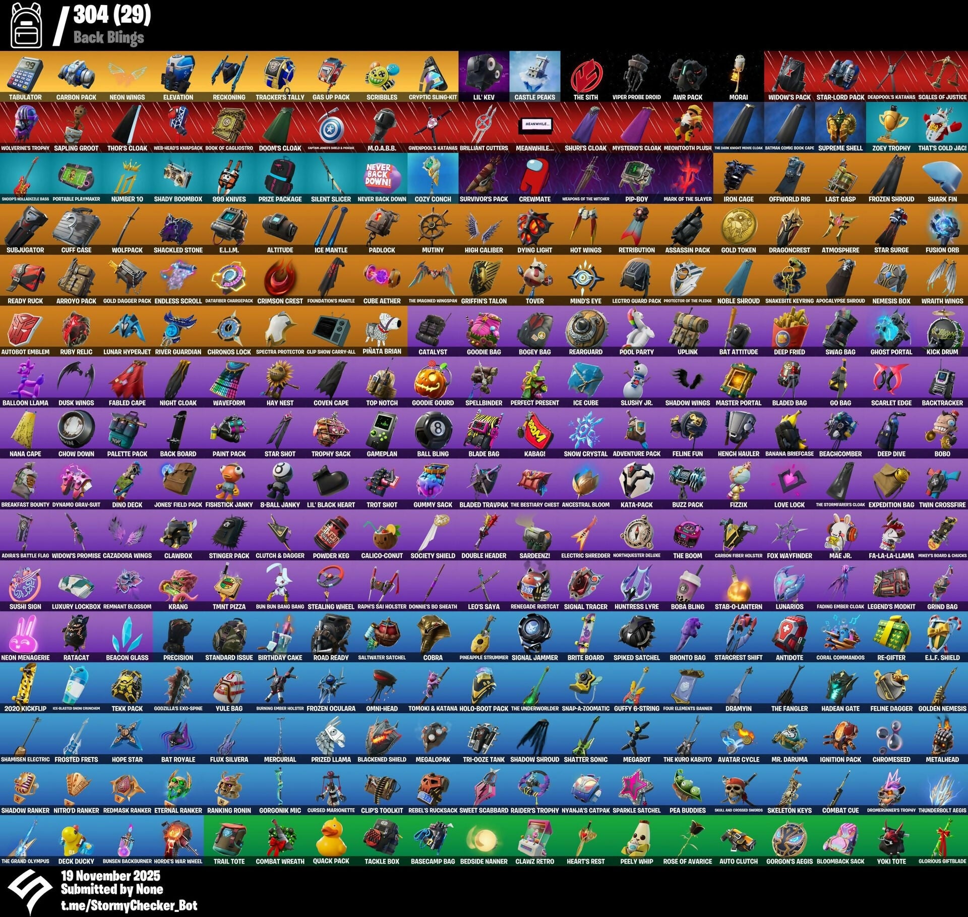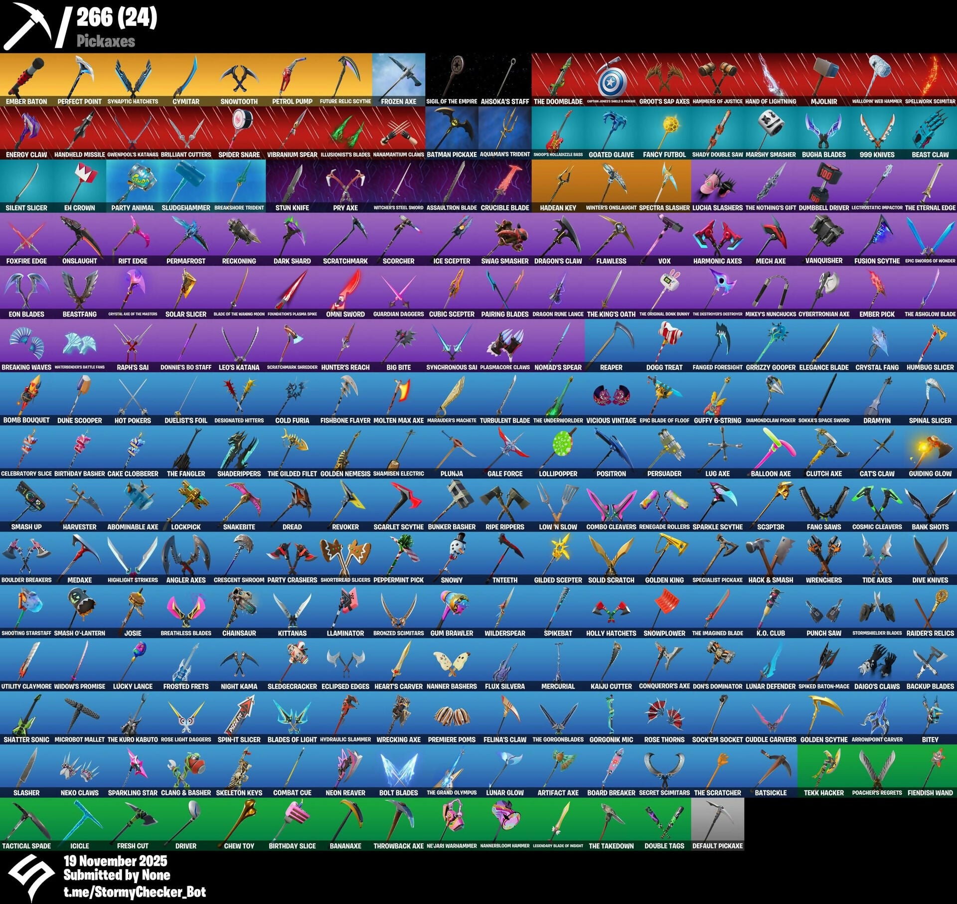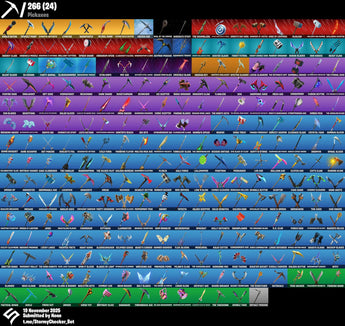 1-Ball, 2020 Kickflip, 8-Ball Janky, 8-Ball vs Scratch, 999 Knives, A.I.M., AWR Pack, Abominable Axe, Adira, Adira's Battle Flag, Adventure Pack, Agent Jones, Agent Peely, Ahsoka's Staff, Altitude, Ancestral Bloom, Angler Axes, Antidote, Antonia, Aphrodite, Apocalypse Shroud, Aquaman, Aquaman's Trident, Arctic Adeline, Arrowpoint Carver, Arroyo Pack, Artemis, Artifact Axe, Assassin Pack, Assaultron Blade, Atmosphere, Auto Clutch, Autobot Emblem, Avatar Cycle, B.R.U.T.E. Gunner, Back Board, Backbone, Backtracker, Backup Blades, Ball Bling, Balloon Axe, Balloon Llama, Banana Briefcase, Bananaxe, Bank Shots, Basecamp Bag, Bat Attitude, Bat Royale, Batman Comic Book Cape, Batman Comic Book Outfit, Batman Pickaxe, Batsickle, Battlehawk, Beach Bomber, Beachcomber, Beacon Glass, Beast Claw, Beastfang, Bedside Nanner, Beef Boss, Big Bite, Birthday Basher, Birthday Cake, Birthday Slice, Bitey, Black Widow Outfit, Blackened Shield, Blackheart, Blade Bag, Blade Of The Waning Moon, Bladed Bag, Bladed Travpak, Blades Of Light, Bloomback Sack, Board Breaker, Boba Bling, Bobo, Bogey Bag, Bolt Blades, Bomb Bouquet, Book Of Cagliostro, Boulder Breakers, Brainiac, Breakfast Bounty, Breaking Waves, Breakpoint, Breakshore Trident, Breathless Blades, Brilliant Cutters, Brite Board, Brite Raider, Bronto, Bronto Bag, Bronzed Scimitars, Brutus, Bugha, Bugha Blades, Bun Bun Bang Bang, Bunker Basher, Bunker Jonesy, Bunsen Backburner, Burning Ember Holster, Buzz Pack, Bytes, Cake Clobberer, Calamity, Calico-Conut, Cameo vs Chic, Captain America's Shield & Pickaxe, Captain Jones, Carbide, Carbon Commando, Carbon Fiber Holster, Carbon Pack, Castle Peaks, Castor, Cat's Claw, Catalyst, Cazadora Wings, Celebratory Slice, Cerberus, Chainsaur, Chaos Director, Chew Toy, Chill Count, Chomp Sr., Chow Down, Chrome Punk, Chromeseed, Chronos Lock, Clang & Basher, Clawbox, Clawz Retro, Clip, Clip Show Carry-All, Clip's Toolkit, Cloaked Shadow, Cloud Striker, Clutch & Dagger, Clutch Axe, Cobra, Codename E.L.F., Cold Furia, Combat Cue, Combat Wreath, Combo Cleavers, Conqueror's Axe, Coral Commandos, Cosmic Cleavers, Couple Team Specialist, Coven Cape, Cozy Conch, Crescent Shroom, Crewmate, Crimson Crest, Crucible Blade, Cryptic Sling-Kit, Crystal Axe Of The Masters, Crystal Fang, Cube Aether, Cubic Scepter, Cuddle Carvers, Cuff Case, Cursed Marionette, Cybertronian Axe, Cymitar, DJ Yonder, Daigo, Daigo's Claws, Dark Shard, Darth Vader, Datafiber Chargerpack, Deadfire, Deadpool, Deadpool's Katanas, Deck Ducky, Deep Dive, Deep Fried, Default Pickaxe, Demi, Designated Hitters, Diamondclaw Picker, Dino Deck, Dire, Dive Knives, Doctor Strange, Dogg Treat, Doggo, Don's Dominator, Donatello, Donnie's Bo Sheath, Donnie's Bo Staff, Doom, Doom Slayer, Doom's Cloak, Double Header, Double Tags, Dragon Rune Lance, Dragon's Claw, Dragoncrest, Dramyin, Dread, Drift, Driver, Dromrunners Trophy, Duelist's Foil, Dumbbell Driver, Dune Scooper, Dusk, Dusk Wings, Dusty, Dying Light, Dynamo Grav-Suit, Dynamo Tntina, E.L.F. Shield, E.L.I.M, Eclipsed Edges, Eh Crown, Electric Shredder, Elegance Blade, Elevation, Ember, Ember Baton, Ember Pick, Emma Frost, Endless Scroll, Energy Claw, Enforcer, Eon Blades, Epic Blade Of Floof, Epic Swords Of Wonder, Era, Erisa, Eternal Ranker, Eternal Voyager, Evie, Expedition Bag, Fa-La-La-Llama, Fable, Fabled Cape, Fade, Fading Ember Cloak, Fancy Futbol, Fang Saws, Fanged Foresight, Felina, Felina's Claw, Feline Dagger, Feline Fun, Fiendish Wand, Fish Thicc, Fishbone Flayer, Fishstick Janky, Fixer, Fizzix, Flawless, Flux Silvera, Foundation's Mantle, Foundation's Plasma Spike, Four Elements Banner, Fox Wayfinder, Foxfire Edge, Fresh Cut, Frosted Frets, Frozen Axe, Frozen Fishstick, Frozen Nog Ops, Frozen Oculara, Frozen Shroud, Fusion, Fusion Orb, Fusion Scythe, Future Relic Scythe, Gale Force, Gameplan, Gas Up Pack, Gear Specialist Maya, Geralt of Rivia, Ghost Portal, Giddy-Up, Gilded Scepter, Glorious Giftblade, Go Bag, Goated Glaive, Godzilla Evolved, Godzilla's Exo-Spine, Gold Dagger Pack, Gold Token, Golden King, Golden Nemesis, Golden Scythe, Goodie Bag, Goodie Gourd, Gorgon's Aegis, Gorgonik Mic, Gridiron, Griffin's Talon, Grind Bag, Grizzy Gooper, Groot, Groot's Sap Axes, Grriz, Guardian Daggers, Guffy 6-String, Guffy G-String, Guiding Glow, Gum Brawler, Gumbo, Gummy Sack, Gunnar, Gwenpool, Gwenpool's Katanas, Hack & Smash, Hadean Gate, Hadean Key, Hades, Hammers Of Justice, Hand Of Lightning, Handheld Missile, Harlowe, Harmonic Axes, Harvester, Haven, Hay Man, Hay Nest, Heart's Carver, Heart's Rest, Helsie, Hench Hauler, Hero Baymax, High Caliber, Highlight Strikers, Highwire, Holiday Boxy, Holly Hatchets, Hope, Hope Star, Horde's War Wheel, Hot Pokers, Hot Wings, Humbug Slicer, Hunter's Reach, Huntress, Huntress Lyre, Hybrid, Hydraulic Slammer, Ice Cube, Ice Mantle, Ice Scepter, Ice-Blasted Snow Cruncher, Icicle, Ignition Pack, Illusionist's Blades, Imani, Imperial Stormtrooper, Indiana Jones, Iron Cage, Jade, Jennifer Walters, John Wick, Jolly Jammer, Jones' Field Pack, Josie, Journey vs Hazard, Jules, Jun-Hwan, K.O. Club, Kabag!, Kado Thorne, Kaiju Cutter, Kata-Pack, Kendo, Khaby Lame, Kiara K.O., Kick Drum, King Flamingo, Kittanas, Knight Conqueror, Korra, Krang, Krisabelle, Laguna, Lara Croft, Last Gasp, Lecrostatic Impactor, Lectro Guard Pack, Legend's Modkit, Legendary Blade Of Insight, Lennox Rose, Leo's Katana, Leo's Saya, Leonardo, Lil Split, Lil' Black Heart, Lil' Kev, Lina Scorch, Lionel Messi, Liteshow, Llaminator, Lockpick, Lollipopper, Lorenzo, Love Lock, Low 'N Slow, Lt. Evergreen, Lt. John Llama, Lucha Slashers, Lucky Lance, Lug Axe, Lunar Defender, Lunar Glow, Lunar Hyperjet, Lunarios, Luxe, Luxury Lockbox, Lynx, M.O.A.B.B., MRBeast, MRBeast6000, Mae, Mae Jr., Malik, Mancake, Mandalorian, Marauder's Machete, Mariposa, Mark Of The Slayer, Marshy Smasher, Massai, Master Key, Master Portal, Maverick, Mech Axe, Medaxe, Medusa, Megabot, Megalo Don, Megalopak, Meow Skulls, Meowdas, Meowscles, Meowt
