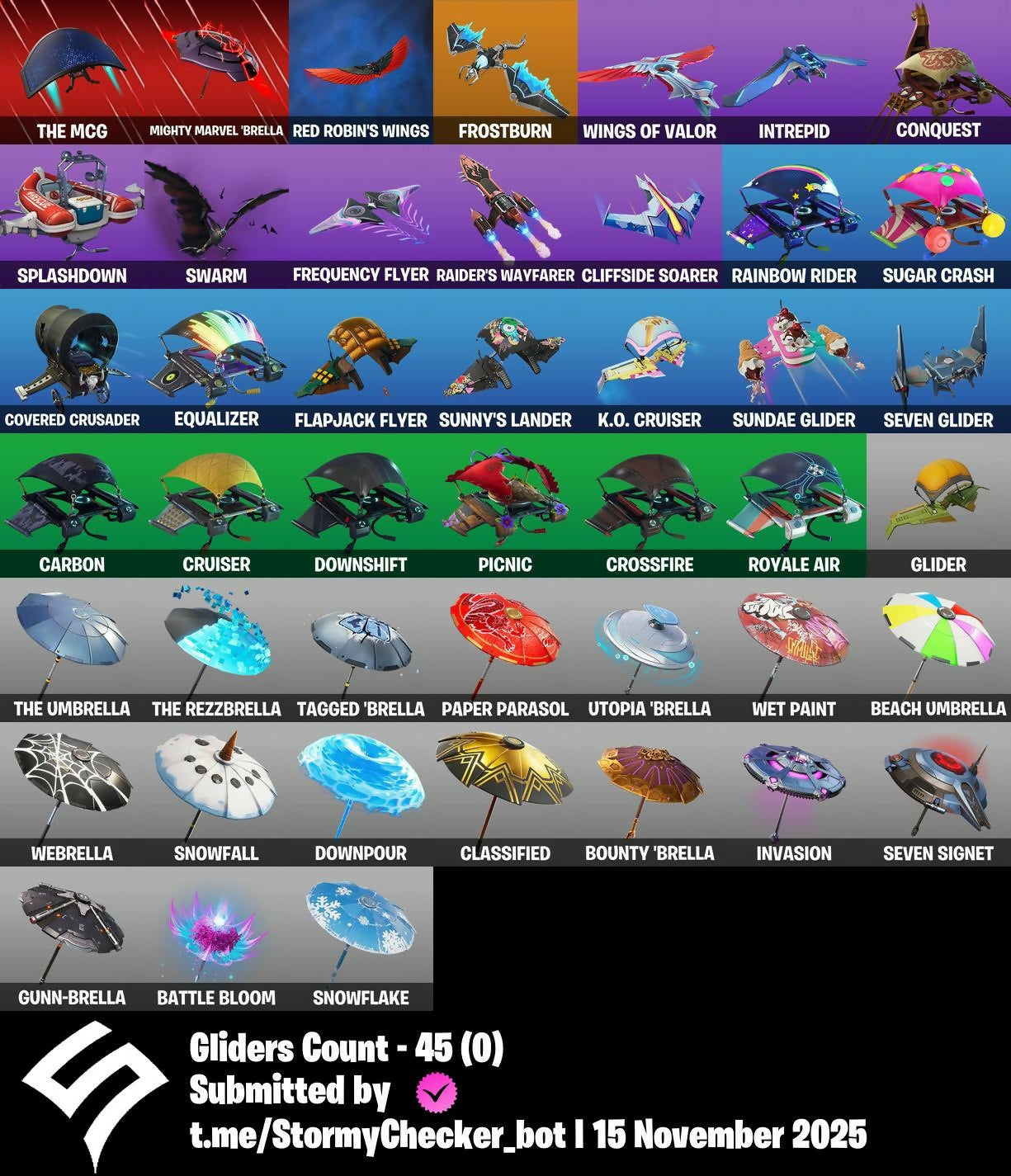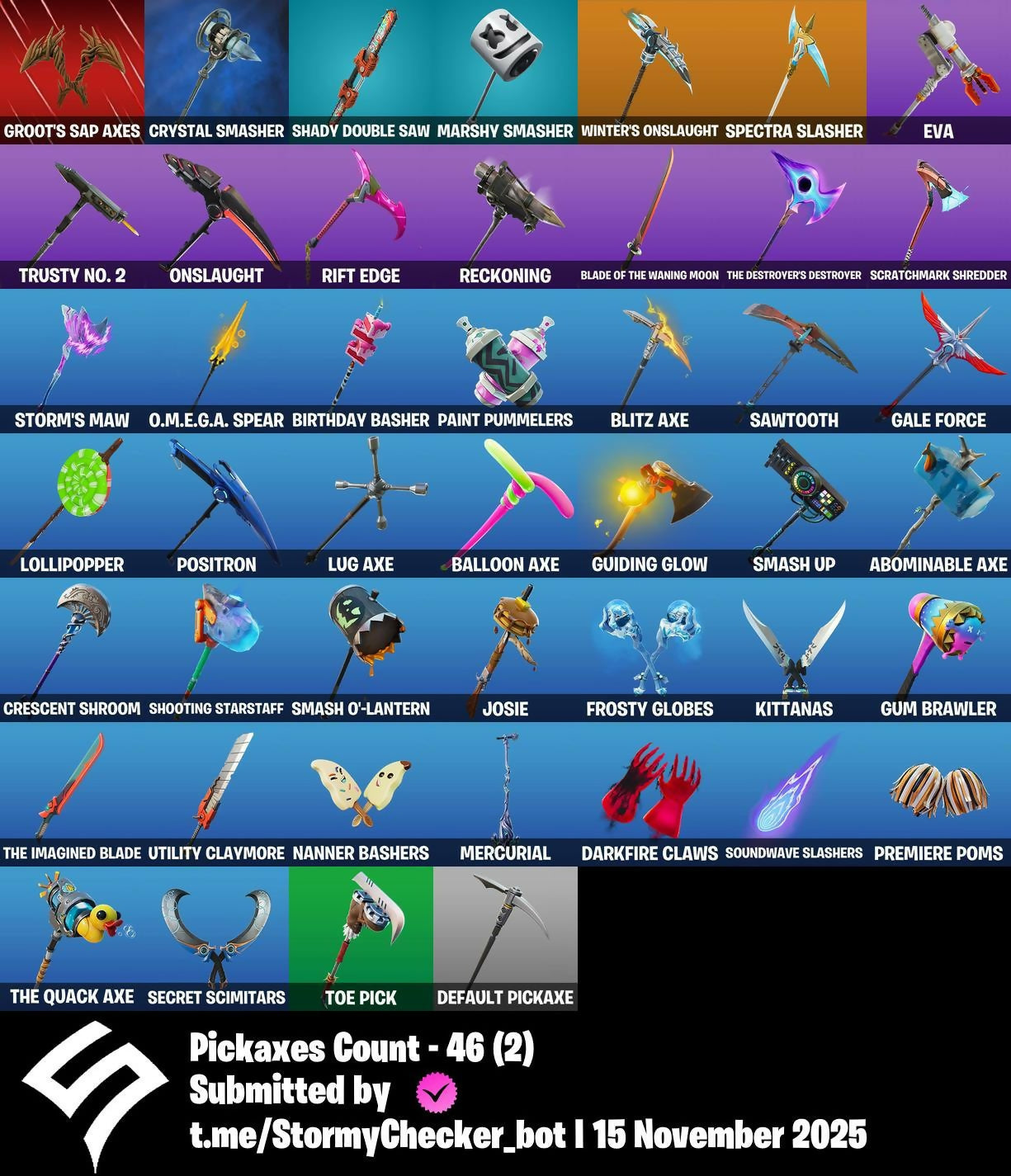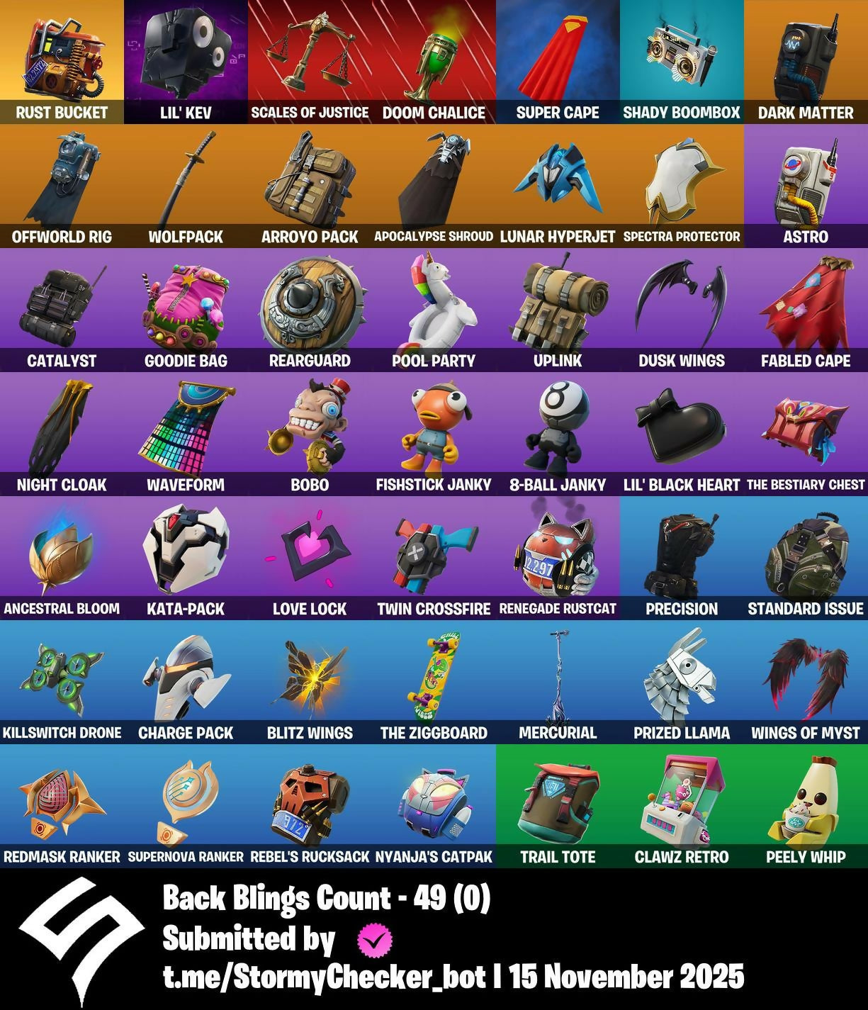 8-Ball Janky, Abominable Axe, Ancestral Bloom, Apocalypse Shroud, Arroyo Pack, Astro, Balloon Axe, Battle Bloom, Battlehawk, Beach Umbrella, Best Mates, Birthday Basher, Blade of the Waning Moon, Blitz Axe, Blitz Wings, Bobo, Bounty 'brella, Breakdown, Brseason1, Brush Your Shoulders, Calamity, Calculated, Call Me, Carbide, Carbon, Catalyst, Charge Pack, Classified, Clawz Retro, Clean Sweep, Cliffside Soarer, Conquest, Covered Crusader, Crescent Shroom, Crossfire, Crowning Achievement, Cruiser, Crystal Smasher, Cuddle Hearts, Cyclo Curl, DJ Yonder, Dagger Dance, Dance Moves, Dark Matter, Dark Voyager, Darkfire Claws, Default Pickaxe, Dire, Doom Chalice, Downpour, Downshift, Doze Dab, Drift, Dusk, Dusk Wings, Elite Agent, Equalizer, Eva, Fable, Fabled Cape, Fishstick Janky, Flamenco, Flapjack Flyer, Flashback Breakdown, Flippin’ Away, Frequency Flyer, Frostburn, Frosty Globes, Gale Force, Gentleman’s Dab, Giddy-Up, Glider, Golf Clap, Goodie Bag, Groot's Sap Axes, Groove Jam, Guiding Glow, Gum Brawler, Gunn-Brella, Heart Sign, Holly Jammer, Hot Marat, Howl, Huntress, Hype, Intrepid, Invasion, It’s Go Time!, Josie, Jubilation, K.O. Cruiser, Kata-Pack, Keep It Mello, Killswitch Drone, Kittanas, Lil Split, Lil' Black Heart, Lil' Kev, Lil’ Longboat, Lock It Up, Lollipopper, Love It!, Love Lock, Lug Axe, Lunar Hyperjet, Make It Rain, Marshy Smasher, Mercurial, Mighty Marvel 'brella, Mission Specialist, Moonwalker, Nanner Bashers, Night Cloak, Nightshade, Nyanja's Catpak, O.M.E.G.A. Spear, Offworld Rig, Omega, Omegarok, Onslaught, Orange Justice, Paint Pummellers, Paper Parasol, Peely Whip, Picnic, Pony Up, Pool Party, Popcorn, Positron, Precision, Premiere Poms, Prized Llama, Raider's Wayfarer, Rainbow Fog, Rainbow Rider, Rap Boy, Real Slim Shady, Rearguard, Rebel's Rucksack, Reckoning, Red Robin's Wings, Redline, Redmask Ranker, Regal Wave, Renegade Lynx, Renegade Rustcat, Respect, Respect The Peace, Rezzblocks, Ride The Pony, Rift Edge, Rock Paper Scissors, Rogue Agent, Rook, Royale Air, Running Man, Rust Bucket, Rust Lord, Salute, Sawtooth, Scales Of Justice, Scratchmark Shredder, Secret Scimitars, Seven Glider, Seven Signet, Shadow Boxer, Shady Boombox, Shady Double Saw, Shooting Starstaff, Sledgehammer, Slim Shady, Slitherin’, Smash O'-Lantern, Smash Up, Snap, Snowfall, Snowflake, Soundwave Slashers, Spectra Knight, Spectra Protector, Spectra Slasher, Splashdown, Squad Leader, Standard Issue, Storm's Maw, Sugar Crash, Sun Strider, Sundae Glider, Sunny's Lander, Super Cape, Supernova Ranker, Swarm, Swipe It, T-Pose, Tagged 'brella, Tagger’s Groove, Take The Cake, Take The Elf, Take The L, Teknique, The Bestiary Chest, The Big Bang, The Destroyer's Destroyer, The Imagined Blade, The Mcg, The Quack Axe, The Reaper, The Rezzbrella, The Rick Dance, The Robot, The Umbrella, The Visitor, The Ziggboard, Tiniest Violin, Toe Pick, Trail Tote, Trusty No. 2, Twin Crossfire, Uplink, Utility Claymore, Utopia 'brella, Valor, Vulcan Salute, Wakandan Salute, Waterworks, Wave, Waveform, Webrella, Wet Paint, Wings Of Myst, Wings Of Valor, Winter's Onslaught, Wolfpack, You’re Awesome, Zoey