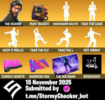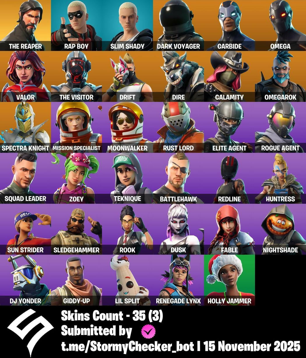 34 Skins | The Reaper | Rap Boy | Slim Shady | Omegarok | Lil Split | Default Pickaxe | Birthday Basher | Shady Double Saw | BRSeason1 | 600 VB
