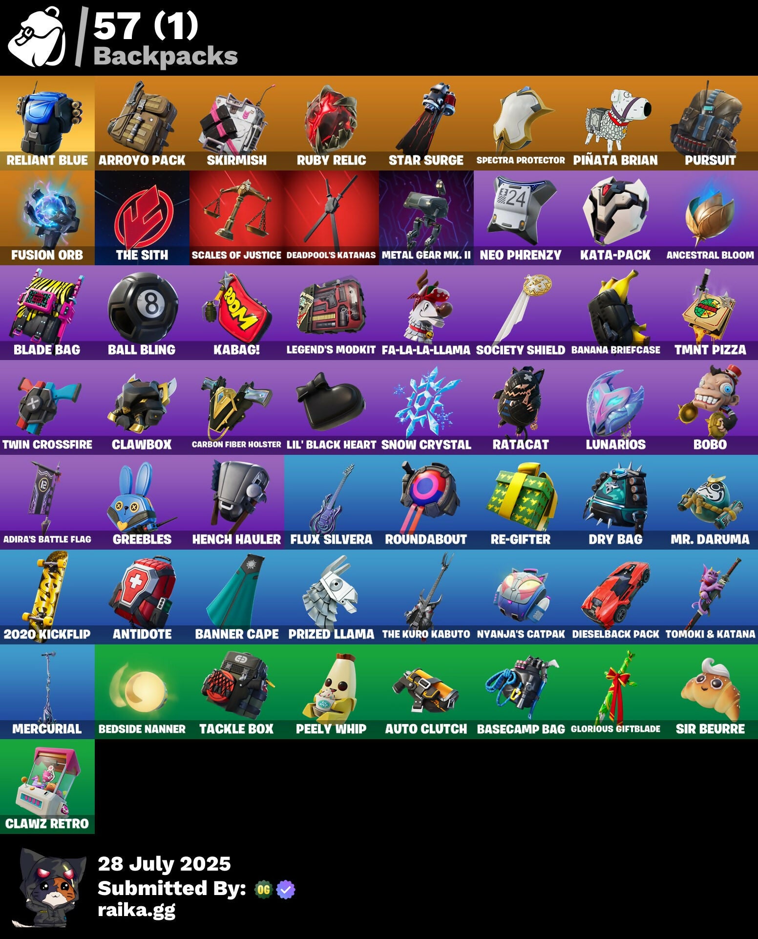 2020 Kickflip, 8-Ball Vs Scratch, Adira's Battle Flag, Agent Peely, Ancestral Bloom, Angler Axes, Antidote, Arroyo Pack, Auto Clutch, Ball Bling, Banana Briefcase, Bank Shots, Banner Cape, Basecamp Bag, Basic Basher, Bedside Nanner, Blade Bag, Blade Of The Waning Moon, Bobo, Boing!, Bolt, Boogie Down, Boulder Breakers, Brutus, Call Me, Cameo Vs Chic, Carbon Fiber Holster, Cerberus, Clawbox, Clawz Retro, Crowning Achievement, Cyclo Curl, Deadpool's Katanas, Diamond Throne, Diamondclaw Picker, Dieselback Pack, Droop, Dry Bag, Duelist's Foil, Ember Pick, Explorer Emilie, Fa-La-La-Llama, Flipping Away, Flux Silvera, Foil Flex, Fusion, Fusion Orb, Fusion Scythe, Gear Specialist Maya, Glorious Giftblade, Greebles, Groot's Sap Axes, Hack & Smash, Hench Hauler, High Five, Highlight Strikers, Holiday Boxy, Hope, Hula Hoopin', I Declare!, I'm A Mystery, Iris, Jackie, Journey Vs Hazard, Kabag!, Kata-Pack, Knife Sharpener, Legend's Modkit, Lil' Black Heart, Lil' Prancer, Love It!, Lt. Evergreen, Lunarios, Mean Streak, Medaxe, Mercurial, Metal Gear Mk. II, Montague, Mr. Dappermint, Mr. Daruma, Nailed It, Nanner Bashers, Neo Phrenzy, Neo Versa, Ninja Stance: Donnie, Ninja Stance: Leo, Nisha, Nyanja's Catpak, Ol' Woody, Oscar, Peely Whip, Peppermint Pick, Peter Griffin, Piñata Brian, Pneumatic Twin, Poacher's Regrets, Pop Axe, Premiere Poms, Prized Llama, Pursuit, Ratacat, Re-Gifter, Reliant Blue, Remedy Vs Toxin, Respect The Peace, Ride The Pony, Rippley Vs Sludge, Rose Glow, Rose Team Leader, Roundabout, Ruby Relic, Say So, Scales Of Justice, Secret Scimitars, Shaderippers, Shaolin Sip, Sharpshooter, Shooting Starstaff, Shortbread Slicers, Side Hustle, Sing Along, Sir Beurre, Skirmish, Sledgecracker, Sludgehammer, Smash O'Lantern, Snow Crystal, Snow Shaker, Snowy, Society Shield, Solid Snake, Sorana, Spectra Protector, Star Surge, Stun Knife, Swell Striker, TMNT Pizza, Tackle Box, Take The Cake, Tech Axe, The Imagined Blade, The Kuro Kabuto, The Scientist, The Scratcher, The Sith, The Takedown, Throwback Axe, Tnteeth, Tntina, Tomoki & Katana, Tra La La, Trilogy, Turbulent Blade, Turk Vs Riptide, Twin Crossfire, Utility Claymore, Valeria, Vengeance Jones, Warpaint, Wavebreaker, Wavy T, Winterfest Bushranger, Wooly Warrior