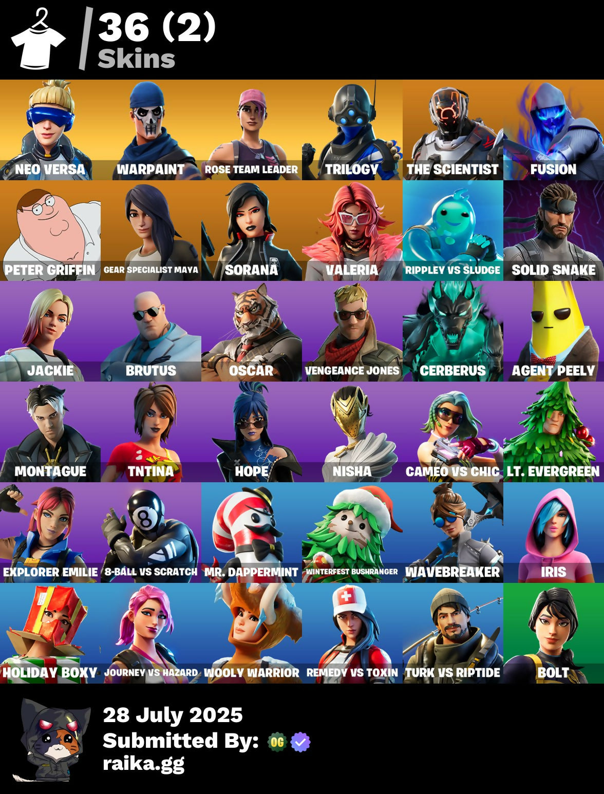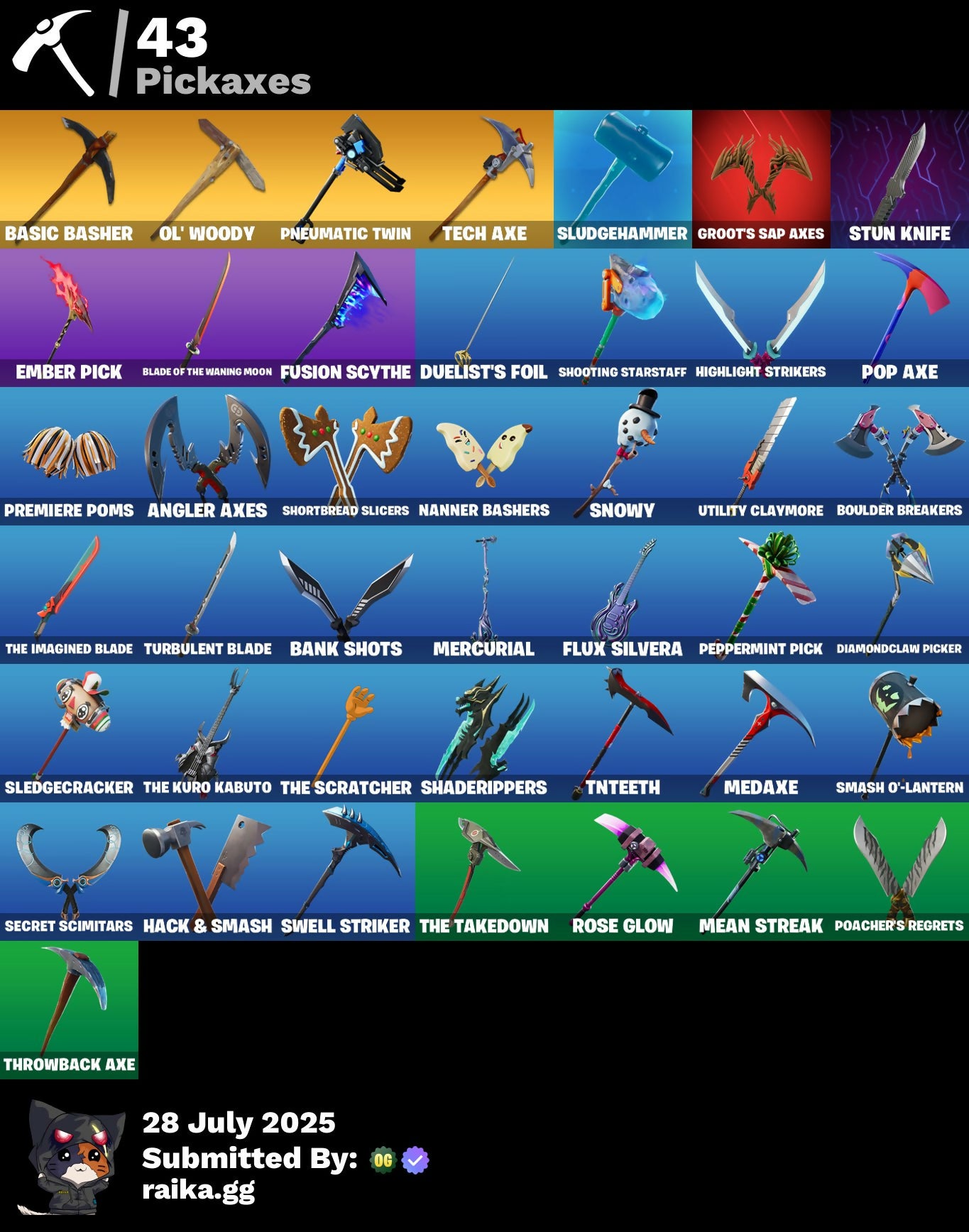 36 skins | OG STW | Neo Versa | Trilogy | Reliant Blue | Basic Basher | Ol' Woody | Pneumatic Twin | Tech Axe | Founder's Glider | 1350 VB