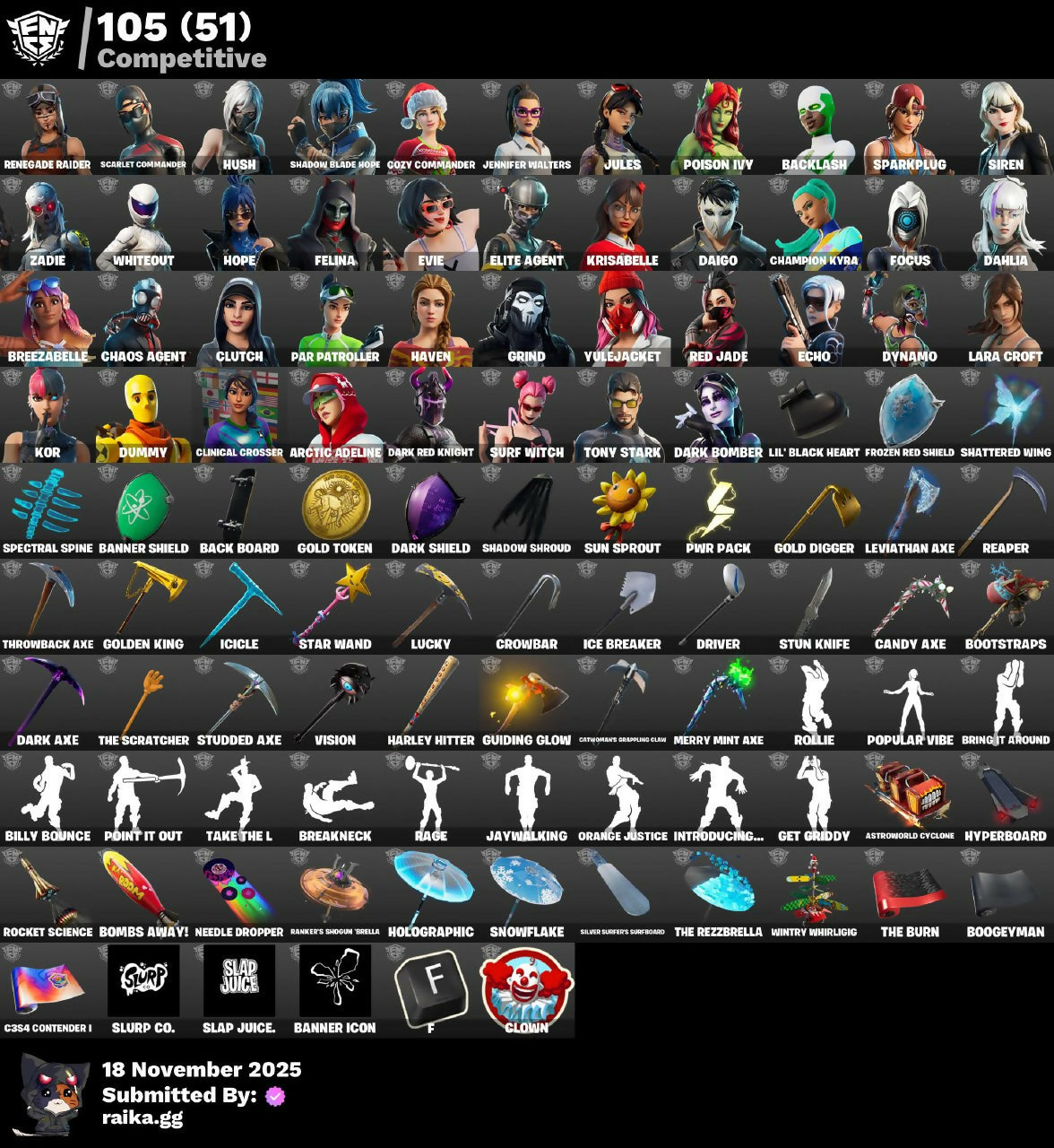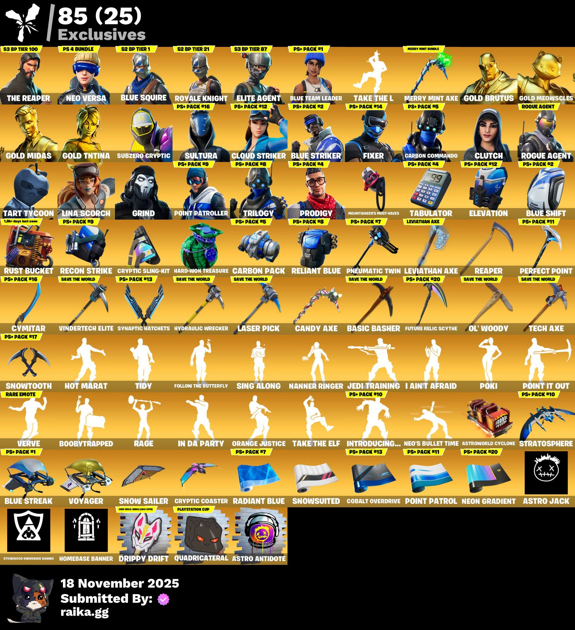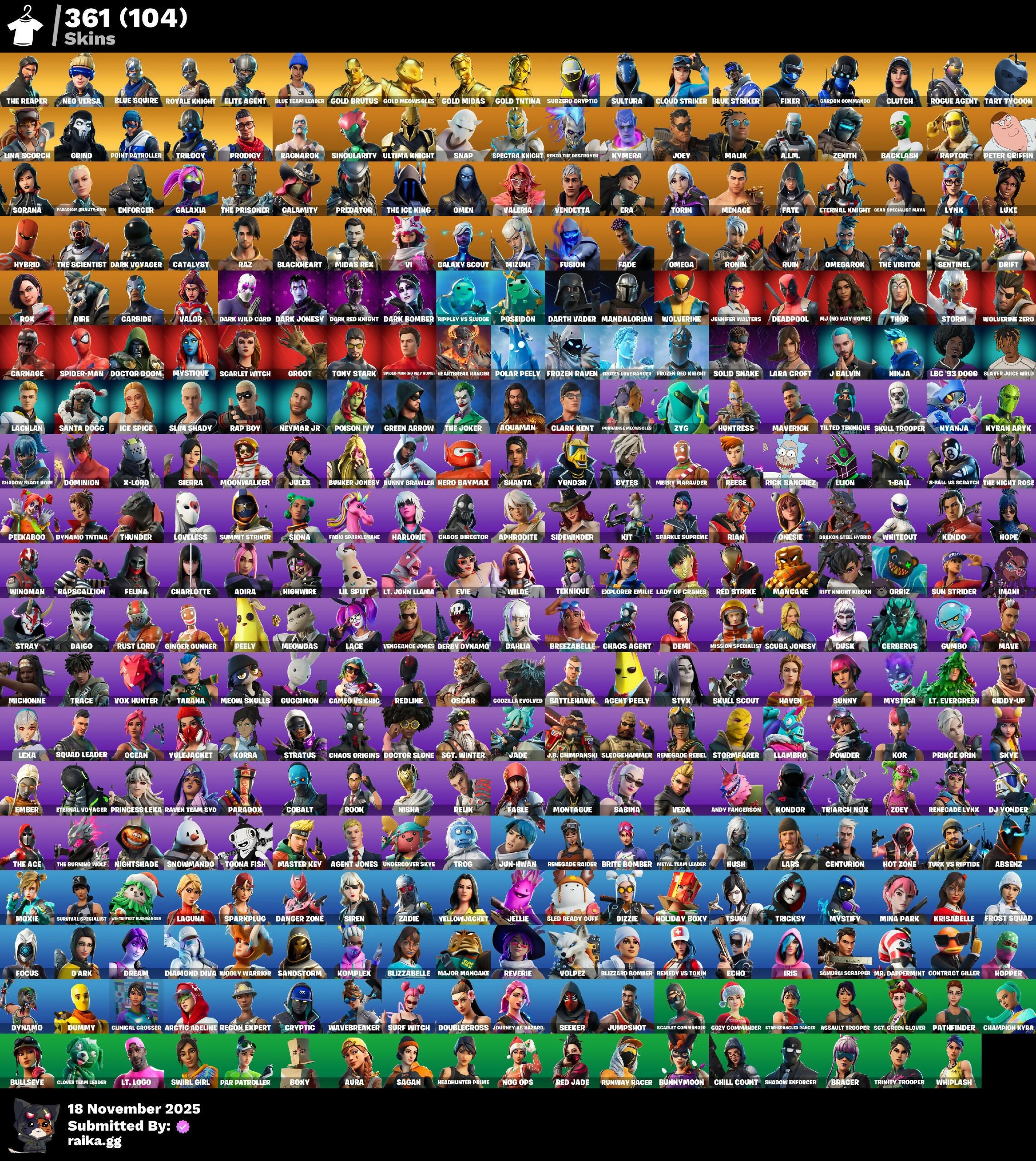 361 skins ✅ The Reaper ✅ Merry Mint Axe ✅ Neo Versa ✅ Blue Squire ✅ Royale Knight ✅ Elite Agent ✅ Blue Team Leader ✅ Gold Brutus ✅ Leviathan Axe ✅ 800 VB