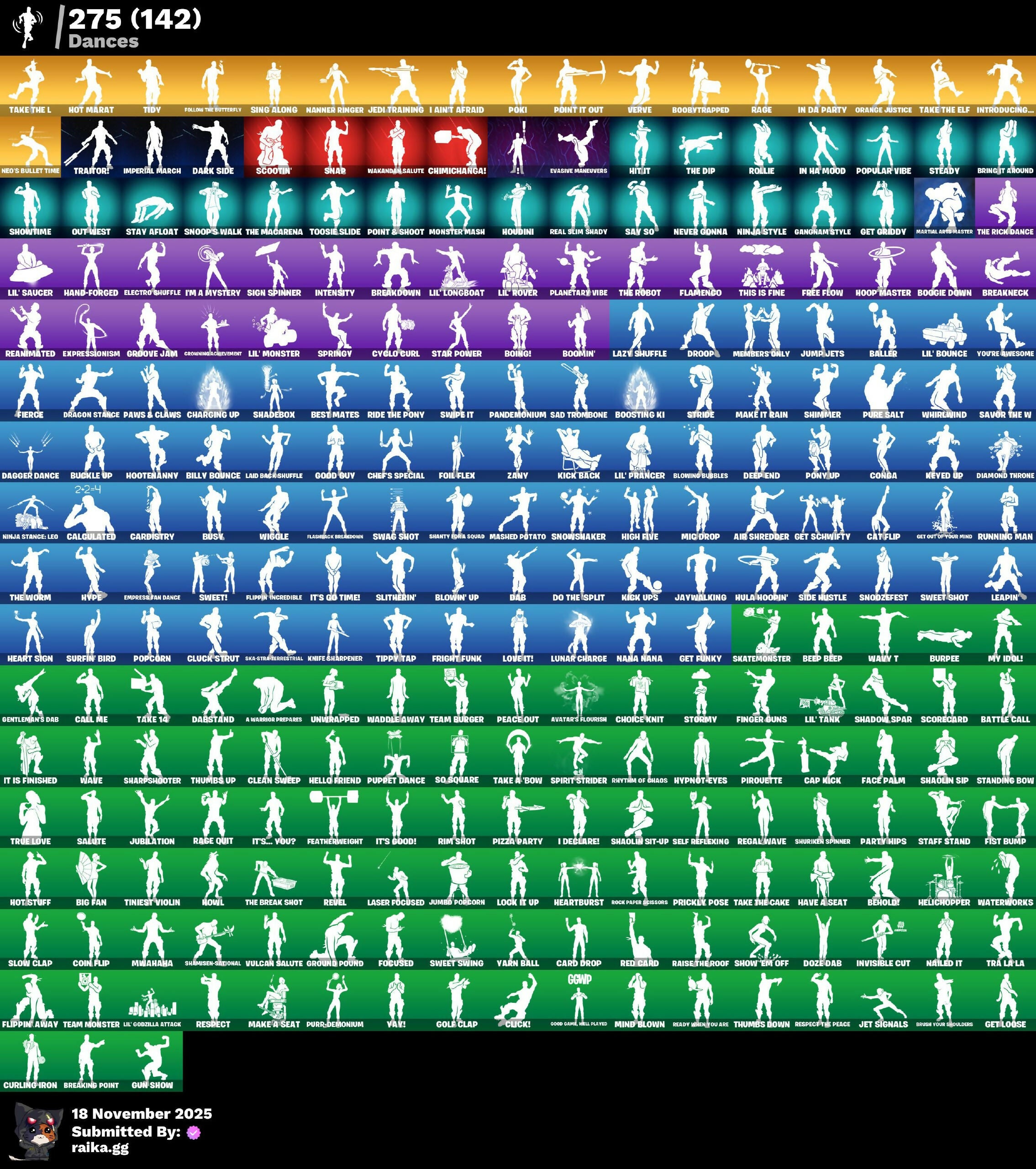 1-Ball, A Warrior Prepares, A.I.M., Absenz, Adira, Agent Jones, Agent Peely, Air Shredder, Andy Fangersen, Aphrodite, Aquaman, Arctic Adeline, Assault Trooper, Astro Antidote, Astro Jack, Astroworld Cyclone, Aura, Avatar's Flourish, B-Ball Vs Scratch, Back Board, Backlash, Baller, Banner Icon, Banner Shield, Basic Basher, Battle Call, Battlehawk, Beep Beep, Behold!, Best Mates, Big Fan, Billy Bounce, Blackheart, Blizzabelle, Blizzard Bomber, Blowin' Up, Blowing Bubbles, Blue Shift, Blue Squire, Blue Streak, Blue Striker, Blue Team Leader, Boing!, Bombs Away!, Boobytrapped, Boogeyman, Boogie Down, Boomin', Boosting Ki, Bootstraps, Boxy, Bracer, Breakdown, Breaking Point, Breakneck, Breezabelle, Bring It Around, Brite Bomber, Brush Your Shoulders, Buckle Up, Bullseye, Bunker Jonesy, Bunny Brawler, Bunnymoon, Burpee, Busy, Bytes, C3S4 Contender I, Calamity, Calculated, Call Me, Cameo Vs Chic, Candy Axe, Cap Kick, Carbide, Carbon Commando, Carbon Pack, Card Drop, Cardistry, Carnage, Cat Flip, Catalyst, Catwoman's Grappling Claw, Centurion, Cerberus, Champion Kyra, Chaos Agent, Chaos Director, Chaos Origins, Charging Up, Charlotte, Chef’s Special, Chill Count, Chimichanga!, Choice Knit, Clark Kent, Clean Sweep, Click!, Clinical Crosser, Clion, Cloud Striker, Clover Team Leader, Clown, Cluck Strut, Clutch, Cobalt, Cobalt Overdrive, Coin Flip, Conga, Contract Giller, Cozy Commander, Crowbar, Crowning Achievement, Cryptic, Cryptic Coaster, Cryptic Sling-Kit, Curling Iron, Cyclo Curl, Cymitar, D'Ark, DJ Yonder, Dab, Dabstand, Dagger Dance, Dahlia, Daigo, Danger Zone, Dark Axe, Dark Bomber, Dark Jonesy, Dark Red Knight, Dark Shield, Dark Side, Dark Voyager, Dark Wild Card, Darth Vader, Deadpool, Deep End, Demi, Derby Dynamo, Diamond Diva, Diamond Throne, Dire, Dizzie, Do The Split, Doctor Doom, Doctor Slone, Dominion, Doublecross, Doze Dab, Dragon Stance, Dragon Steel Hybrid, Dream, Drift, Drippy Drift, Driver, Droop, Dummy, Dusk, Dynamo, Dynamo Tntina, Echo, Electro Shuffle, Elevation, Elite Agent, Ember, Empress Fan Dance, Enforcer, Era, Eternal Knight, Eternal Voyager, Evasive Maneuvers, Evie, Explorer Emilie, Expressionism, F, Fable, Face Palm, Fade, Fame Sparkle Team, Fate, Featherweight, Felina, Fierce, Finger Guns, Fist Bump, Fixer, Flamenco, Flashback Breakdown, Flippin' Away, Flippin' Incredible, Focus, Focused, Foil Flex, Follow The Butterfly, Free Flow, Fright Funk, Frost Squad, Frozen Raven, Frozen Red Knight, Frozen Red Shield, Fusion, Future Relic Scythe, Galaxia, Galaxy Scout, Gangnam Style, Gear Specialist Maya, Gentleman's Dab, Get Funky, Get Griddy, Get Loose, Get Out Of Your Mind, Get Schwifty, Giddy-Up, Ginger Gunner, Godzilla Evolved, Gold Brutus, Gold Digger, Gold Meowscles, Gold Midas, Gold Tntina, Gold Token, Golden King, Gole Clap, Good Game, Well Played, Good Guy, Green Arrow, Grind, Groot, Groove Jam, Ground Pound, Grrz, Guggimon, Guiding Glow, Gumbo, Gun Show, Hand-Forged, Hard-Won Treasure, Harley Hitter, Harlowe, Have A Seat, Haven, Havoc Love Ranger, Headhunter Prime, Heart Sign, Heartbreak Ranger, Heartburst, Helichopper, Hello Friend, Hero Baymax, High Five, Highwire, Hit It, Holiday Boxy, Holographic, Homebase Banner, Hoop Master, Hootenanny, Hope, Hopper, Hot Marat, Hot Stuff, Hot Zone, Houdini, Howl, Hula Hoopin', Huntress, Hush, Hybrid, Hydraulic Wrecker, Hype, Hyperboard, Hypnot Eyes, I Ain't Afraid, I Declare!, I'm A Mystery, Ice Breaker, Ice Spice, Icicle, Imani, Imperial March, In Da Party, In Ha Mood, Intensity, Interest Burger, Introducing..., Invisible Cut, Iris, It Is Finished, It's Go Time!, It's Good!, It's... You?, J Balvin, J.B. Chimpanski, Jade, Jaw Walking, Jaywalking, Jedi Training, Jellie, Jennifer Walters, Jet Signals, Joey, Journey Vs Hazard, Jubilation, Jules, Jumbo Popcorn, Jump Jets, Jumpshot, Jun-Hwan, Kendo, Keved Up, Kick Back, Kick Ups, Kit, Knife Sharpener, Komplex, Kondor, Kor, Korra, Krisabelle, Kymera, Kyran Aryk, LBC '93 Dogg, Lace, Lachlan, Lady Of Cranes, Laguna, Laid Back Shuffle, Lara Croft, Lars, Laser Focused, Laser Pick, Lazy Shuffle, Leapin', Leviathan Axe, Lexa, Lil Split, Lil' Black Heart, Lil' Bounce, Lil' Godzilla Attack, Lil' Longboat, Lil' Monster, Lil' Prancer, Lil' Rover, Lil' Saucer, Lil' Tank, Lina Scorch, Llamabro, Lock It Up, Love It!, Loveless, Lt. Evergreen, Lt. John Llama, Lt. Logo, Lucky, Lunar Charge, Luxe, Lynx, MJ (No Way Home), Major Mancake, Make A Seat, Make It Rain, Malik, Mancake, Mandalorian, Martial Arts Master, Mashed Potato, Master Kev, Mave, Maverick, Members Only, Menace, Meow Skulls, Meowdas, Merry Mint Axe, Messy Marauder, Metal Team Leader, Mic Drop, Michonne, Midas Rex, Mina Park, Mind Blown, Mission Specialist, Mizuki, Monster Mash, Montague, Moonwalker, Moxie, Mr. Dapperment, Mwahaha, My Idol, Mystica, Mystify, Mystique, Nailed It, Nana Nana, Nanner Ringer, Needle Dropper, Neo Versa, Neo's Bullet Time, Neon Gradient, Never Gonna, Neymar Jr, Nightshade, Ninja, Ninja Stance: Leo, Ninja Style, Nisha, Nog Ops, Nyanja, Ocean, Ol' Woody, Omega, Omegarok, Omen, Onesie, Orange Justice, Oscar, Out West, Pandemonium, Par Patroller, Paradigm Reality-499, Paradox, Party Hips, Pathfinder, Paws & Claws, Peace Out, Peekaboo, Peely, Perfect Point, Peter Griffin, Pirouette, Pizza Party, Planetary Vibe, Pneumatic Twin, Point & Shoot, Point It Out, Point Patrol, Point Patroller, Poison Ivy, Poki, Polar Peely, Pony Up, Popcorn, Popular Vibe, Poseidon, Powder, Predator, Prickly Pose, Prince Orin, Princess Lexa, Prodigy, Puppet Dance, Pure Salt, Purr Demonium, Purradise Meowscles, Pwr Pack, Quadrilateral, Radiant Blue, Rage, Rage Quit, Ragnarok, Raise The Roof, Ranker's Shogun 'Brella, Rap Boy, Rapscallion, Raptor, Raven Team Syd, Raz, Ready When You Are, Real Slim Shady, Reanimated, Reaper, Recon Expert, Recon Strike, Red Card, Red Jade, Red Strike, Redline, Reese, Regal Wave, Reliant Blue, Relix, Remedy Vs Toxin, Renegade Lynx, Renegade Raider, Renegade Rebel, Respect, Respect The Peace, Revel, Reverie, Rh