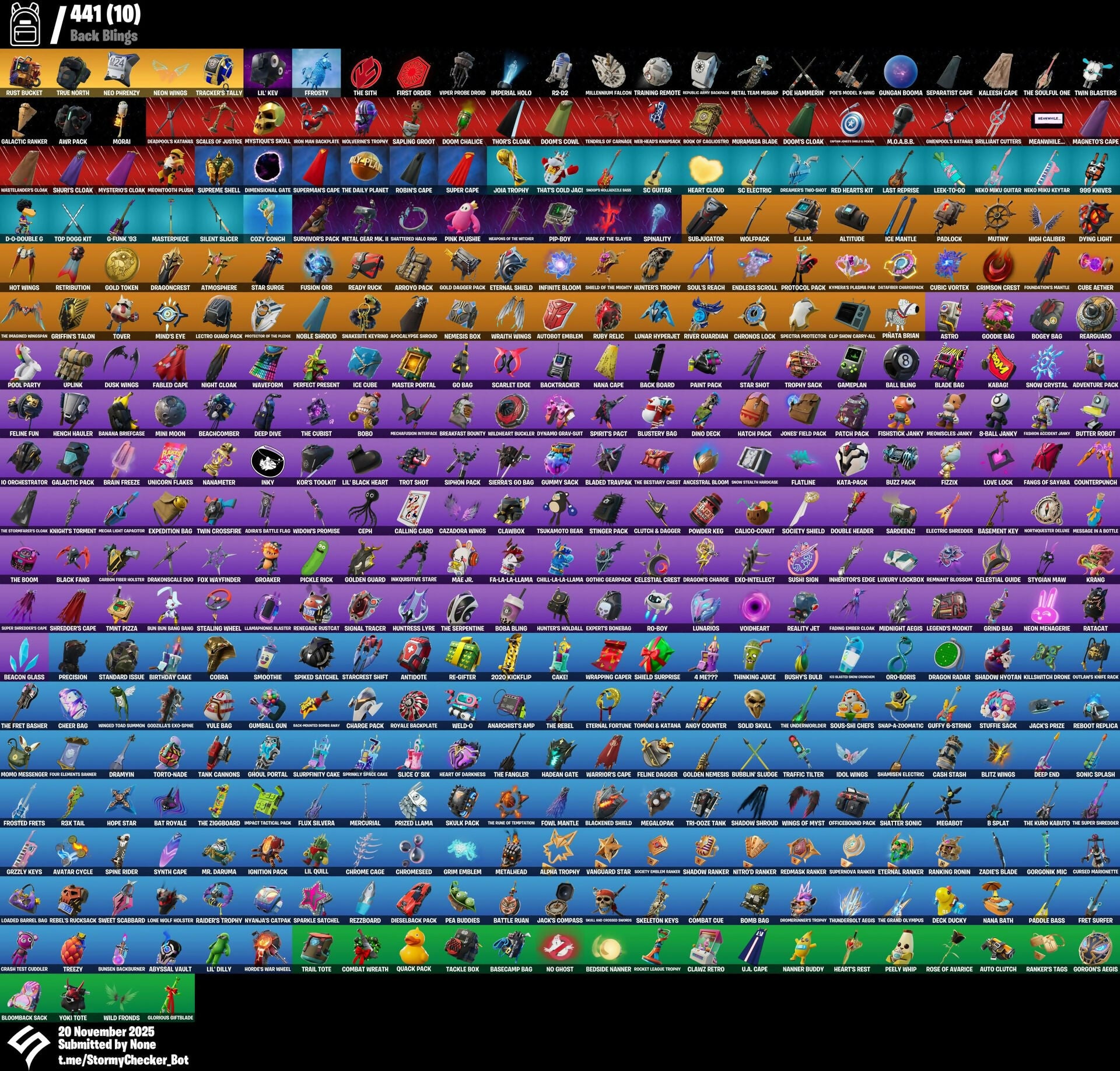 (Snikt!), 1-Ball, 18's Kama, 2020 Kickflip, 4 Me??, 8-Ball Janky, 8-Ball vs Scratch, 999 Knives, 9990 Knives, A Warrior Prepares, A.I.M., Aang, Aang’s Air Sphere, Abominable Axe, Abyssal Vault, Adira, Adira's Battle Flag, Adventure Pack, Aerial Assault Bomber, Aftermath, Agent Jones, Agent Peely, Ahsoka Tano, Ahsoka's Staff, Air Nomad Staff, Air Shredder, All-Weather Extractor, Alpha Trophy, Altitude, Anarchist's Amp, Ancestral Bloom, Andy Fangerson, Angler Axes, Angy Counter, Anniversary Axe, Antidote, Antonia, Apex Predator, Aphrodite, Apocalypse Shroud, Apprentice Evie, Aquaman, Aquaman's Trident, Arachnrobatics, Arc Flail, Arcane Research, Arctic Adeline, Ares, Arrowpoint Carver, Arroyo Pack, Artemis, Artifact Axe, Assaultron Blade, Astrea, Astro, Atmosphere, Auto Clutch, Autobot Emblem, Avatar Cycle, Avatar State Aang, Avatar’s Flourish, Aw, Shucks., Awr Pack, Axe-Tral Form, Ayida, Ayla Winn, Azarath Metrion Zinthos!, B Splat, B Splatt, Back Board, Back-Nado/Tides Away, Backtracker, Backup Blades, Bad Guy, Balance Board, Ball Bling, Balloon Axe, Banana Briefcase, Bananaxe, Bank Shots, Baron’s Hoard, Basecamp Bag, Basement Key, Bat Royale, Battle Blessing, Battle Prep, Battle Prep: Super, Battle Ruan, Battlehawk, Batwing Bonespike, Beachcomber, Beacon Glass, Bean Bag, Beastfang, Beatzbunny, Bedside Nanner, Beep Beep, Bernie, Big Bite, Big Dill, Bike To Go, Bim Bam Boom, Birdarang Flourish, Birthday Basher, Birthday Cake, Birthday Slice, Bitey, Black Fang, Blackened Shield, Blackheart, Blade Aria, Blade Bag, Blade Of The Waking Moon, Bladed Travpak, Blades Of Light, Blitz Axe, Blitz Knight, Blitz Wings, Blizzard's Bite, Bloomback Sack, Blowing Bubbles, Blowin’ Up, Blue Team Leader, Blustery Bag, Board Breaker, Boba Bling, Boba Snack, Bobo, Bogey Bag, Boing!, Bolt Blades, Bomb Bag, Bomb Bouquet, Bone Breaker, Bones, Boobytrapped, Boogie Down, Book of Cagliostro, Boomin’, Boosting Ki, Boots ‘n’ Cats, Boulder Breakers, Bow Go, Brain Freeze, Breakdown, Breakfast Bounty, Breaking Waves, Breakneck, Breakshore Trident, Breathless Blades, Breezabelle, Brilliant Cutters, Bring It Around, Brite Moves, Brite Raider, Bronzed Scimitars, Brutus, Bubble Basher, Bubble Wands, Bubblin' Sludge, Bun Bun Bang Bang, Bunker Basher, Bunker Jonesy, Bunsen Backburner, Burn Bright, Bushy's Blub, Butter Robot, Buzz Pack, Bytes, Cactus Club, Cairo, Cake Clobberer, Cake!, Calamity, Calculated, Calico-Conut, Call Me, Called Shot, Calling Card, Cameo vs Chic, Captain James Stills & Roamix, Captain Jones, Captain Llamerica, Captain Phasma, Carbide, Carbon Fiber Holster, Card Drop, Cardistry, Carmine Rosso, Carnage, Carnage Cleaver, Cash Stash, Cassidy Quinn, Cat Flip, Catalyst, Cauldron Chill, Cazadora Wings, Celestial Crest, Celestial Guide, Ceph, Cerberus, Chainsaur, Challenger's Staff, Changerpack, Chaos Director, Chaos Origins, Charge Pack, Charging Up, Charlotte, Check The Map, Cheer Bag, Chef’s Special, Chewbacca, Chilla-La-La-Llama, Choice Knit, Chop Chop, Chrome Cage, Chrome Punk, Chromeseed, Chronos Lock, Clang & Basher, Clark Kent, Clawbox, Clawz Retro, Clean Sweep, Clip Show Carry-All, Cluck, Cluck Strut, Clutch & Dagger, Clutch Victory, Cobra, Codecarver, Codex Team Specialist, Codsworth’s Cleanup, Coin Flip, Combat Cue, Combat Wreath, Conch Call, Conga, Conjure Weapon, Conqueror's Axe, Conqueror’s Claim, Cosmic Cleavers, Count It!, Counterpunch, Cozy Conch, Crack It, Crash Test Cuddler, Crescent Shroom, Crimson Crest, Crowning Achievement, Crucible Blade, Crystal Fang, Crystal Smasher, Cube Aether, Cube Assassin, Cube Edge, Cubic Scepter, Cubic Vortex, Cuddle Carvers, Cuddly Crusher, Curling Iron, Cursed Energy, Cursed Jack Sparrow, Cursed Marionette, Cybertronian Axe, Cyclo Curl, D-O-Double G, DJ Yonder, Dabstand, Dagger Dance, Dahlia, Daigo, Daigo's Claws, Dali, Dance Moves, Danica, Darkfire Claws, Darth Vader, Databiner, Deadpool, Deadpool's Katana, Deadpool's Katanas, Deck Ducky, Deep Dive, Deep End, Default Pickaxe, Demi, Demon Slayer Blade, Designated Hitters, Diamond Throne, Diamondclaw Picker, Dice Roll, Die With A Smile, Die with a Smile Bruno, Dieselback Pack, Dill With It, Dimensional Gate, Dino Deck, Dire, Dirtbike Challenge, Disassemble, Diva Fever, Dive Knives, Do The ‘Split, Doctor Doom, Doctor Slone, Doctor Strange, Dogg Treat, Don's Dominator, Doom, Doom Chalice, Doom Slayer, Doom's Cloak, Doom's Cowl, Doom’s Domain, Double Header, Double Tags, Doze Dab, Dragon Radar, Dragon Rune Lance, Dragon Stance, Dragon's Charge, Dragon's Claw, Dragoncrest, Drakon Claws, Drakon Steel Hybrid, Drakonscale Duo, Dramatic Flares, Dramyin, Dread, Dreamer's Two-Shot, Drift, Drippin’ Flavor, Droop, Droprunner's Trophy, Drumminies, Dual Machettas, Duelist's Foil, Duelist’s Card Trick, Dumbbell Driver, Dune Scooper, Durrr Taisho, Dusk, Dusk Wings, Dusty, Dying Light, Dynamo Grav-Suit, Dynamo TNTina, E.l.i.m., Eclipsed Edges, Electric Shredder, Electro Paring Blades, Electrostaff, Elegance Blade, Elegant Crowbar, Ember, Ember Pick, Emma Frost, Emperor Palpatine, Empress Fan Dance, Endless Scroll, Energy Claw, Energy Sword, Enforcer, Eon Blades, Epic Blade Of Floof, Epic Swords Of Wonder, Epitaph Edge, Era, Eren Jaeger, Erisa, Eternal Fortune, Eternal Knight, Eternal Ranker, Eternal Shield, Eternal Voyager, Eva, Evasive Maneuvers, Evie, Exo-Intellect, Expedition Bag, Expert's Bonebag, Expressionism, Fa-La-La-Llama, Fabio Sparklemane, Fable, Fabled Cape, Fade, Fading Ember Cloak, Fang Dance, Fang Saws, Fanged Foresight, Fangs Of Hesk, Fangs of Sayara, Fashion Accident Janky, Featherweight, Feel The Force, Felina, Felina's Claw, Feline Dagger, Feline Fun, Ffrosty, Fiendish Wand, Fierce, Fire Show, Fireworks Salvo, First Order, Fish Thicc, Fishbone Flayer, Fishstick Janky, Fist Bump, Fizzik, Flaky Feast, Flamenco, Flashback Breakdown, Flatline, Flawless, Fletcher Kane, Fletcher's Cane, Flippin’ Away, Flux Silvera, Foil Flex, Force Lightning, Foundation's Mantle, Foundation's Plasma S