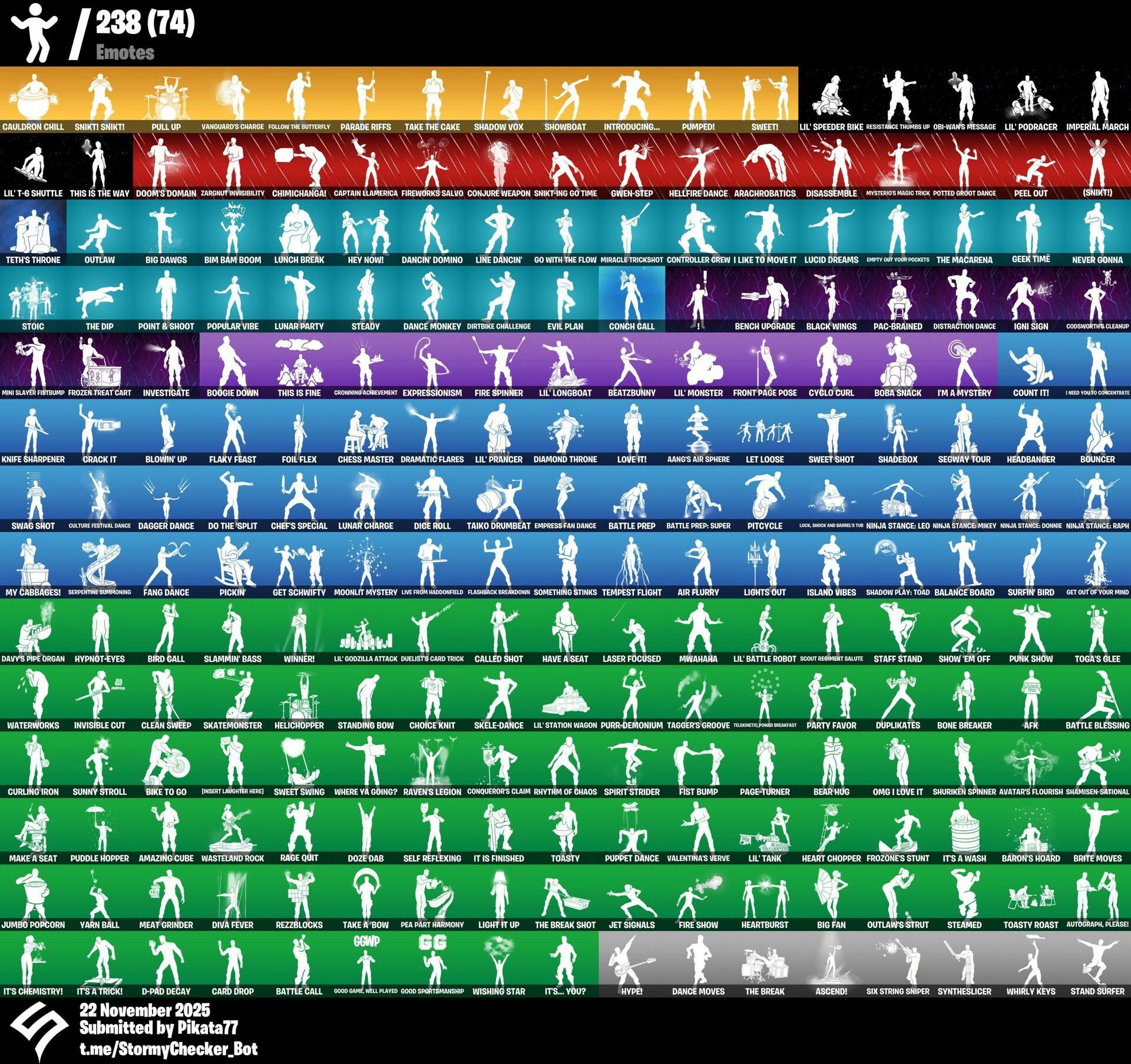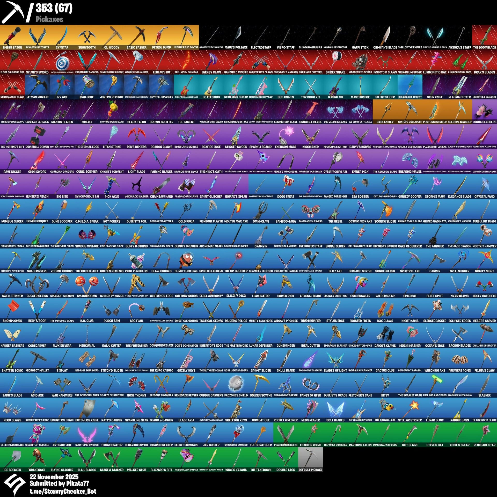 (Insert Laughter Here), (Snikt!), 1-Ball, 212th Battalion Trooper, 501st Trooper, 999 Knives, AFK, Aang, Aang's Air Sphere, Absenz, Abyssal Blade, Ace Academic, Acid Axe, Adira, Aerial Assault Bomber, Aftermath, Ahsoka Tano, Ahsoka's Staff, Air Flurry, Air Nomad Staff, Amazing Cube, Anasoka Clone Trooper, Android 17, Andy Fangersom, Antonia, Aphrodite, Arachrobatics, Arc Flail, Arctic Adeline, Ares, Arrowpoint Carver, Artemis, Artifact Axe, Ascend!, Ash Williams, Assaultron Blade, Astrea, Atom Eve, Aura, Autograph, Please!, Avatar State Aang, Avatar's Flourish, Axo, Azuki, B Splaat, B.R.U.T.E. Gunner, Backup Blades, Bad Joke, Balance Board, Bamboo-Tana, Baron's Hoard, Barracuda, Basic Basher, Batman Comic Book Outfit, Batman Pickaxe, Battle Blessing, Battle Call, Battle Prep, Battle Prep: Super, Battlebus, Bear Hug, Beatzbunny, Beep & Boop, Beerus, Bench Upgrade, Big Bite, Big Dawgs, Big Dill, Big Fan, Bike To Go, Bim Bam Boom, Birch, Bird Call, Birthday Basher, Bitey, Black Cat, Black Talon, Black Wings, Blacklight, Blackwood Bailes, Blade Area, Blade of the Hyraning Doom, Blades of Light, Blinky Fugu Flail, Blitz Axe, Blitz Knight, Blizzard Bomber, Blizzard's Bite, Bloom, Blowin' Up, Blueflame Sickles, Board Breaker, Boba Fett, Boba Snack, Bogstick, Bolt Blades, Bomb Bouquet, Bone Breaker, Bones, Bonesjamin, Boogie Down, Bouncer, Boxy, Breaking Waves, Breakshore Trident, Brilliant Cutters, Brite Moves, Brite Raider, Bronzed Scimitars, Budge, Bumblebee, Butcher's Knife, Butterfly Knives, Bytes, Cactus Club, Cake Clobberer, Called Shot, Captain Jones, Captain Llamerica, Captain Talon, Card Drop, Carver, Cassidy Quinn, Castor, Catrina, Catwoman Zero, Catwoman's Grappling Gun, Cauldron Chill, Celebratory Slice, Centurion, Centurion Edge, Cerberus, Chainsaw Hand, Chaos Director, Chef's Special, Chess Master, Chewbacca, Chief Hopper, Chigusa, Chimichanga!, Choice Knit, Chrome Punk, Ciri, Claire Redfield, Clang & Basher, Claw-Chucks, Clean Sweep, Clone Trooper, Cobb, Codecarver, Codsworth's Cleanup, Cold Furia, Combat Cue, Comet, Conch Call, Conjure Weapon, Conqueror's Axe, Conqueror's Claim, Contract Giller, Controller Crew, Corrupted Arachne, Corrupted Insight, Corrupted Shogun, Coruscant Guard, Cosmic Peck Axe, Count It!, Crack It, Crash Test Cuddler, Crescent Shroom, Crimson Polestar, Crossbite Toothaxes, Crown-Splitter, Crowning Achievement, Crucible Blade, Crystal Fang, Crystal Smasher, Cubic Scepter, Cuddle Carvers, Cuddle Team Specialist, Cuddly Crusher, Culture Festival Dance, Curling Iron, Cursed Claws, Customized Captain, Cutting Words, Cybertronian Axe, Cyclo Curl, Cymitar, D-pad Decay, Dabi, Dagger Dance, Dahlia, Daigo, Daigo's Claws, Dali, Dance Monkey, Dance Moves, Dancin' Domino, Dark Doggo, Darth Maul, Darth Vader, Daryl Dixon, Daryl's Knives, Davy Jones, Davy's Pipe Organ, De-Rezz De-Stroyer, Decaying Scythe, Deep Sea Destroyer, Deep Sea Dominator, Default Pickaxe, Defuser's Pruning Pick, Designated Hitters, Diamond Throne, Diamondclaw Picker, Dice Roll, Dirtbike Challenge, Disassemble, Distraction Dance, Diva Fever, Do The Split, Doctor Strange, Dogg Treat, Domino, Don's Dominator, Doom, Doom Slayer, Doom's Domain, Double Tags, Doublecross, Doze Dab, Dragon Rune Lance, Drakon Claws, Drakon Steel Hybrid, Dramatic Flares, Dramyin, Drax, Drax's Blades, Drill-Bit Destroyer, Drop Dee, Duelist's Card Trick, Duelist's Foil, Duelist's Grace, Dumbbell Driver, Dummy, Dummy Supreme, Dune Scooper, Dupli-Kate, Duplicating Batons, Duplikates, Durrr Taisho, Dusty, Dynamo Dancer, Dynamo Tntina, Ebonheart Battleaxe, Eclipsed Edges, Eddie's Spear, Ejiro Kirishima, Electro Pairing Blades, Electrostaff, Electrostatic Impactor, Elegance Blade, Elegant Crowbar, Ellen Ripley, Ember Baton, Ember Pick, Emma Frost, Empress Fan Dance, Empty Out Your Pockets, Energon Mace, Energy Claw, Epic Blade of Floof, Era, Eren Jaeger, Erisa, Eternal Wanderer, Evie, Evil Plan, Exo Stranger, Explorer Emilie, Expressionism, Fang Dance, Fanged Foresight, Fangs of Hesk, Far Out Man, Farmer Steel, Faye Valentine, Felina, Felina's Claw, Festival Phaedra, Fiendish Wand, Fire Show, Fire Spinner, Fireworks Salvo, Fish Thicc, Fishbone Flayer, Fishtstick, Fist Bump, Flail Blades, Flaky Feast, Flashback Breakdown, Flatfoot, Fletcher Kane, Fletcher's Cane, Flora Colossus Fist, Flux Silvera, Flying Slasher, Foil Flex, Follow The Butterfly, Foundation's Plasma Spike, Foxfire Edge, Frigid Foregoer, Front Page Pose, Frosted Frets, Frozen Treat Cart, Frozone, Frozone's Shield, Frozone's Stunt, Full Rod and Tongs, Future Relic Scythe, G-Funk '93, Gaffi Stick, Galaxy Grappler, Galaxy Starblades, Gambit, Geek Time, Geralt of Rivia, Get Out Of Your Mind, Get Schwifty, Gia, Gilded Naginata, Gildhart, Gilt Glaive, Glownicorn Llamaxes, Go With The Flow, Godzilla Evolved, Golden Nemesis, Golden Scythe, Good Game, Well Played, Good Sportsmanship, Grimbles, Grizzly Gooper, Grizzly Keys, Grriz, Guardian Daggers, Guardian Lin, Guffy 6-String, Gum Brawler, Gumbo, Gunnar, Gunslinger Calamity, Gunswinger, Gwen-Step, Gwenpool, Gwenpool's Katanas, Hadean Key, Hades, Han Solo, Handheld Missile, Harlowe, Haruka of the Masks, Hattersendorts Battle Fans, Have A Seat, Haven, Haxxor, Hayseed, Haze, Headbanger, Heart Chopper, Heart's Carver, Heartburst, Helichopper, Hellfire Dance, Helsie, Hero Baymax, Hey Now!, Highwire, Himiko Toga, Himiko Toga's Blade, Hit Man, Holiday Boxy, Holly Hatchets, Hope, Horrington's Sacrifice, Hot Pokers, Human Bill, Humbug Slicer, Hunter's Reach, Hunter's Stake & Hammer, Huntress' Duskblade, Hydraulic Slammer, Hype!, Hypnot-Eyes, I Like To Move It, I Need You To Concentrate, I'm A Mystery, IG Droid Destructor, IG-11, Ice Breaker, Ideal Cutter, Igni Sign, Illusionist's Blades, Imani, Immortal War Doru, Imperial March, Imperial Stormtrooper, Indiana Jones, Inheritor's Edge, Insectoid Claws, Introducing..., Investigate, Invisible Cut, Isaac Clarke, Island Vibes, It Is Finished, It's A Trick!, It's A Wash, It's Chemistry!, It's