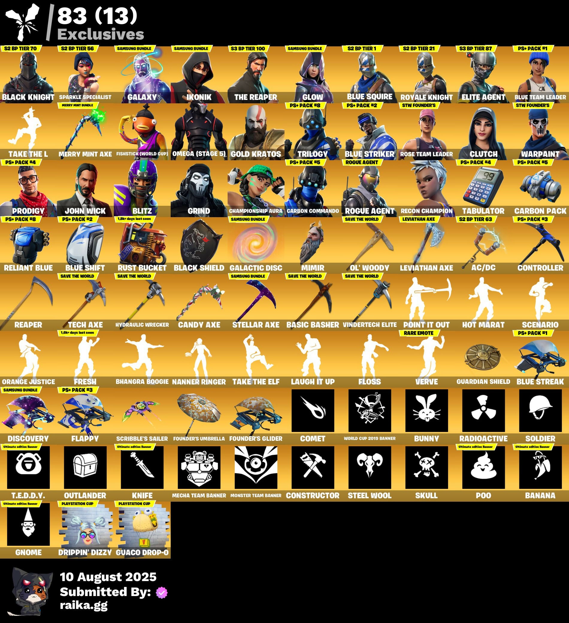 384 skins ✅ OG STW ✅ Black Knight ✅ Sparkle Specialist ✅ Galaxy ✅ IKONIK ✅ The Reaper ✅ Glow ✅ Blue Squire ✅ Merry Mint Axe✅ Elite Agent ✅