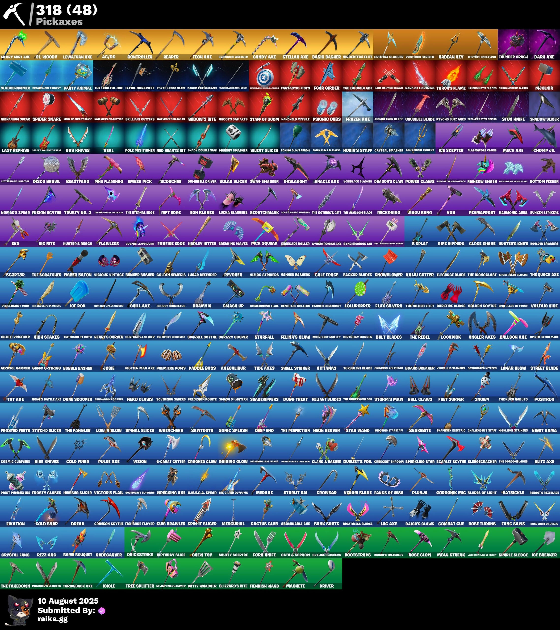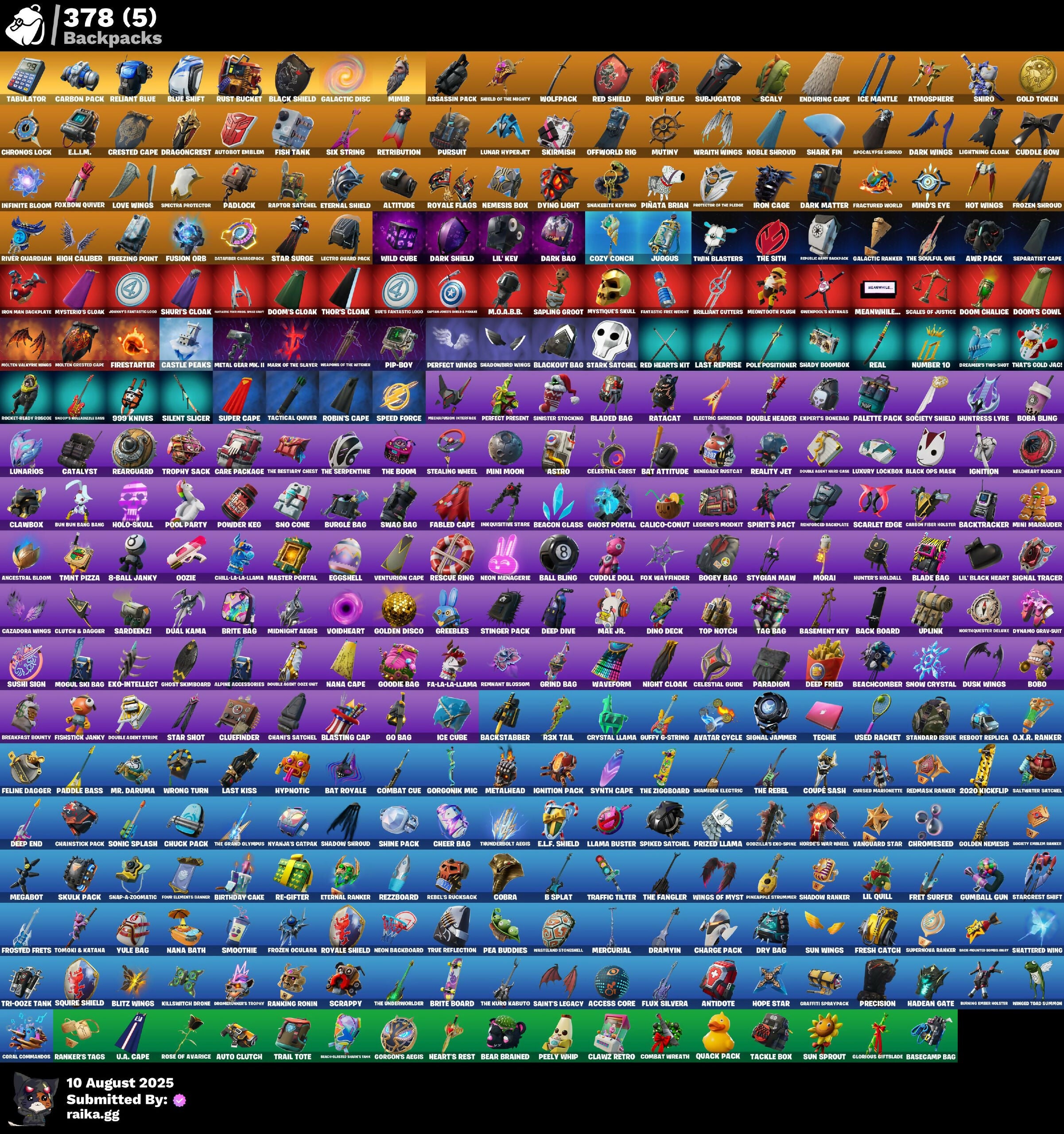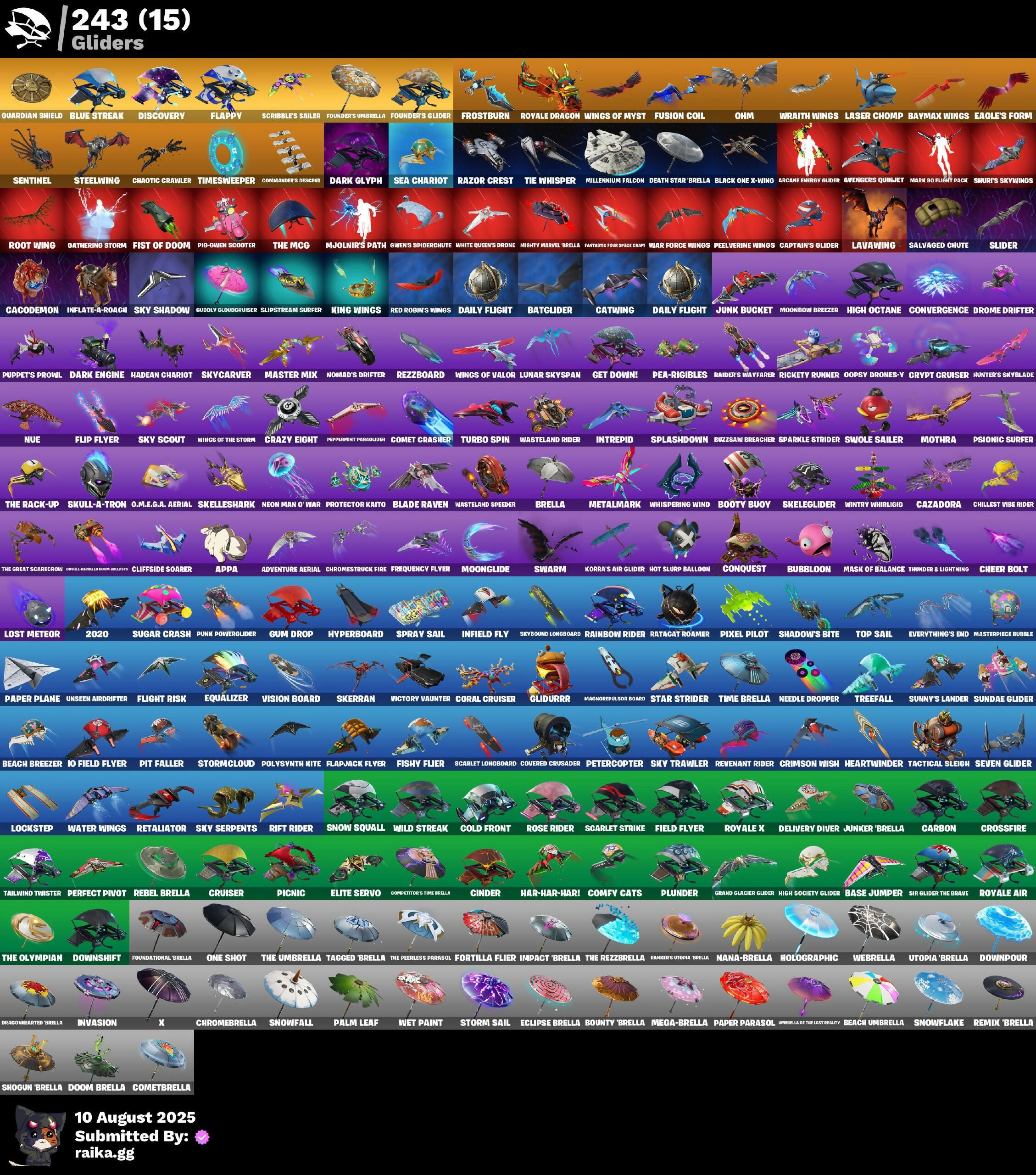 (Snikt!), 1-00 Power Armor, 1-Ball, 10 Field Flyer, 2020, 2020 Kickflip, 6-Carat Cutter, 8-Ball Janky, 999 Knives, A Warrior Prepares, AC/DC, AWR Pack, Abominable Axe, Absolute Zero, Abstrakt, Access Core, Acrobaatics, Adventure Aerial, Aerosol Hammer, Afk, Air Horn, Air Shredder, Alpine Accessories, Alpine Ace, Altitude, Ancestral Bloom, Angler Axes, Antidote, Antonia, Aphrodite, Apocalypse Shroud, Appa, Aquaman's Trident, Arcane Energy Glider, Arcane Research, Archetype, Arctic Adeline, Arctic Assassin, Arrowpoint Carver, Artemis, Artemis Codename, Assassin Pack, Assault Trooper, Assaultron Blade, Astrea, Astro, Atmosphere, Aura, Auto Clutch, Autobot Emblem, Avatar Cycle, Avatar's Flourish, Avengers Quinjet, Aw, Shucks., Axecalibur, Axo, Ayla Winn, B Splat, B-Ball Vs Scratch, BPM Breakdown, Back Board, Backlash, Backstabber, Backtracker, Backup Blades, Balance Board, Ball Bling, Baller, Balloon Axe, Banana, Bandolette, Bank Shots, Base Jumper, Basecamp Bag, Basement Key, Basic Basher, Bat Attitude, Bat Royale, Batglider, Batsickle, Battle Blessing, Battle Hound, Battlehawk, Baymax Wings, Be Seeing You, Beach Bomber, Beach Breezer, Beach Umbrella, Beachbluff Shark's Tale, Beachcomber, Beacon Glass, Bear Brained, Bear Hug, Beastfang, Beatz Bunny, Beef Boss, Ben Grimm, Best Mates, Bhangra Boogie, Big Bite, Big Chuggus, Big Fan, Billy Bounce, Birdarang Flourish, Birthday Basher, Birthday Cake, Birthday Slice, Bizcochito, Black Knight, Black One X-Wing, Black Ops Mask, Black Shield, Blackheart, Blackout Bag, Blade Bag, Blade Raven, Blade of the Haring Moon, Bladed Bag, Blades of Light, Blasting Cap, Blaze, Blitz, Blitz Axe, Blitz Wings, Blizzard’s Bite, Blowing Bubbles, Blue Shift, Blue Squire, Blue Streak, Blue Striker, Blue Team Leader, Board Breaker, Boba Bling, Boba Snack, Bobo, Bogey Bag, Boing!, Bolt Blades, Bomb Bouquet, Boobytrapped, Boogie Down, Boomin', Bootstraps, Booty Buoy, Bottom Feeder, Boulder Breakers, Bouncer, Bounty Brella, Boxing Glove Arrow, Breakdown, Breakfast Bounty, Breakin', Breaking Point, Breaking Waves, Breakneck, Breakpoint, Breakshore Trident, Breathless Blades, Brella, Brilliant Cutters, Bring It Around, Brite Bag, Brite Board, Brite Bomber, Brite Gunner, Bubbaloon, Bubble Basher, Bully, Bun Bun Bang Bang, Bunker Basher, Bunker Jonesy, Bunny, Bunny Brawler, Burgle Bag, Burn Bright, Burpee, Busk, Buzzsaw Breacher, Bytes, Cacodemon, Cactus Club, Calamity, Calculated, Calico-Coconut, Called Shot, Cameo Vs Chic, Candy Axe, Caper, Captain America, Captain Janeway's 3-D Poker, Captain Jones, Captain's Glider, Carbide, Carbon, Carbon Commando, Carbon Fiber Holster, Carbon Pack, Card Drop, Care Package, Castle Peaks, Catalyst, Catflip, Catwing, Cauldron Chill, Cazadora, Cazadora Wings, Celestial Crest, Celestial Guide, Cerberus, Chain's Satchel, Chainstick Pack, Challenger’s Staff, Championship Aura, Chani, Chaos Director, Chaos Double Agent, Chaotic Crawler, Charge Pack, Cheer Bag, Cheer Bolt, Chef's Special, Chew Toy, Chili-La-La-Llama, Chill-Axe, Chillest Vibe Rider, Chomp Jr., Chomp Sr., Chrome Punk, Chromebrella, Chromeseed, Chromestruck Fire, Chronos Lock, Chuck Pack, Cinder, Cipher Agent's Shield & Pouch, Clang & Basher, Clara, Clawbox, Clawz Retro, Clean Sweep, Cliffside Soarer, Clix, Close Shave, Cluck Strut, Cluefinder, Clutch, Clutch & Dagger, Cobalt, Cobra, Codecarver, Codename E.L.F., Cold Front, Cold Furia, Cold Snap, Combat Cue, Combat Wreath, Comet, Comet Crasher, Cometbrella, Comfy Cats, Commander's Descent, Commando, Company Jig, Competitor's Tire Brella, Conch Call, Conga, Conquest, Constructor, Controller, Convergence, Coral Commandos, Coral Cruiser, Cosmic Cleavers, Cosmic Llamacorn, Count It!, Coupé Sash, Covered Crusader, Cozy Conch, Crack It, Crazy Eight, Crescent Shroom, Crested Cape, Crimson Elite, Crimson Polestar, Crimson Scythe, Crimson Wish, Crooked Claw, Crossfire, Crossguard Short Sword Pack, Crowbar, Crowning Achievement, Crucible Blade, Cruiser, Crypt Cruiser, Crystal Fang, Crystal Llama, Crystal Smasher, Cuddle Bow, Cuddle Doll, Cuddle Team Leader, Cuddly Cloudcruiser, Culture Club Commando, Curling Iron, Cursed Marionette, Cybertronian Axe, DJ Yonder, DJ.lM., Dab, Dabstand, Dahlia, Daigo, Daigo’s Claws, Daily Flight, Dance Monkey, Dark Axe, Dark Bag, Dark Bomber, Dark Engine, Dark Glyph, Dark Jonesy, Dark Matter, Dark Red Knight, Dark Shield, Dark Side, Dark Voyager, Dark Wild Card, Dark Wings, Darkfire Claws, Dazzle, Death Star 'Brella, Deep Dab, Deep Dive, Deep End, Deep Fried, Delivery Diver, Demi, Designated Hitters, Diamond Diva, Diamond Throne, Dice Roll, Die With A Smile, Dino Deck, Dire, Dirtbike Challenge, Disco Brawl, Disco Fever, Discovery, Dive Knives, Do The Split, Doctor Doom, Dogg Treat, Don't Stare Now, Doom, Doom Brella, Doom Chalice, Doom Slayer, Doom's Cloak, Doom's Cowl, Double Agent Hard Case, Double Agent Husky, Double Agent Oozie Unit, Double Agent Stripe, Double Agent Whildy, Double Header, Downpour, Downshift, Doze Dab, Dragon Stance, Dragon's Claw, Dragoncrest, Dragonhearted 'Brella, Dramatic Flares, Dramvin, Dread, Dream, Dreamer's Tied-Shot, Dreamsclaw Picker, Drift, Drippin' Dizzy, Driver, Drome Drifter, Dromejanner's Trophy, Droop, Dry Bag, Dual Kama, Duelist's Foil, Dumbbell Driver, Dummy, Dune Scooper, Dusk, Dusk Knight, Dusk Wings, Dusty, Dying Light, Dynamo Gray-Suit, Dynamo Tintina, E.L.F. Shield, E.L.I.M., EVA, Eagle's Form, Echo, Eclipse Brella, Eggshell, Electric Shredder, Electro Pairing Blades, Electro Swing, Elegance Blade, Elite Agent, Elite Servo, Ember, Ember Baton, Ember Pick, Ember Ward Helmset, Emma Frost, Empress Fan Dance, Enduring Cape, Enforcer, Eon Blades, Epic Blade of Floof, Equalizer, Era, Eternal Knight, Eternal Ranker, Eternal Shield, Eternal Voyager, Everything's End, Exo-Intellect, Expert's Bonebag, Explorer Emilie, Expressionism, Extraterrestrial, Ezio Auditore, Fa-La-La-Llama, Fable, Fabled Cape, Fade, Fang Dance, Fang Saws, Fanged Foresight, Fangs of Hesk, Fantasi
