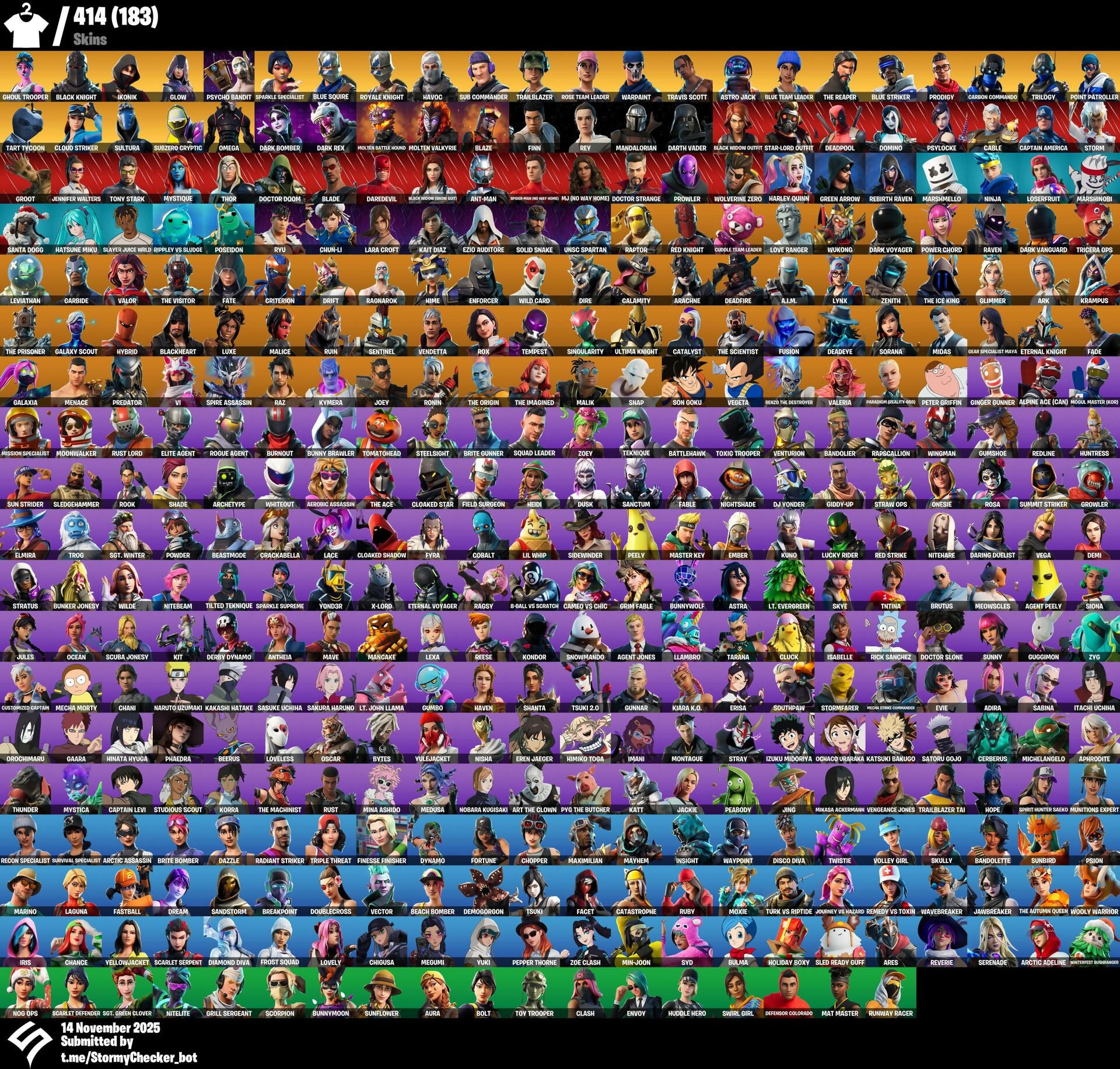 414 Skins | OG STW | OG Ghoul Trooper | Black Knight | IKONIK | Glow | Sparkle Specialist | Blue Squire | Royale Knight | AC/DC | Instigator | Tenderizer | S11-Badge-3 | S12-Badge-3 | S12-Badge-4 | 600 VB