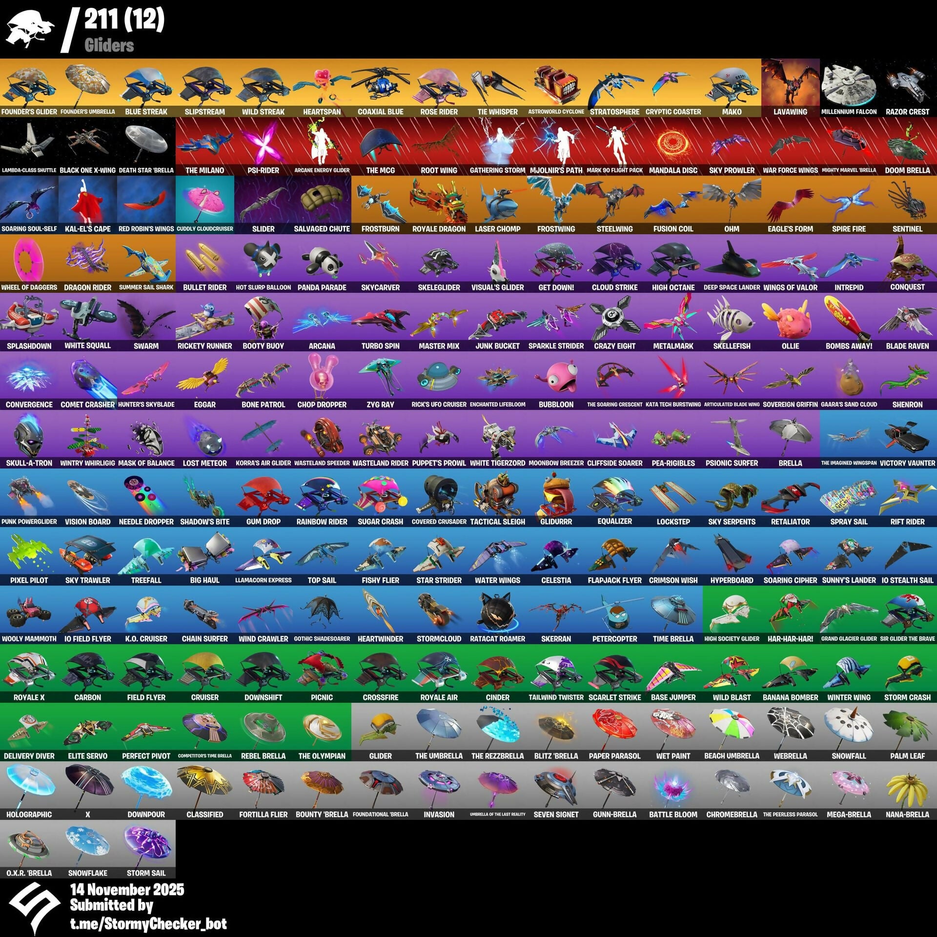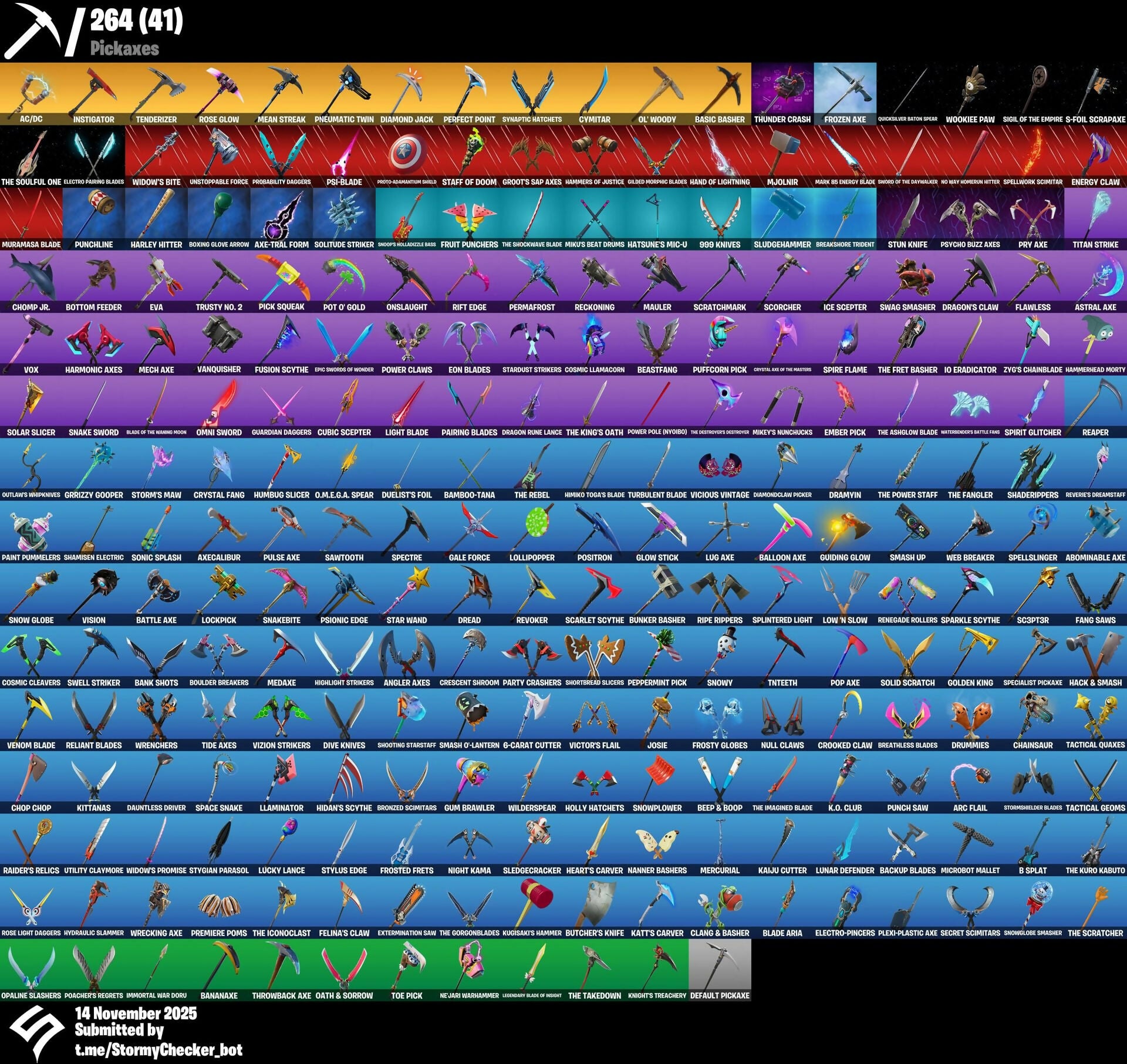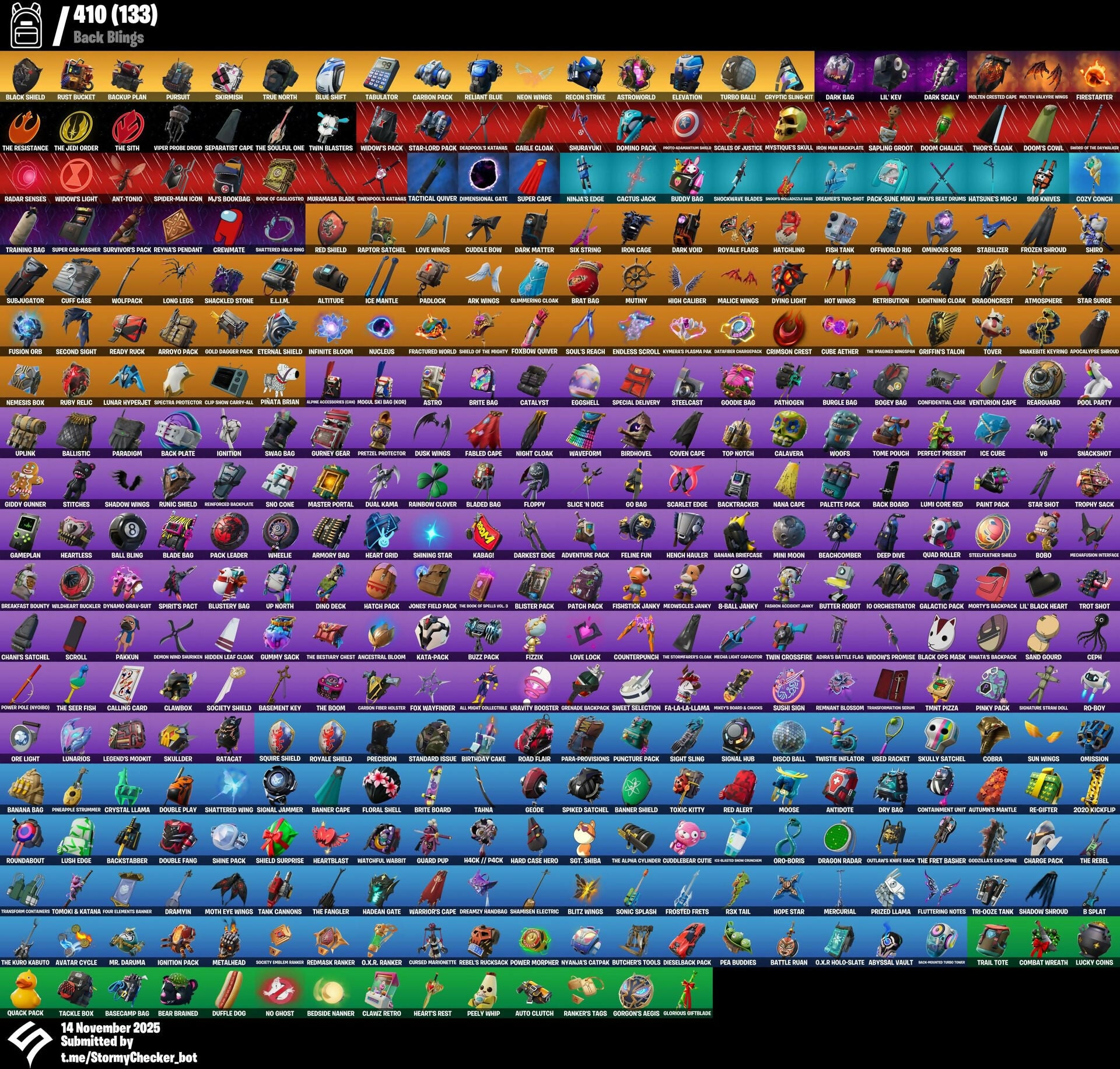 10 Field Flyer, 10 Stealth Sail, 2020 Kickflip, 6-Carat Cutter, 8-Ball Janky, 8-Ball Vs Scratch, 999 Knives, A Warrior Prepares, A.I.M., Abominable Axe, Abyssal Vault, Ac/Dc, Adira, Adira’s Battle Flag, Advanced Math, Adventure Pack, Aerobic Assassin, Agent Jones, Agent Peely, Air Horn, Air Shredder, All Night Collectible, Alpine Ace (CAN), Altitude, Ambitious, Ancestral Bloom, Angler Axes, Ant-Man, Ant-Tonio, Antheia, Antidote, Aphrodite, Apocalypse Shroud, Arachne, Arc Flail, Arcana, Arcane Energy Glider, Archetype, Arctic Adeline, Arctic Assassin, Ares, Ark, Ark Wings, Armory Bag, Arroyo Pack, Art The Clown, Articulated Blade Wing, Astra, Astral Axe, Astro, Astro Jack, Astroworld, Astroworld Cyclone, Atmosphere, Aura, Auto Clutch, Autumn's Mantle, Avatar Cycle, Avatar's Flourish, Axe-Tral Form, Axecalibur, Azarath Metrion Zinthos, B Splat, Back Board, Back Mounted Turbo Timer, Back On 74, Back Plate, Backstabber, Backstroke, Backtracker, Backup Blades, Backup Plan, Bad Guy, Ball Bling, Baller, Ballistic, Balloon Axe, Bamboo-Tana, Banana Bag, Banana Bomber, Banana Briefcase, Bananaxe, Bandolier, Bandollete, Bank Shots, Banner Cape, Banner Shield, Base Jumper, Basecamp Bag, Basement Key, Basic Basher, Battle Axe, Battle Bloom, Battle Ruan, Battlehawk, Beach Bomber, Beach Umbrella, Beachcomber, Bean Bag, Bear Brained, Beastfang, Beastmode, Bedside Nanner, Beep & Boop, Beep Beep, Beerus, Best Mates, Big Haul, Billy Bounce, Bim Bam Boom, Birdhovel, Birthday Cake, Black Knight, Black One X-Wing, Black Ops Mask, Black Shield, Black Widow Outfit, Black Widow Snow Suit, Blackheart, Blade, Blade Aria, Blade Bag, Blade Of The Waning Moon, Blade Raven, Bladed Bag, Blaze, Blinding Lights, Blister Pack, Blitz 'Brella, Blitz Wings, Blowin' Up, Blowing Bubbles, Blue Shift, Blue Squire, Blue Streak, Blue Striker, Blue Team Leader, Blustery Bag, Bobbin', Bobo, Bogey Bag, Boing!, Bolt, Bombs Away!, Bone Patrol, Boneless, Bood' Up Groove, Boogie Down, Book of Cagliostro, Boomin', Boosting Ki, Boots 'N Cats, Booty Buoy, Bottom Feeder, Boulder Breakers, Bounce Berry, Bounce Wit' It, Bouncer, Bounty 'Brella, Boxing Glove Arrow, Boy's A Liar, Brat Bag, Breakdown, Breakfast Bounty, Breakin', Breakneck, Breakpoint, Breakshore Trident, Breathless Blades, Brella, Brite Bag, Brite Board, Brite Bomber, Brite Gunner, Bronzed Scimitars, Brutus, Bubbloon, Buddy Bag, Build Up, Bullet Rider, Bulma, Bunker Basher, Bunker Jonesy, Bunny Brawler, Bunny Hop, Bunnymoon, Bunnywolf, Burgle Bag, Burnout, Burpee, Butcher's Knife, Butcher's Tools, Butter Robot, Buzz Pack, Bytes, Cable, Cable Cloak, Cactus Jack, Cairo, Calamity, Calavera, Calculated, Call Me, Calling Card, Cameo Vs Chic, Captain America, Captain Levi, Carbide, Carbon, Carbon Commando, Carbon Fiber Holster, Carbon Pack, Card Drop, Cardistry, Carefree, Cat Flip, Catalyst, Catastrophe, Celestia, Ceph, Cerberus, Chain Surfer, Chainsaur, Challenge, Chan's Satchel, Chance, Chani, Charge Pack, Cheer Up, Chef's Special, Chicken Wing It, Chigusa, Chomp Jr., Chop Chop, Chop Dropper, Chopper, Chromebrella, Chun-Li, Cinder, Clang & Basher, Clash, Classified, Classy, Clawbox, Clawz Retro, Clean Groove, Clean Sweep, Cliffside Soarer, Clip Show Carry-All, Cloaked Shadow, Cloaked Star, Cloud Strike, Cloud Striker, Cluck, Cluck Strut, Coaxial Blue, Cobalt, Cobra, Coin Flip, Combat Wreath, Comet Crasher, Committed, Competitor's Time Brella, Conch Call, Confidential Case, Confused, Conga, Conjure Weapon, Conquest, Containment Unit, Controller Crew, Convergence, Cosmic Cleavers, Cosmic Llamacorn, Counterpunch, Coven Cape, Covered Crusader, Cozy Conch, Crabby, Crackabella, Crackdown, Crazy Eight, Crazy Feet, Crazyboy, Crescent Shroom, Crewmate, Crimson Crest, Crimson Wish, Criss Cross, Criterion, Crooked Claw, Crossfire, Crowning Achievement, Cruiser, Cryptic Coaster, Cryptic Sling-Kit, Crystal Axe Of The Masters, Crystal Fang, Crystal Llama, Cube Aether, Cubic Scepter, Cuddle Bow, Cuddle Team Leader, Cuddlebear Cutie, Cuddly Cloudcruiser, Cuff Case, Culture Festival Dance, Cursed Marionette, Customized Captain, Cyclo Curl, Cymitar, DJ Yonder, Dab, Dabstand, Dagger Dance, Dance Moves, Dance Off, Dance Therapy, Dancin' Domino, Daredevil, Daring Duelist, Dark Bag, Dark Bomber, Dark Matter, Dark Rex, Dark Scaly, Dark Vanguard, Dark Void, Dark Voyager, Darkest Edge, Darth Vader, Datafiber Chargepack, Dauntless Driver, Davdream, Dazzle, Deadeye, Deadfire, Deadpool, Deadpool's Katanas, Death Star 'Brella, Deep Dive, Deep End, Deep Space Lander, Default Pickaxe, Defensor Colorado, Delivery Diver, Demi, Demogorgon, Demon Wind Shuriken, Derby Dynamo, Diamond Diva, Diamond Jack, Diamond Throne, Diamondclaw Picker, Dieselback Pack, Dimensional Gate, Dino Deck, Dire, Disco Ball, Disco Diva, Disco Fever, Distraction Dance, Dive Knives, Doctor Doom, Doctor Slone, Doctor Strange, Domino, Domino Pack, Don't Start Now, Doom Brella, Doom Chalice, Doom's Cowl, Double Fang, Double Play, Double Up, Doublecross, Downpour, Downshift, Doze Dab, Dragon Radar, Dragon Rider, Dragon Rune Lance, Dragon Stance, Dragon's Claw, Dragoncrest, Dramyin, Dread, Dream, Dream Feet, Dreamers Two-Shot, Dreamzy Handbag, Drift, Drippin' Flavor, Droop, Drop The Bass, Drum Major, Drummies, Dry Bag, Dual Kama, Duelist's Foil, Duffle Dog, Dusk, Dusk Wings, Dying Light, Dynamic Shuffle, Dynamo, Dynamo Grav-Suit, E.L.I.M., Eagle's Form, Eggar, Eggshell, Electro Pairing Blades, Electro Shuffle, Electro Swing, Electro-Pincers, Elektra (No Way Home), Elevation, Elite Agent, Elite Servo, Elmira, Ember, Ember Pick, Enchanted Lifebloom, Endless Scroll, Energy Claw, Enforcer, Envoy, Eon Blades, Epic Swords Of Wonder, Equalizer, Eren Jaeger, Erisa, Eternal Knight, Eternal Shield, Eternal Voyager, Eva, Evasive Maneuvers, Everybody Loves Me, Evie, Expressionism, Extermination Saw, Extraterrestrial, Ezio Auditore, Fa-La-La-Llama, Fable, Fabled Cape, Facet, Fade, Fandangle, Fang Saws, Fashion Accident Janky, Fastball, Fate, Featherweight, Fel