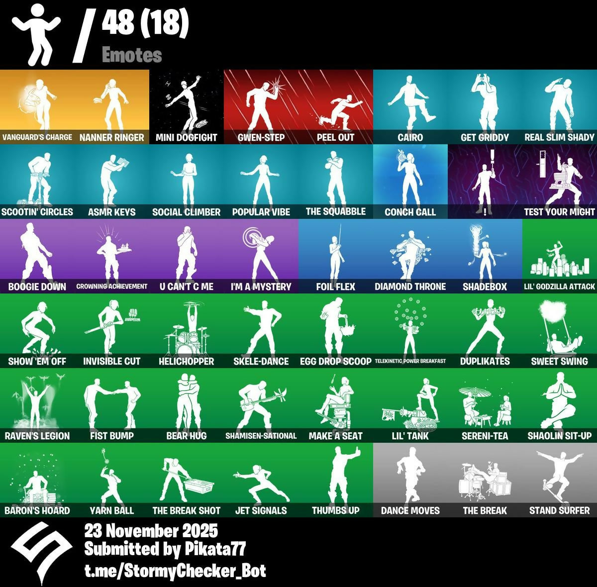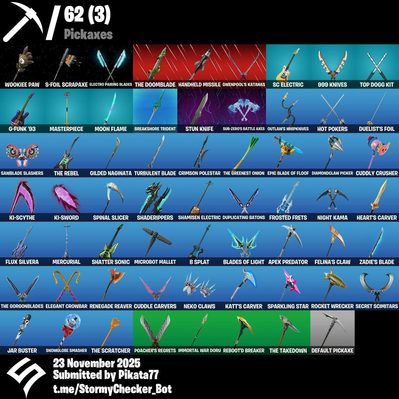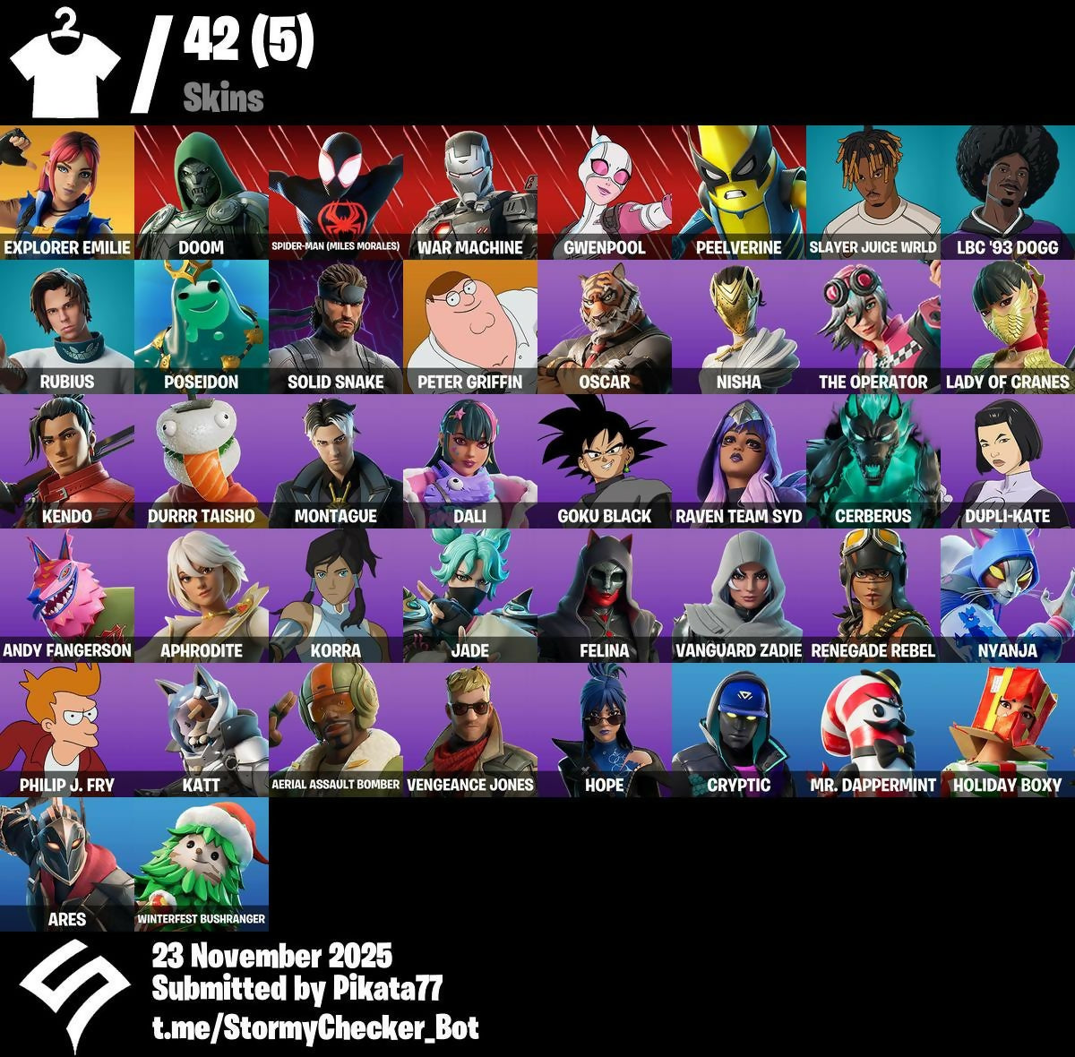 42 Skins | Explorer Emilie | Solid Snake | Doom | Oscar | Holiday Boxy | Default Pickaxe | Stun Knife | The Doomblade | 100 VB