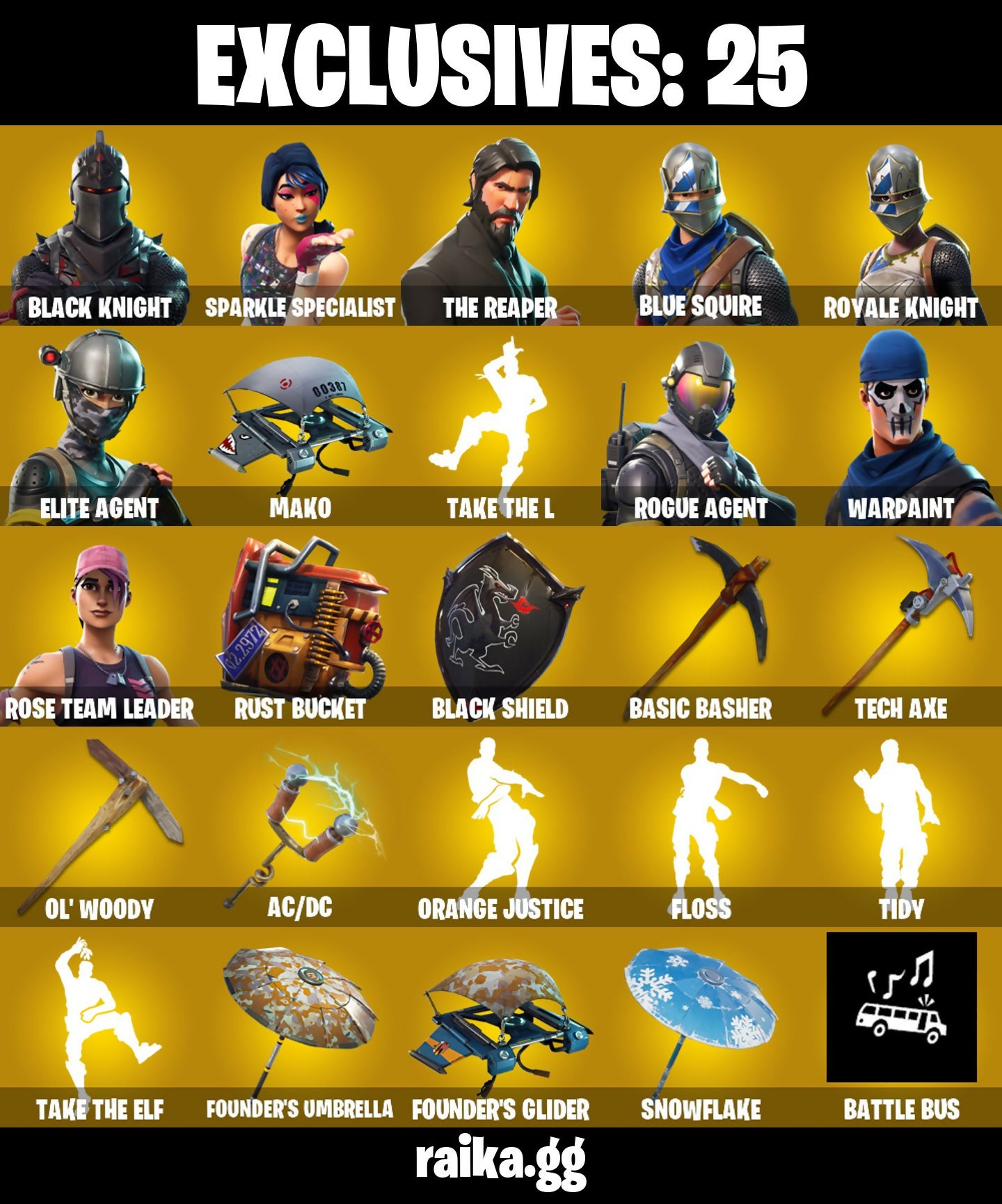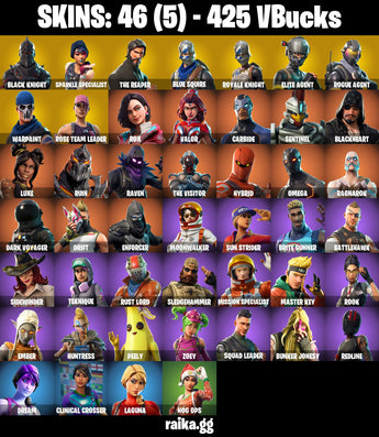 46 skins ✅ OG STW ✅ Black Knight ✅ Sparkle Specialist ✅ The Reaper ✅ Blue Squire ✅ Royale Knight ✅ Elite Agent ✅ Mako ✅ Take The L ✅ Rogue Agent ✅ 425 VB