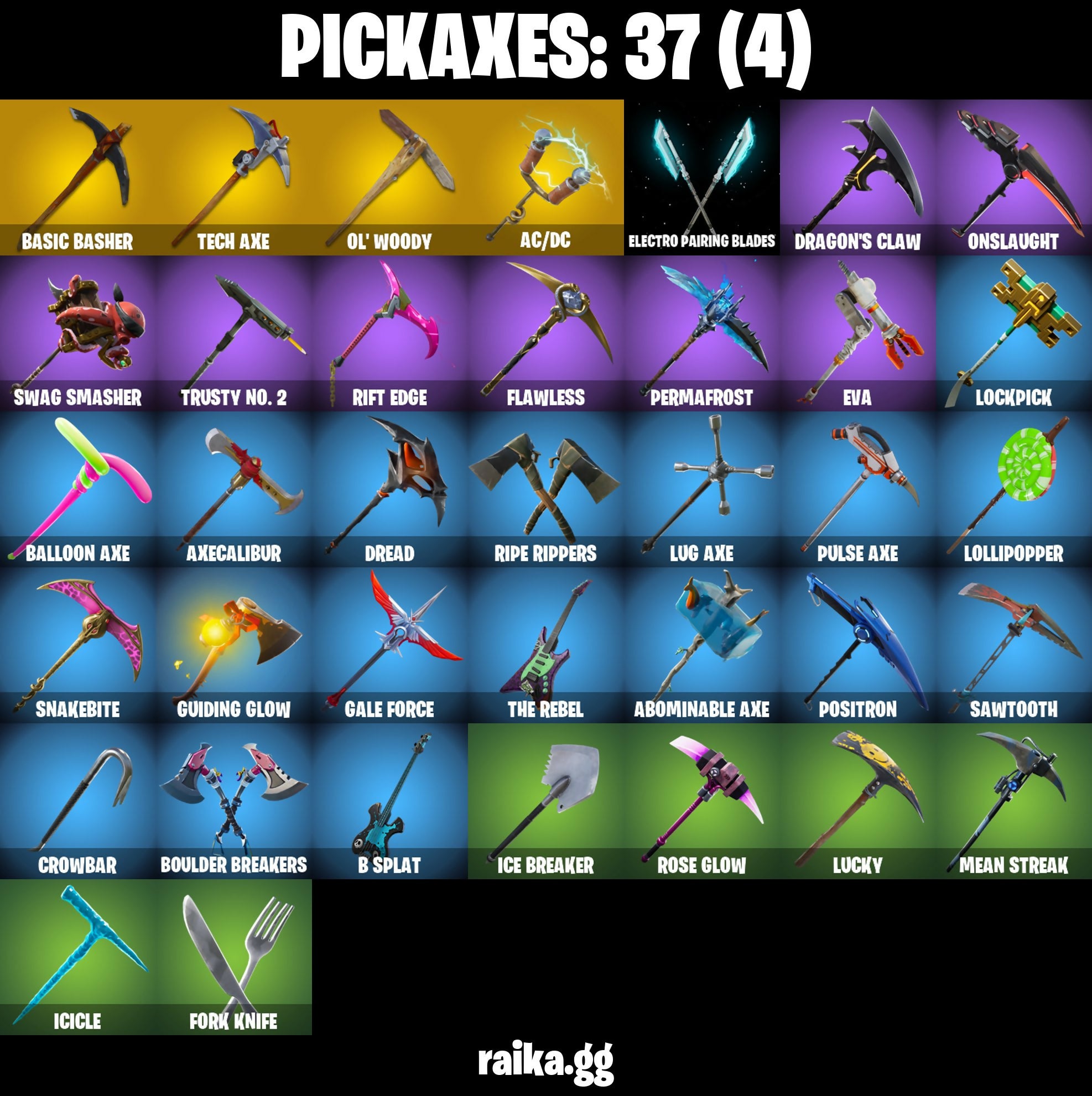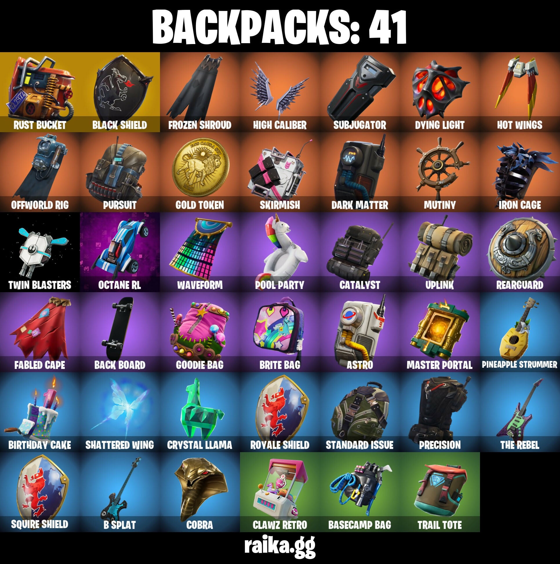AC/DC, Abominable Axe, Astro, Axecalibur, B Splat, Back Board, Balloon Axe, Basecamp Bag, Basic Basher, Battle Bus, Battlehawk, Best Mates, Birthday Cake, Black Knight, Black Shield, Blackheart, Blue Squire, Boogie Down, Boulder Breakers, Breakdown, Brite Bag, Brite Gunner, Bunker Jonesy, Calculated, Carbide, Catalyst, Clawz Retro, Clinical Crosser, Cluck Strut, Cobra, Conga, Crowbar, Crystal Llama, Dark Matter, Dark Voyager, Dip, Dragon Stance, Dragon's Claw, Dread, Dream, Drift, Dying Light, Electro Pairing Blades, Electro Shuffle, Elite Agent, Ember, Enforcer, Eva, Fabled Cape, Fierce, Flawless, Floss, Fork Knife, Founder's Glider, Founder's Umbrella, Frozen Shroud, Gale Force, Gentleman's Dab, Gold Token, Golf Clap, Goodie Bag, Groove Jam, Ground Pound, Guiding Glow, Hello Friend, High Caliber, Hoop Master, Hootenanny, Hot Wings, Huntress, Hybrid, Hype, Ice Breaker, Icicle, Iron Cage, Jubilation, Keep It Mello, Laguna, Lockpick, Lollipopper, Lucky, Lug Axe, Luxe, Mako, Master Key, Master Portal, Mean Streak, Mic Drop, Mission Specialist, Moonwalker, Mutiny, Nana Nana, Nog Ops, Octane RL, Offworld Rig, Ol' Woody, Omega, Onslaught, Orange Justice, Peace Out, Peely, Permafrost, Pineapple Strummer, Pony Up, Pool Party, Popcorn, Positron, Precision, Pulse Axe, Pursuit, Ragnarok, Raven, Reanimated, Rearguard, Redline, Regal Wave, Respect, Respect The Peace, Ride The Pony, Rift Edge, Ripe Rippers, Rogue Agent, Rook, Rose Glow, Rose Team Leader, Rox, Royale Knight, Royale Shield, Ruin, Rust Bucket, Rust Lord, Salute, Sawtooth, Sentinel, Shattered Wing, Sidewinder, Skirmish, Sledgehammer, Snakebite, Snoozefest, Snowflake, Sparkle Specialist, Squad Leader, Squire Shield, Standard Issue, Subjugator, Sun Strider, Swag Smasher, Swipe It, T-Pose, Take The Elf, Take The L, Tech Axe, Teknique, The Reaper, The Rebel, The Robot, The Visitor, The Worm, Tidy, Trail Tote, Trusty No. 2, Twin Blasters, Uplink, Valor, Warpaint, Wave, Waveform, Widow's Pirouette, Yay!, You're Awesome, Zoey
