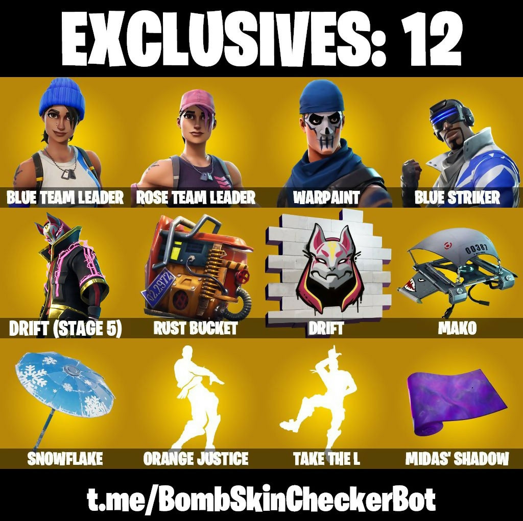 51 SKINS | DRIFT (STAGE 5) | OG STW | BLUE STRIKER | MAKO | WARPAINT | ROSE TEAM LEADER | BLUE TEAM LEADER | AQUAMAN | POLAR PEELY | FADE | CALAMITY | KYMERA | ETERNAL KNIGHT | DARK VOYAGER | JOEY | MOONWALKER | JULES | EMAIL CHANGEABLE