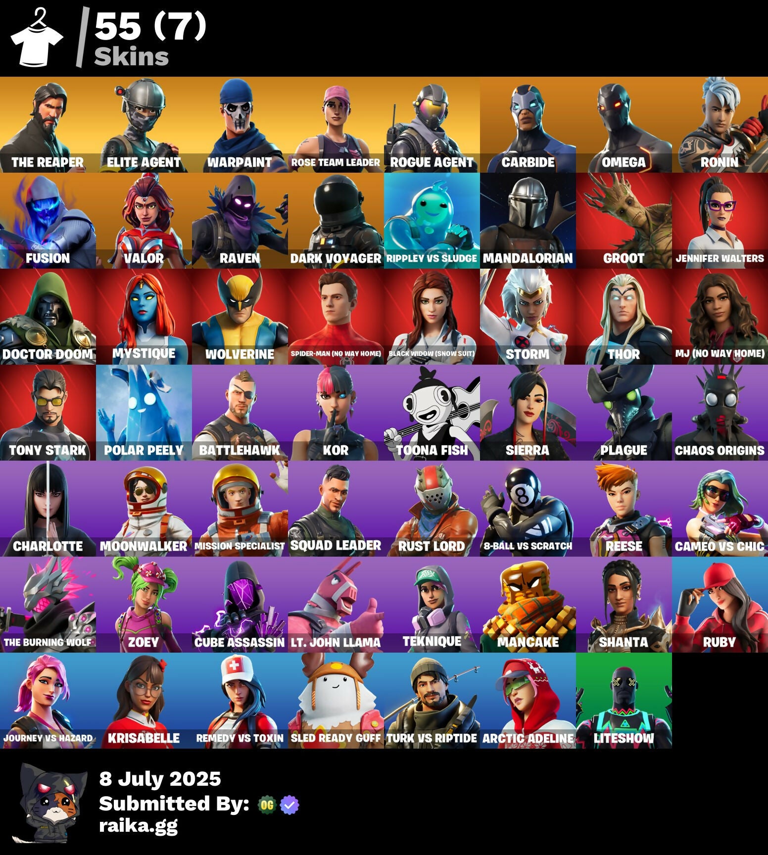 55 skins | OG STW | The Reaper | Elite Agent | Take The L | Rogue Agent | Carbide | Omega | Ronin | Fusion | Valor | Raven | Dark Voyager | 650 VB