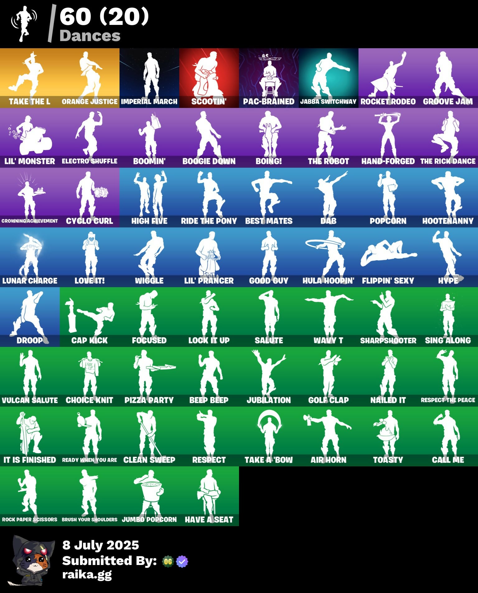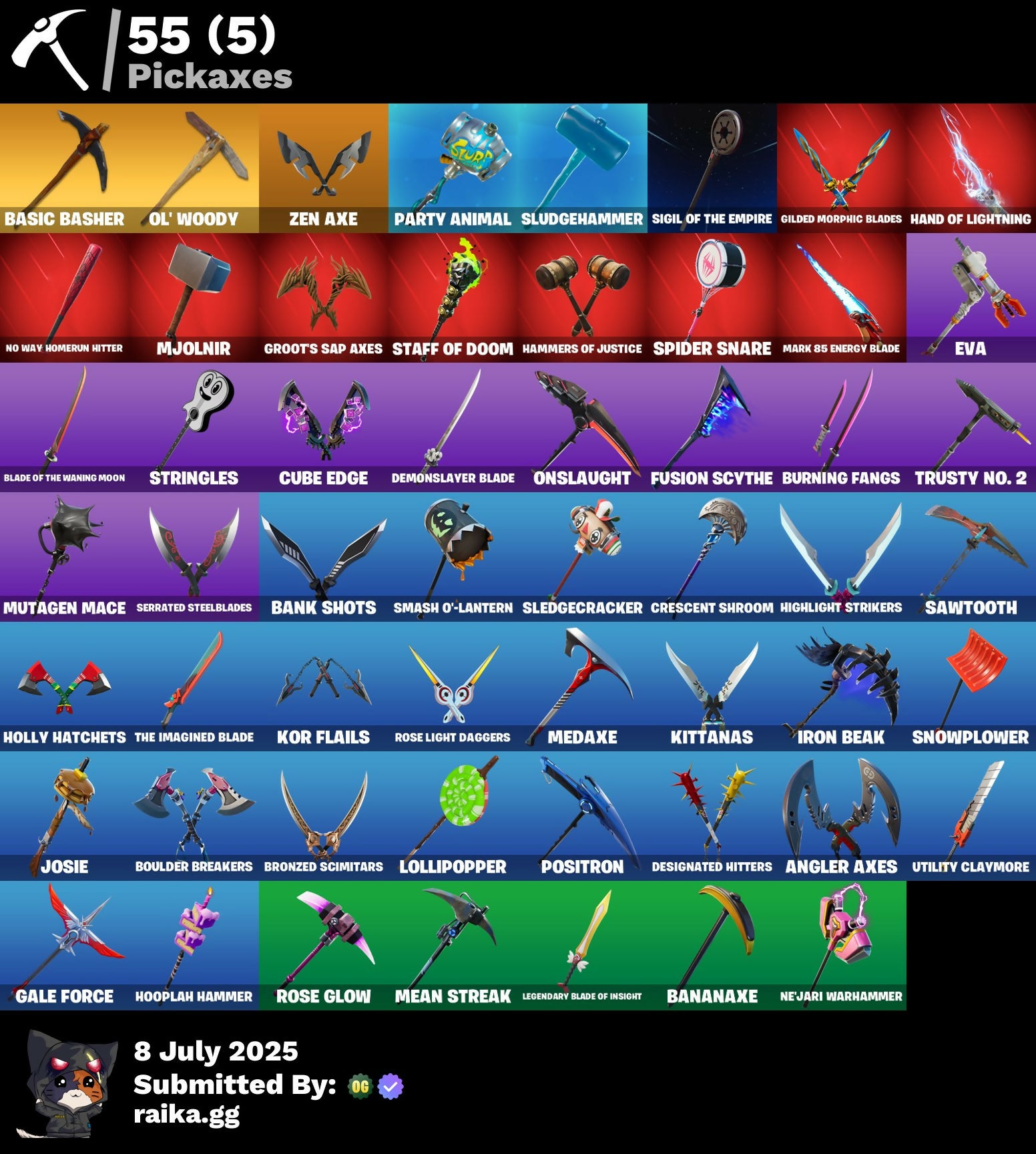 8-Ball Vs Scratch, Air Horn, Angler Axes, Arctic Adeline, Bananaxe, Bank Shots, Basic Basher, Battlehawk, Beep Beep, Best Mates, Black Widow (Snow Suit), Blade of the Waning Moon, Boing!, Boogie Down, Boomin', Boulder Breakers, Bronzed Scimitars, Brush Your Shoulders, Burning Fangs, Call Me, Cameo Vs Chic, Cap Kick, Carbide, Chaos Origins, Charlotte, Choice Knit, Clean Sweep, Crescent Shroom, Crowning Achievement, Cube Assassin, Cube Edge, Cyclo Curl, Dab, Dark Voyager, Demonslayer Blade, Designated Hitters, Doctor Doom, Droop, Electro Shuffle, Elite Agent, Eva, Flippin' Sexy, Focused, Fusion, Fusion Scythe, Gale Force, Gilded Morphic Blades, Golf Clap, Good Guy, Groot, Groot's Sap Axes, Groove Jam, Hammers of Justice, Hand of Lightning, Hand-Forged, Have A Seat, High Five, Highlight Strikers, Holly Hatchets, Hooplah Hammer, Hootenanny, Hula Hoopin', Hype, Imperial March, Iron Beak, It Is Finished, Jabba Switchway, Jennifer Walters, Josie, Journey Vs Hazard, Jubilation, Jumbo Popcorn, Kittanas, Kor, Kor Flails, Krisabelle, Legendary Blade of Insight, Lil' Monster, Lil' Prancer, Liteshow, Lock It Up, Lollipopper, Love It!, Lt. John Llama, Lunar Charge, MJ (No Way Home), Mancake, Mandalorian, Mark 85 Energy Blade, Mean Streak, Medaxe, Mission Specialist, Mjolnir, Moonwalker, Mutagen Mace, Mystique, Nailed It, Ne'jari Warhammer, No Way Homerun Hitter, Ol' Woody, Omega, Onslaught, Orange Justice, Pac-Brained, Party Animal, Pizza Party, Plague, Polar Peely, Popcorn, Positron, Raven, Ready When You Are, Reese, Remedy Vs Toxin, Respect, Respect The Peace, Ride The Pony, Rippley Vs Sludge, Rock Paper Scissors, Rocket Rodeo, Rogue Agent, Ronin, Rose Glow, Rose Light Daggers, Rose Team Leader, Ruby, Rust Lord, Salute, Sawtooth, Scootin', Serrated Steelblades, Shanta, Sharpshooter, Sierra, Sigil of the Empire, Sing Along, Sled Ready Guff, Sledgecracker, Sludgehammer, Smash O'-Lantern, Snowplower, Spider Snare, Spider-Man (No Way Home), Squad Leader, Staff of Doom, Storm, Stringles, Take A 'Bow, Take The L, Teknique, The Burning Wolf, The Imagined Blade, The Reaper, The Rick Dance, The Robot, Thor, Toasty, Tony Stark, Toona Fish, Trusty No. 2, Turk Vs Riptide, Utility Claymore, Valor, Vulcan Salute, Warpaint, Wavy T, Wiggle, Wolverine, Zen Axe, Zoey