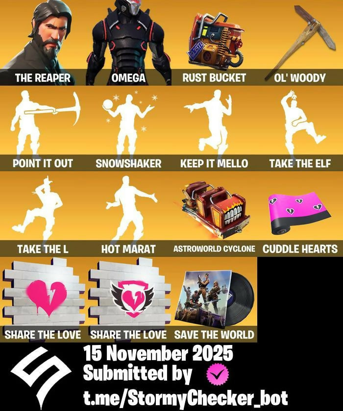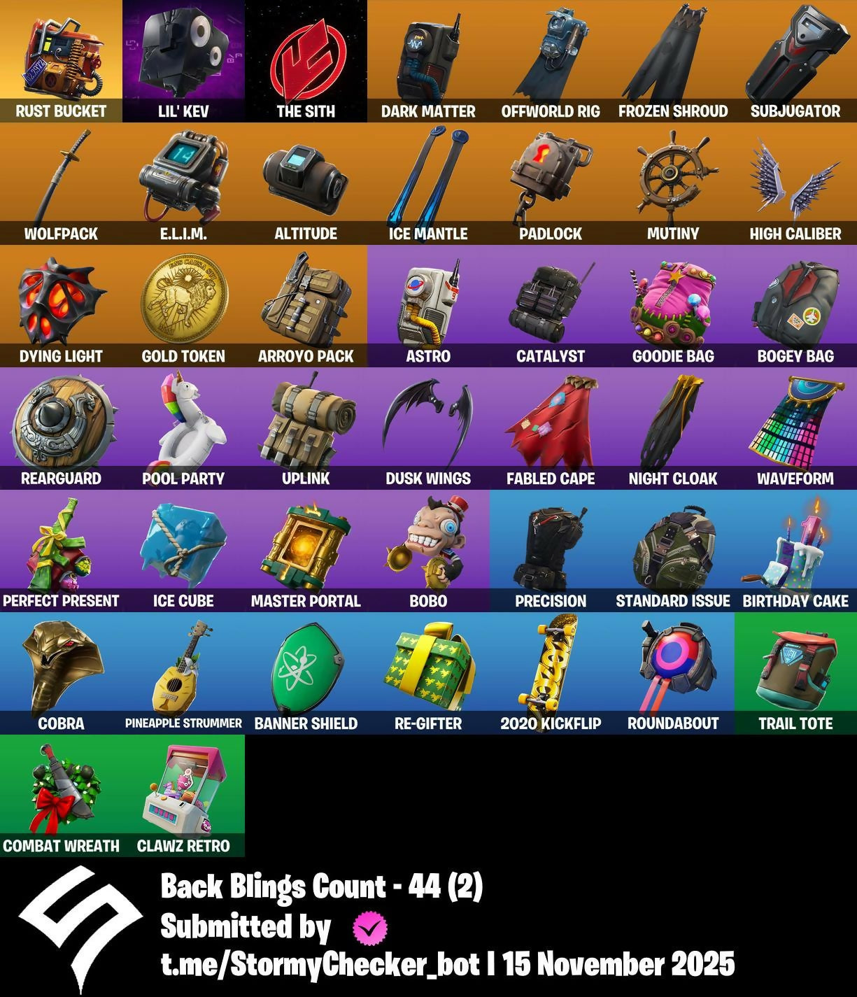 2020 Kickflip, A.I.M., Abominable Axe, Altitude, Arroyo Pack, Astro, Astroworld Cyclone, Balloon Axe, Bananaxe, Banner Shield, Battlehawk, Beach Umbrella, Beep Beep, Best Mates, Birthday Cake, Blackheart, Bobo, Bogey Bag, Booty Buoy, Breakdown, Brite Bomber, Bullseye, Calamity, Calculated, Call Me, Carbide, Carbon, Cat Flip, Catalyst, Cinder, Classified, Clawz Retro, Cobra, Combat Wreath, Conga, Conquest, Covered Crusader, Crossfire, Crowbar, Cruiser, Cuddle Hearts, DJ Yonder, Dab, Dance Moves, Dark Matter, Dark Voyager, Default Pickaxe, Dire, Downshift, Dragon Stance, Dragon's Claw, Dread, Drift, Dusk, Dusk Wings, Dying Light, E.L.I.M., Electro Shuffle, Elite Agent, Ember, Enforcer, Equalizer, Eva, Fable, Fabled Cape, Fierce, Flamenco, Flawless, Free Flow, Frozen Axe, Frozen Shroud, Gale Force, Gentleman's Dab, Get Funky, Giddy-Up, Glider, Glidurrr, Gold Token, Golf Clap, Goodie Bag, Groove Jam, Guiding Glow, Hello Friend, High Caliber, High Octane, Holographic, Hoop Master, Hot Marat, Huntress, Hybrid, Hype, Ice Breaker, Ice Cube, Ice Mantle, Ice Scepter, Icicle, Infinite Dab, Intrepid, Iris, It's Go Time!, Jungle Scout, Keep It Mello, Kick Ups, Laguna, Lil' Kev, Lockpick, Lockstep, Lollipopper, Lt. Evergreen, Lug Axe, Luxe, Lynx, Marshy Smasher, Master Key, Master Portal, Mic Drop, Millennium Falcon, Mission Specialist, Moonwalker, Mutiny, Nana Nana, Night Cloak, Nightshade, Offworld Rig, Ol' Woody, Omega, Onesie, Onslaught, Orange Justice, Padlock, Palm Leaf, Paper Parasol, Peely, Peppermint Pick, Perfect Present, Permafrost, Picnic, Pineapple Strummer, Point It Out, Pool Party, Pop Axe, Popcorn, Positron, Powder, Precision, Punched Up, Ragnarok, Rainbow Rider, Raise The Roof, Re-Gifter, Reaper, Rearguard, Reckoning, Redline, Regal Wave, Respect, Respect The Peace, Rickety Runner, Rift Edge, Rogue Agent, Rook, Roundabout, Royale Air, Ruin, Running Man, Rust Bucket, Rust Lord, Salute, Save The World, Sawtooth, Scorcher, Scratchmark, Sgt. Winter, Share The Love, Shimmer, Shortbread Slicers, Sidewinder, Skellefish, Sky Serpents, Sledgehammer, Slitherin', Slow Clap, Smash O'-Lantern, Smash Up, Snakebite, Snoozefest, Snowfall, Snowshaker, Splashdown, Squad Leader, Standard Issue, Studded Axe, Subjugator, Sugar Crash, Sun Strider, Swag Smasher, Swarm, Swipe It, Tactical Sleigh, Take The Elf, Take The L, Team Mech, Team Monster, Teknique, The Ice King, The Prisoner, The Reaper, The Robot, The Sith, The Umbrella, The Visitor, Trail Tote, Traitor!, Treefall, Trog, Trusty No. 2, Uplink, Valor, Waterworks, Wave, Waveform, Webrella, Wet Paint, Wingman, Wings Of Valor, Wolfpack, Wooly Warrior, X, You're Awesome, Zenith, Zoey