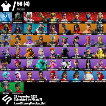56 Skins | Santa Dogg | Yulejacket | Sled Ready Guff | Arctic Adeline | Crystal | Default Pickaxe | Dogg Treat | pickaxe_almondsplash_bass | 150 VB