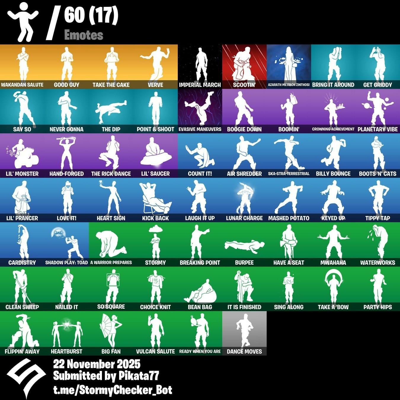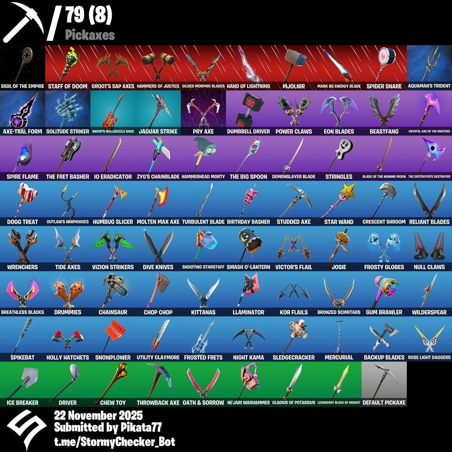 A Warrior Prepares, Agent Jones, Air Shredder, Aquaman's Trident, Arctic Adeline, Axe-Tral Form, Azarath Metrion Zinthos!, Backup Blades, Bean Bag, Beastfang, Big Fan, Billy Bounce, Birthday Basher, Blade Of The Waning Moon, Blizzabelle, Boogie Down, Boomin', Boots 'N' Cats, Breaking Point, Breathless Blades, Bring It Around, Bronzed Scimitars, Burpee, Cardistry, Chainsaur, Charlotte, Chew Toy, Choice Knit, Chop Chop, Clean Sweep, Cluck, Count It!, Crescent Shroom, Crowning Achievement, Crystal, Crystal Axe Of The Masters, Dance Moves, Default Pickaxe, Demonslayer Blade, Dive Knives, Doctor Doom, Doctor Slone, Dogg Treat, Driver, Drummies, Dumbbell Driver, Eon Blades, Evasive Maneuvers, Fabio Sparklemane, Fade, Flippin' Away, Frosted Frets, Frosty Globes, Get Griddy, Gilded Morphic Blades, Gladius Of Potassius, Good Guy, Groot, Groot's Sap Axes, Guggimon, Gum Brawler, Gumbo, Hammerhead Morty, Hammers Of Justice, Hand Of Lightning, Hand-Forged, Harlowe, Have A Seat, Haven, Heart Sign, Heartburst, Heron Stance Hero, Holly Hatchets, Humbug Slicer, IO Eradicator, Ice Breaker, Imperial March, It Is Finished, Jaguar Strike, Jennifer Walters, Joey, Joltara, Josie, Jules, Keyed Up, Kick Back, Kit, Kittanas, Kondor, Kor, Kor Flails, Krisabelle, Kymera, Lara Croft, Laugh It Up, Legendary Blade Of Insight, Lexa, Lil' Monster, Lil' Prancer, Lil' Saucer, Llaminator, Love It!, Lt. John Llama, Lunar Charge, Mancake, Mandalorian, Mark 85 Energy Blade, Mashed Potato, Mave, Menace, Mercurial, Mjolnir, Molten Max Axe, Mwahaha, Mystique, Nailed It, Ne'Jari Warhammer, Never Gonna, Neymar Jr, Night Kama, Null Claws, Oath & Sorrow, Ocean, Outlaw's Whipknives, Party Hips, Planetary Vibe, Point & Shoot, Polar Peely, Power Claws, Predator, Pry Axe, Raz, Ready When You Are, Rebirth Raven, Reese, Reliant Blades, Ronin, Rose Light Daggers, Santa Dogg, Say So, Scootin', Scuba Jonesy, Shadow Play: Toad, Shanta, Shooting Starstaff, Sigil Of The Empire, Sing Along, Siona, Ska-Stra-Terrestrial, Sled Ready Guff, Sledgecracker, Smash O'-Lantern, Snoop's Holladizzle Bass, Snowplower, So Square, Solitude Striker, Spider Snare, Spikebat, Spire Assassin, Spire Flame, Staff Of Doom, Star Wand, Storm, Stormy, Stringles, Studded Axe, Sunny, Take A 'Bow, Take The Cake, Tarana, The Big Spoon, The Destroyer's Destroyer, The Dip, The Fret Basher, The Rick Dance, Thor, Throwback Axe, Tide Axes, Tippy Tap, Tony Stark, Toona Fish, Turbulent Blade, Utility Claymore, Verve, Victor's Flail, Vizion Strikers, Vulcan Salute, Wakandan Salute, Waterworks, Wilderspear, Wolverine, Wrenchers, Yulejacket, Zyg, Zyg's Chainblade