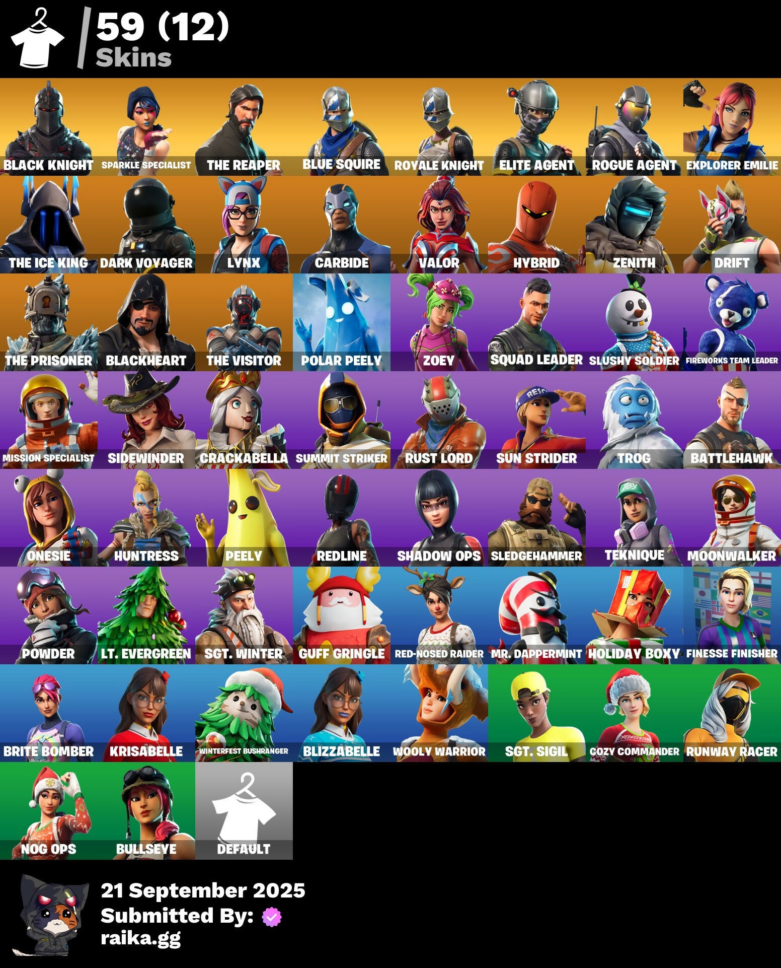58 SKINS ? BLACK KNIGHT ? SPARKLE SPECIALIST ? THE REAPER ? BLUE SQUIRE ? ROYALE KNIGHT ? ELITE AGENT ? ROGUE AGENT ? BLACKHEART ? VALOR ? 750 VB ?