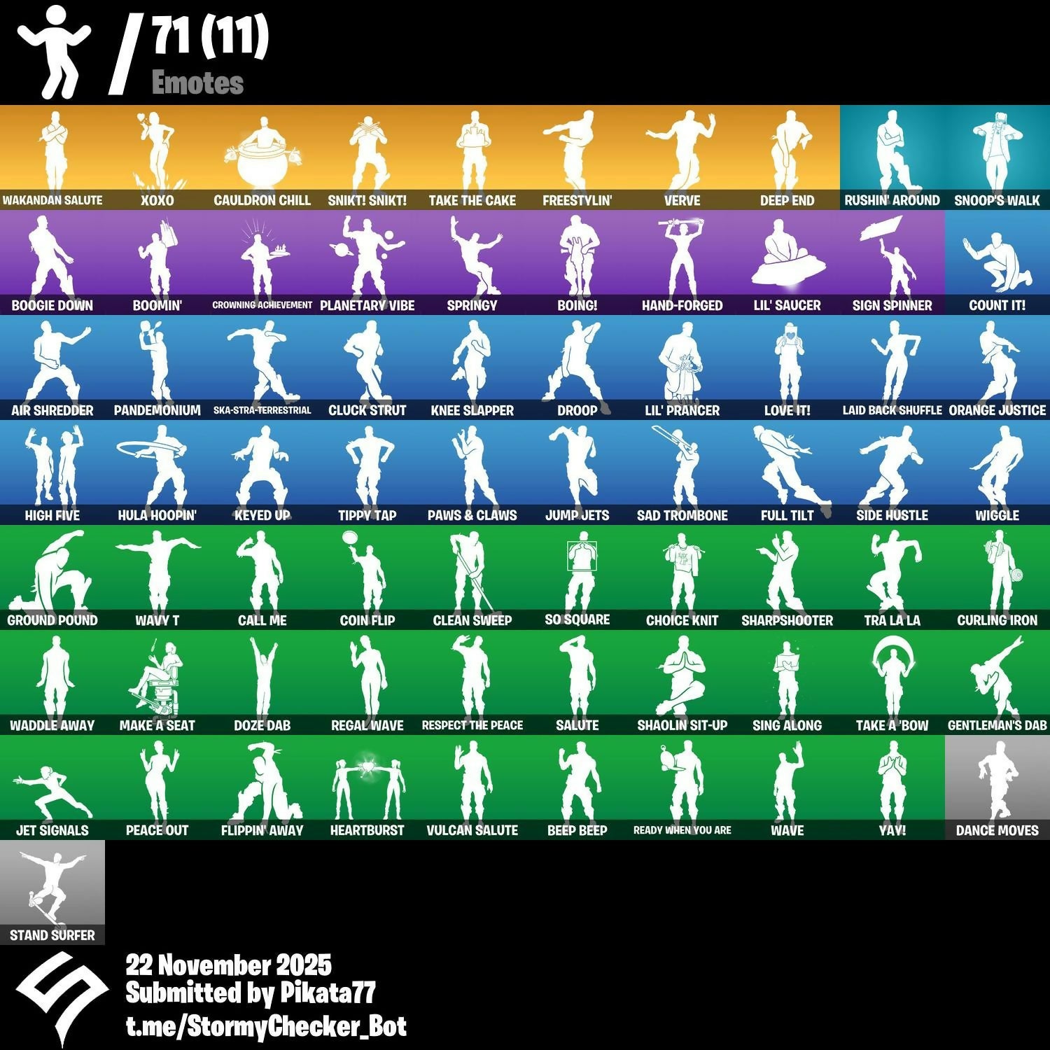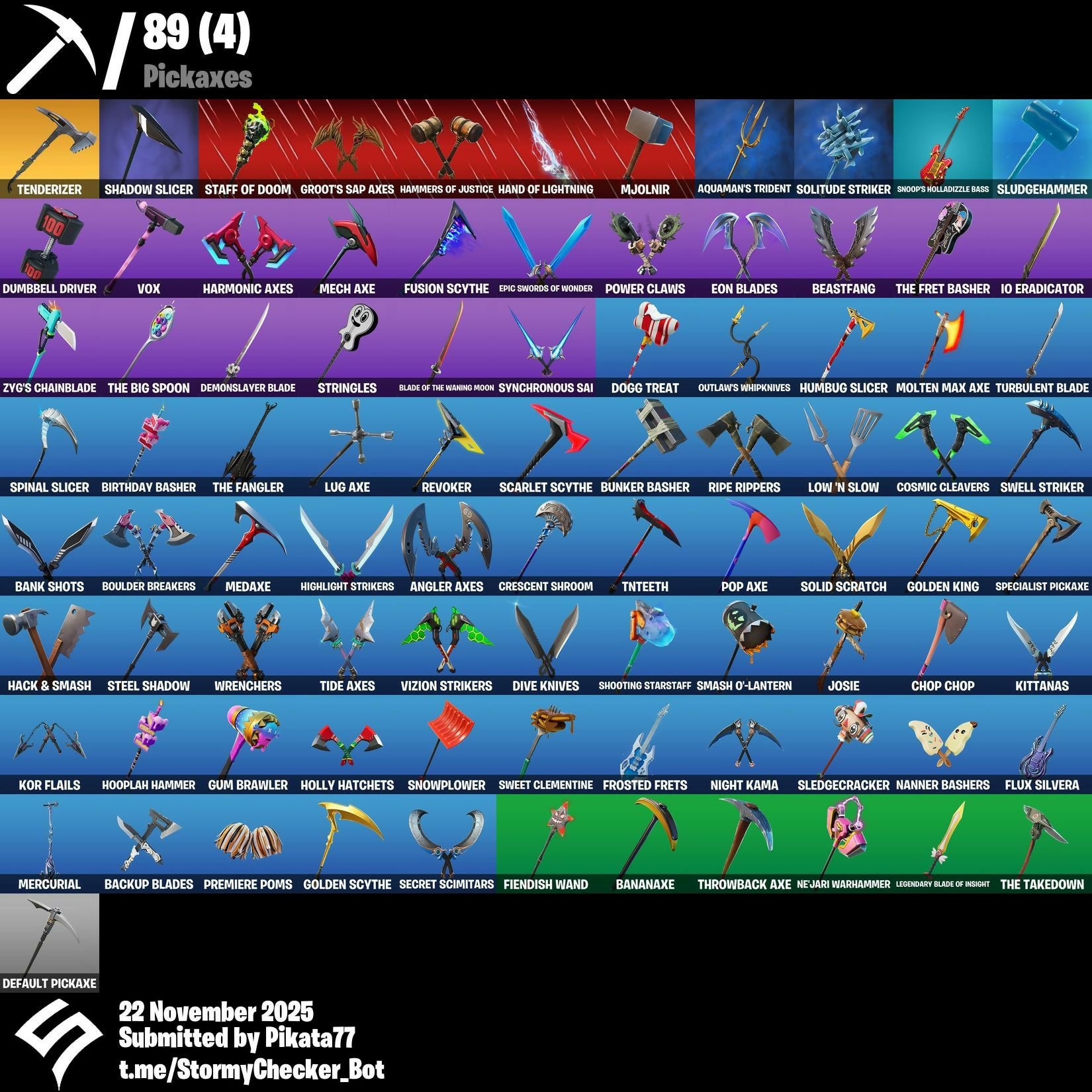 8-Ball Vs Scratch, Agent Peely, Air Shredder, Angler Axes, Aquaman, Aquaman's Trident, Arctic Adeline, Backup Blades, Bananaxe, Bank Shots, Beastfang, Beep Beep, Birthday Basher, Blade Of The Waning Moon, Blizzabelle, Boing!, Boogie Down, Boomin', Boulder Breakers, Brutus, Bunker Basher, Bunker Jonesy, Call Me, Cameo Vs Chic, Catalyst, Cauldron Chill, Charlotte, Choice Knit, Chop Chop, Clean Sweep, Cluck Strut, Coin Flip, Cosmic Cleavers, Count It!, Crescent Shroom, Curling Iron, Dance Moves, Deadpool, Deep End, Default Pickaxe, Demi, Demonslayer Blade, Dive Knives, Doctor Doom, Dogg Treat, Doze Dab, Droop, Dumbbell Driver, Eon Blades, Epic Swords Of Wonder, Fade, Fiendish Wand, Flippin' Away, Flux Silvera, Freestylin', Frosted Frets, Full Tilt, Fusion, Fusion Scythe, Gear Specialist Maya, Gentleman's Dab, Golden King, Golden Scythe, Groot, Groot's Sap Axes, Ground Pound, Guff Gringle, Guggimon, Gum Brawler, Hack & Smash, Hammers Of Justice, Hand Of Lightning, Hand-Forged, Harmonic Axes, Heartburst, High Five, Highlight Strikers, Holly Hatchets, Hooplah Hammer, Hula Hoopin', Humbug Slicer, IO Eradicator, Iris, Jennifer Walters, Jet Signals, Joey, Josie, Journey Vs Hazard, Jules, Jump Jets, Keyed Up, Kit, Kittanas, Knee Slapper, Kor Flails, Krisabelle, Kymera, Laid Back Shuffle, Legendary Blade Of Insight, Lil' Prancer, Lil' Saucer, Love It!, Low 'N Slow, Lug Axe, Major Mancake, Make A Seat, Mancake, Mandalorian, Mave, Mech Axe, Medaxe, Meowscles, Mercurial, Midas, Mjolnir, Molten Max Axe, Mystique, Nanner Bashers, Ne'Jari Warhammer, Night Kama, Ocean, Orange Justice, Outlaw's Whipknives, Pandemonium, Paws & Claws, Peace Out, Planetary Vibe, Polar Peely, Pop Axe, Power Claws, Premiere Poms, Ready When You Are, Red Jade, Reese, Regal Wave, Remedy Vs Toxin, Respect The Peace, Revoker, Ripe Rippers, Rippley Vs Sludge, Rox, Ruby Shadows, Rushin' Around, Sad Trombone, Salute, Santa Dogg, Scarlet Scythe, Scuba Jonesy, Secret Scimitars, Sentinel, Shadow Slicer, Shaolin Sit-Up, Sharpshooter, Shooting Starstaff, Side Hustle, Sign Spinner, Sing Along, Singularity, Siona, Ska-Stra-Terrestrial, Skye, Sled Ready Guff, Sledgecracker, Sludgehammer, Smash O'-Lantern, Snikt! Snikt!, Snoop's Holladizzle Bass, Snoop's Walk, Snowplower, So Square, Solid Scratch, Solitude Striker, Specialist Pickaxe, Spinal Slicer, Springy, Staff Of Doom, Stand Surfer, Steel Shadow, Storm, Stratus, Stringles, Sunny, Sweet Clementine, Swell Striker, Swift, Synchronous Sai, Take A 'Bow, Take The Cake, Tenderizer, The Big Spoon, The Fangler, The Fret Basher, The Takedown, Thor, Throwback Axe, Tide Axes, Tippy Tap, Tnteeth, Tntina, Toona Fish, Tra La La, Trailblazer, Turbulent Blade, Turk Vs Riptide, Vega, Vendetta, Verve, Vizion Strikers, Vox, Vulcan Salute, Waddle Away, Wakandan Salute, Wave, Wavebreaker, Wavy T, Wiggle, Wrenchers, X-Lord, Xoxo, Yay!, Yulejacket, Zyg, Zyg's Chainblade