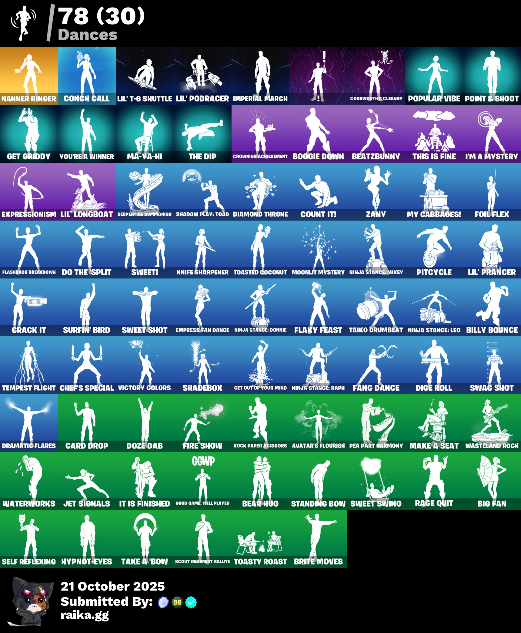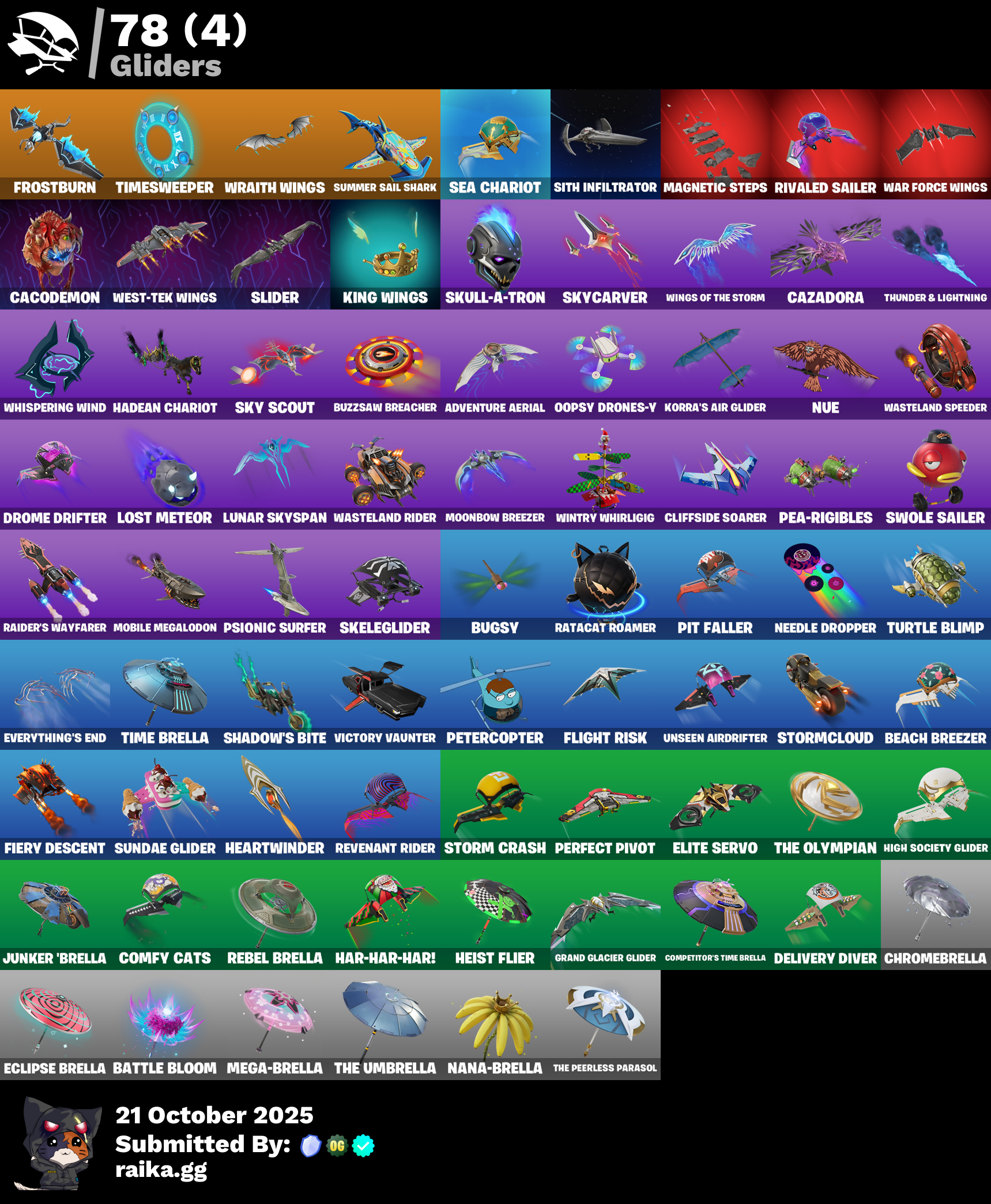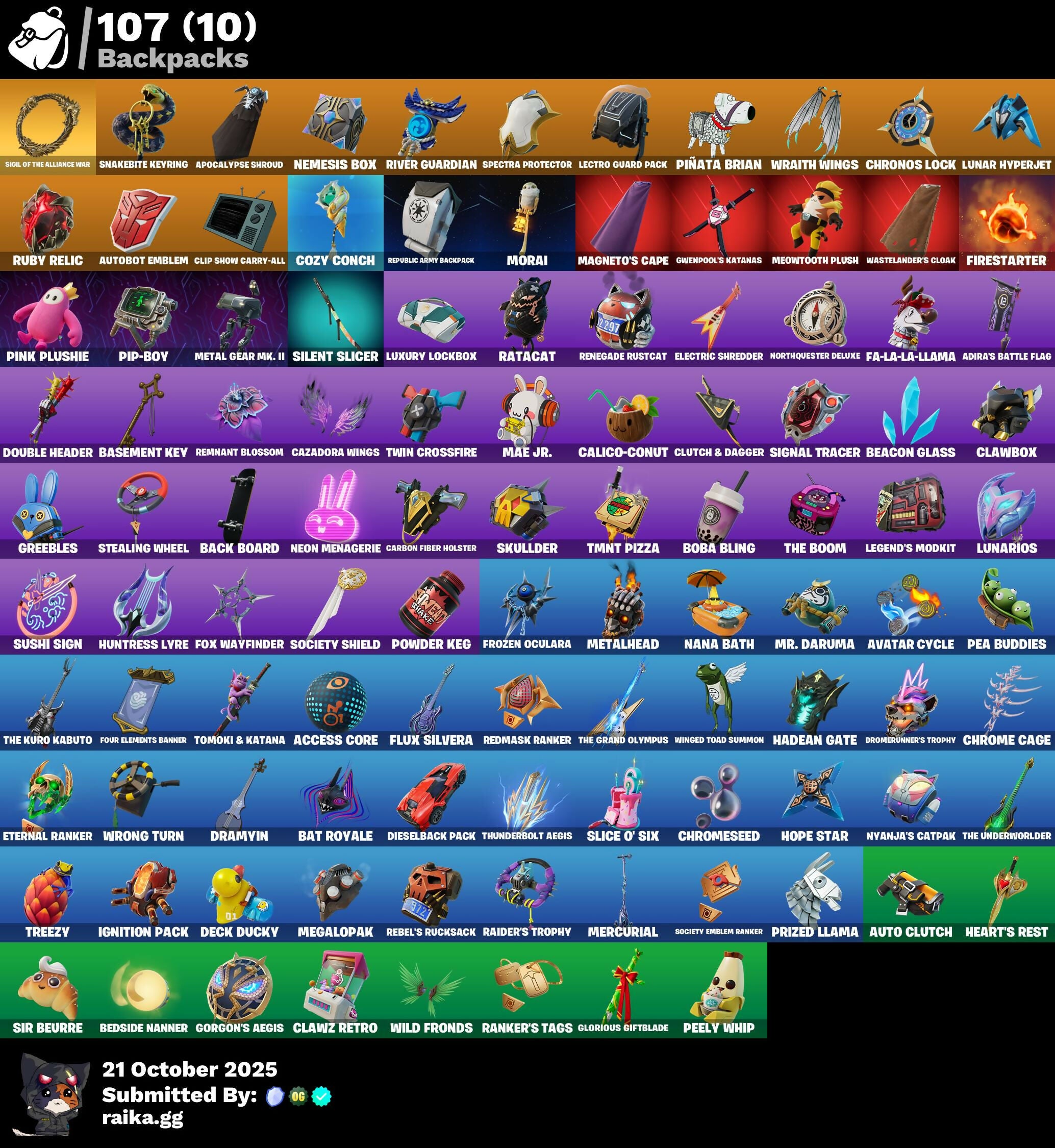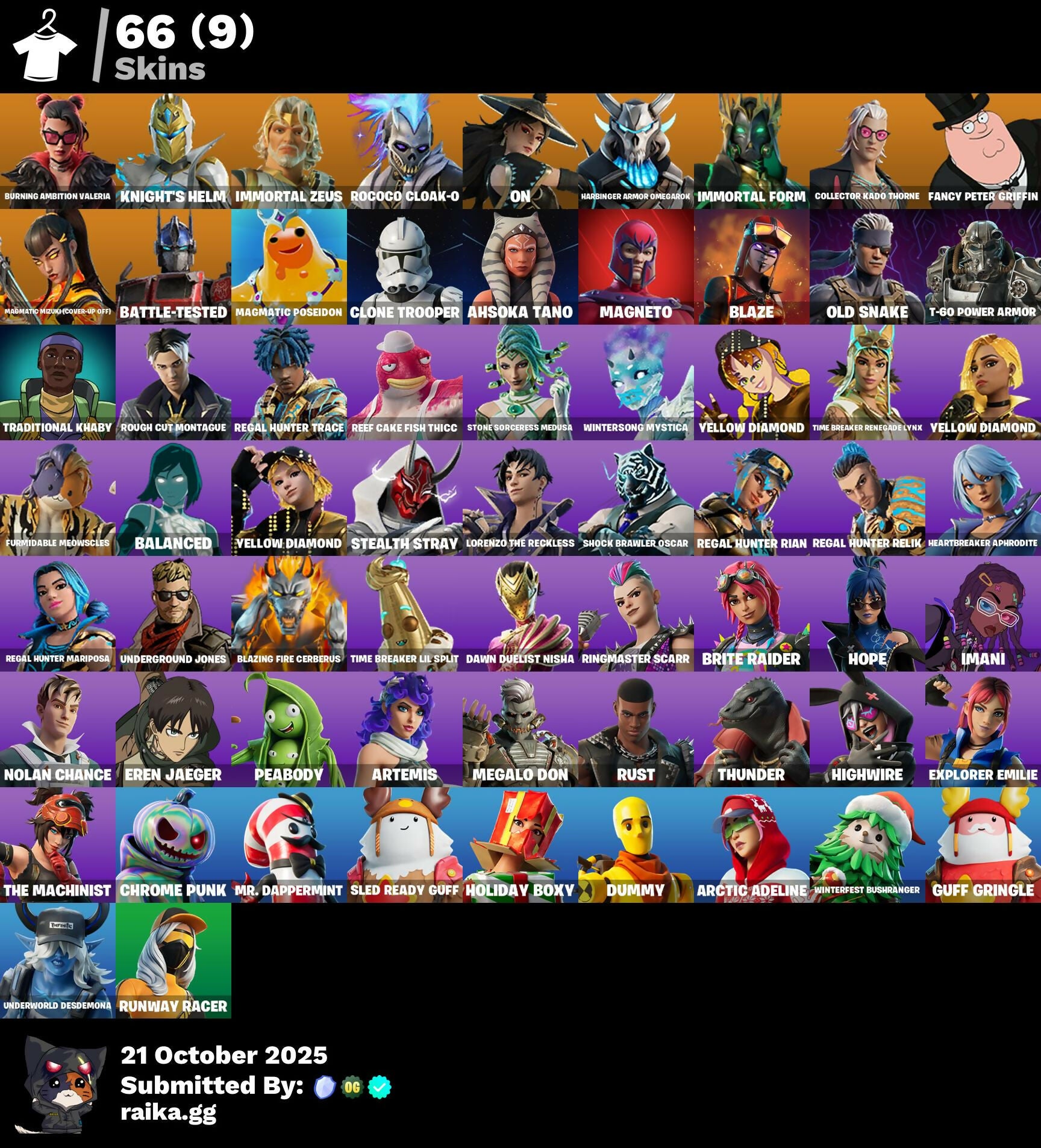Outfits: Burning Ambition Valeria | Knight's Helm | Immortal Zeus | Rococo Cloak-o | On | Harbinger Armor Omegarok | Immortal Form | Collector Kado Thorne | Fancy Peter Griffin | Magmatic Mizuki (Cover-up Off) | Battle-Tested | Magmatic Poseidon | Clone Trooper | Ahsoka Tano | Magneto | Blaze | Old Snake | T-60 Power Armor | Traditional Khaby | Rough Cut Montague | Regal Hunter Trace | Reef Cake Fish Thicc | Stone Sorceress Medusa | Wintersong Mystica | Yellow Diamond | Time Breaker Renegade Lynx | Yellow Diamond | Furmidable Meowscles | Balanced | Yellow Diamond | Stealth Stray | Lorenzo the Reckless | Shock Brawler Oscar | Regal Hunter Rian | Regal Hunter Relik | Heartbreaker Aphrodite | Regal Hunter Mariposa | Underground Jones | Blazing Fire Cerberus | Time Breaker Lil Split | Dawn Duelist Nisha | Ringmaster Scarr | Brite Raider | Hope | Imani | Nolan Chance | Eren Jaeger | Peabody | Artemis | Megalo Don | Rust | Thunder | Highwire | Explorer Emilie | Trailblazer Tai | The Machi