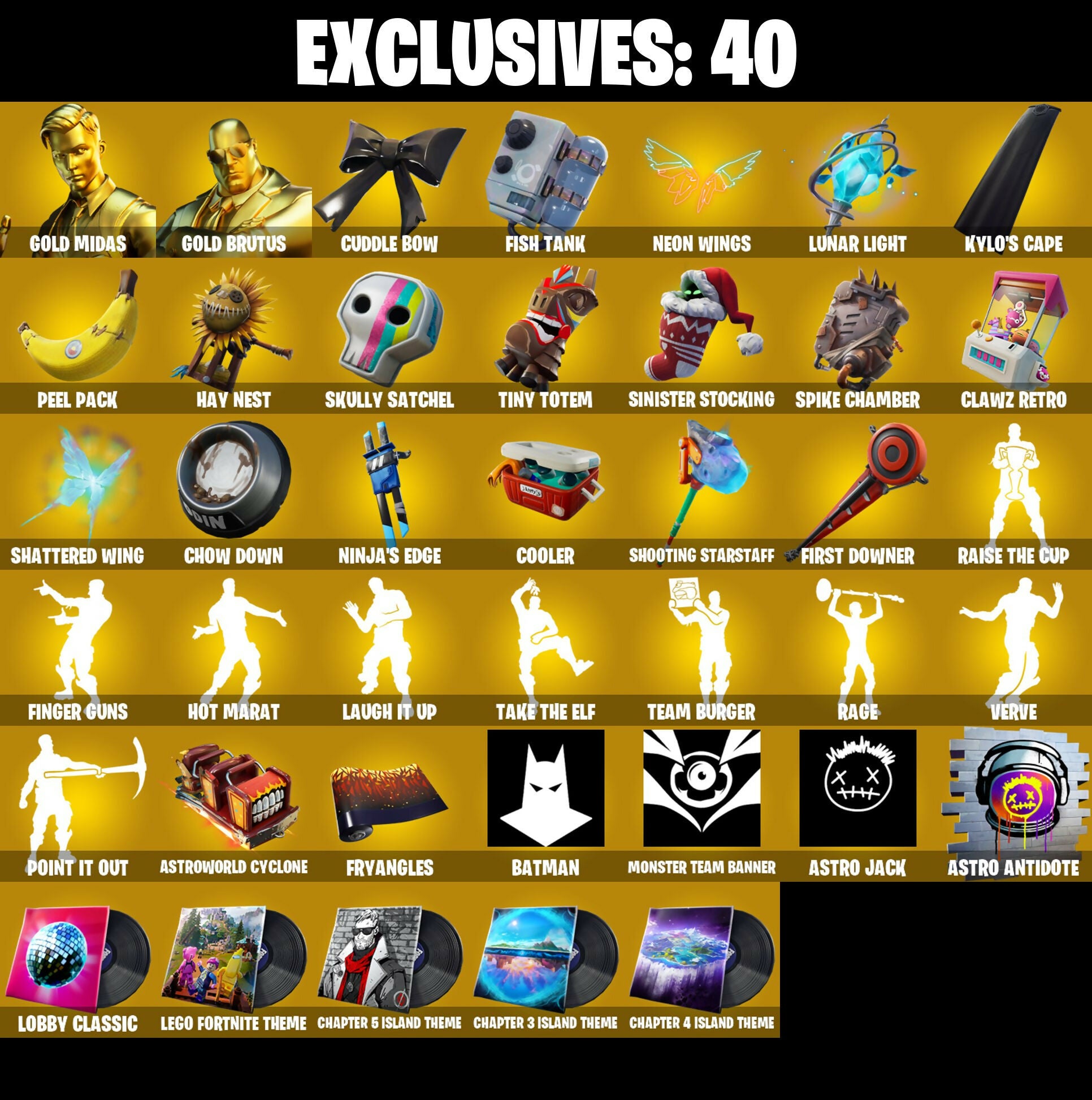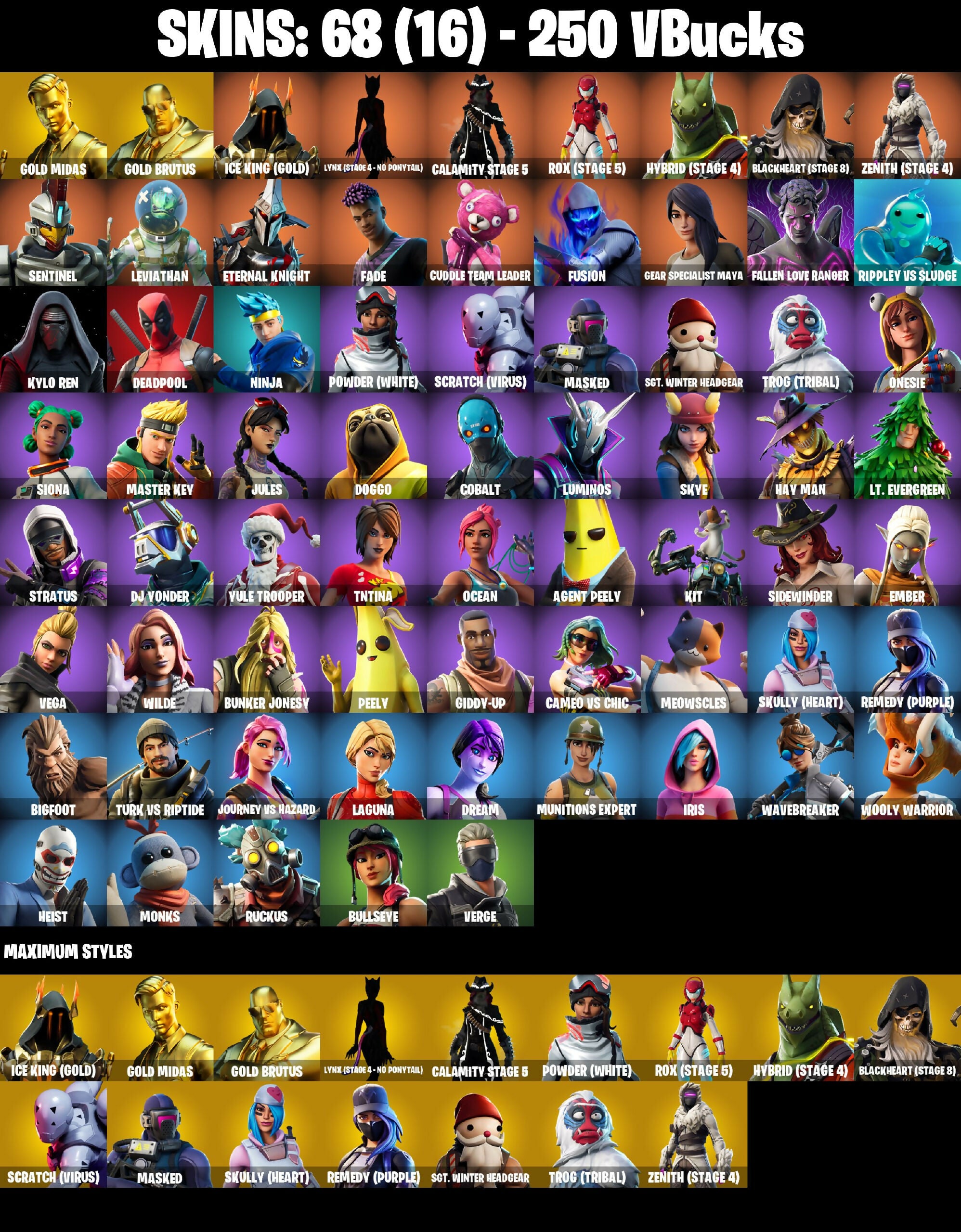 68 SKINS | GOLD MIDAS | GOLD BRUTUS | ICE KING (GOLD) | LYNX (STAGE 4 ⸱ NO PONYTAIL) | CALAMITY STAGE 5 | ROX (STAGE 5) | HYBRID (STAGE 4) | BLACKHEART (STAGE 8) | ZENITH (STAGE 4) | SENTINEL | LEVIATHAN | ETERNAL KNIGHT | FADE | PC/PSN/XBOX/NINTENDO |