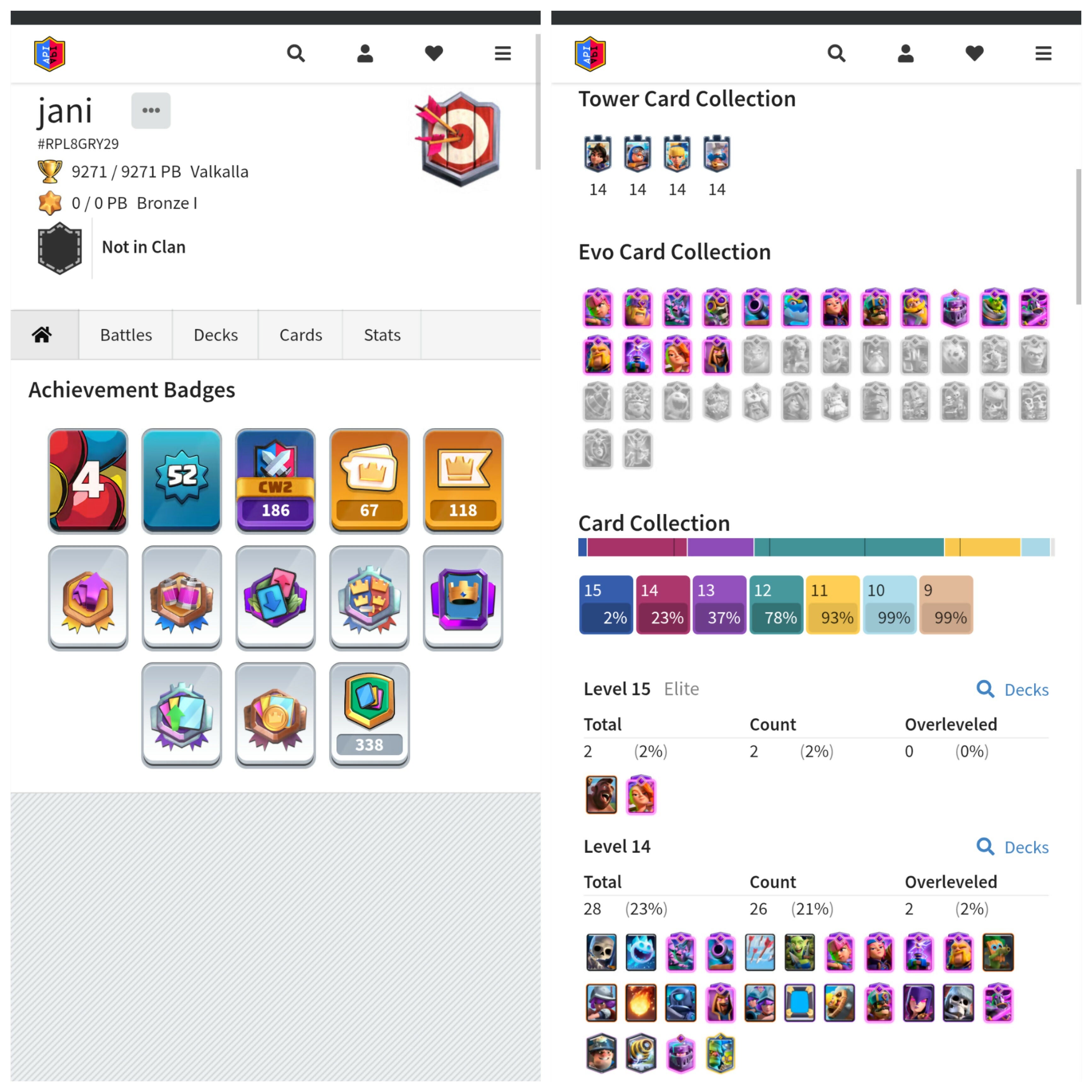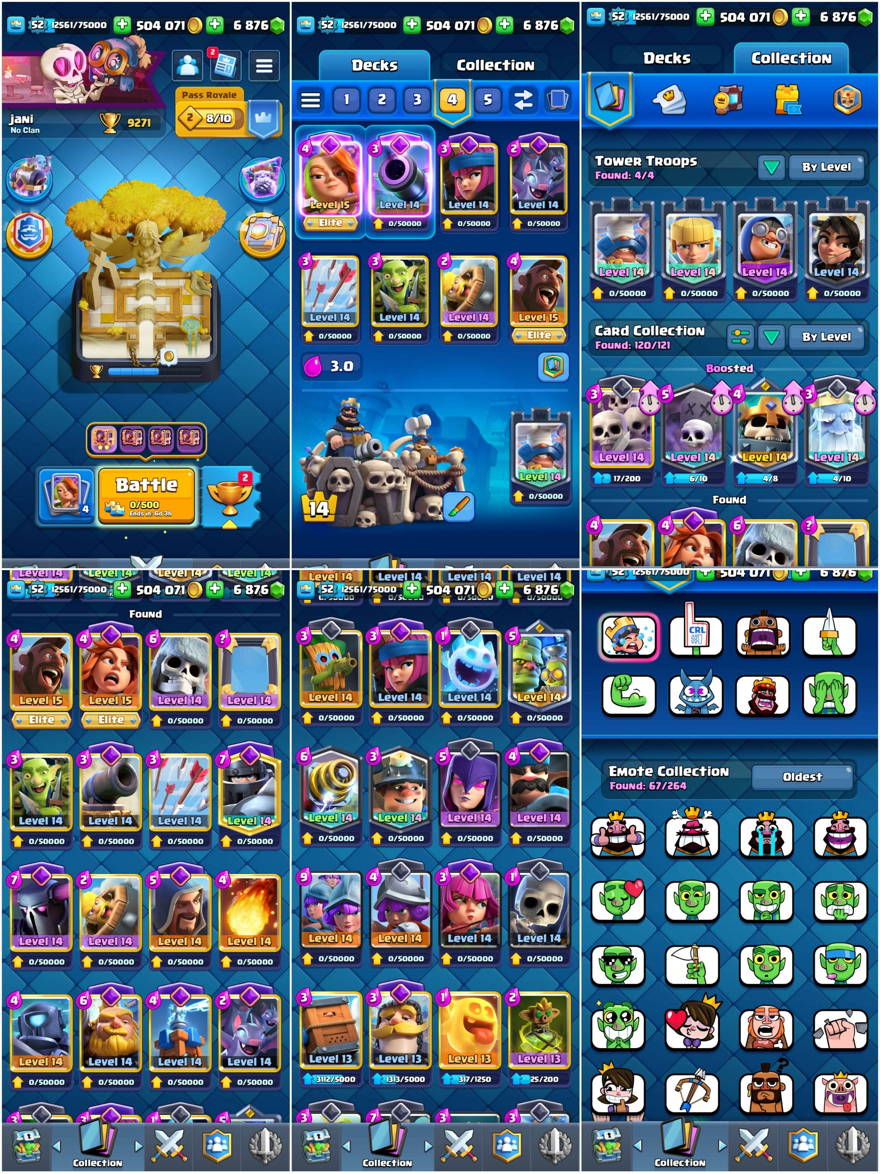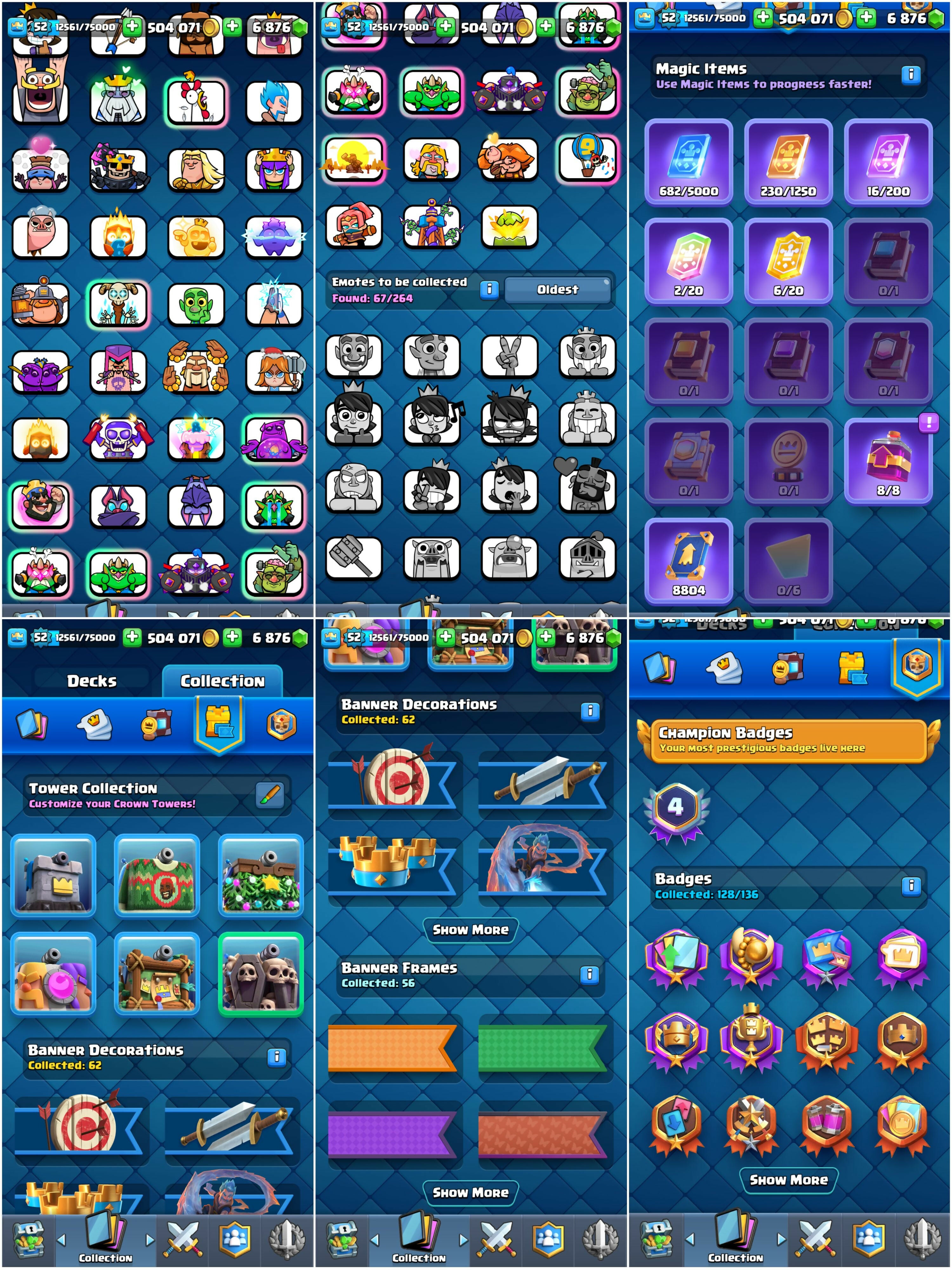 {6800+ Gems} Level 52 + KT 14 | 9200+ Trophies | 28 Max Cards , 2 Elites , 16 Evos | 67 Emotes & 6 Tower Skins | Android/iOS