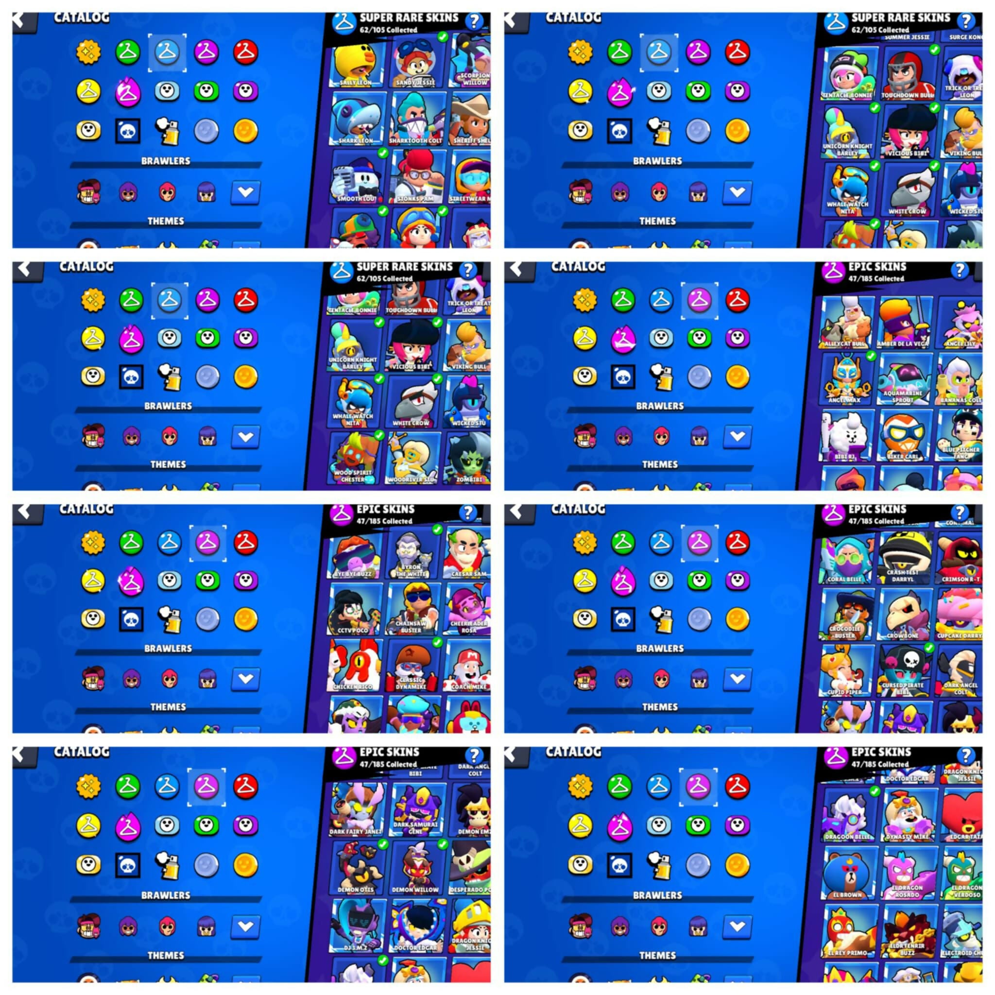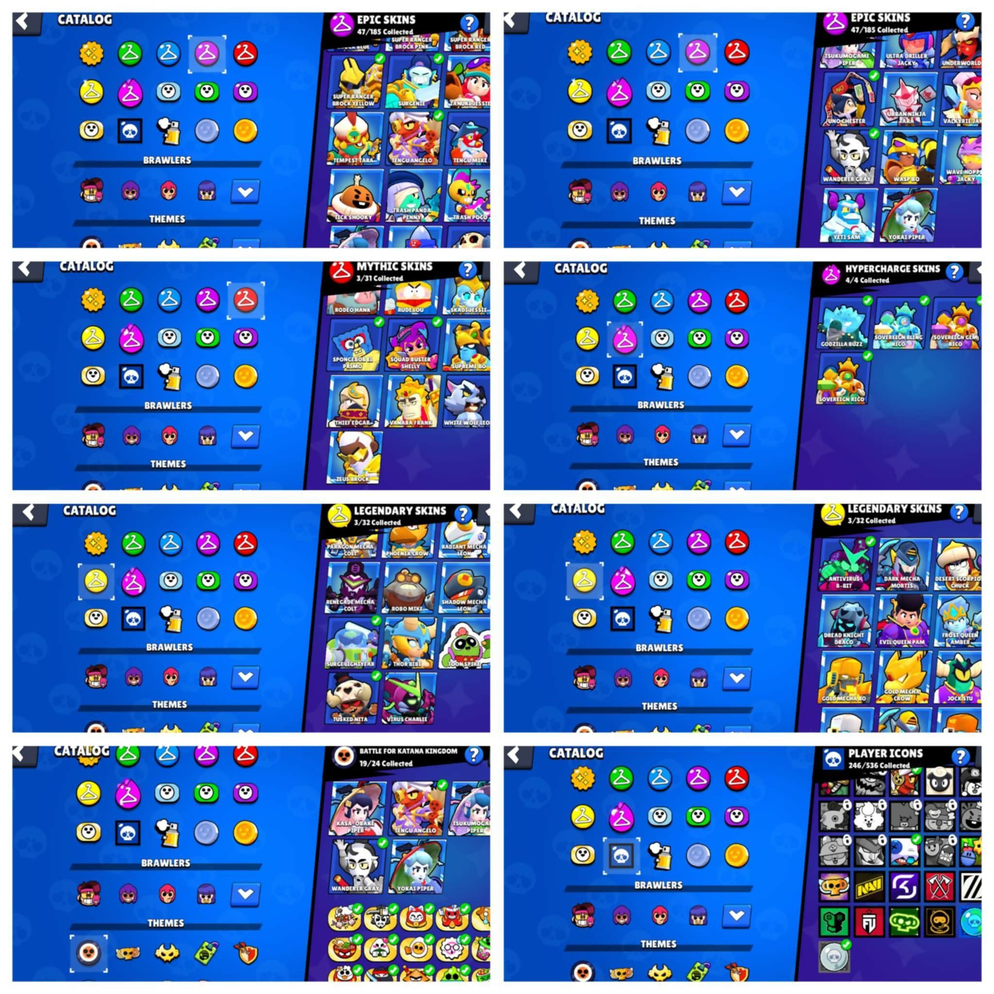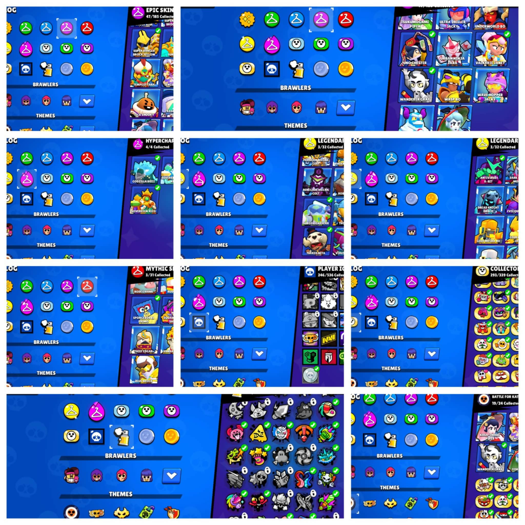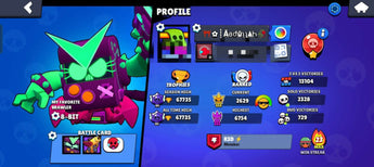 68K TROPHIES - 91 BRAWLERS - 180+ SKINs - 36 MAXED - 1600 CREDITS AVAILABLE - 2 SKINS OF MAY SUSHI EVENT INCLUDED SpongeBob El Primo , Classic Dynamic , Squad Buster Shelly , White Wolf Leon , Antivirus 8-bit , Godzilla Buzz , 3 Sovereign Riko , Super Ra