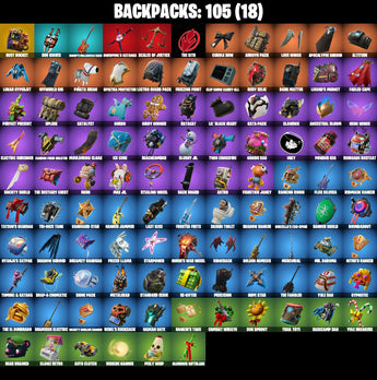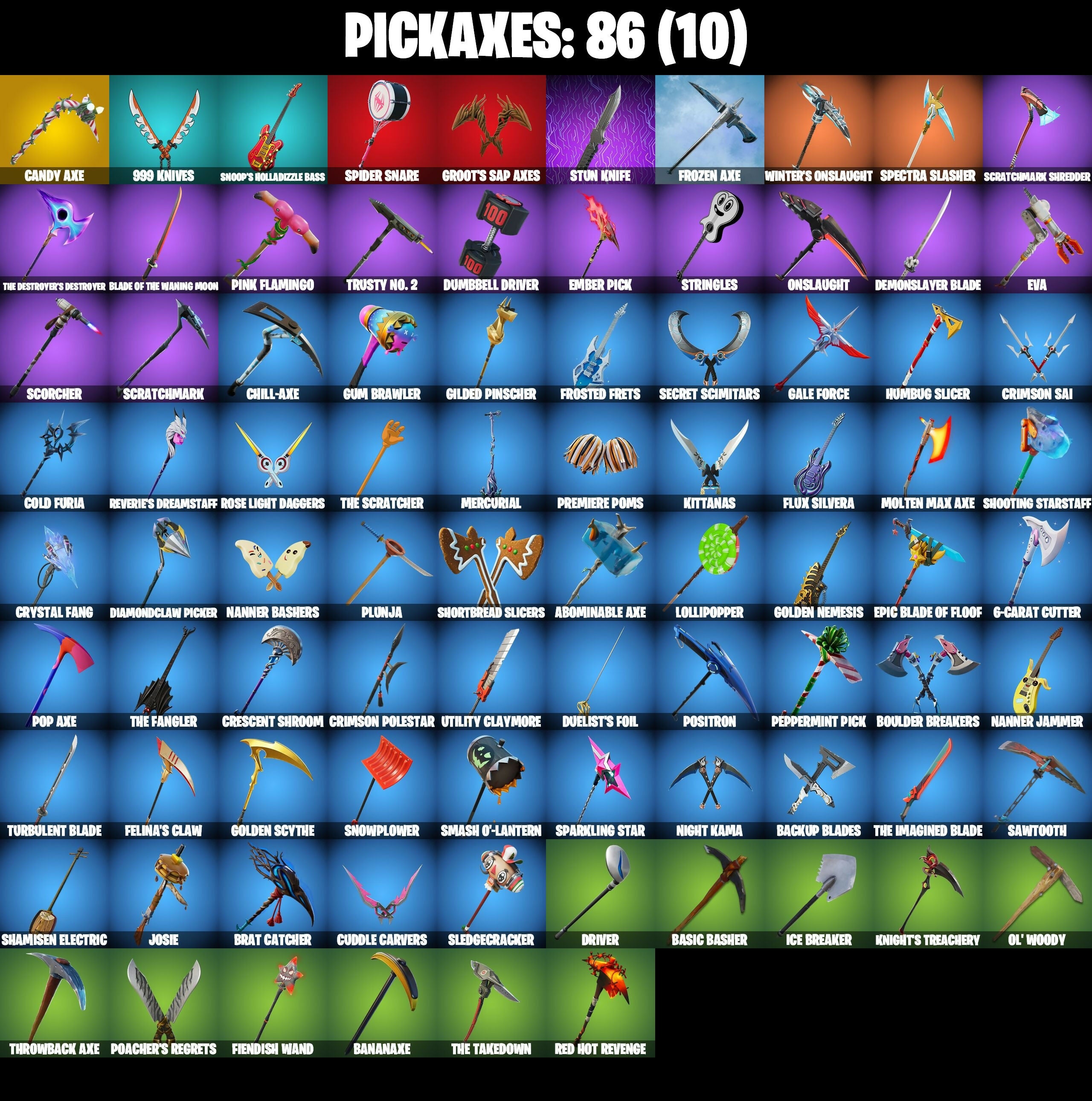 6-Carat Cutter, 999 Knives, Abominable Axe, Altitude, Ancestral Bloom, Apocalypse Shroud, Arctic Adeline, Arroyo Pack, Astro, Astroworld Cyclone, Auto Clutch, Back Board, Backup Blades, Bananaxe, Banner Shield, Base Jumper, Basecamp Bag, Basic Basher, Battlehawk, Beachcomber, Bear Brained, Bedside Nanner, Beep Beep, Best Mates, Blade Of The Waning Moon, Bobo, Boogie Down, Boulder Breakers, Bounty 'Brella, Brat Catcher, Brite Bomber, Britestorm Bomber, Bubloon, Bullseye, Burpee, Call Me, Candy Axe, Carbide (Stage 5), Carbon, Carbon Fiber Holster, Card Drop, Cat Flip, Catalyst, Cauldron Chill, Charlotte, Chill-Axe, Chimichanga!, Chromebrella, Classified, Clawbox, Clawz Retro, Cliffside Soarer, Clip Show Carry-All, Cold Front, Cold Furia, Combat Wreath, Comfy Cats, Commando, Competitor's Time Brella, Cozy Commander, Crescent Shroom, Crimson Polestar, Crimson Sai, Crowning Achievement, Crystal Fang, Cuddle Bow, Cuddle Carvers, Cuddle Team Leader, Cyclo Curl, Dab, Dark Matter, Dark Voyager, Dazzle, Demonslayer Blade, Diamond Diva, Diamond Throne, Diamondclaw Picker, Disco Fever, Do The 'Split, Doom Brella, Downpour, Doze Dab, Dreamzy Handbag, Driver, Duelist's Foil, Dumbbell Driver, Dynamo, Electric Shredder, Electro Shuffle, Electro Swing, Elite Agent, Elite Servo, Ember Pick, Epic Blade Of Floof, Equalizer, Eva, Fabled Cape, Felina, Felina's Claw, Fiendish Wand, Finger Guns, Fishstick Janky, Flapjack Flyer, Flashback Breakdown, Flippin' Away, Flippin' Sexy, Flux Silvera, Foil Flex, Free Flow, Freezing Point, Frostbite, Frostburn, Frosted Frets, Frozen Axe, Gale Force, Gentleman's Dab, Get Funky, Get Griddy, Get Loose, Ghoul Trooper, Giddy Gunner, Gilded Pinscher, Ginger Gunner, Glider, Glidurr, Glorious Giftblade, Godzilla's Exo-Spine, Golden Nemesis, Golden Scythe, Golf Clap, Goodie Bag, Gordo, Grand Glacier Glider, Groot's Sap Axes, Groove Jam, Gum Brawler, Gunn-Brella, Gwenpool's Katanas, Hadean Gate, Hand-Forged, Har-Har-Har!, Haze, Heart Sign, Heartburst, Hello Friend, High Octane, High Society Glider, Hit It, Holiday Boxy, Hollowhead, Holographic, Hope, Hope Star, Horde's War Wheel, Hot Marat, Hot Stuff, Humbug Slicer, Hype, Hypnotic, I Declare!, I'm A Mystery, Ice Breaker, Ice Cube, Inky, Intrepid, Invasion, Iris, It's... You?, Jet Signals, Job Well Done, Jobi Slide, Josie, Jubilation, Junker 'Brella, Kata-Pack, Kaws Skeleton, Kittanas, Knife Sharpener, Knight's Treachery, Last Kiss, Lectro Guard Pack, Legend's Modkit, Lil Split, Lil Split (Timebreaker Lil Split), Lil' Black Heart, Lil' Longboat, Lil' Prancer, Lollipopper, Love It!, Love Ranger, Love Wings, Lt. Evergreen, Lunar Hyperjet, Lunar Skyspan, Lynx, Lynx (Stage 4 - No Ponytail), Mae Jr., Make A Seat, Mask Of Balance, Master Of Puppets, Mercurial, Metalhead, Mezmer, Mic Drop, Mighty Marvel 'Brella, Millennium Falcon, Mind Blown, Mission Specialist, Molten Max Axe, Montague, Moonwalker, Mouldering Cloak, Mr. Daruma, Nanner Bashers, Nanner Jammer, Neon Wings, Night Kama, Ninja Stance: Leo, Nisha, Nitro'd Ranker, Nyanja's Catpak, Offworld Rig, Ol' Woody, Omega, Omegarok, Onesie, Onslaught, Orange Justice, Oscar, Out West, Out With The Old, Paper Parasol, Peely Whip, Peppermint Paraglider, Peppermint Pick, Perfect Pivot, Perfect Present, Peter Griffin, Pink Flamingo, Pit Faller, Piñata Brian, Plunja, Poacher's Regrets, Pony Up, Pop Axe, Popcorn, Popular Vibe, Positron, Powder, Powder (White), Powder Keg, Precision, Premiere Poms, Prized Llama, Psionic Surfer, Pump Me Up, Rage, Rage Quit, Raider's Wayfarer, Rainbow Rider, Ranker's Tags, Ranking Ronin, Ratacat, Ratacat Roamer, Re-Gifter, Rebel Brella, Rebel's Rucksack, Recon Scout, Red Hot Revenge, Red-Nosed Raider, Redmask Ranker, Regal Wave, Remix 'Brella, Renegade Lynx, Renegade Rustcat, Respect, Respect The Peace, Reverie, Reverie's Dreamstaff, Rickety Runner, Ride The Pony, Ridgeback, Rogue Agent, Rose Light Daggers, Roundabout, Royale Air, Ruby Relic, Runway Racer, Rushin' Around, Rust Bucket, Rust Lord, Salute, Sash Sergeant, Savage, Sawtooth, Scales of Justice, Scarlet Longboard, Scorcher, Scratchmark, Scratchmark Shredder, Secret Scimitars, Sentinel, Seven Signet, Sgt. Winter, Sgt. Winter (Reindeer Llama), Shadow Ranker, Shadow Shroud, Shamisen Electric, Shimmer, Shine Pack, Shooting Starstaff, Shortbread Slicers, Show 'Em Off, Sing Along, Siren, Skeleglider, Skellefish, Skelleshark, Skerran, Skibidi Toilet, Slayer Juice Wrld, Sledgecracker, Slow Clap, Slushy Jr., Slushy Soldier, Smash O'-Lantern, Snap-A-Zoomatic, Snoop's Holladizzle Bass, Snowfall, Snowplower, Snowshaker, Society Emblem Ranker, Society Shield, Solid Snake, Sparkling Star, Spectra Knight, Spectra Knight (Ultima Helm), Spectra Protector, Spectra Slasher, Spider Snare, Squad Leader, Stand Surfer, Standard Issue, Starpower, Stealing Wheel, Storm Sail, Stringles, Stun Knife, Sugar Crash, Sun Sprout, Sundae Glider, Sunny's Lander, Surf Witch, Surfin' Bird, Swole Sailer, Symbol Of Peace, Tactical Sleigh, Tagged 'Brella, Take The Elf, Take The L, Tatsuo, Tatsuo's Gearbag, Teknique, The Bestiary Chest, The Break Shot, The Destroyer's Destroyer, The El Durrrado, The Fangler, The Imagined Blade, The Mcg, The Reaper, The Rezzbrella, The Robot, The Scratcher, The Sith, The Takedown, The Umbrella, The Visitor, Throwback Axe, Time Brella, Toasty Roast, Tomoki & Katana, Toona Fish, Trail Tote, Treefall, Tri-Ooze Tank, Trog, Trusty No. 2, Turbulent Blade, Twin Crossfire, Twist, Umbrella Of The Last Reality, Uplink, Utility Claymore, Valeria, Valor, Vanguard Star, Vengeance Jones, Victory Vaunter, Voyager, Wakandan Salute, War Force Wings, Wave, Wet Paint, Whale Sailer, Wiggle, Wings Of Valor, Winter's Onslaught, Winterfest Bushranger, Wooly Warrior, Work It Out, Yule Bag, Yule Breakers, Yulejacket, Zenith, Zenith (Stage 4), Zoey