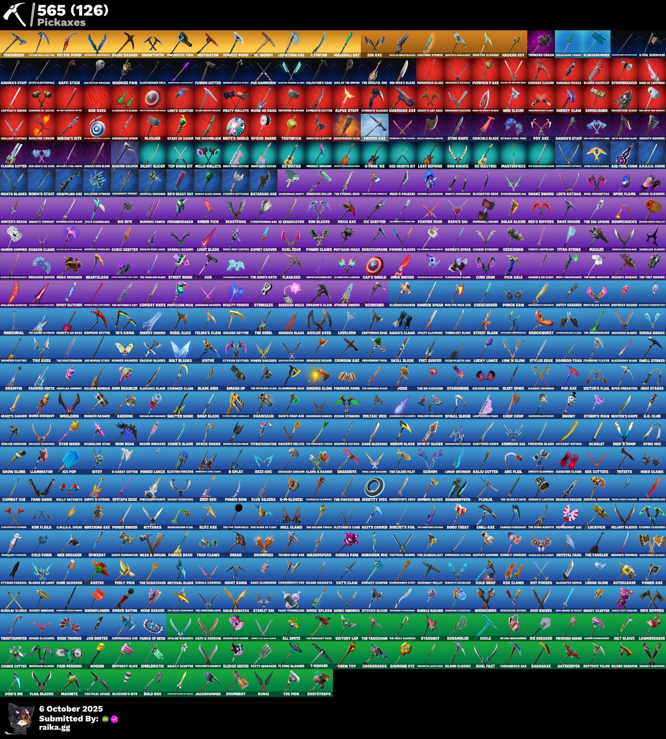 (Snikt!), -1-Ball-, 1-Ball, 100 Power Armor, 18's Kama, 24 Karat Katana, 6-Carat Cutter, 8-Ball vs Scratch, 928 Axes, 999 Knives, A Warrior Prepares, A.R.G.U.S Sabre, Aang, Aang's Air Sphere, Abominable Axe, Absenz, Abstrakt, Abyssal Blade, Adira, Adventure Phil V, Aerial Assault Bomber, Aerosol Hammer, Aftermath, Agent Jones, Agent Patch, Agent Peely, Agent Specialist Bushranger, Ahsoka’s Staff, Air Nomad Staff, Air Shredder, Airheart, Airheart Legacy Trooper, Alex, Alexandra Sharpe, All Might, All Smite, Alli, Alpha Staff, Alpine Ace (GBR), Andy Fangerson, Angler Axes, Ant-Man, Antonia, Apex Predator, Aphrodite, Apprentice Eve, Apprentice Eye, Aquaman, Aquaman’s Trident, Arachnrobatics, Arc Flail, Arc Knight Prime, Arcane Research, Arctic Adeline, Arctic Assassin, Arctic Redline, Arctica, Ares, Ark, Arm The Pumpkin!, Armadillo, Artemis, Ashoka Tano, Assault Ion Blade, Astrea, Astro Assassin, Astro Jack, Athena’s Battleaxe, Atlantean Fishmancer, Augury, Aura, Aurra, Autocleave, Avatar's Flourish, Avengers Comic Extra, Aw, Shucks., Awr Trooper, Axel-Tral Form, Axeroni, Axetec, Axion Sentinel MK, Ayla Winn, Azarath Metrion Zinthos!, B-Splat, BB's Beast Bat, Backlash, Backup Blades, Bal Kreech, Balance Board, Bamboo-Tana, Bananaxe, Bandolier, Bandollete, Banner Wave, Barbarian Aurora, Baron's Hoard, Bash, Basic Basher, Batarang Axe, Batman Zero, Battestar, Battle Blessing, Battle Call, Battle Gamer Mae, Battle Prep, Battle Prep: Super, Battlebus, Battlehawk, Baz, Beach Bomber, Beast Blastin', Beast Boy, Beastfang, Beastmode, Beatzbunny, Beef Boss, Beep & Boop, Before Assaulf Female, Bench Upgrade, Bernie, Big Bill, Big Bite, Big Chuggus, Big Dill, Big Fan, Bike To Go, Bim Bam Boom, Bird Call, Birdarang Flourish, Birdie, Birthday Basher, Birthday Slice, Bitey, Black Knight, Black Manta, Black Panther, Black Ranger, Blackheart, Blackstar Edge, Blade Aria, Bladed Gauntlet, Blades of Light, Blaze, Blinding Lights, Blitz Axe, Blizzard Bomber, Blizzard's Bite, Bloodsport, Blowin' Up, Blowing Bubbles, Blue Ranger, Blue Striker, Blue Team Leader, Board Breaker, Boba Fett, Boba Snack, Bold Bar, Bolt Blades, Bomb Bouquet, Bombshell, Bone Breaker, Bones, Boogie Down, Boomchucks, Boomin', Boosting Ki, Bootsin' Cats, Bootstraps, Booyah!, Boulder Breakers, Bowl Go, Boxy, Brainstorm, Breaking Waves, Breakpoint, Breezeblade, Brief Moves, Brilliant Cutters, Brincos, Brite Agent, Brite Bomber, Brite Gunner, Brite Raider, Britestorm Bomber, Brite’s Shield, Bronzed Scimitars, Brutus, Bubble Basher, Bubble Wands, Bubblin' Sludge, Buckle Up, Bullseye, Bumblebee, Bun Bun, Bunker Basher, Bunker Jonesy, Bunny Brawler, Burning Fangs, Burnout, Burst Gate Scenario, Bytes, Cable, Cage, Cake Globberer, Calamity, Call Me, Called Shot, Cameo vs Chic, Cammy, Caper, Captain America, Captain Boomer, Captain Ilamerica, Captain Jones, Captain Krypta, Captain Marvel, Captain Phasma, Cap’s Shield, Carbide, Carbon Commando, Card Drop, Cardistry, Carmine Rosso, Carnage, Carnage Cleaver, Cassidy Quinn, Catalyst, Catflip, Cat’s Claw, Cauldron Chill, Cell, Centurion, Centurion Edge, Cerberos, Cerberus, Chainsaur, Champion Drake, Champion Strashd, Chaos Director, Chaos Double Agent, Chaos Origins, Charging Up, Charlotte, Chef's Special, Chew Toy, Chewbacca, Chill-Axe, Chimichanga!, Choice Knit, Chomp Sr., Chop Chop, Choro Kahele, Chrome Punk, Chromium, Chun-Li, Circuit Breaker, Clara, Clark Kent, Clean Sweep, Clix, Cloaked Shadow, Clone Trooper, Cloud Striker, Cluck, Cluck Strut, Clutch, Cobalt, Codecarver, Codename E.L.F.S., Cold Furia, Cold Snap, Color Crush, Combat Cue, Combat Knife, Combat Team Jonesy, Comet Carver, Commando, Conch Call, Conduit/ROD Brand, Conga, Conjure Weapon, Conqueror's Claim, Conqueror’s Axe, Containment Specialist, Contract Giller, Contract Killer, Cookie Cutter, Cooky Chomps, Copycat's Sword, Cornstuna, Corsgeant Coruscan, Cosmic Cleavers, Cosmic Infinity, Cosmic Kingmaker, Count It!, Cozy Chomps, Crack It, Crackshot, Crash Test Cudgel, Crescent Shroom Clang & Basher, Crimson Axe, Crimson Codenlade, Crimson Commando, Crimson Sai, Crimson Scout, Crimson Scythe, Croda Team Leader, Crooked Claw, Crossroads, Crowning Achievement, Crucible Blade, Cryptic, Crystal, Crystal Fang, Crystal Smasher, Cube Assassin, Cube Edge, Cubig Scepter, Cuddle Carvers, Cuddle Paw, Cuddle Team Leader, Cuddly Crusher, Cursed Energy, Cyberdrive Salute, Cybertronian Axe, Cyborg, Cyclo, Cyclo Curl, Cymitar, D'Vark, DJ Pepperoni, DJ Yonder, Dabstand, Dafuqment, Dagger Dance, Dahlia, Daido’s Claws, Daigo, Dali, Dance Off, Danica, Dark Blessing, Dark Bomber, Dark Doggo, Dark Rex, Dark Side, Dark Vanguard, Dark Voyager, Darkfire Claws, Darkseed Dormant, Darth Jar Jar, Darth Maul, Darth Vader, Datekeeper, Deadeye, Deadfire, Deadpool, Deathstorm’s Katana, Deathstroke Zero, Decaying Dribbler, Deep End, Delirium, Demi, Demogorgon, Demolisher, Demonslayer Blade, Designated Hitters, Devastator, Diamond Diva, Diamond Eye, Diamond Throne, Dice Roll, Die With A Smile, Diecast, Dilli With It, Dire, Dirtbike Challenge, Diva Fever, Dive Knives, Dizzie, Do The Split, Doctor Doom, Doctor Slone, Doctor Strange, Dogg Treat, Doggo, Domino, Donatello, Donnie’s Bo Staff, Don’s Dominator, Doom, Doom Slayer, Doom's Domain, Double Agent Hush, Doublescross, Doxie Agent Wildcard, Doze Dab, Dragon Dagger, Dragon Daggers Song, Dragon Rune Lance, Dragon Stance, Dragon’s Claw, Drakon Claws, Dramatic Flares, Dramyin, Dread, Dream, Drift, Drippin' Flavor, Droop, Drumbeat, Drummies, Dual Edge, Dual Filet, Dual Machettas, Dubbed Commando, Duelist's Card Trick, Duelist's Foil, Dullseye, Dumbbell Driver, Dummy, Dummy Supreme, Dune Scooper, Duplihate, Duplikates, Durrr Taisho, Dusk, Dusk Knight, Dusty, Dynamo TNTina, E-Vol Scraper, EX, Echo, Eddie Brock, Electro-Pincers, Elegance Blade, Elegant Crowbar, Elite Agent, Ellen Ripley, Ember, Ember Baton, Ember Pick, Emblematic, Emma Frost, Emperor Palpatine, Empresariah Dance, End Sword of Might, Energon