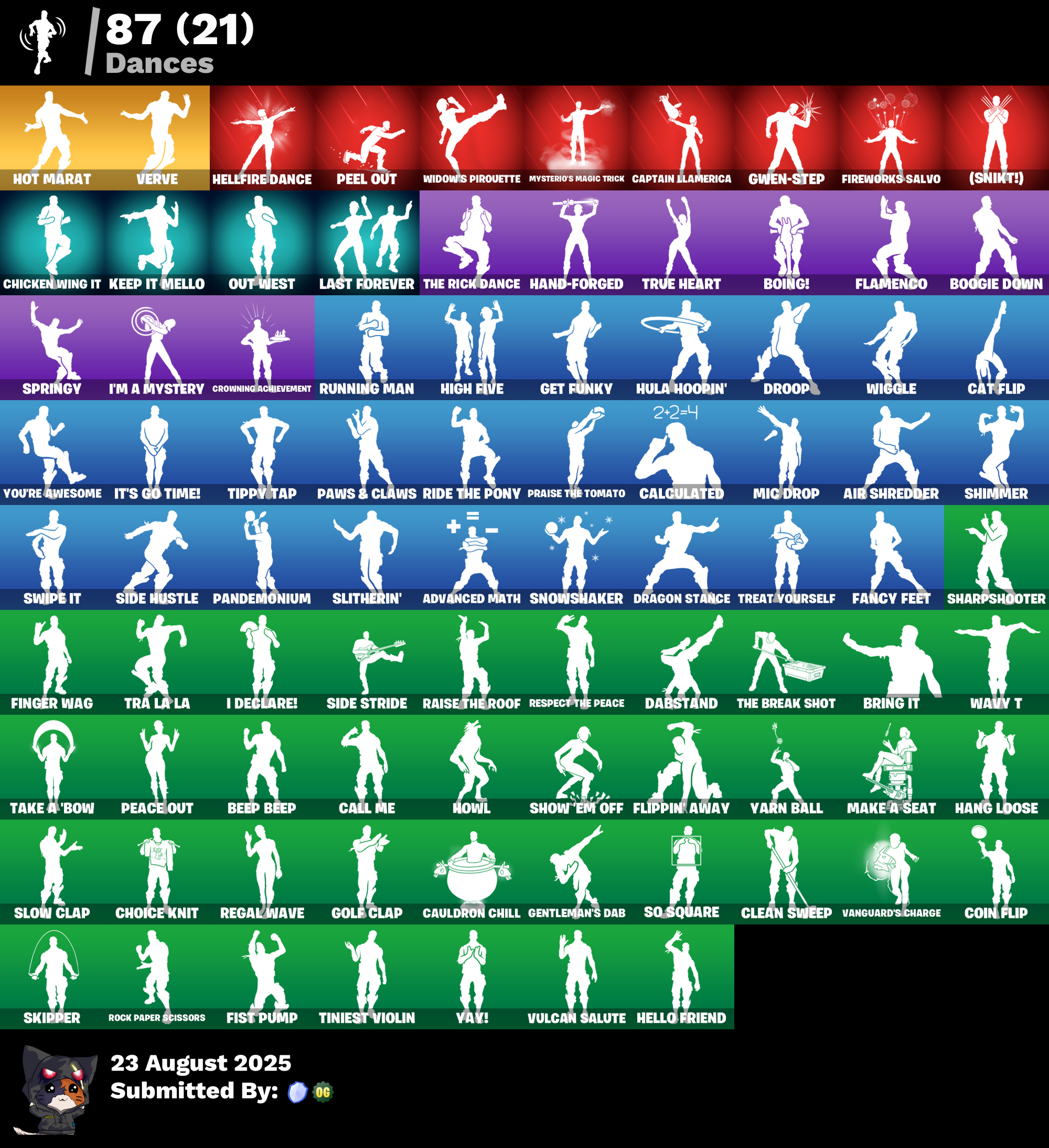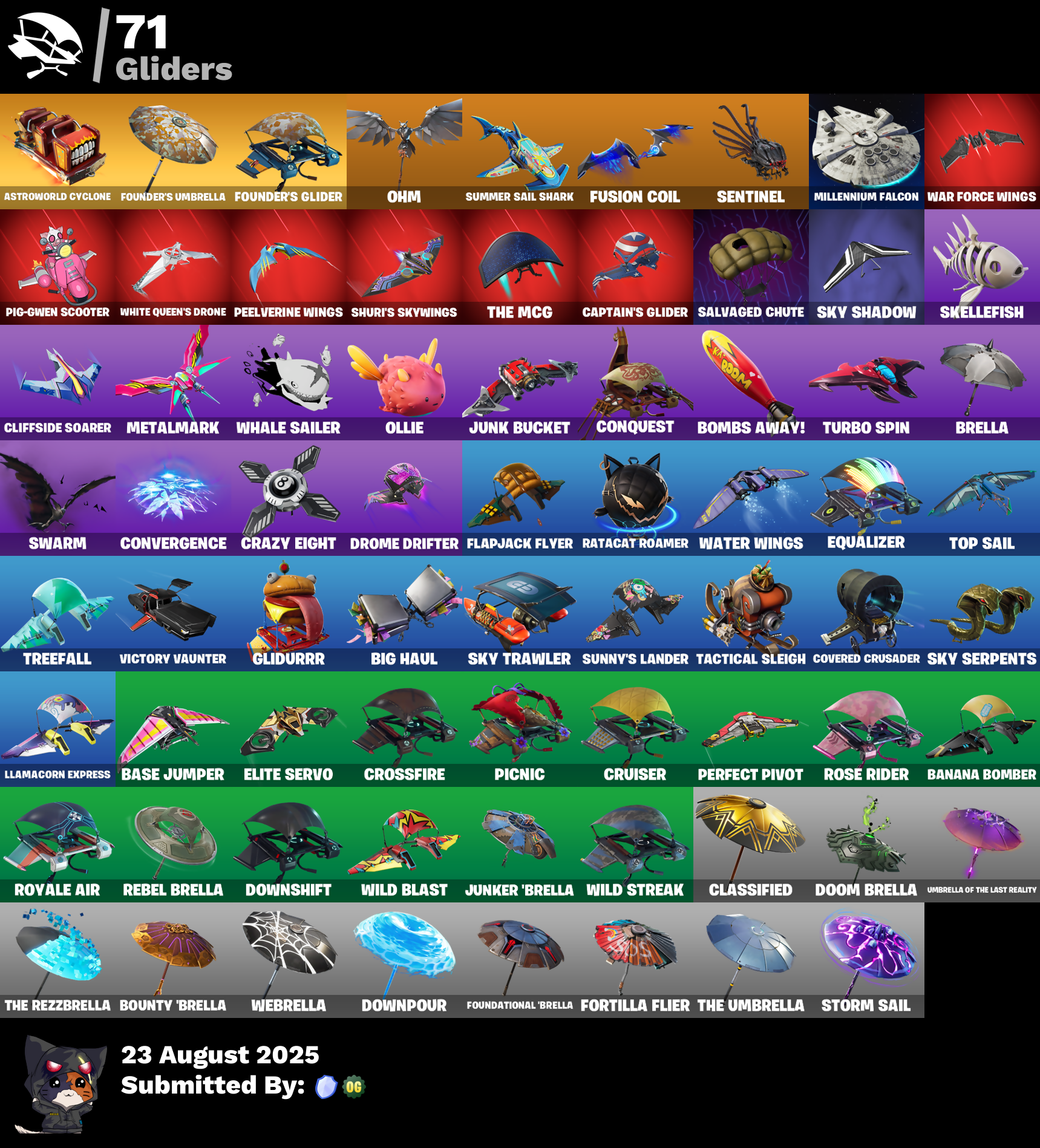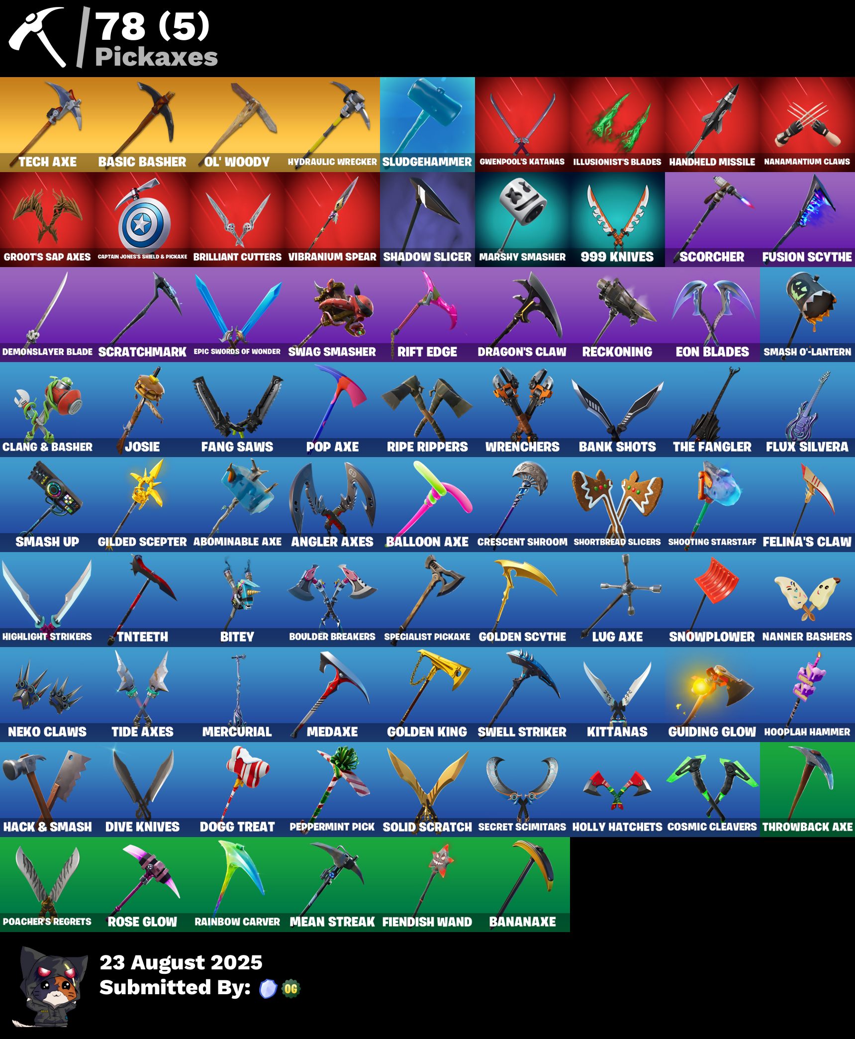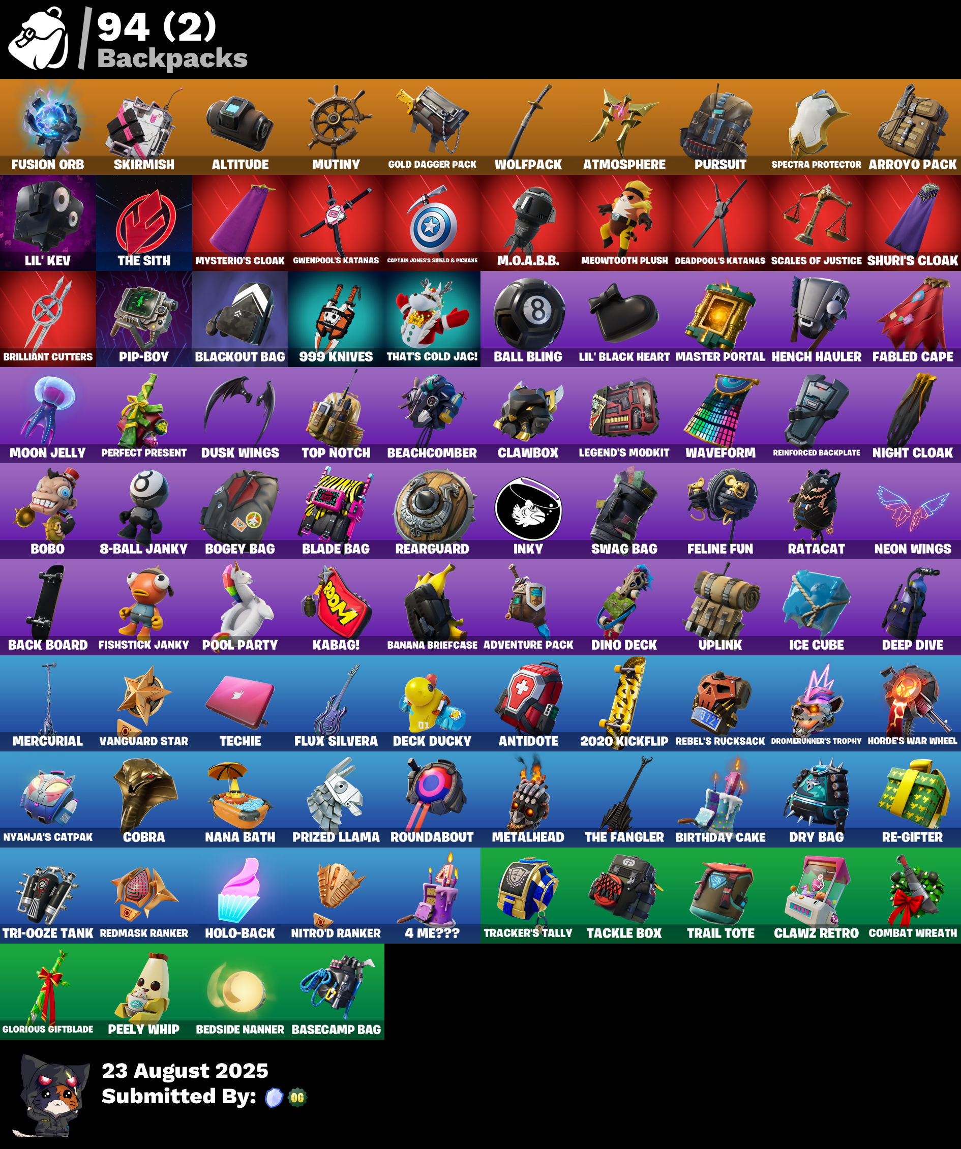 (Snikt!), 2020 Kickflip, 4 Me???, 8-Ball Janky, 8-Ball vs Scratch, 999 Knives, Abominable Axe, Advanced Math, Adventure Pack, Agent Peely, Air Shredder, Altitude, Angler Axes, Antidote, Arroyo Pack, Astroworld Cyclone, Atmosphere, Back Board, Ball Bling, Balloon Axe, Banana Bomber, Banana Briefcase, Bananaxe, Bank Shots, Base Jumper, Basecamp Bag, Basic Basher, Beachcomber, Bedside Nanner, Beep Beep, Big Haul, Birthday Cake, Bitey, Black Panther (Shuri), Black Queen, Black Werewolf, Blackheart (Stage 8), Blackout Bag, Blade Bag, Bobo, Bogey Bag, Boing!, Bombs Away!, Boogie Down, Boulder Breakers, Bounty 'Brella, Brella, Brilliant Cutters, Bring It, Brutus, Calamity Stage 5, Calculated, Call Me, Cameo vs Chic, Captain Jones, Captain Jones's Shield & Pickaxe, Captain Llamerica, Captain's Glider, Cat Flip, Catalyst, Cauldron Chill, Charlotte, Chicken Wing It, Choice Knit, Clang & Basher, Classic Peelverine, Classified, Clawbox, Clawz Retro, Clean Sweep, Cliffside Soarer, Cobalt, Cobra, Coin Flip, Combat Wreath, Commando, Conquest, Convergence, Cosmic Cleavers, Covered Crusader, Crazy Eight, Crescent Shroom, Crossfire, Cruiser, DJ Yonder, Dabstand, Deadpool, Deadpool's Katanas, Deck Ducky, Deep Dive, Demonslayer Blade, Dino Deck, Dive Knives, Dogg Treat, Doom Brella, Downpour, Downshift, Dragon Stance, Dragon's Claw, Drift Stage 5, Drome Drifter, Dromrunner's Trophy, Droop, Dry Bag, Dusk, Dusk Wings, Elite Servo, Eon Blades, Epic Swords Of Wonder, Equalizer, Fable, Fabled Cape, Fade, Fancy Feet, Fang Saws, Felina's Claw, Feline Fun, Fiendish Wand, Finger Wag, Fireworks Salvo, Fishstick Janky, Fist Pump, Flamenco, Flapjack Flyer, Flippin' Away, Flux Silvera, Fortilla Flier, Foundational 'Brella, Founder's Glider, Founder's Umbrella, Fusion Coil, Fusion Orb, Fusion Scythe, Gear Specialist Maya, Gentleman's Dab, Get Funky, Giddy-Up, Gilded Scepter, Glidurr, Glorious Giftblade, Gold Dagger Pack, Golden King, Golden Scythe, Golf Clap, Groots Sap Axes, Guiding Glow, Gwen-Step, Gwenpool, Gwenpool's Katanas, Hack & Smash, Hand-Forged, Handheld Missile, Hang Loose, Hazard, Hellfire Dance, Hello Friend, Hench Hauler, High Five, Highlight Strikers, Holiday Boxy, Holly Hatchets, Holo-Back, Hooplah Hammer, Hope, Horde's War Wheel, Hot Marat, Howl, Hula Hoopin', Huntress, Hybrid (Stage 4), Hydraulic Wrecker, I Declare!, I'm A Mystery, Ice Cube, Illusionist's Blades, Inky, Iris, It's Go Time!, Josie, Jules, Junk Bucket, Junker 'Brella, Kabag!, Keep It Mello, Kittanas, Last Forever, Legend's Modkit, Lil' Black Heart, Lil' Kev, Llamacorn Express, Lt. Evergreen, Lug Axe, Lynx (Stage 4 - No Ponytail), M.O.A.B.B., Make A Seat, Mariana, Marshy Smasher, Master Portal, Maven, Mean Streak, Medaxe, Meowscles, Meowtooth Plush, Mercurial, Metalhead, Metalmart, Mic Drop, Midas, Millennium Falcon, Moon Jelly, Mutiny, Mysterio, Mysterio's Cloak, Mysterio's Magic Trick, Nana Bath, Nanamantium Claws, Nanner Bashers, Neko Claws, Neon Wings, Night Cloak, Nightshade, Nitro'd Ranker, Nyanja, Nyanja's Catpak, Ohm, Ol' Woody, Ollie, Oscar, Out West, Pandemonium, Paws & Claws, Peace Out, Peel Out, Peelverine Wings, Peely Whip, Peppermint Pick, Perfect Pivot, Perfect Present, Picnic, Pig-Gwen Scooter, Pip-Boy, Poacher's Regrets, Polar Peely, Pool Party, Pop Axe, Powder, Praise The Tomato, Prized Llama, Pursuit, Rainbow Carver, Raise The Roof, Ratacat, Ratacat Roamer, Re-Gifter, Rearguard, Rebel Brella, Rebel's Rucksack, Reckoning, Redline, Redmask Ranker, Regal Wave, Reinforced Backplate, Remedy vs Toxin, Respect The Peace, Ride The Pony, Rift Edge, Ripe Rippers, Rippley vs Sludge, Riptide, Rock Paper Scissors, Rose Glow, Rose Rider, Rose Team Leader, Roundabout, Rox (Stage 5), Royale Air, Ruby Shadows, Running Man, Salvaged Chute, Santa Dogg, Scales Of Justice, Scorcher, Scratchmark, Scuba Jonesy, Secret Scimitars, Sentinel, Sgt. Winter Headgear, Shadow Slicer, Sharpshooter, Shimmer, Shooting Starstaff, Shortbread Slicers, Show 'Em Off, Shuri's Cloak, Shuri's Skywings, Side Hustle, Side Stride, Sidewinder, Skellefish, Skipper, Skirmish, Sky Serpents, Sky Shadow, Sky Trawler, Skye, Slayer Juice Wrld, Sledgehammer, Slitherin', Slow Clap, Sludgehammer, Smash O'-Lantern, Smash Up, Snowplower, Snowshaker, So Square, Solid Scratch, Specialist Pickaxe, Spectra Protector, Springy, Storm Sail, Summer Sail Shark, Summit Striker, Sun Strider, Sunny's Lander, Swag Bag, Swag Smasher, Swarm, Swell Striker, Swipe It, Tackle Box, Tactical Sleigh, Take A 'Bow, Tech Axe, Techie, That's Cold Jac!, The Ace, The Break Shot, The Fangler, The Mcg, The Rezzbrella, The Rick Dance, The Sith, The Umbrella, Throwback Axe, Tide Axes, Tilted Teknique (Hoodie), Tiniest Violin, Tippy Tap, Tnteeth, Tntina, Toona Fish, Top Notch, Top Sail, Tra La La, Tracker's Tally, Trail Tote, Treat Yourself, Treefall, Tri-Ooze Tank, Trog, True Heart, Turbo Spin, Umbrella of the Last Reality, Uplink, Vanguard Star, Vanguard's Charge, Verve, Vibranium Spear, Victory Vaunter, Vulcan Salute, War Force Wings, War Machine, Warpaint, Water Wings, Wavebreaker, Waveform, Wavy T, Webrella, Whale Sailer, White Queen's Drone, Widow's Pirouette, Wiggle, Wild Blast, Wild Streak, Wingman, Winterfest Bushranger, Wolfpack, Wooly Warrior, Wrenchers, X-Lord, Yarn Ball, Yav!, You're Awesome, Zenith (Stage 4)