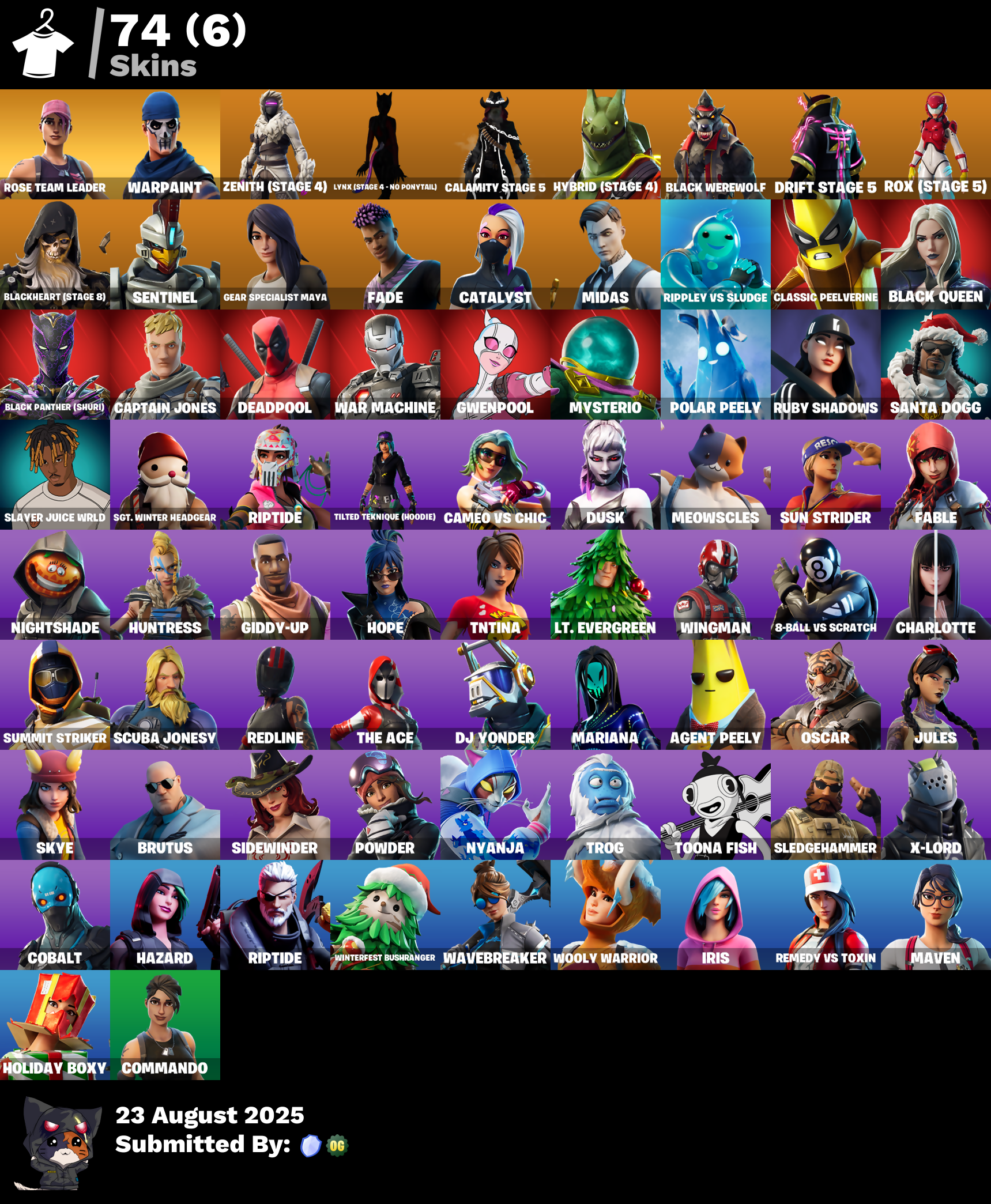 74 TOP SKINS [PC/PSN/XBOX] OG STW | MIDAS ✅ BLACK QUEEN ✅ DUSK ✅ RUBY SHADOWS ✅ DEADPOOL ✅ BRUTUS ✅ CAPTAIN JONES ✅ TOONA FISH