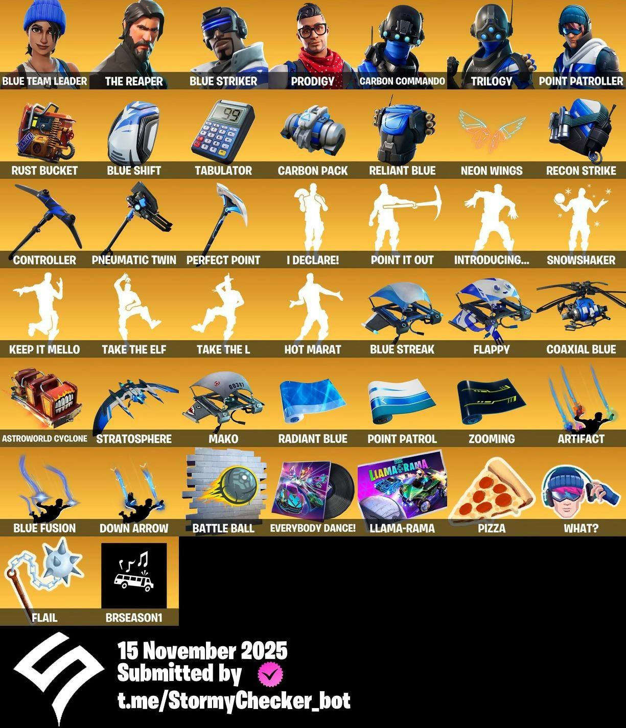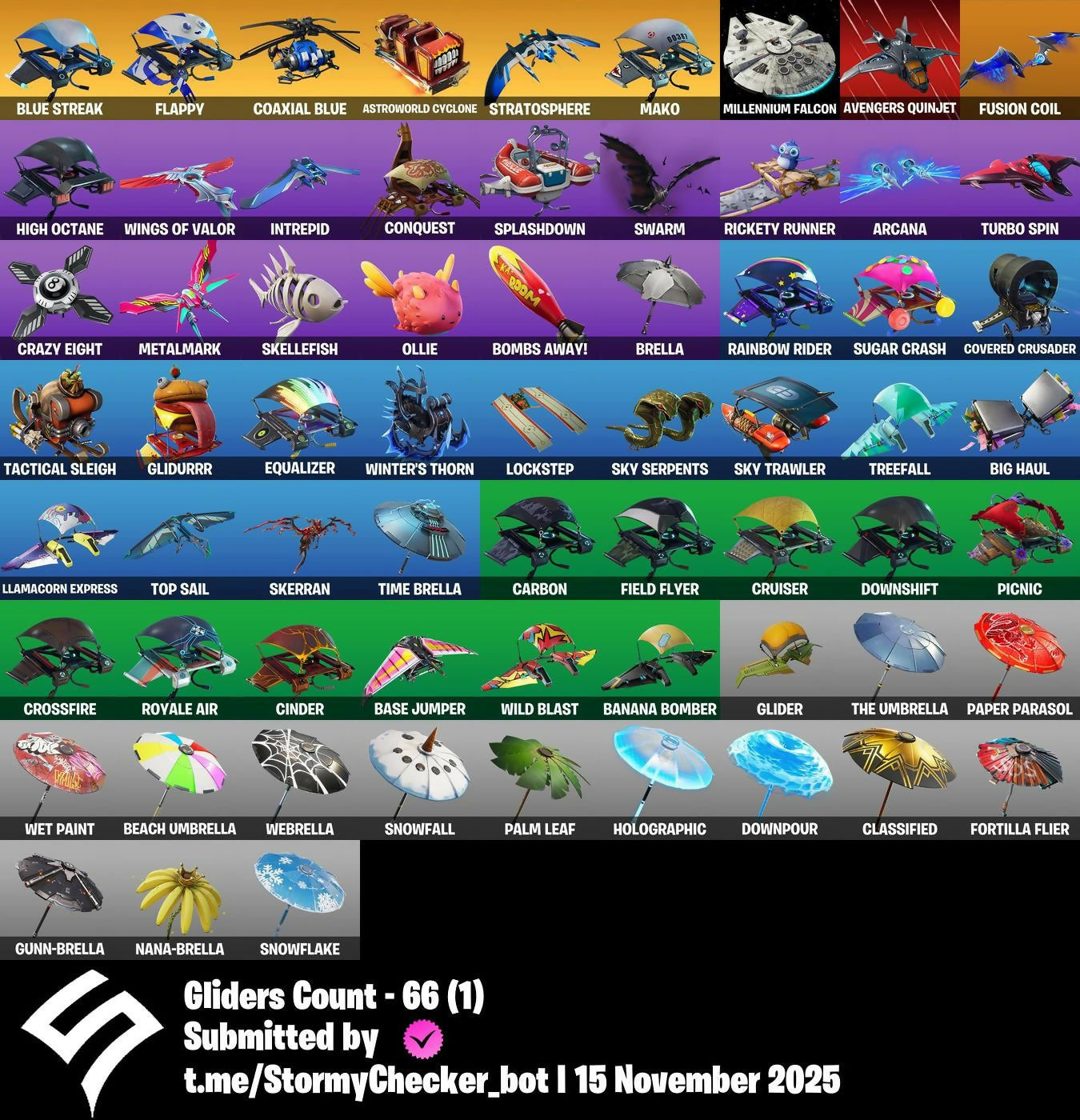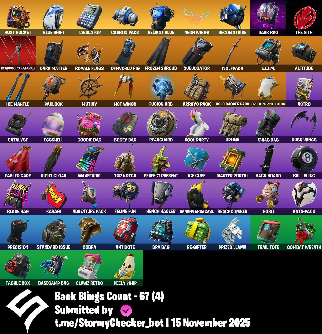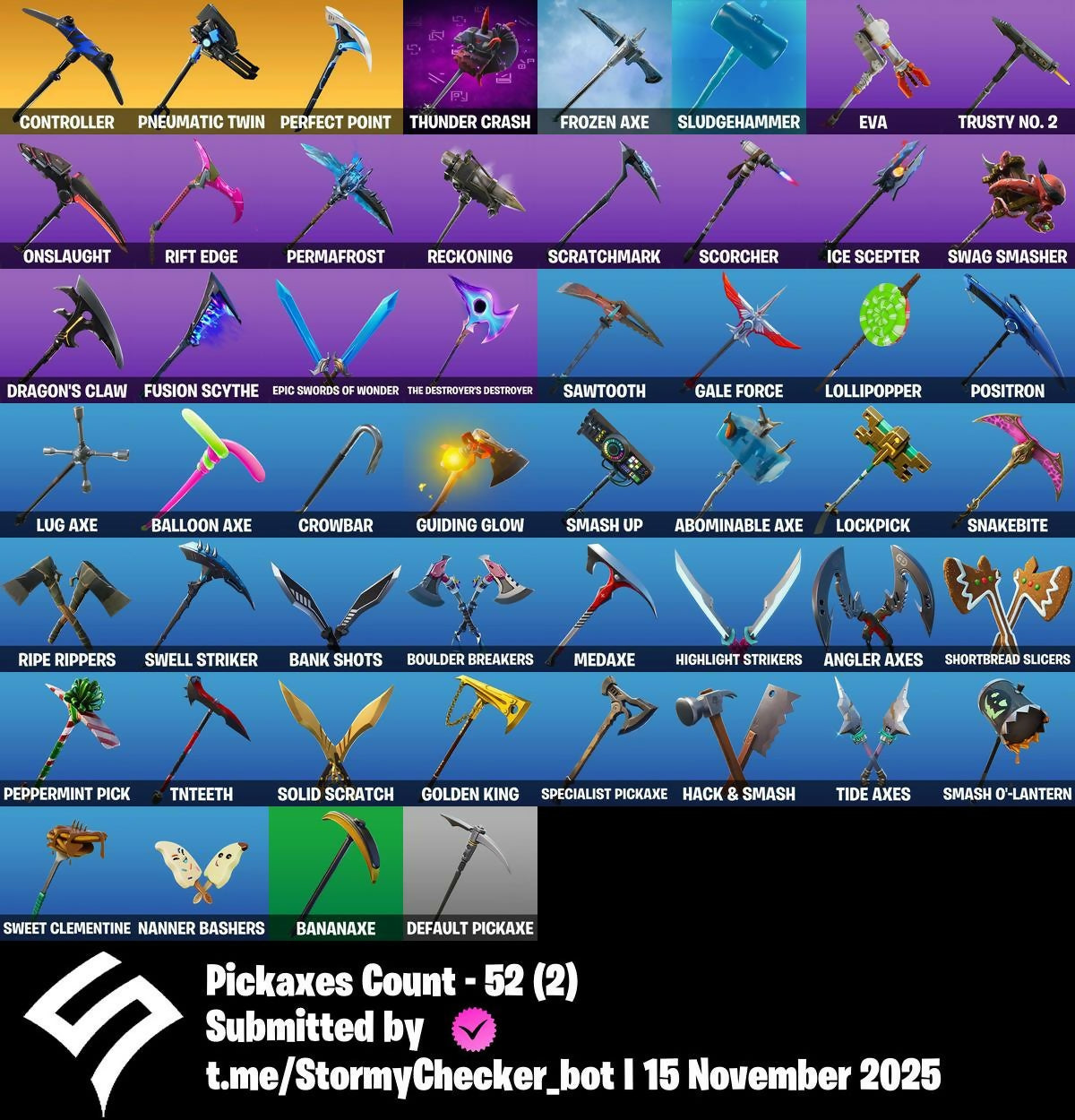 8-Ball Vs Scratch, A.I.M., Abominable Axe, Adventure Pack, Agent Peely, Altitude, Angler Axes, Antidote, Arcana, Arroyo Pack, Artifact, Astro, Astroworld Cyclone, Avengers Quinjet, BRSeason1, Back Board, Ball Bling, Balloon Axe, Banana Bomber, Banana Briefcase, Bananaxe, Bank Shots, Base Jumper, Basecamp Bag, Battle Ball, Battlehawk, Beach Umbrella, Beachcomber, Beep Beep, Best Mates, Big Haul, Blackheart, Blade Bag, Blue Fusion, Blue Shift, Blue Streak, Blue Striker, Blue Team Leader, Bobo, Bogey Bag, Boing!, Bombs Away!, Boulder Breakers, Breakdown, Brella, Brutus, Buckets, Bunker Jonesy, Bunny Brawler, Calamity, Calculated, Call Me, Cameo Vs Chic, Carbide, Carbon, Carbon Commando, Carbon Pack, Cat Flip, Catalyst, Cinder, Classified, Clawz Retro, Cluck Strut, Coaxial Blue, Cobra, Coin Flip, Combat Wreath, Conga, Conquest, Controller, Covered Crusader, Crazy Eight, Crossfire, Crowbar, Cruiser, DJ Yonder, Dance Moves, Dark Bag, Dark Bomber, Dark Matter, Dark Voyager, Deadpool, Deadpool's Katanas, Default Pickaxe, Dire, Down Arrow, Downpour, Downshift, Doze Dab, Dragon Stance, Dragon's Claw, Drift, Droop, Dry Bag, Dusk, Dusk Wings, E.L.I.M., Eggshell, Elite Agent, Enforcer, Epic Swords of Wonder, Equalizer, Eva, Everybody Dance!, Fable, Fabled Cape, Face Palm, Fade, Feline Fun, Field Flyer, Flail, Flamenco, Flapper, Flappy, Flippin' Away, Flippin' Sexy, Fortilla Flier, Free Flow, Frozen Axe, Frozen Shroud, Fusion, Fusion Coil, Fusion Orb, Fusion Scythe, Gale Force, Gear Specialist Maya, Gentleman's Dab, Get Funky, Giddy-Up, Glider, Glidurrr, Gold Dagger Pack, Golden King, Golf Clap, Goodie Bag, Groove Jam, Ground Pound, Guiding Glow, Gunn-Brella, Hack & Smash, Hand Signals, Hello Friend, Hench Hauler, High Five, High Octane, Highlight Strikers, Holographic, Hot Marat, Hot Wings, Hula Hoopin', Huntress, Hybrid, Hype, I Declare!, Ice Cube, Ice Mantle, Ice Scepter, Intrepid, Introducing..., It's Go Time!, Journey Vs Hazard, Jubilation, Kabag!, Kata-Pack, Keep It Mello, Llama-Rama, Llamacorn Express, Lockpick, Lockstep, Lollipopper, Lt. Evergreen, Lug Axe, Lynx, Mako, Master Portal, Medaxe, Meowscles, Metalmark, Mic Drop, Midas, Millennium Falcon, Mission Specialist, Moonwalker, Mutiny, Nana-Brella, Nanner Bashers, Neon Wings, Night Cloak, Nightshade, Ocean, Offworld Rig, Ollie, Omega, Onesie, Onslaught, Orange Justice, Padlock, Palm Leaf, Pandemonium, Paper Parasol, Paws & Claws, Peace Out, Peely, Peely Whip, Peppermint Pick, Perfect Point, Perfect Present, Permafrost, Picnic, Pizza, Pneumatic Twin, Point It Out, Point Patrol, Point Patroller, Pool Party, Popcorn, Positron, Powder, Precision, Prized Llama, Prodigy, Pure Salt, Radiant Blue, Ragnarok, Rainbow Rider, Re-Gifter, Rearguard, Reckoning, Recon Strike, Redline, Regal Wave, Reliant Blue, Remedy Vs Toxin, Respect, Respect The Peace, Rickety Runner, Rift Edge, Ripe Rippers, Rippley Vs Sludge, Rogue Agent, Rook, Rox, Royale Air, Royale Flags, Running Man, Rust Bucket, Rust Lord, Salute, Sawtooth, Scorcher, Scratchmark, Sentinel, Sgt. Winter, Sharpshooter, Shimmer, Shortbread Slicers, Side Hustle, Sidewinder, Skellefish, Skerran, Sky Serpents, Sky Trawler, Skye, Sledgehammer, Slitherin', Sludgehammer, Smash O'-Lantern, Smash Up, Snakebite, Snoozefest, Snowfall, Snowflake, Snowshaker, Solid Scratch, Specialist Pickaxe, Spectra Protector, Splashdown, Springy, Squad Leader, Squat Kick, Standard Issue, Stratosphere, Subjugator, Sugar Crash, Summit Striker, Sun Strider, Swag Bag, Swag Smasher, Swarm, Sweet Clementine, Swell Striker, Swipe It, Tabulator, Tackle Box, Tactical Sleigh, Take The Elf, Take The L, Teknique, The Ace, The Destroyer's Destroyer, The Ice King, The Prisoner, The Reaper, The Robot, The Sith, The Umbrella, The Visitor, Thunder Crash, Tide Axes, Time Brella, Tnteeth, Tntina, Top Notch, Top Sail, Trail Tote, Treefall, Trilogy, Trog, Trusty No. 2, Turbo Spin, Turk Vs Riptide, Uplink, Valor, Wave, Wavebreaker, Waveform, Wavy T, Webrella, Wet Paint, What?, Wiggle, Wild Blast, Wingman, Wings Of Valor, Winter's Thorn, Wolfpack, Wukong, Yay!, You're Awesome, Zenith, Zoey, Zooming
