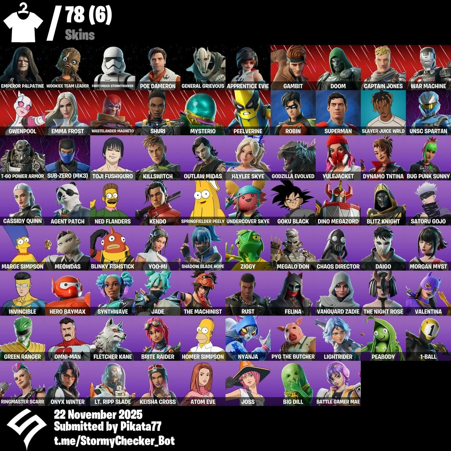 78 Skins | Doom | Toji Fushiguro | Killswitch | Outlaw Midas | Haylee Skye | Default Pickaxe | pickaxe_almondsplash_bass | The Doomblade | 700 VB