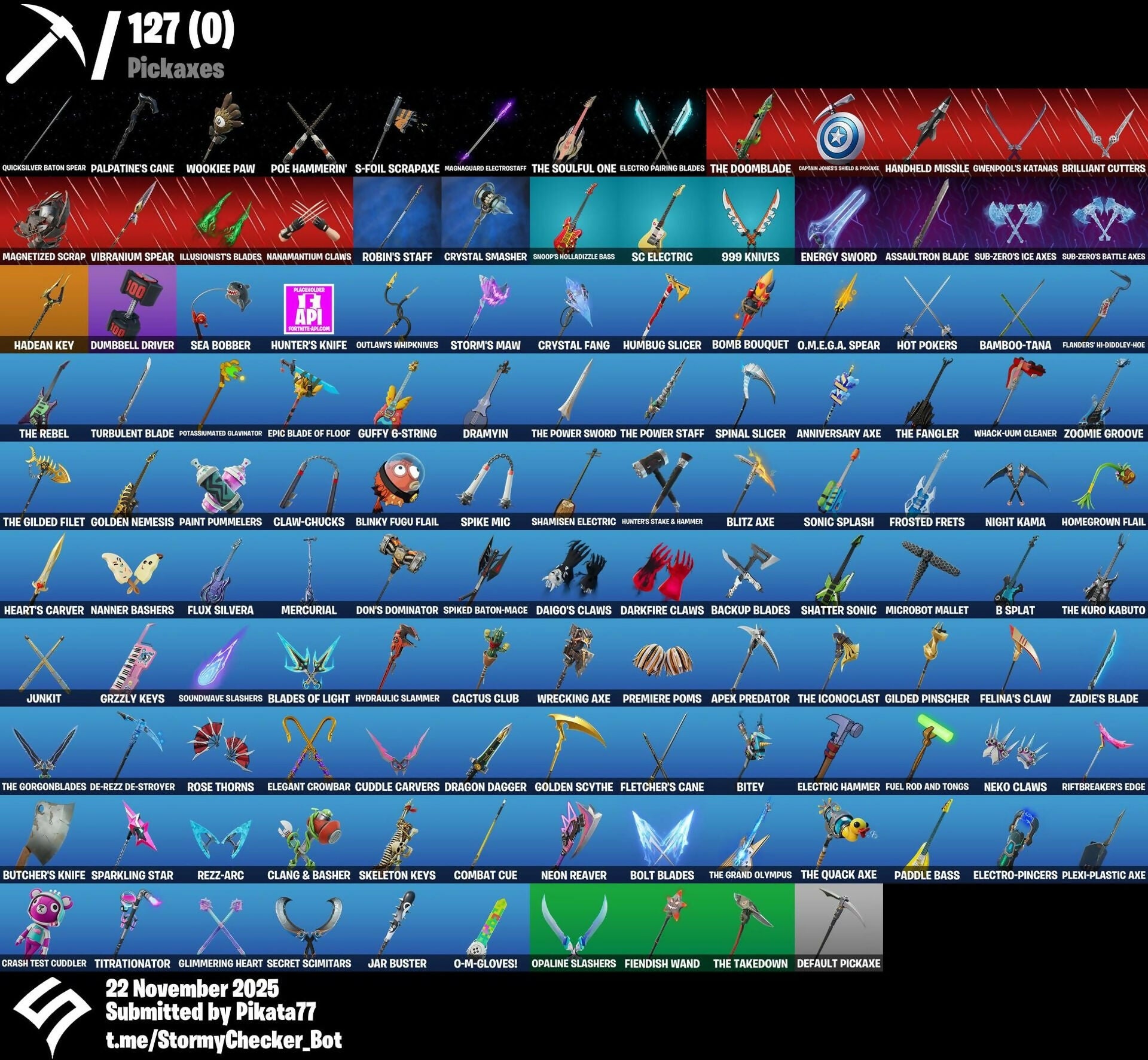 (Snikt!), 1-Ball, 999 Knives, Agent Patch, Anniversary Axe, Apex Predator, Apprentice Evie, Apt., Arcane Research, Ascend!, Assaultron Blade, Atom Eve, B Splat, Backup Blades, Bamboo-Tana, Baron's Hoard, Battle Blessing, Battle Gamer Mae, Berzerk Banana Beam, Big Dill, Bike To Go, Birdarang Flourish, Bitey, Blades of Light, Blinky Fishstick, Blinky Fugu Flail, Blitz Axe, Blitz Knight, Bolt Blades, Bomb Bouquet, Boogie Down, Brilliant Cutters, Brite Moves, Brite Raider, Bug Punk Sunny, Butcher's Knife, Cactus Club, Captain Jones, Captain Llamerica, Cassidy Quinn, Cauldron Chill, Celebrate Me, Chaos Director, Clang & Basher, Claw-Chucks, Codsworth's Cleanup, Combat Cue, Crash Test Cuddler, Crowning Achievement, Crystal Fang, Crystal Smasher, Cuddle Carvers, Daigo, Daigo's Claws, Dance Moves, Darkfire Claws, De-Rezz De-Stroyer, Default Pickaxe, Dill With It, Dino Megazord, Disassemble, Don's Dominator, Doom, Doom's Domain, Doze Dab, Dragon Dagger, Dragon Dagger's Song, Dramyin, Duelist's Card Trick, Dumbbell Driver, Dynamo Tntina, Electric Hammer, Electro-Pincers, Elegant Crowbar, Emma Frost, Emperor Palpatine, Energy Sword, Epic Blade of Floof, Feel The Force, Felina, Felina's Claw, Fiendish Wand, Fire Show, Fireworks Salvo, First Order Stormtrooper, Fist Bump, Fletcher Kane, Fletcher's Cane, Flux Silvera, Foil Flex, For O.X.R!, Force Lighting, Frosted Frets, Frozen Treat Cart, Fuel Rod and Tongs, Gambit, General Grievous, General's War Table, Gilded Pinscher, Glimmering Heart, Godzilla Evolved, Goku Black, Golden Nemesis, Golden Scythe, Good Sportsmanship, Green Ranger, Grzzly Keys, Guffy 6-String, Gwen-Step, Gwenpool, Gwenpool's Katanas, Hadean Key, Handheld Missile, Haylee Skye, Heart's Carver, Hellfire Dance, Hero Baymax, Homegrown Flail, Homer Simpson, Hot Pokers, Humbug Slicer, Hunter's Knife, Hunter's Stake & Hammer, Hydraulic Slammer, Hype!, I Am Evil Homer, I'm The Visual, Illusionist's Blades, Invincible, Invisible Cut, It's Chemistry!, Jade, Jar Buster, Jet Signals, Joss, Junkit, Keisha Cross, Kendo, Killswitch, Leafy Longboardin', Lightrider, Lil' Ghost, Lil' Godzilla Attack, Lil' Resistance Bomber, Lil' Station Wagon, Lil' Zord Battle Mode, Lt. Ripp Slade, Magnetized Scrap, Make A Seat, Marge Simpson, Meat Grinder, Megalo Don, Meowdas, Mercurial, Microbot Mallet, Microflip, Mini Dogfight, Morgan Myst, Mysterio, Mysterio's Magic Trick, Nanamantium Claws, Nanner Bashers, Ned Flanders, Neko Claws, Neon Reaver, Night Kama, Ninja Stance: Leo, Nyanja, O-M-Gloves!, O.M.E.G.A. Spear, Omni-Man, Onyx Winter, Opaline Slashers, Outlaw Midas, Outlaw's Mugshot, Outlaw's Strut, Outlaw's Whipknives, Paddle Bass, Paint Pummellers, Palpatine's Cane, Parade Riffs, Pea Part Harmony, Peabody, Peel Out, Peelverine, Plexi-Plastic Axe, Poe Dameron, Poe Hammerin', Premiere Poms, Pull Up, Puppet Dance, Purr-Demonium, Pyg The Butcher, Quicksilver Baton Spear, Raven's Legion, Reporting For Duty, Rezz-Arc, Rezzblocks, Rhythm Of Chaos, Riftbreaker's Edge, Ringmaster Scarr, Robin, Robin's Staff, Rose Thorns, Rust, S-Foil Scrapaxe, Satoru Gojo, Sc Electric, Sea Bobber, Secret Scimitars, Serpentine Summoning, Shadow Blade Hope, Shadow Play: Max Elephant, Shadow Vox, Shamisen Electric, Shamisen-Sational, Shatter Sonic, Show 'Em Off, Showboat, Shuri, Skatemonster, Skeleton Keys, Slammin' Bass, Slayer Juice Wrld, Snoop's Holladizzle Bass, Sonic Splash, Soundwave Slashers, Sparkling Star, Spike Mic, Spiked Baton-Mace, Spinal Slicer, Spirit Strider, Springfielder Peely, Stand Surfer, Storm's Maw, Stupid Sexy Skiing, Sub-Zero (Mk3), Sub-Zero's Battle Axes, Sub-Zero's Ice Axes, Super Save, Superman, Synth Step, Synthwave, T-60 Power Armor, Tagger's Groove, Targeted Focus, The Break, The Break Shot, The Doomblade, The Fangler, The Gilded Filet, The Gorgonblades, The Grand Olympus, The Iconoclast, The Kuro Kabuto, The Machinist, The Night Rose, The Power Staff, The Power Sword, The Quack Axe, The Rebel, The Soulful One, The Takedown, Titrationator, Toji Fushiguro, Turbulent Blade, Undercover Skye, Unsc Spartan, Valentina, Valentina's Verve, Vanguard Zadie, Vibranium Spear, War Machine, Wasteland Rock, Wastelander Magneto, Whack-Uom Cleaner, Wings Of Renown, Wookiee Paw, Wookiee Team Leader, Wrecking Axe, Yarn Ball, Yoo-Mi, Yulejacket, Zadie's Blade, Ziggy, Zoomie Groove