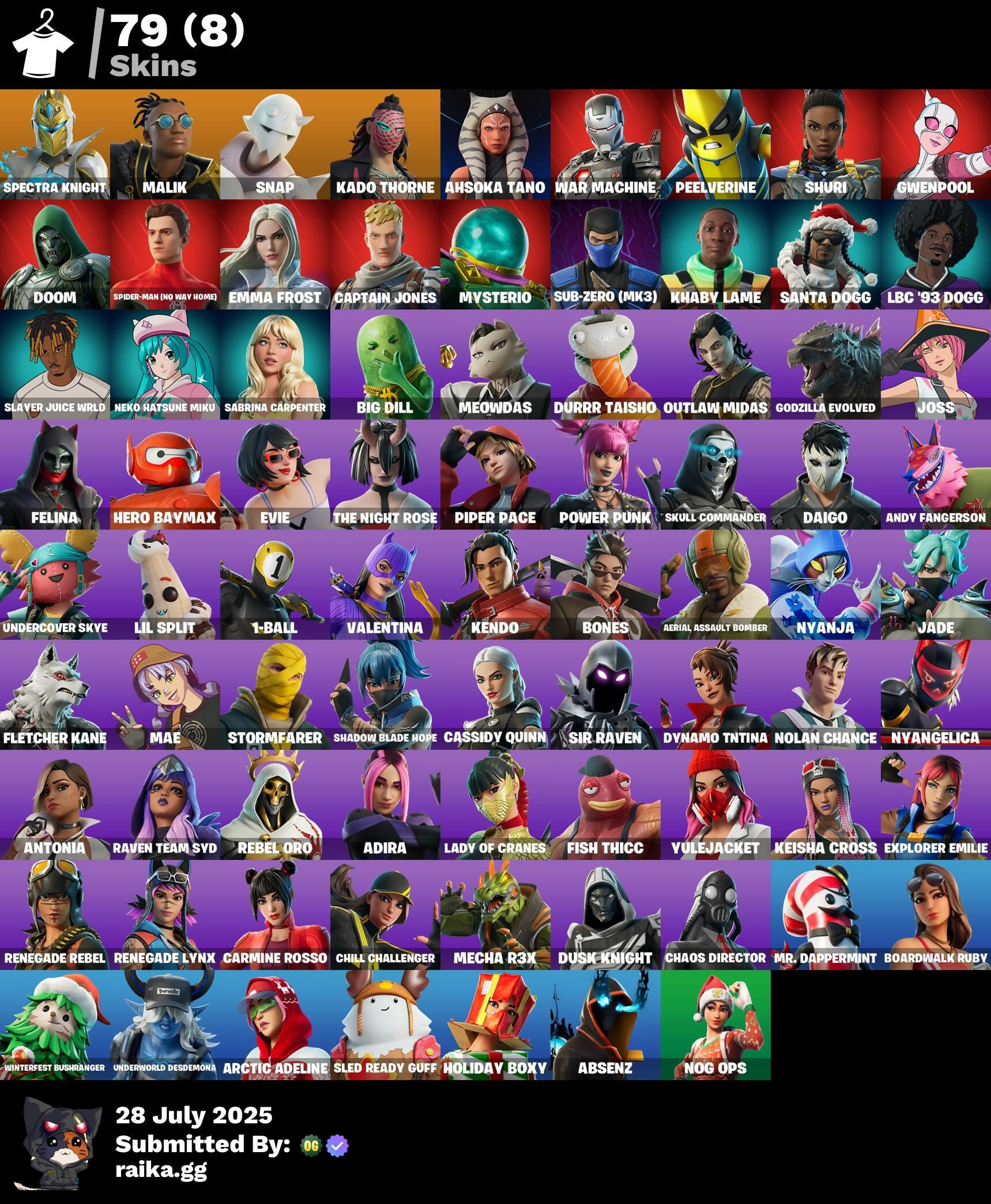 79 skins | Candy Axe | Nanner Ringer | Spectra Knight | Malik | Snap | Kado Thorne | Ahsoka Tano | War Machine | Peelverine | Shuri | Gwenpool | 1400 VB