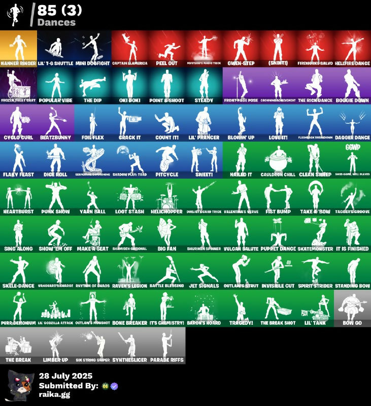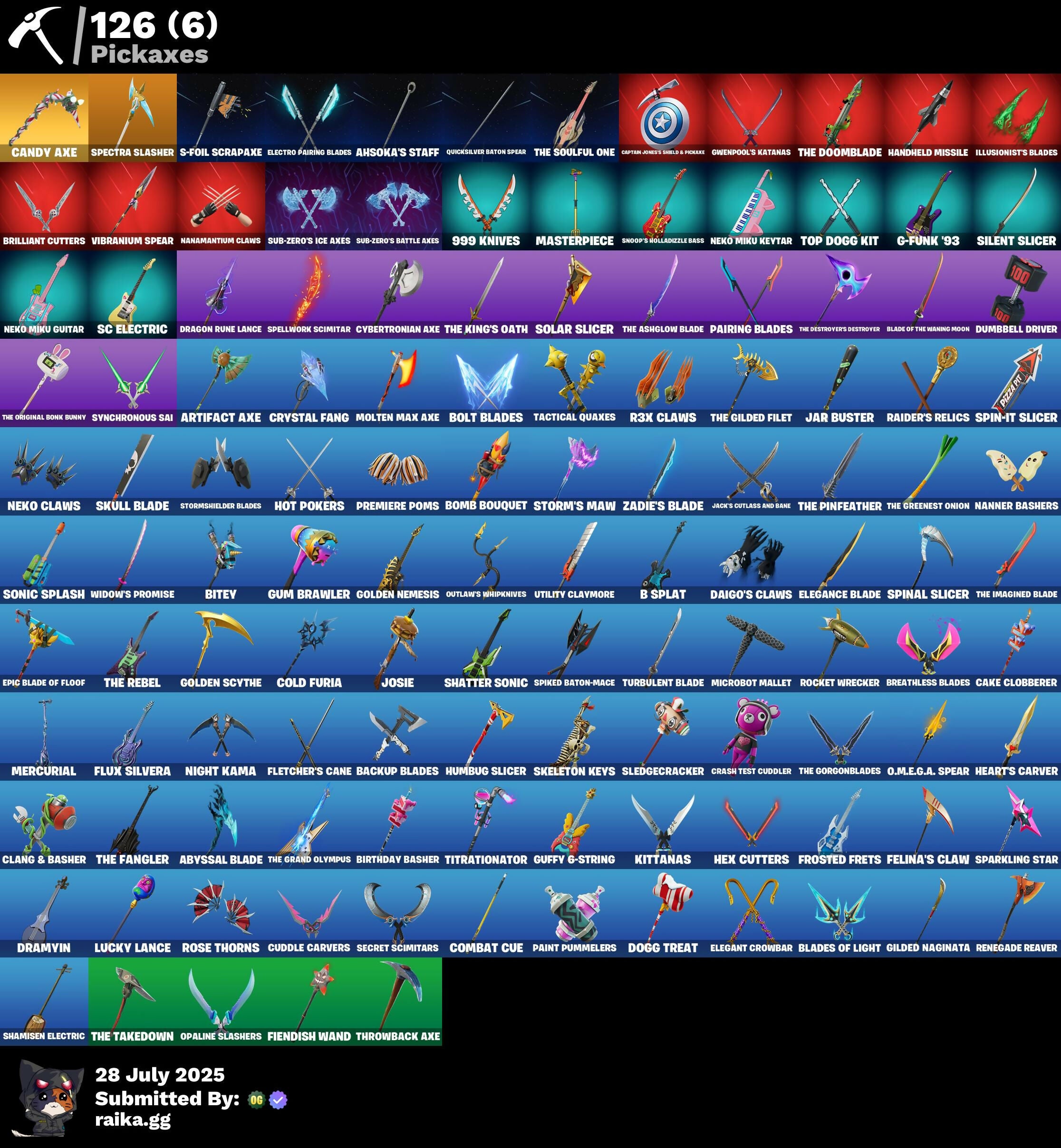 (Skint), 1-Ball, 999 Knives, Absenz, Abyssal Blade, Adira, Aerial Assault Bomber, Ahsoka Tano, Ahsoka's Staff, Andy Fangerson, Antonia, Arctic Adeline, Artifact Axe, B Splat, Backup Blades, Baron's Hoard, Battle Blessing, Beatzbunny, Big Dill, Big Fan, Birthday Basher, Bitey, Blade of the Waning Moon, Blades of Light, Blowin' Up, Boardwalk Ruby, Bolt Blades, Bomb Bouquet, Bone Breaker, Bones, Boogie Down, Bow Go, Breathless Blades, Brilliant Cutters, Cake Clobberer, Candy Axe, Captain America, Captain Jones, Captain Jones's Shield & Pickaxe, Carmine Rosso, Cassidy Quinn, Cauldron Chill, Chaos Director, Chill Challenger, Clang & Basher, Clean Sweep, Cold Furia, Combat Cue, Count It!, Crack It, Crash Test Cuddler, Crowning Achievement, Crystal Fang, Cuddle Carvers, Cybertronian Axe, Cyclo Curl, Dagger Dance, Daigo, Daigo's Claws, Dice Roll, Dogg Treat, Doom, Dragon Rune Lance, Dramyin, Duelist Cards Trick, Dumbbell Driver, Durrr Taisho, Dusk Knight, Dynamo Tntina, Elegance Blade, Elegant Crowbar, Emma Frost, Epic Blade of Floof, Evie, Explorer Emilie, Felina, Felina's Claw, Fiendish Wand, Fireworks Salvo, Fish Thicc, Fist Bump, Flaky Feast, Flashback Breakdown, Fletcher Kane, Fletcher's Cane, Flux Silvera, Foil Flex, Front Page Pose, Frosted Frets, Frozen Treat Cart, G-Funk '93, Gilded Naginata, Godzilla Evolved, Golden Nemesis, Golden Scythe, Good Game, Well Played, Guffy 6-String, Gum Brawler, Gwen-Step, Gwenpool, Gwenpool's Katanas, Handheld Missile, Heartburst, Hearts Carver, Helichopper, Hellfire Dance, Hero Baymax, Hex Cutters, Holiday Boxy, Hot Pokers, Humbug Slicer, Illusionist's Blades, Invisible Cut, It Is Finished, It's Chemistry!, Jack's Cutlass and Bane, Jade, Jar Buster, Jet Signals, Josie, Joss, Kado Thorne, Keisha Cross, Kendo, Khaby Lame, Kittanas, LBC '93 Dogg, Lady Of Cranes, Lil Split, Lil' Godzilla Attack, Lil' Prancer, Lil' T-G Shuttle, Lil' Tank, Limber Up, Loot Stash, Love It!, Lucky Lance, Mae, Make A Seat, Malik, Masterpiece, Mecha R3X, Meowdas, Mercurial, Microbot Mallet, Mini Dogfight, Molten Max Axe, Mr. Dappermint, Mysterio, Mysterious Magic Trick, Nailed It, Nanamantium Claws, Nanner Bashers, Nanner Ringer, Neko Claws, Neko Hatsune Miku, Neko Miku Guitar, Neko Miku Keytar, Night Kama, Nog Ops, Nolan Chance, Nyangelica, Nyanja, O.M.E.G.A. Spear, Oki Doki, Opaline Slashers, Outlaw Midas, Outlaw's Pistol, Outlaw's Strut, Outlaw's Whipknives, Paint Pummelers, Pairing Blades, Parade Riffs, Peel Out, Peelverine, Piper Pace, Pitcycle, Point & Shoot, Popular Vibe, Power Punk, Premiere Poms, Punk Show, Puppet Dance, Purr-Demonium, R3X Claws, Raider's Relics, Raven Team Syd, Raven's Legion, Rebel Oro, Renegade Lynx, Renegade Reaver, Renegade Rebel, Rhythm Of Chaos, Rocket Wrecker, Rose Thorns, S-Foil Scrapaxe, SC Electric, Sabrina Carpenter, Santa Dogg, Secret Scimitars, Serpentine Summoning, Shadow Blade Hope, Shadow Play: Toad, Shamisen Electric, Shamisen Seasonal, Shatter Sonic, Show 'Em Off, Shuri, Shuriken Spinner, Silent Slicer, Sing Along, Sir Raven, Six String Sniper, Skatemonster, Skele-Dance, Skeleton Keys, Skull Blade, Skull Commander, Slaver Juice Wrld, Sled Ready Guff, Sledgecracker, Snap, Snoop's Holladizzle Bass, Solar Slicer, Sonic Splash, Sparkling Star, Spectra Knight, Spectra Slasher, Spellwork Scimitar, Spider-Man (No Way Home), Spiked Baton-Mace, Spin-It Slicer, Spinal Slicer, Spirit Strider, Standing Bow, Steady, Storm's Maw, Stormfarer, Stormshielder Blades, Sub-Zero (MK3), Sub-Zero's Battle Axes, Sub-Zero's Ice Axes, Sweet!, Synchronous Sai, Syntheslicer, Tactical Quaxes, Tagger's Groove, Take A Bow, The Ashglow Blade, The Break, The Break Shot, The Destroyer's Destroyer, The Dip, The Doombrade, The Fangler, The Gilded Filet, The Gorgonblades, The Grand Olympus, The Greenest Onion, The Imagined Blade, The King's Oath, The Night Rose, The Original Bonk Bunny, The Pinfeather, The Rebel, The Rick Dance, The Soulful One, The Takedown, Throwback Axe, Titrationator, Top Dogg Kit, Tragedy!, Turbulent Blade, Undercover Skye, Underworld Desdemona, Utility Claymore, Valentina, Valentina's Verve, Vanguard's Charge, Vibranium Spear, Vulcan Salute, War Machine, Widow's Promise, Winterfest Bushranger, Yarn Ball, Yulejacket, Zadie's Blade
