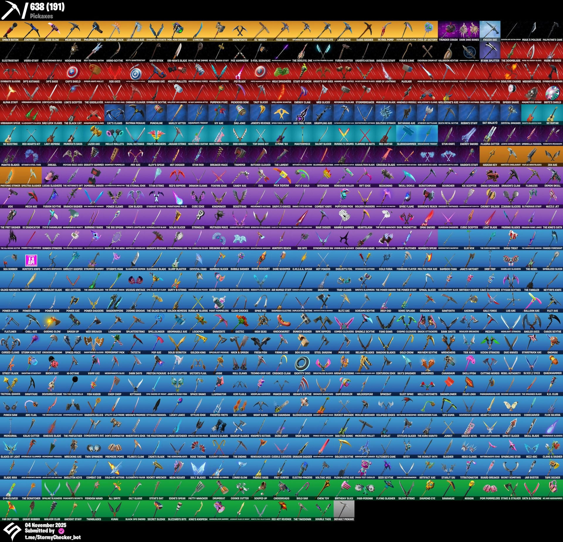(Sniktt), 100 Power Armor, 18’s Kama, 6 Carat Cutter, 9-Ball Vs Scratch, 900 Knives, 928 Axes, A Warrior Prepares, AFK, Aadiolo, Aang, Aang's Air Sphere, Abominable Axe, Acrobabatics, Adira, Adrian Pietro Zavitos, Aera’s Blessing, Afshad, Aftermath, Agent 47 Sword, Agent Jones, Agent Patch, Agent Peely, Ahsoka Tano, Ahsoka’s Staff, Aintona, Air Nomad Staff, Air Shredder, Akronon, Alias, All Might, All Shite, All-Hollow's Steve, Alli, Aloy, Aloy’s Spear, Alpha Staff, Amazing Cube, Ambrosian Bustier, Anakin Skywalker, Ancient Artifact Basics, Ancient Staff, Andy Fangersons, Angler Axes, Ant-Man, Anti-Venom, Aphrodite, Apprentice Eve, Apprentice Rey, Aquaman, Aquaman’s Trident, Arc Flail, Arcane Couture, Arcane J.B., Arcane Jinx, Arcane Research, Arctic Adeline, Arm The Pumpkin, Arma Maru, Arrowpoint Carver, Artemis, Artifact Axe, Ash Williams, Assault Iron Blade, Astra, Astraea, Astro Jack, Athena’s Battleaxe, Atlantian Phantom, Augury, Aura, Aura Analyzer, Avatar's Flourish, Aww, Shucks., Axe-Trail Form, Axettec, Axo, Ayumi Stone Choo, Ayya Vinnn, B-Splat, Backup Blades, Bad Guy, Bad Joke, Bad Luck Claws, Balance Board, Ball, Balloon Axe, Bamboo-Tana, Bananaaxe, Bandollette, Bank Shots, Banner Trooper, Bao Bros, Barbossa’s Sword, Baron's Hoard, Basic Basher, Bat Ninjato, Bat Signal, Batarang Axe, Batman, Batman Pickaxe, Batman Zero, Battle Blessing, Battle Hound, Battlesuit, Batwing Bonespark, Beach Bomber, Beach Jules, Bean Bag, Bear Hug, Beast Boy, Beastfang, Beatrix Starling (Hunters Stealth), Beatzbunny, BeeRus, Beef Boss, Beep Beep, Belle, Bench Upgrade, Benjamin, Beskar Forge, Big Beach Ball Skier, Big Bite, Big Chuggus, Big Doll, Big Fan, Bigfoot, Bike To Go, Billy Bounce, Billy's Tricycle, Bim Bam Boom, Bird Call, Birdrading Flourish, Birthday Basher, Birthday Slice, Bitemaker, Bitey, Black Bomber, Black Cat, Black Horror, Black Manta, Black Ops Sword, Black Panther, Black Wings, Blackheart, Blacklight, Blade, Blade Area, Blade of the Thousand Flames One, Blades of Brother and King, Blades of Light, Blaze, Blitz, Blitz Axe, Blizzard’s Bite, Blowin' Up, Blowing Bubbles, Blue Runner, Blue Spantie, Blue Striker, Blue Team Leader, Board Breaker, Boba Fett, Boba Snack, Boing!, Bold Bar, Bolt Blades, Bomb Bouquet, Bone Breaker, Bonehead, Boneless, Bones, Boogie Down, Boomin', Boosting Ki, Boots 'N' Cats, Bossk, Boulder Breakers, Bounce Berry, Bow Go, Box Basher, Boxer, Brainiac, Branch Basher, Brawler, Breakdance Kit, Breaker Mace, Breaking Point, Breaking Waves, Breakneck, Breathless Blades, Breezy, Bridle of the Tenetres, Brightest Dawn, Brilliant Cutters, Brite Bomber, Brite Moves, Brite Raider, Brite Star, Brite’s Shield, Brolly Stroll, Brony, Bronzed Scimitars, Brutus, Bruxer, Bubble Basher, Buccaneer, Bucket Brigade, Bugha, Build Up, Bullbin Sludgie, Bulletproof, Bulma, Bun Bun, Bunker Basher, Bunker Jonesy, Bunny Hop, Burning Fangs, Burnout, Burst Case Scenario, Bush Coronon, Busy, Butcher Cleaver, Butter Buddy, Buzz Beat, Bye Bye Bye, Cable, Cade, Cake Clobberer, Calamity, Calculated, Call Me, Called Shot, Cammy, Camo Vs Craig, Candy Axe, Caper, Captain America, Captain Barbosa, Captain Jones, Captain Llamerica, Captain Marvel, Captain Phasma, Cap’s Shield, Cardistry, Carnage, Carnage Cleaver, Cascade, Cassidy Quinn, Castaway Jonesy, Cat Flip, Catling Gun, Catrelyst, Catrin Oltutt, Catrona, Cats Claws, Catwoman Zero, Cauldron Chill, Celebratory Slice, Centurion, Centurion Edge, Cerberus, Chainsaur, Chainsaw Dance, Chainsaw Hand, Champion Glossary, Champion Rare, Chaos Agent, Chaos Director, Chaos Double Agent, Chaos Origins, Chaos Scythe, Charging Up, Charlotte, Chausa, Check The Map, Chef's Special, Chess Master, Chew Toy, Chewbacca, Chicken Wing It, Chief Hopper, Chihari, Chill-Axe, Chimichanga, Chloe Frazer, Choice Knit, Chomp Sr., Chop Chop, Chris Redfield, Chrome Punk, Chugga-Chugga, Chun-Li, Chunky SalsaX, Claire Redfield, Clang & Basher, Clark Kent, Claw-Chucks, Clean Sweep, Clinical Crosser, Clint Barton, Cloaked Shadow, Clone Trooper, Cloud Striker, Cluck Strut, Cobalt, Codecaver, Codename E.L.F., Codsworth's Cleanup, Coin Flip, Cold Furia, Cold-Hot Hitters, Color Crush, Combat Cue, Combat Knife, Combo Cleavers, Company Jig, Compy, Conch Call, Conducting Rod Brand, Conga, Conjure Weapon, Conqueror's Claim, Conqueror’s Axe, Contract Giller, Controller, Cookie Cutter, Copper Wasp, Copycat’s Sword, Cora Rey, Coron Guest, Corrupted Riot Boss, Corrupted Voyager, Coruscant Guard, Cosmic Cleavers, Count It!, Covert Ops Team Leader, Covert Queen Elisa, Crack It, Crash Test Cougar, Crescent Shroom, Crimson Scout, Crooked Claw, Crossbite Tooths, Crossroads, Crowning Achievement, Crucible Blade, Crypito, Crystal, Crystal Fang, Crystals Smasher, Crystina, Cube Assassin, Cube Edge, Cubey, Cubic Scepter, Cuddlepool, Cuddly Crusher, Curling Iron, Cursed Claws, Cursed Energy, Cutting Words, Cyberdrive Salute, Cybertronian Axe, Cyclo, Cyclo Curl, Cymitar, DJ Pepperoni, DP’s Bass, DP’s Katanas, Dabstand, Dagger Dance, Dagobah Luke, Daigo’s Claws, Dakali Defender, Dance Moves, Dance Off, Dance Therapy, Dancingfly, Dane, Danger Zone, Danica, Daredevil, Darius Kamalamare, Dark Bomber, Dark Days, Dark Dino Bones, Dark Side, Dark Tracker Cru, Dark Vanguard, Darla, Darth Maul, Darth Vader, Daryl, Daryl’s Knives, David Dixon, Davy Jones, Davy's Pipe Organ, Daydream, Daywalker's Kata, Deadeye, Deadfire, Deadpool, Deadpool PE, Death Metal Scythe, Death Vader Swords, Deathstroke Zero, Deathstroke’s Katanas, Debby Dynamo, Deep End, Deep Sea Destroyer, Default Pickaxe, Demi, Demi Broccoli, Demi One, Demon Skull, Demon Slayer Blade, Demos, Deserted Steelblades, Devourer’s Bane, Dewdropols Katanas, Diago, Diamond Blade Pickaxe, Diamond Davia, Diamond Eye, Diamond Hanz, Diamond Jack, Diamond Throne, Dice Roll, Dillie With It, Dino Megazord, Dirtbike Challenge, Disassemble, Dishonored Hitters, Distraction Dance, Diva Fever, Dive Knives, Dive With A Smile, Do The 'Spli