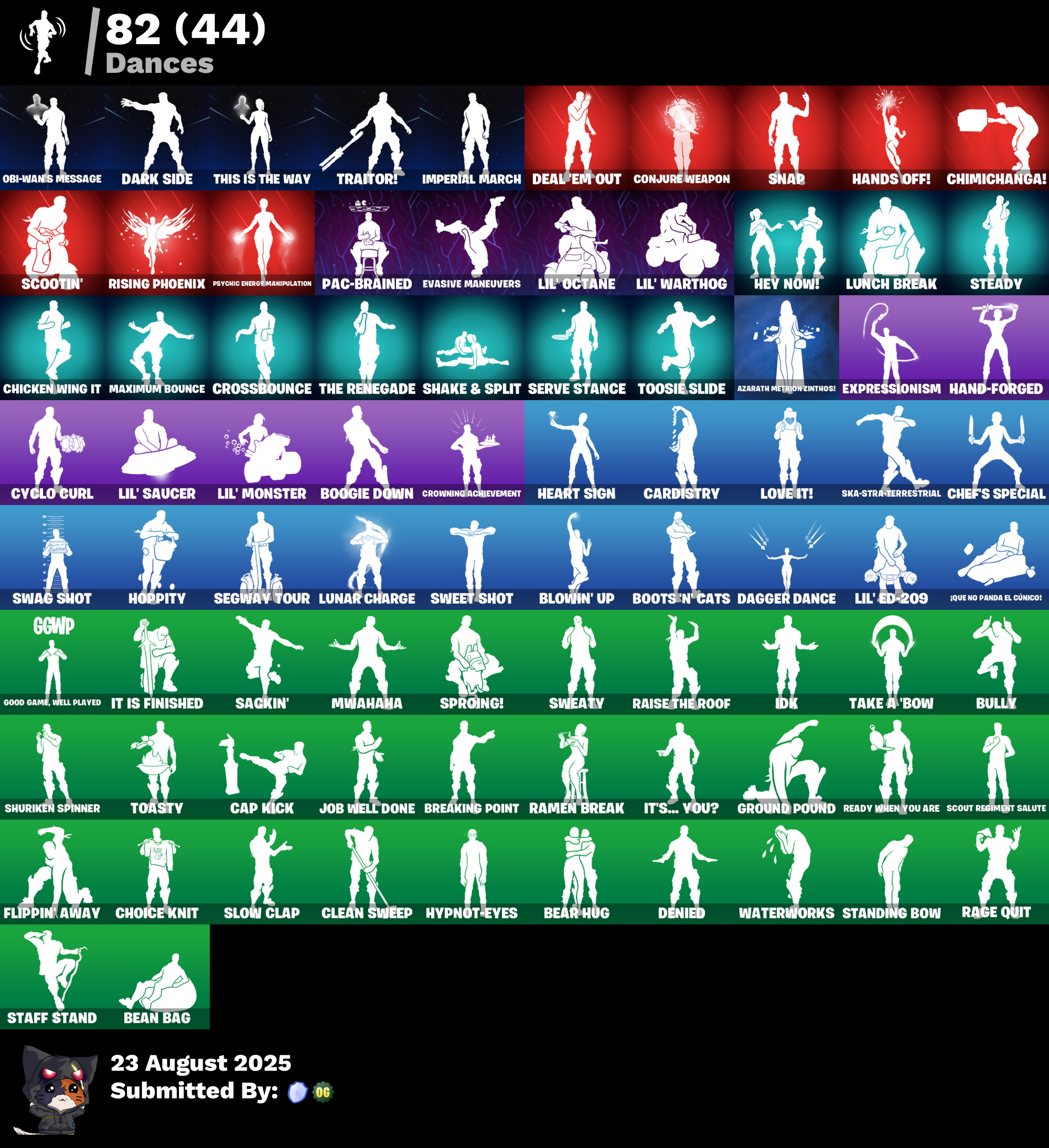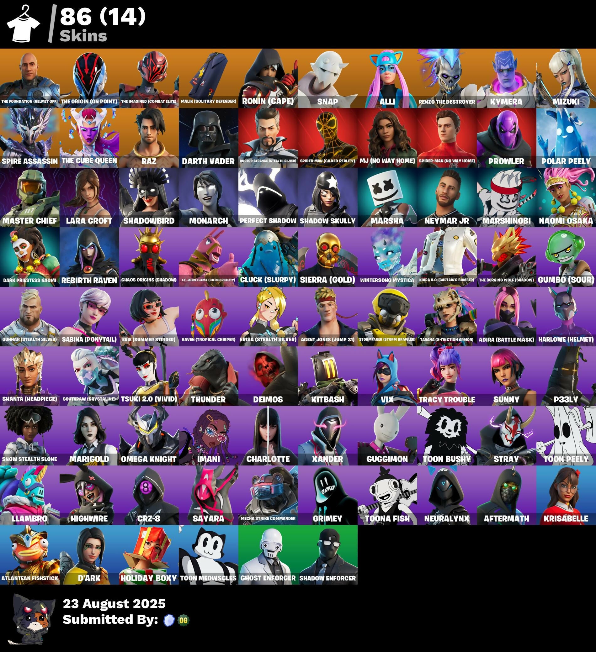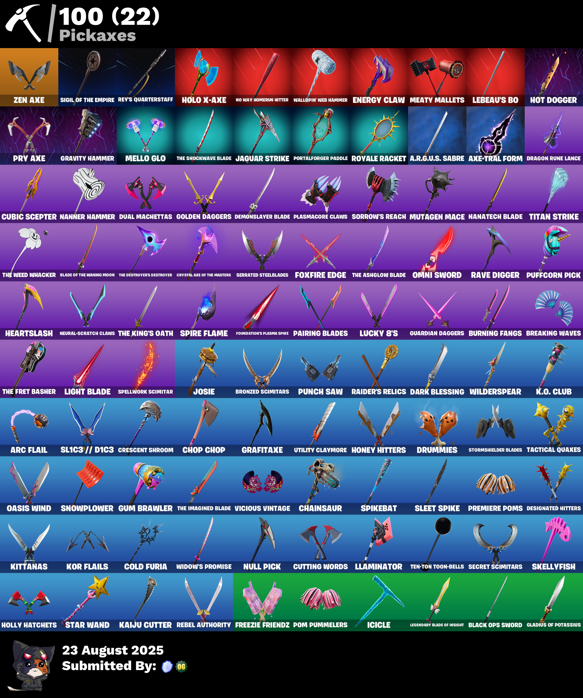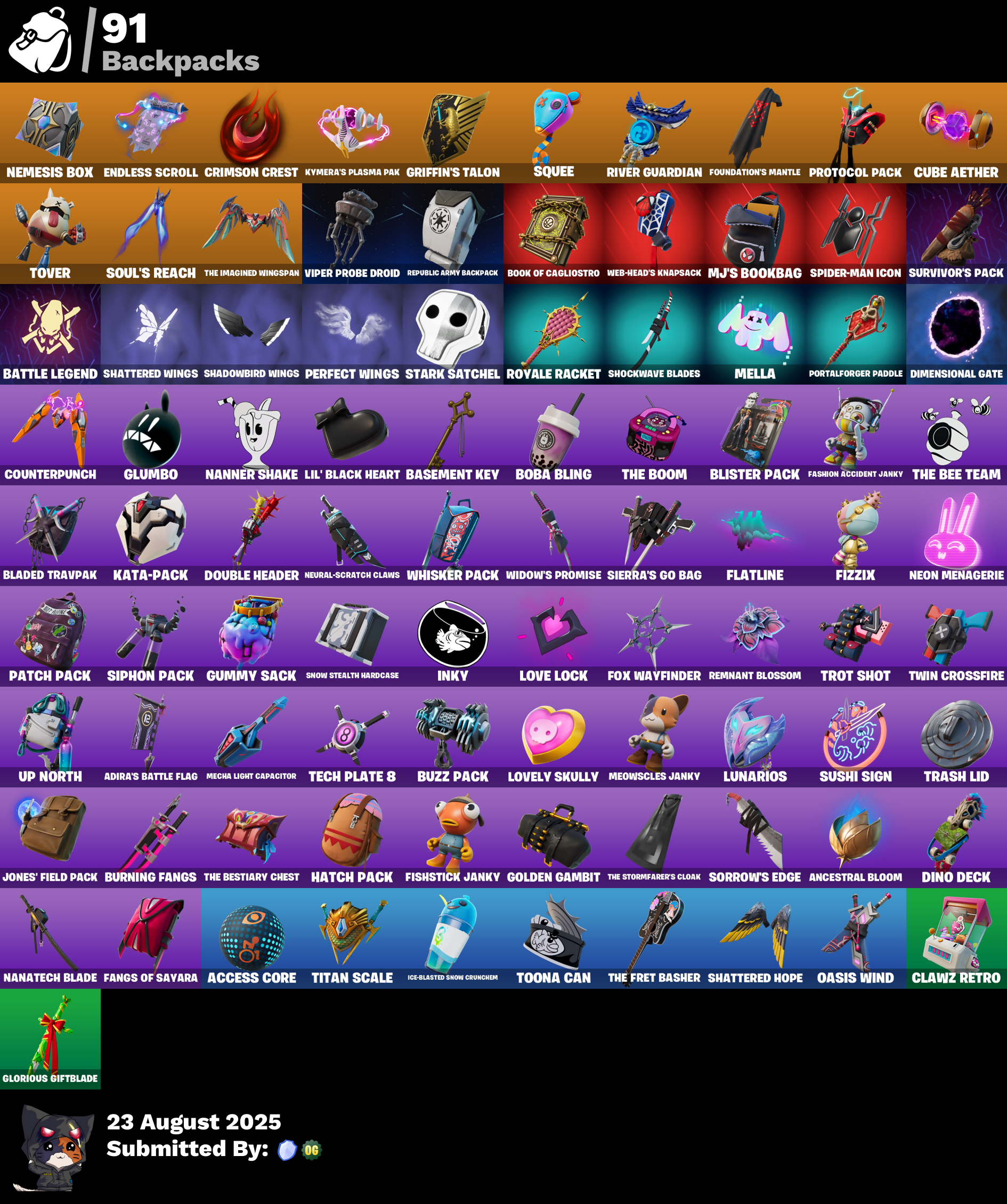 A.R.G.U.S. Sabre, Access Core, Adira (Battle Mask), Adira's Battle Flag, Aftermath, Agent Jones (Jump 31), Alli, Ancestral Bloom, Arc Flail, Articulated Blade Wing, Atlantean Fishstick, Axe-Tral Form, Azarath Metrion Zinthos!, Basement Key, Battle Bloom, Battle Legend, Bean Bag, Bear Hug, Black Ops Sword, Blade Of The Waning Moon, Bladed Travpak, Blister Pack, Blowin' Up, Boba Bling, Bone Patrol, Boogie Down, Book Of Cagliostro, Boots N' Cats, Bounty 'Brella, Breaking Point, Breaking Waves, Bronzed Scimitars, Bubloon, Bully, Burning Fangs, Buzz Pack, CRZ-8, Cacodemon, Cap Kick, Cardistry, Chain Surfer, Chainsaur, Chaos Origins (Shadow), Charlotte, Chef's Special, Chicken Wing It, Chimichanga!, Choice Knit, Chop Chop, Chop Dropper, Clawz Retro, Clean Sweep, Cluck (Slurpy), Cold Furia, Conjure Weapon, Counterpunch, Crescent Shroom, Crimson Crest, Crossbounce, Crowning Achievement, Crystal Axe Of The Masters, Cube Aether, Cubic Scepter, Cuddly Cloudcruiser, Cursed Hazeboard, Cutting Words, Cyclo Curl, D'Ark, Dagger Dance, Dark Blessing, Dark Priestess Naomi, Dark Side, Darth Vader, Deal 'Em Out, Deimos, Delivery Diver, Demonslayer Blade, Denied, Designated Hitters, Dimensional Gate, Dino Deck, Doctor Strange (Stealth Silver), Double Header, Dragacorn, Dragon Rider, Dragon Rune Lance, Drip Dropper, Drummies, Dual Machettas, Eggar, Enchanted Lifebloom, Endless Scroll, Energy Claw, Erisa (Stealth Silver), Evasive Maneuvers, Evie (Summer Strider), Expressionism, Fangs Of Sayara, Fashion Accident Janky, Fishstick Janky, Fizzix, Flapjack Flyer, Flatline, Flippin' Away, Foundation's Mantle, Foundation's Plasma Spike, Foundational 'Brella, Fox Wayfinder, Foxfire Edge, Freezie Friendz, GGWP, Ghost Enforcer, Gladius Of Potassius, Glorious Giftblade, Glumbo, Godslayer Glideboard, Golden Daggers, Golden Gambit, Golden Look Board, Good Game, Well Played, Grafitaxe, Gravity Hammer, Griffin's Talon, Grimey, Ground Pound, Guardian Daggers, Guggimon, Gum Brawler, Gumbo (Sour), Gummy Sack, Gunn-Brella, Gunnar (Stealth Silver), Hand-Forged, Hands Off!, Harlowe (Helmet), Hatch Pack, Haven (Tropical Chirper), Heart Sign, Heartslash, Hey Now!, Highwire, Holiday Boxy, Holly Hatchets, Holo X-Axe, Honey Hitters, Hoppity, Hot Dogger, Hypnot-Eyes, IDK, Ice-Blasted Snow Cruncher, Icicle, Imani, Imperial March, Inky, Invasion, It Is Finished, It's... You?, Jaguar Strike, Job Well Done, Jones' Field Pack, Josie, K.O. Club, K.O. Cruiser, Kaiju Cutter, Kal-El's Cape, Kata Tech Burstwing, Kata-Pack, Kiara K.O. (Captain's Bomber), Kitbash, Kittanas, Kor Flails, Krisabelle, Kymera, Kymera's Plasma Pak, Lambda-Class Shuttle, Lara Croft, Lebeau's Bo, Legendary Blade Of Insight, Light Blade, Lil' Black Heart, Lil' Ed-209, Lil' Monster, Lil' Octane, Lil' Saucer, Lil' Warthog, Llambro, Llaminator, Lost Meteor, Love It!, Love Lock, Lovely Skully, Lt. John Llama (Gilded Reality), Lucky 8's, Lunar Charge, Lunarios, Lunch Break, MJ (No Way Home), MJ's Bookbag, Malik (Solitary Defender), Mandala Disc, Marigold, Marsha, Marshinobi, Master Chief, Maximum Bounce, Meaty Mallets, Mecha Light Capacitor, Mecha Strike Commander, Mega-Brella, Mella, Mello Glo, Meowscles Janky, Mizuki, Monarch, Mutagen Mace, Mwahaha, Nanatech Blade, Nanner Hammer, Nanner Shake, Naomi Osaka, Needle Dropper, Nemesis Box, Neon Menagerie, Neural-Scratch Claws, Neuralynx, Neymar Jr, No Way Homerun Hitter, Null Pick, Oasis Wind, Obi-Wan's Message, Omega Knight, Omni Sword, P33ly, Pac-Brained, Pairing Blades, Patch Pack, Perfect Shadow, Perfect Wings, Plasma Core Claws, Polar Peely, Pom Pummelers, Portalforger Paddle, Premiere Poms, Propeller Perry, Protocol Pack, Prowler, Pry Axe, Psychic Energy Manipulation, Puffcorn Pick, Punch Saw, Rage Quit, Raider's Relics, Raise The Roof, Ramen Break, Rave Digger, Raz, Ready When You Are, Rebel Authority, Rebirth Raven, Remnant Blossom, Renzo The Destroyer, Republic Army Backpack, Rey's Quarterstaff, Rising Phoenix, River Guardian, Ronin (Cape), Royale Racket, S1L3C3 // D1C3, Sabina (Ponytail), Sackin', Salvaged Chute, Sayara, Scootin', Scout Regiment Salute, Secret Scimitars, Segway Tour, Serrated Steelblades, Serve Stance, Seven Signet, Shadow Enforcer, Shadow Skully, Shadowbird, Shadowbird Wings, Shake & Split, Shanta (Headpiece), Shattered Hope, Shattered Wings, Shockwave Blades, Shuriken Spinner, Sierra (Gold), Sierra's Go Bag, Sigil Of The Empire, Siphon Pack, Ska-Stra-Terrestrial, Skellyfish, Skull-A-Tron, Sky Prowler, Skycarver, Sleet Spike, Slow Clap, Snap, Snow Stealth Hardcase, Snow Stealth Slone, Snowplower, Soaring Cipher, Soaring Soul-Self, Sorrow's Edge, Sorrow's Reach, Soul's Reach, Southpaw (Crystalline), Sovereign Griffin, Spellwork Scimitar, Spider-Man (Gilded Reality), Spider-Man (No Way Home), Spider-Man Icon, Spikebat, Spire Assassin, Spire Fire, Spire Flame, Sproing!, Squee, Staff Stand, Standing Bow, Star Wand, Stark Satchel, Steady, Storm Crash, Stormcloud, Stormfarer (Storm Brawler), Stormshielder Blades, Stray, Suit Surfer, Sunny, Sunny's Lander, Survivor's Pack, Sushi Sign, Swag Shot, Sweaty, Sweet Shot, Tactical Quaxes, Take A 'Bow, Tarana (X-Tinction Armor), Tech Plate 8, Ten-Ton Toon-Bells, The Ashglow Blade, The Bee Team, The Bestiary Chest, The Blackbird, The Boom, The Burning Wolf (Shadow), The Cube Queen, The Destroyer's Destroyer, The Foundation (Helmet Off), The Fret Basher, The Imagined (Combat Elite), The Imagined Blade, The Imagined Wingspan, The King's Oath, The Origin (On Point), The Peerless Parasol, The Queen's Cloudcarriage, The Renegade, The Rocket Wing, The Shockwave Blade, The Soaring Crescent, The Stormfarer's Cloak, The Umbrella, The Weed Whacker, This Is The Way, Thunder, Titan Scale, Titan Strike, Toasty, Toon Bushy, Toon Meowscles, Toon Peely, Toona Can, Toona Fish, Toosie Slide, Tover, Tracy Trouble, Traitor!, Trash Lid, Trot Shot, Tsuki 2.0 (Vivid), Twin Crossfire, UNSC Pelican, Umbrella of the Last Reality, Unseen Airdrifter, Up North, Utility Claymore, Vicious Vintage, Vi