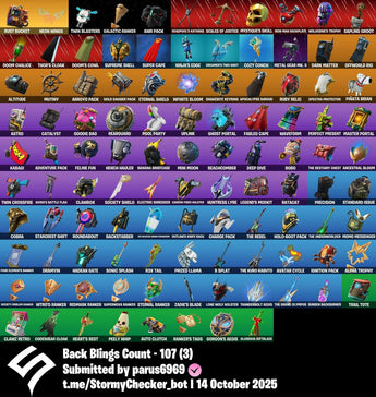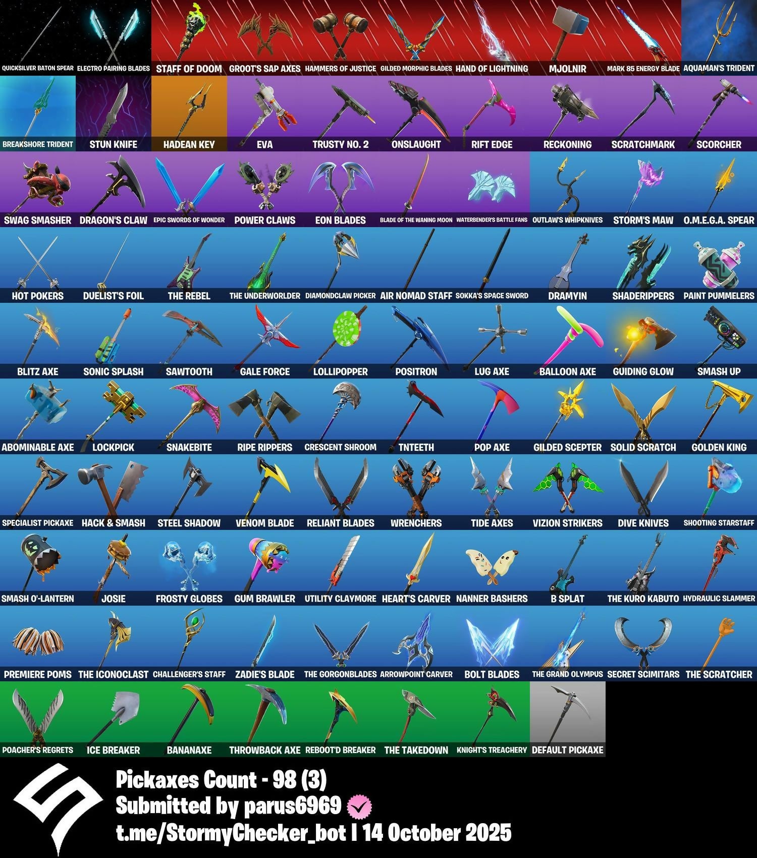 AWR Pack, Aang's Air Sphere, Abominable Axe, Adira's Battle Flag, Adventure Pack, Air Nomad Staff, Air Shredder, Alpha Trophy, Altitude, Ancestral Bloom, Apocalypse Shroud, Aquaman's Trident, Arrowpoint Carver, Arroyo Pack, Astro, Auto Clutch, Avatar Cycle, Avatar's Flourish, B Splat, Backstabber, Balloon Axe, Banana Briefcase, Bananaxe, Beachcomber, Beep Beep, Behold!, Best Mates, Blade of the Waning Moon, Blitz Axe, Bobo, Bold Stance, Bolt Blades, Boogie Down, Breakshore Trident, Bunsen Backburner, C'mere, Calculated, Call Me, Carbon Fiber Holster, Cat Flip, Catalyst, Challenger's Staff, Charge Pack, Clawbox, Clawz Retro, Cobra, Codeshear Cloak, Coin Flip, Conch Call, Conga, Cozy Conch, Crescent Shroom, Crowning Achievement, Dance Moves, Dark Matter, Deadpool's Katanas, Deep Dive, Default Pickaxe, Diamond Throne, Diamondclaw Picker, Dive Knives, Doom Chalice, Doom's Cowl, Double Up, Doze Dab, Dragon Stance, Dragon's Claw, Dramyin, Dreamer's Two-Shot, Duelist’s Foil, Electric Shredder, Electro Pairing Blades, Eon Blades, Epic Swords of Wonder, Eternal Ranker, Eternal Shield, Eva, Fabled Cape, Feline Fun, Flippin' Away, Foil Flex, Four Elements Banner, Frosty Globes, Galactic Ranker, Gale Force, Gentleman's Dab, Ghost Portal, Gilded Morphic Blades, Gilded Scepter, Glorious Giftblade, Gold Dagger Pack, Golden King, Golf Clap, Goodie Bag, Gorgon's Aegis, Groot's Sap Axes, Groove Jam, Ground Pound, Guiding Glow, Gum Brawler, Gun Show, Hack & Smash, Hadean Gate, Hadean Key, Hammers of Justice, Hand of Lightning, Have A Seat, Heart's Carver, Heart's Rest, Hello Friend, Hench Hauler, Holo-Boot Pack, Hot Pokers, Huntress Lyre, Hydraulic Slammer, Hype, I'm A Mystery, Ice Breaker, Ice-Blasted Snow Crunchem, Ignition Pack, Infinite Bloom, Iron Man Backplate, It's Go Time!, Josie, Kabag!, Keep It Mello, Keyed Up, Knight's Treachery, Laugh It Up, Legend's Modkit, Lockpick, Lollipopper, Lone Wolf Holster, Love It!, Lug Axe, Make A Seat, Mark 85 Energy Blade, Master Portal, Metal Gear Mk. II, Mic Drop, Mini Moon, Mjolnir, Momo Messenger, Moonlit Mystery, Mutiny, My Cabbages!, Mystique's Skull, Nana Nana, Nanner Bashers, Neon Wings, Ninja Stance: Leo, Ninja Style, Ninja's Edge, Nitro'd Ranker, O.M.E.G.A. Spear, Offworld Rig, Onslaught, Orange Justice, Outlaw's Knife Rack, Outlaw's Whipknives, Paint Pummeliers, Pandemonium, Paws & Claws, Peace Out, Peely Whip, Perfect Present, Piñata Brian, Planetary Vibe, Poacher's Regrets, Pony Up, Pool Party, Pop Axe, Popcorn, Positron, Power Claws, Precision, Premiere Poms, Prized Llama, Quicksilver Baton Spear, R3X Tail, Raise The Roof, Ranker's Tags, Ratacat, Raven's Legion, Rearguard, Reboot'd Breaker, Reckoning, Redmask Ranker, Regal Wave, Reliant Blades, Respect, Revel, Ride The Pony, Rift Edge, Ripe Rippers, Rock Paper Scissors, Rocket Rodeo, Roundabout, Ruby Relic, Running Man, Rust Bucket, Salute, Sapling Groot, Sawtooth, Scales Of Justice, Scorcher, Scratchmark, Secret Scimitars, Serpentine Summoning, Shadebox, Shaderippers, Shimmer, Shooting Starstaff, Side Hustle, Sing Along, Smash O'-Lantern, Smash Up, Snakebite, Snakebite Keyring, Snoozefest, So Square, Society Emblem Ranker, Society Shield, Sokka's Space Sword, Solid Scratch, Sonic Splash, Specialist Pickaxe, Spectra Protector, Springy, Staff of Doom, Standard Issue, Starcrest Shift, Steamed, Steel Shadow, Storm's Maw, Stormy, Stun Knife, Super Cape, Supernova Ranker, Supreme Shell, Swag Smasher, Sweet Swing, Swipe It, Take The Cake, Take The Elf, Take The L, Tempest Flight, The Bestiary Chest, The Gorgonblades, The Grand Olympus, The Iconoclast, The Kuro Kabuto, The Rebel, The Robot, The Scratcher, The Takedown, The Underworlder, Thor's Cloak, Throwback Axe, Thunderbolt Aegis, Tide Axes, Tippy Tap, Tnteeth, Trail Tote, True Love, Trusty No. 2, Twin Blasters, Twin Crossfire, Uplink, Utility Claymore, Venom Blade, Verve, Vizion Strikers, Wakandan Salute, Waterbender's Battle Fans, Waterworks, Wave, Waveform, Wolverine's Trophy, Wrenchers, You're Awesome, Zadie's Blade