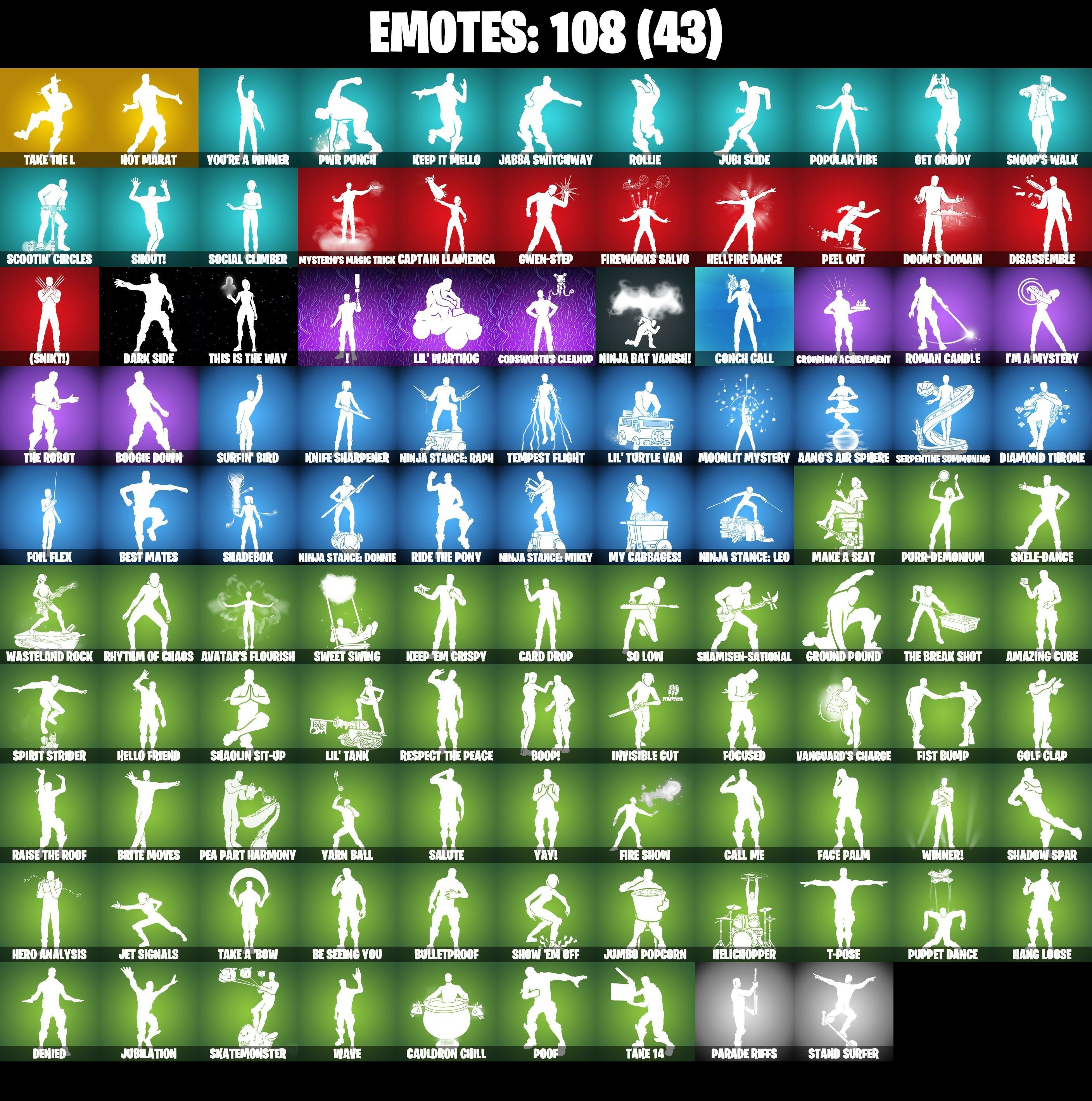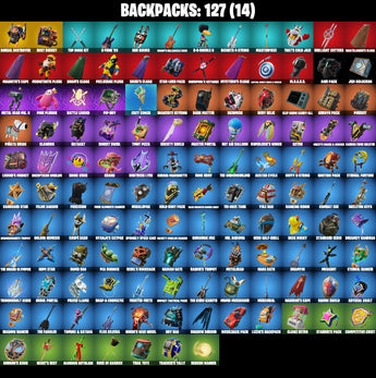 (Snikt!), 1-Ball, 18's Kama, 999 Knives, AWR Pack, Aang, Aang's Air Sphere, Abyssal Vault, Aerial Assault Bomber, Air Nomad Staff, Alto, Amazing Cube, Anakin Skywalker, Andy Fangerson, Aphrodite, Ares, Arrowpoint Carver, Arroyo Pack, Artemis, Assaultron Blade, Astro, Avatar Cycle, Avatar State Aang, Avatar's Flourish, Back-Mounted Bombs Away, Basic Basher, Battle Legend, Battlebus, Baymax Wings, Be Seeing You, Bedside Nanner, Best Mates, Bichota 4-String, Bitey, Blades of Light, Blue Squire, Bolt Blades, Bomb Bag, Bomb Bouquet, Bone Brief, Boogie Down, Boop!, Bot Air Balloon, Breakshore Trident, Brilliant Cutters, Brite Agent, Brite Moves, Brite Raider, Bulletproof, Bullseye, Bumblebee, Bumblebee's Wings, Cake Clobberer, Call Me, Captain Jones, Captain Jones's Shield & Pickaxe, Captain Llamerica, Captain's Glider, Carbon, Carbon Fiber Holster, Card Drop, Cauldron Chill, Cerberus, Cerberus (Balang Red Cerberus), Chaos Director, Chaos Director (Chaos Director), Chaotic Crawler, Clang & Basher, Clara, Classified, Clawbox, Clawz Retro, Cliffside Soarer, Clip Show Carry-All, Codsworth's Cleanup, Combat Cue, Competitive Crest, Conch Call, Contract Giller, Coupe Sashi, Cozy Conch, Crimson Scythe, Crowning Achievement, Cursed Marionette, D-O-Double G, Daigo, Daigo's Claws, Dark Doggo, Dark Matter, Dark Side, Dark Voyager, Decepticon Emblem, Deck Ducky, Denied, Diamond Throne, Diamondclaw Picker, Dieselback Pack, Disassemble, Dogg Treat, Don's Dominator, Doom, Doom (Pandora's Armor Doom), Doom Brella, Doom's Cloak, Doom's Domain, Dorsal Destroyer, Double-Barreled Boom Ballasts, Downpour, Dramyin, Dreamzy Handbag, Drome Drifter, Dromerunner's Trophy, Dry Bag, Duelist's Foil, Dynamo Tntina, Dynamo Tntina (Dynamo Tntina-1), Elite Agent, Elite Servo, Ember Pick, Emma Frost, Energon Mace, Epic Blade of Floof, Equalizer, Eternal Fortune, Eternal Ranker, Eva, Face Palm, Felina, Felina's Claw, Feline Dagger, Fiendish Wand, Fire Show, Fireworks Salvo, Fist Bump, Fist of Doom, Flux Silvera, Focused, Foil Flex, Founder's Glider, Founder's Umbrella, Four Elements Banner, Frosted Frets, G-Funk '93, Get Griddy, Ghoul Portal, Gilded Naginata, Gilded Pinscher, Glider, Glorious Giftblade, Golden Nemesis, Golden Scythe, Golf Clap, Gorgon's Aegis, Gorgonik Mic, Grand Glacier Glider, Gravity Hammer, Grit, Ground Pound, Guffy 6-String, Guffy G-String, Gwen-Step, Gwenpool, Gwenpool's Katanas, Hadean Chariot, Hadean Gate, Hadean Key, Hades, Handheld Missile, Hang Loose, Heart's Carver, Heart's Rest, Heartwinder, Helichopper, Hellfire Dance, Hello Friend, Hero Analysis, Hero Baymax, Hero Baymax (Samurai Baymax), Hero Half-Shell, High Octane, High Society Glider, Holiday Boxy, Holo-Boot Pack, Holographic, Hope, Hope Star, Horde's War Wheel, Hot Marat, Humbug Slicer, Huntress Lyre, Hydraulic Slammer, I'm A Mystery, Ignition Pack, Illusionist's Blades, Immortal War Doru, Impact Tactical Pack, Inferno, Invisible Cut, Jabba Switchway, Jade, Jedi Holocron, Jet Signals, Jubi Slide, Jubilation, Jumbo Popcorn, Junker 'Brella, Keep 'Em Crispy, Keep It Mello, Kendo, Knife Sharpener, Korra, Korra (Balanced), Korra's Air Glider, Krang, Kyran Aryk, LBC '93 Dogg, Lady Of Cranes, Legend's Modkit, Lil' Turtle Van, Lil' Warthog, Lit Tank, Lizzik, Lizzik's Hackpack, M.O.A.B.B., Magnetic Steps, Magnetized Scrap, Magneto's Cape, Make A Seat, Mask of Balance, Master Chief (Matt Black), Master Portal, Masterpiece, Mean Streak, Medusa, Megabot, Megalo Don, Megalo Don (Outto Outrag Megalo Don), Megalopak, Megatron, Meowdas, Meowtooth Plush, Mercurial, Metal Gear Mk. II, Metalhead, Michelangelo, Microbot Mallet, Mighty Marvel 'Brella, Mikey's Board & Chucks, Mikey's Nunchucks, Mission Specialist, Mobile Megalodon, Momo Messenger, Montague, Montague (Rough Cut Montague), Moonbow Breezer, Moonlit Mystery, Moonwalker, Mr. Daruma, My Cabbages!, Mysterio, Mysterio's Cloak, Mysterio's Magic Trick, Nana Bath, Nanamantium Claws, Neko Claws, Neon Reaver, Night Kama, Ninja Bat Vanish!, Ninja Stance: Donnie, Ninja Stance: Leo, Ninja Stance: Mikey, Ninja Stance: Raph, Nisha, Nomad's Drifter, Nyanja, Nyanja (Lucky Nyanja), Nyanja's Catpak, Ol' Woody, Oscar, Oscar (Smock Breaker Oscar), Palm Leaf, Paper Parasol, Parade Riffs, Pea Buddies, Pea Part Harmony, Pea-Rigibles, Peabody, Peabody (Slurp Peabody), Peel Out, Peelverine, Peelverine (Classic Peelverine), Peelverine Plush, Peelverine Wings, Peppermint Paraglider, Perfect Pivot, Peter Griffin, Peter Griffin (Party Peter), Petercopter, Pick Axle, Pig-Gwen Scooter, Pinata Brian, Pink Plushie, Pip-Boy, Poacher's Regrets, Poof, Popular Vibe, Poseidon, Poseidon (Pagratic Poseidon), Precision, Precision Pointe, Prized Llama, Protector Kaito, Psycho Bandit, Psycho Buzz Axes, Pulse Axe, Puppet Dance, Puppet's Prowl, Purr-Demonium, Pursuit, Pwr Punch, Raider's Trophy, Rainbow Rider, Raise The Roof, Ranking Ronin, Ratacat, Ratacat Roamer, Raven Team Syd, Rebel Brella, Rebel's Rucksack, Reboot'd Breaker, Remix 'Brella, Renegade Raider, Renegade Reaver, Renegade Rebel, Renegade Rebel (Renegade Racer), Renegade Rider, Respect The Peace, Reverie, Reverie's Dreamstaff, Rhythm Of Chaos, Ride The Pony, Ringmaster Scarr, Rocket Wrecker, Rollie, Roman Candle, Rose Glow, Rose Of Avarice, Rose Rider, Rose Team Leader, Rose Thorns, Royale Rider, Ruby Relic, Rust, Rust (Oxide Rust), Rust Bucket, Rust Lord, Salute, Santa Dogg, Sawtooth, Scarlet Longboard, Scootin' Circles, Sea Chariot, Secret Scimitars, Serpentine Summoning, Shadebox, Shaderippers, Shadow Blade Hope, Shadow Ranker, Shadow Shroud, Shadow Spar, Shadow's Bite, Shamisen-Sational, Shaolin Sit-Up, Shooting Starstaff, Short's Cloak, Shout!, Show 'Em Off, Shuri, Shuri's Skywings, Skatemonster, Skele-Dance, Skeleglider, Skeleton Keys, Skelleshark, Skirmish, Skull Commander, Slayer Juice Wrld, Slider, Snakebite Keyring, Snap-A-Zoomatic, Snoop's Holladizzle Bass, Snoop's Walk, Snowfall, Snowglobe Smasher, So Low, Social Climber, Society Emblem Ranker, Society Shield, Solid Sn