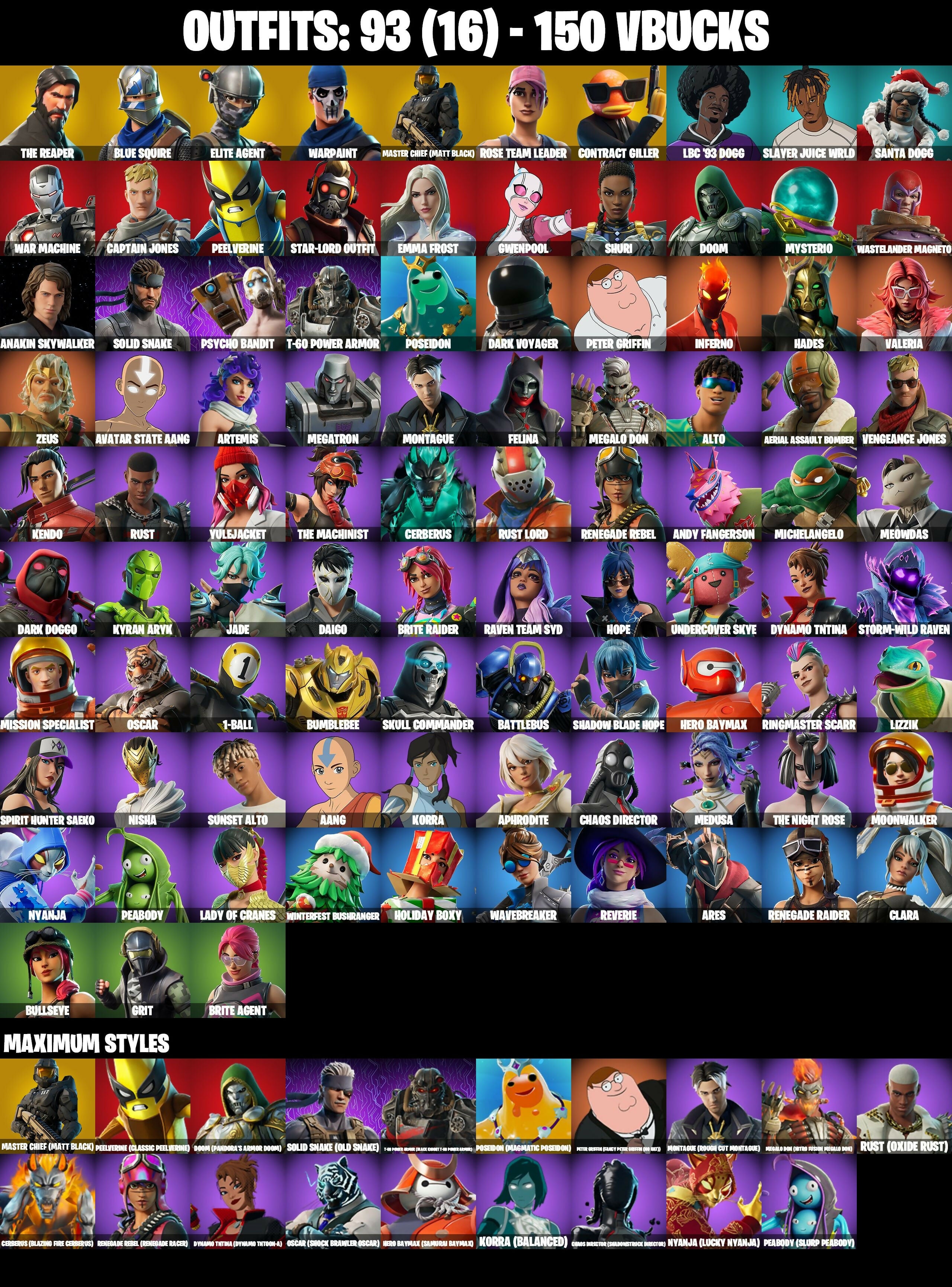 93 Skins | Blue Squire , The Reaper , Hot Marat , OG STW , Master Chief (Matt Black) | 150 VBucks | [PC/PSN/XBOX/NINTENDO]