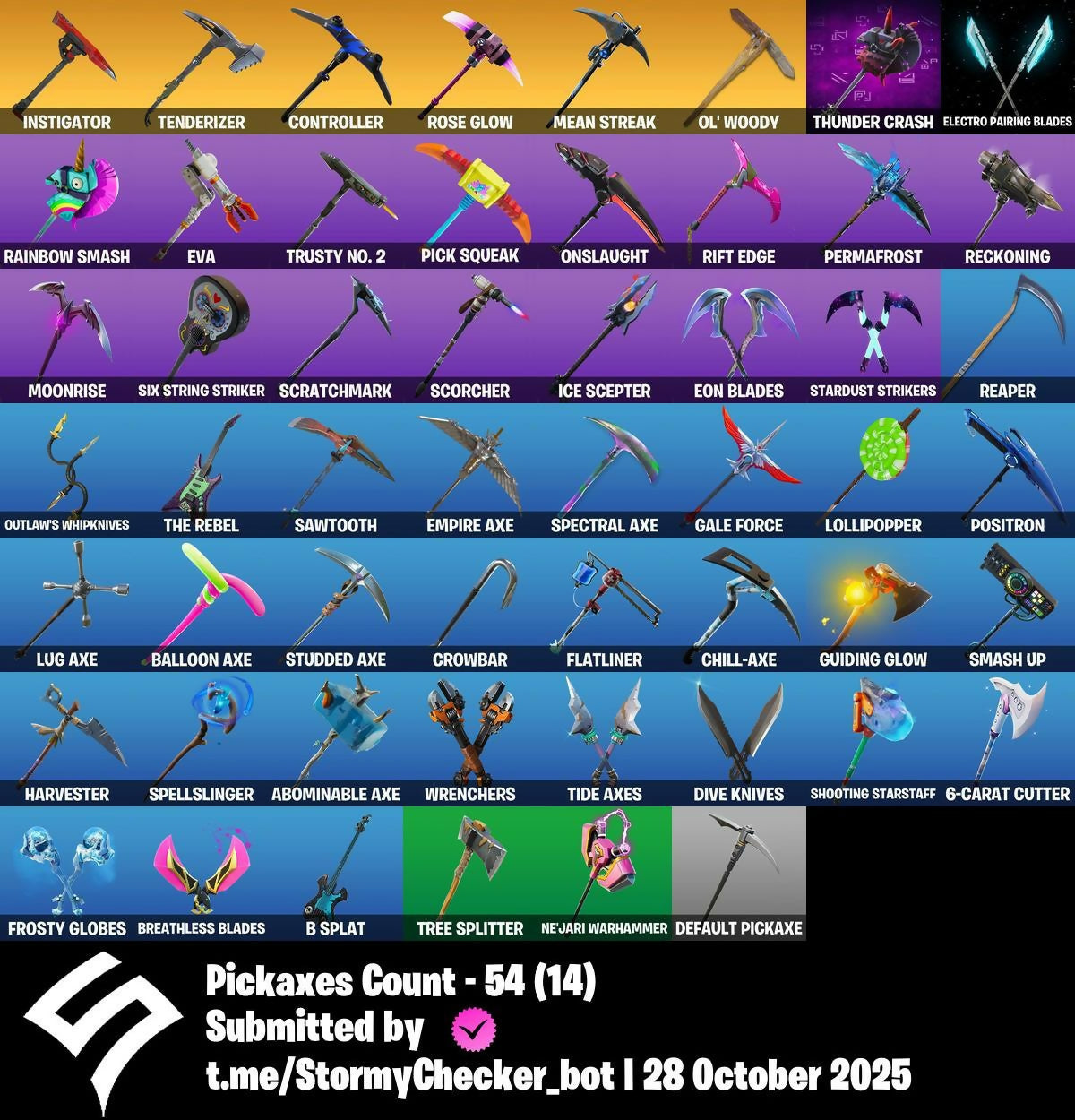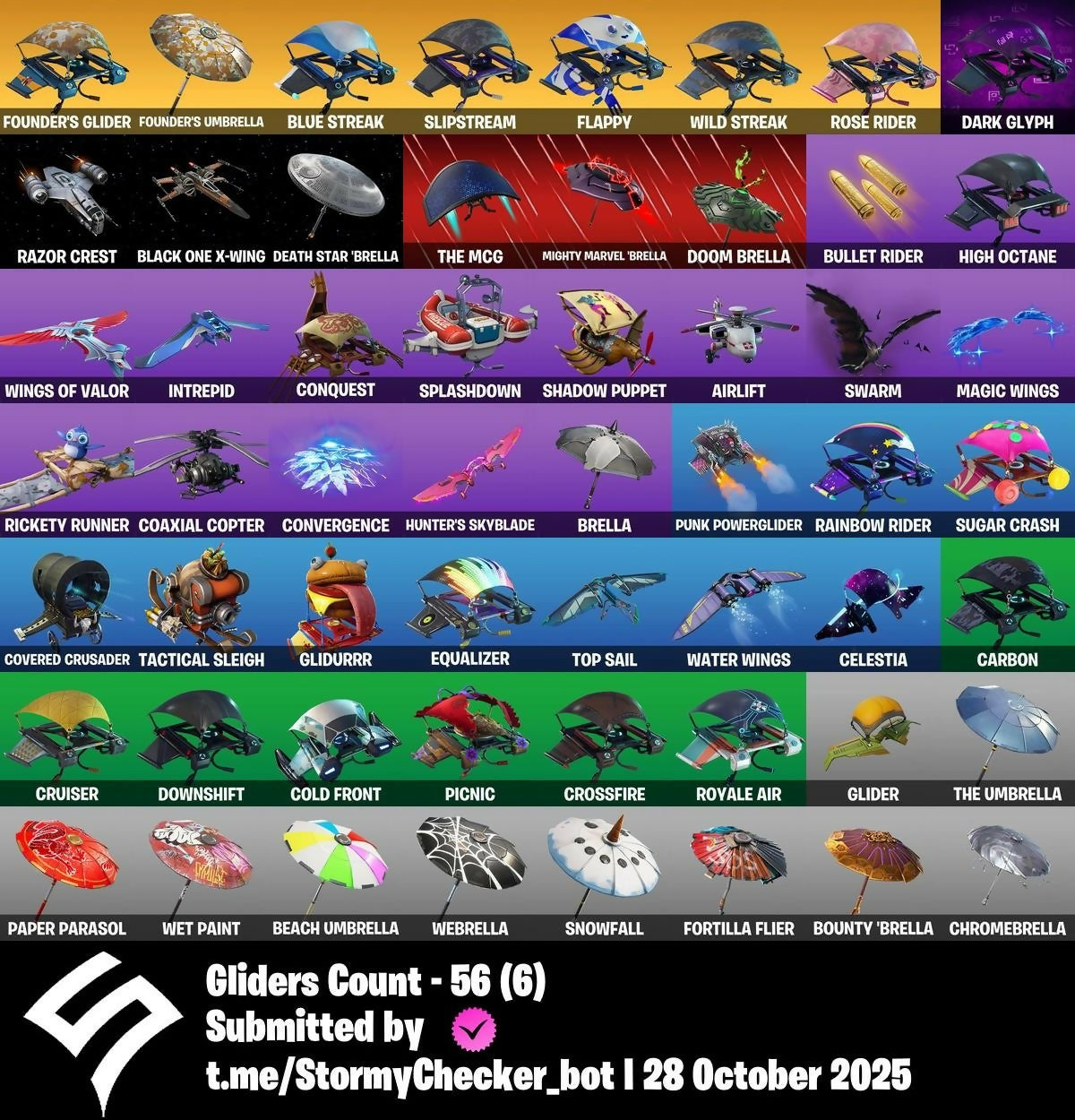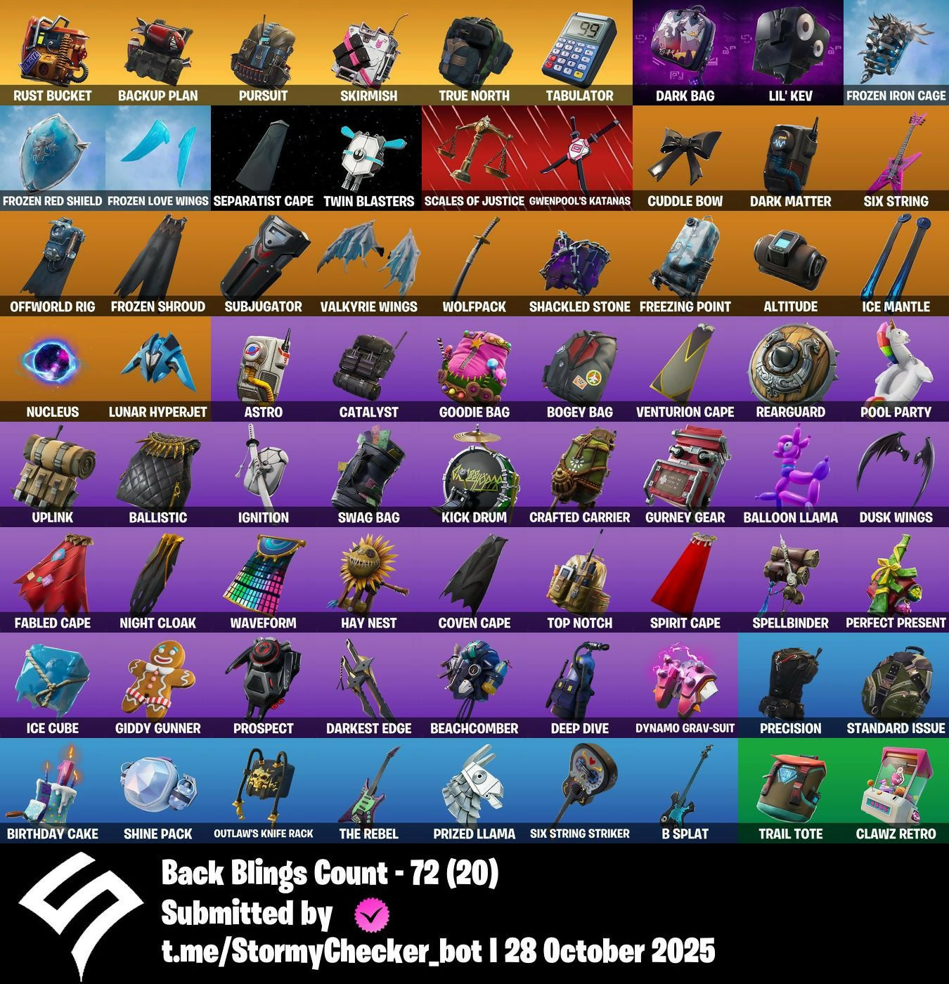 6-Carat Cutter, Abominable Axe, Agent Jones, Air Shredder, Airlift, Altitude, Arctic Assassin, Artifact, Astro, B Splat, Backup Plan, Ballistic, Balloon Axe, Balloon Llama, Battlehawk, Beach Umbrella, Beachcomber, Best Mates, Birthday Cake, Black One, Blue Streak, Blue Team Leader, Bobbin', Bogey Bag, Boneless, Boomin', Bounty 'Brella, Brainiac, Breakdown, Breakin', Breathless Blades, Brella, Brilliant Striker, Bring It, Brite Bomber, Bullet Rider, Bullseye, Calamity, Calculated, Call Me, Capoeira, Carbide, Carbon, Castor, Cat Flip, Catalyst, Celestia, Chill-Axe, Chromebrella, Clawz Retro, Cloaked Star, Coaxial Copter, Cold Front, Commando, Conquest, Controller, Convergence, Coven Cape, Covered Crusader, Crackdown, Crafted Carrier, Criss Cross, Crossfire, Crowbar, Cruiser, Cuddle Bow, Cuddle Team Leader, DJ Yonder, Dance Moves, Dante, Dark Bag, Dark Bomber, Dark Glyph, Dark Matter, Dark Voyager, Darkest Edge, Deadfire, Death Star 'Brella, Deep Dive, Default Pickaxe, Diamond Diva, Dire, Disco Fever, Dive Knives, Doom Brella, Downshift, Drift, Dusk, Dusk Wings, Dynamo Grav-Suit, Eagle, Electro Pairing Blades, Electro Swing, Elite Agent, Empire Axe, Enforcer, Eon Blades, Equalizer, Eva, Fable, Fabled Cape, Fade, Fancy Feet, Field Surgeon, Finesse Finisher, Flamenco, Flappy, Flatliner, Flippin' Away, Fortilla Flier, Fortune, Founder's Glider, Founder's Umbrella, Free Flow, Freestylin', Freezing Point, Frostbite, Frosty Globes, Frozen Iron Cage, Frozen Love Ranger, Frozen Love Wings, Frozen Raven, Frozen Red Knight, Frozen Red Shield, Frozen Shroud, Galaxy Scout, Gale Force, Gentleman's Dab, Get Funky, Giddy Gunner, Giddy-Up, Ginger Gunner, Glider, Glidurrr, Golf Clap, Goodie Bag, Groove Jam, Guiding Glow, Gurney Gear, Gwenpool's Katanas, Hacivat, Hand Signals, Harvester, Havoc, Hay Man, Hay Nest, High Octane, Highrise Assault Trooper, Hitchhiker, Howl, Hunter's Skyblade, Huntress, Hype, Ice Cube, Ice Mantle, Ice Scepter, Idk, Ignition, Instigator, Intensity, Intrepid, It's Go Time!, Jubilation, Jugglin', Jules, Jungle Scout, Kick Drum, Kiss Kiss, Lil' Kev, Living Large, Llama Bell, Lollipopper, Lug Axe, Lunar Hyperjet, Lynx, Magic Wings, Mandalorian, Marsh Walk, Marshmello, Mean Streak, Mic Drop, Mighty Marvel 'Brella, Mission Specialist, Moniker, Moonrise, Moonwalker, My Idol!, Ne'Jari Warhammer, Night Cloak, Nightshade, Nite Nite, Nog Ops, Nucleus, Ocean, Offworld Rig, Ol' Woody, Omega, Onesie, Onslaught, Orange Justice, Outlaw's Knife Rack, Outlaw's Whipknives, Paper Parasol, Perfect Present, Permafrost, Pick Squeak, Picnic, Pizza, Point It Out, Pool Party, Popcorn, Positron, Powder, Power Chord, Precision, Predator, Prized Llama, Prodigy, Prospect, Punk Powerglider, Pursuit, Ragnarok, Rainbow Rider, Rainbow Smash, Rawr, Razor Crest, Reaper, Rearguard, Reckoning, Redline, Reese, Regal Wave, Respect, Rickety Runner, Ride The Pony, Rift Edge, Rock Out, Rock Paper Scissors, Rocket Rodeo, Rogue Agent, Rook, Rose Glow, Rose Rider, Rose Team Leader, Royale Air, Running Man, Rust Bucket, Rust Lord, Salute, Sanctum, Save The World, Sawtooth, Scales Of Justice, Scorcher, Scorpion, Scratchmark, Scuba Jonesy, Separatist Cape, Sgt. Winter, Shackled Stone, Shade, Shadow Ops, Shadow Puppet, Shimmer, Shine Pack, Shooting Starstaff, Six String, Six String Striker, Skirmish, Sledgehammer, Slipstream, Slitherin', Slow Clap, Smash Up, Snorkel Ops, Snowfall, So Square, Spectral Axe, Spellbinder, Spellslinger, Spirit Cape, Splashdown, Squad Leader, Stage Slayer, Standard Issue, Stardust Strikers, Studded Axe, Sub Commander, Subjugator, Sugar Crash, Summit Striker, Sun Strider, Survival Specialist, Swag Bag, Swarm, Swipe It, T-Pose, Tabulator, Tactical Sleigh, Take The L, Teknique, Tenderizer, The Ace, The Ice King, The Mcg, The Reaper, The Rebel, The Robot, The Umbrella, The Visitor, Thunder Crash, Tide Axes, Top Notch, Top Sail, Trail Tote, Trailblazer, Tree Splitter, Trog, True Heart, True Love, True North, Trusty No. 2, Twin Blasters, Uplink, Valkyrie, Valkyrie Wings, Valor, Venturion, Venturion Cape, Verve, Vivacious, Warpaint, Water Wings, Waterworks, Wave, Waveform, Webrella, Wet Paint, Whiteout, Wiggle, Wild Streak, Wingman, Wings of Valor, Wolfpack, Wrenchers, X-Wing, You're Awesome, Zenith, Zoey