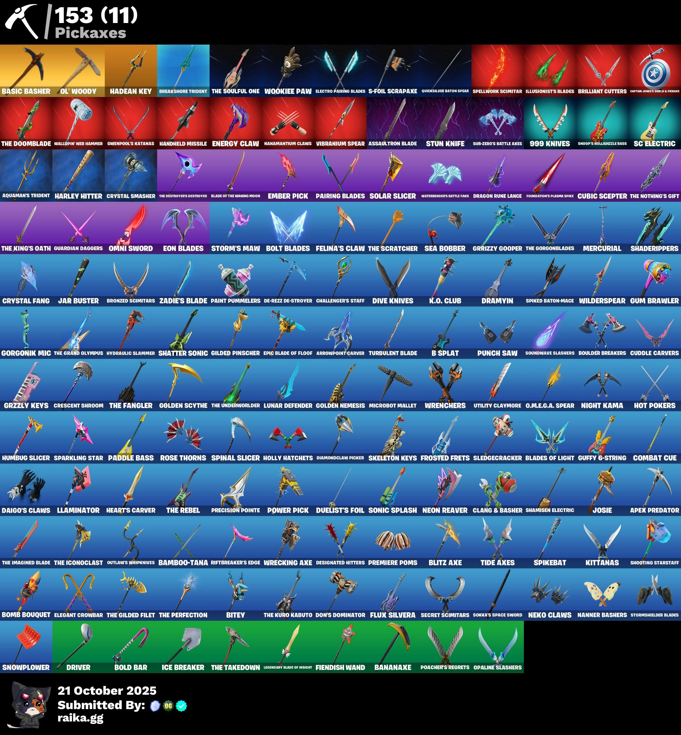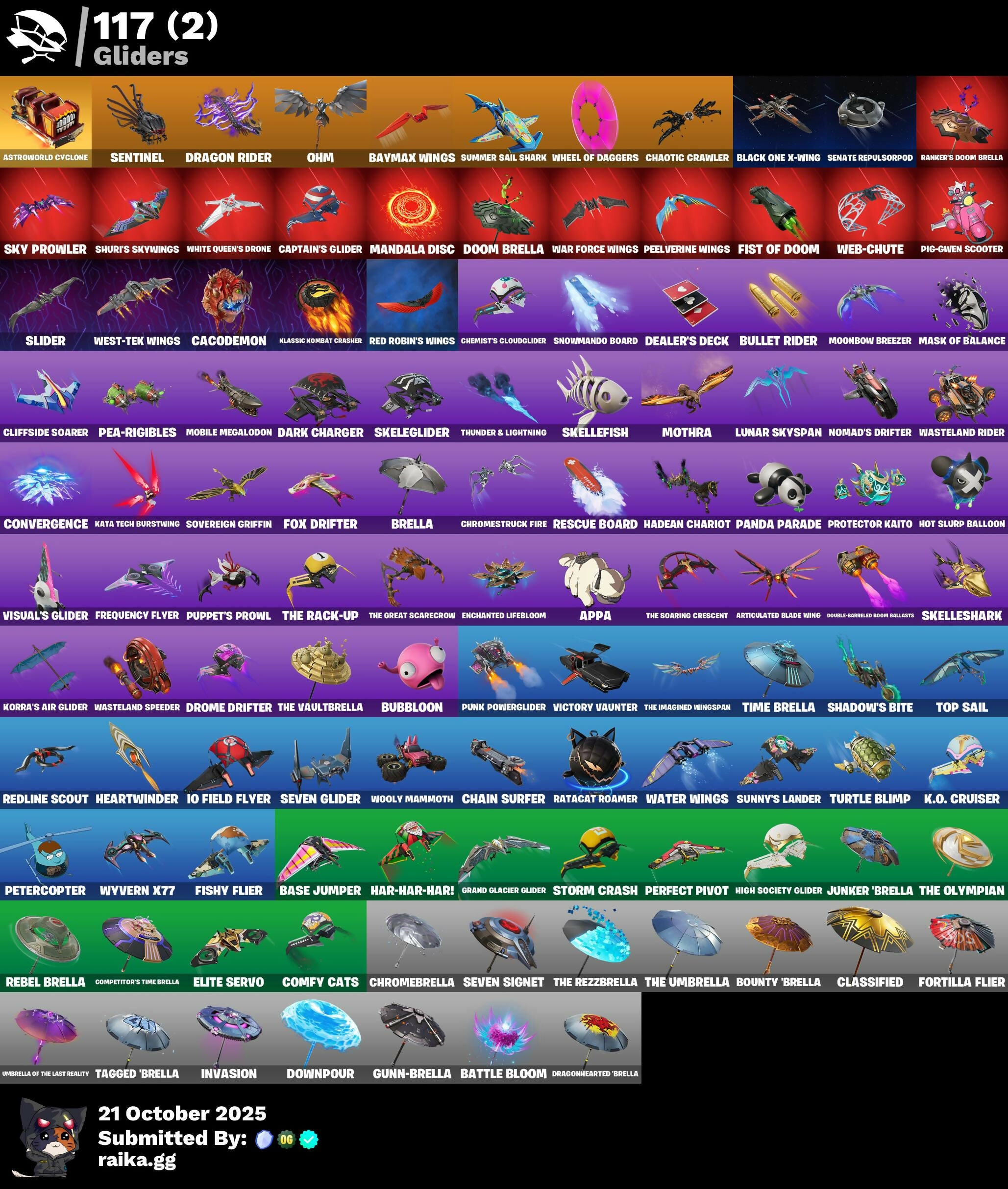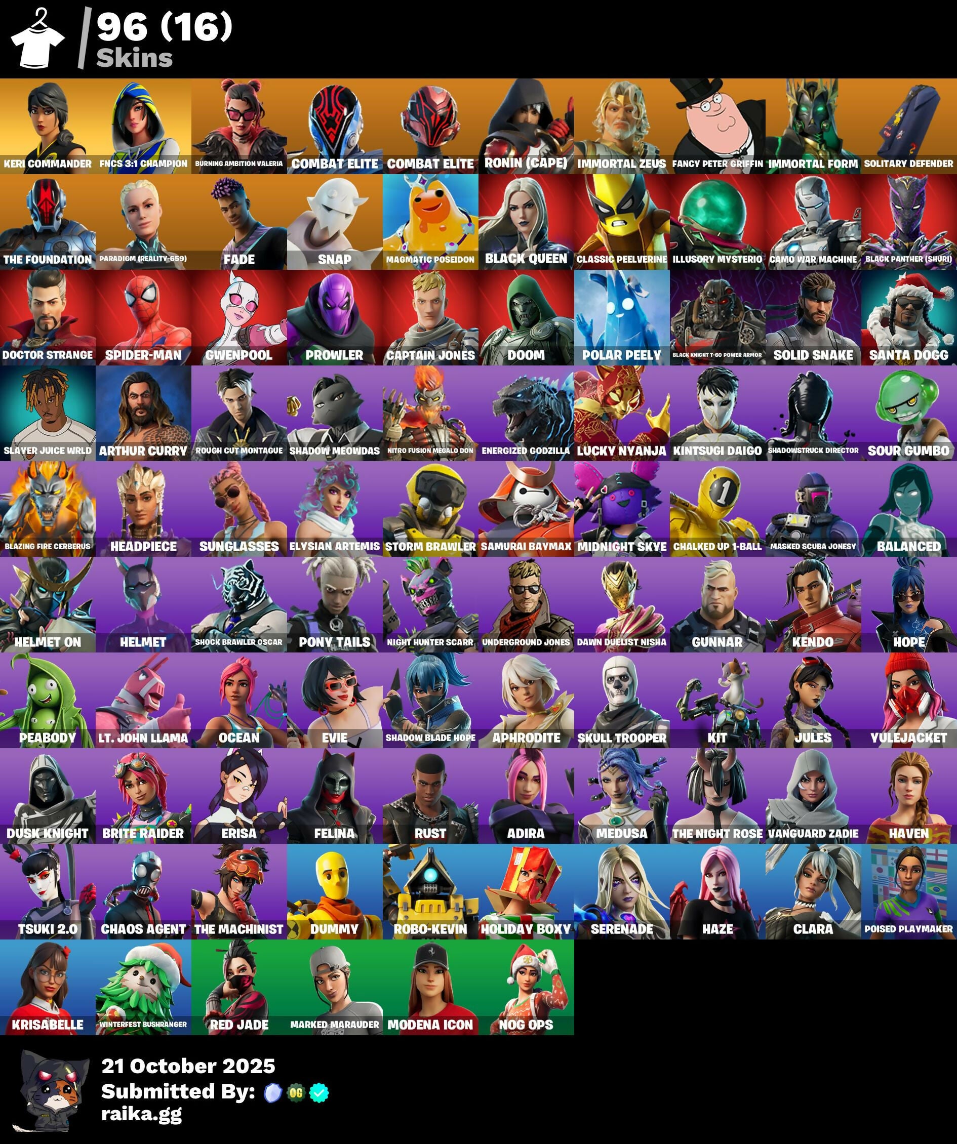 Outfits: Keri Commander | FNCS 3:1 Champion | Burning Ambition Valeria | Combat Elite | Combat Elite | Ronin (Cape) | Immortal Zeus | Fancy Peter Griffin | Immortal Form | Solitary Defender | The Foundation | Paradigm (Reality-659) | Fade | Snap | Magmatic Poseidon | Black Queen | Classic Peelverine | Illusory Mysterio | Camo War Machine | Black Panther (Shuri) | Doctor Strange | Spider-Man | Gwenpool | Prowler | Captain Jones | Doom | Polar Peely | Black Knight T-60 Power Armor | Solid Snake | Santa Dogg | Slayer Juice WRLD | ARTHUR CURRY | Rough Cut Montague | SHADOW Meowdas | Nitro Fusion Megalo Don | Energized Godzilla | Lucky Nyanja | Kintsugi Daigo | Shadowstruck Director | Sour Gumbo | Blazing Fire Cerberus | headpiece | sunglasses | Elysian Artemis | Storm Brawler | Samurai Baymax | Midnight Skye | Chalked Up 1-Ball | MASKED SCUBA JONESY | Balanced | helmet on | helmet | Shock Brawler Oscar | Pony Tails | Night Hunter Scarr | Underground Jones | Dawn Duelist Nisha | Gunnar |