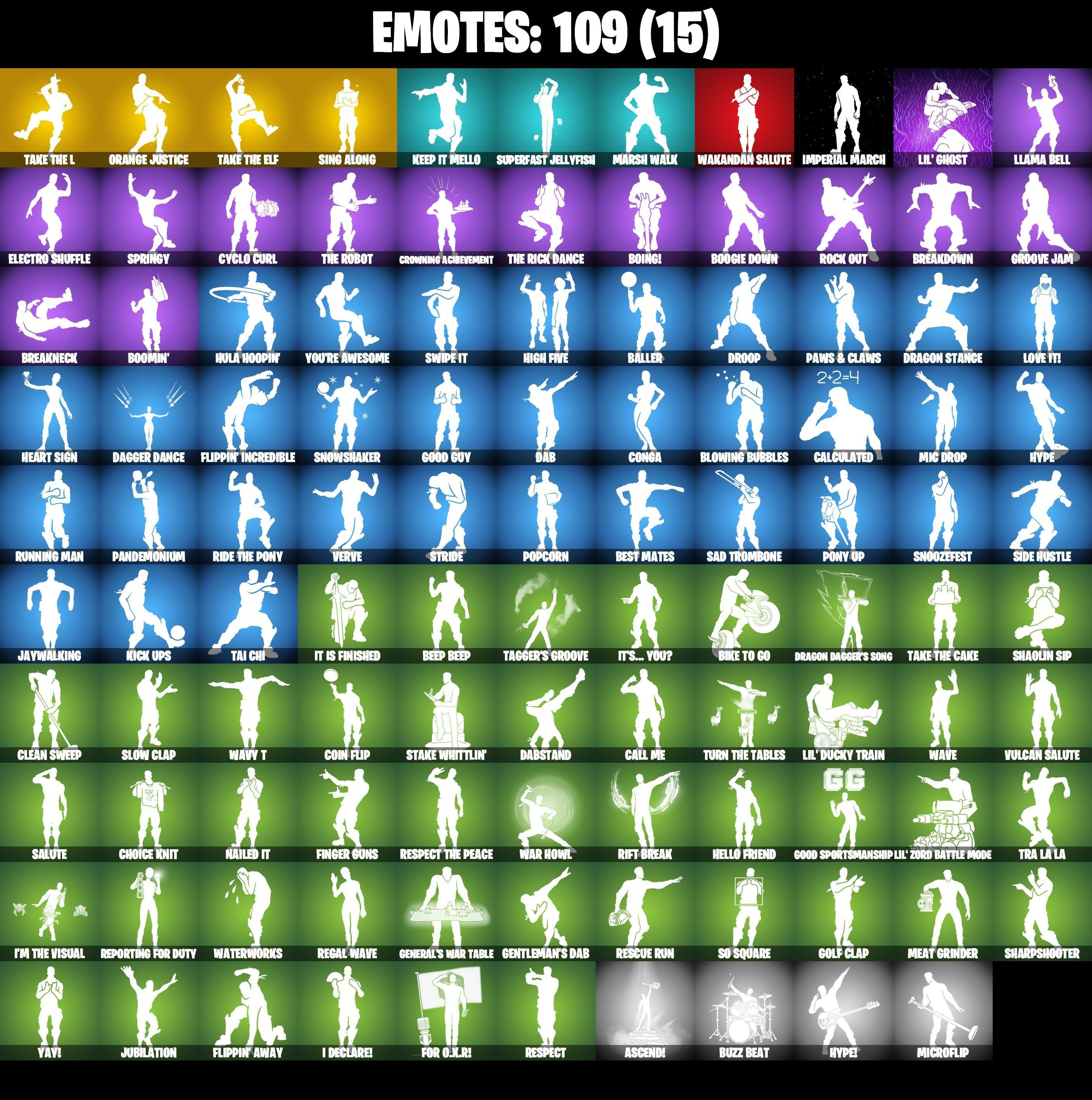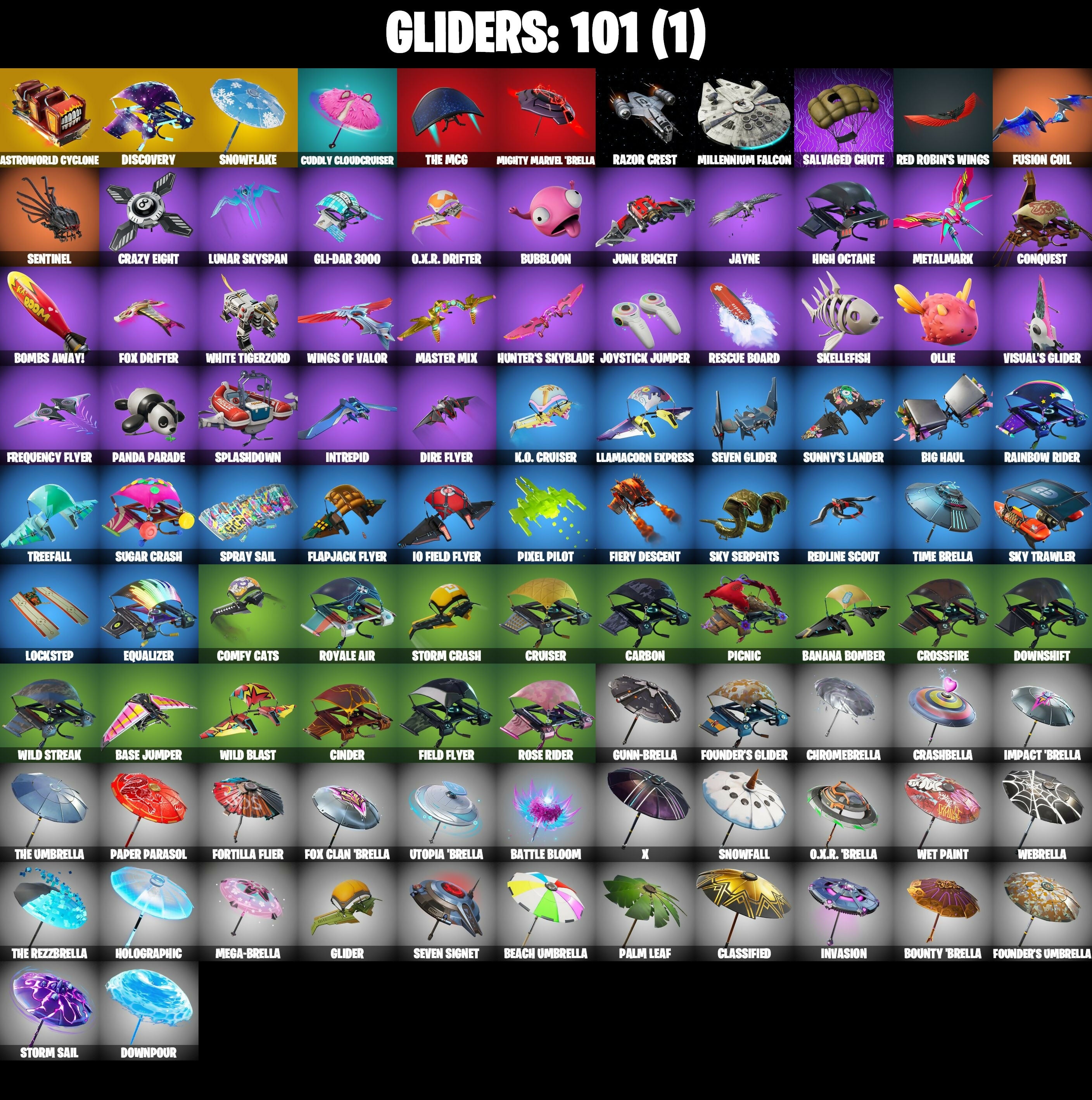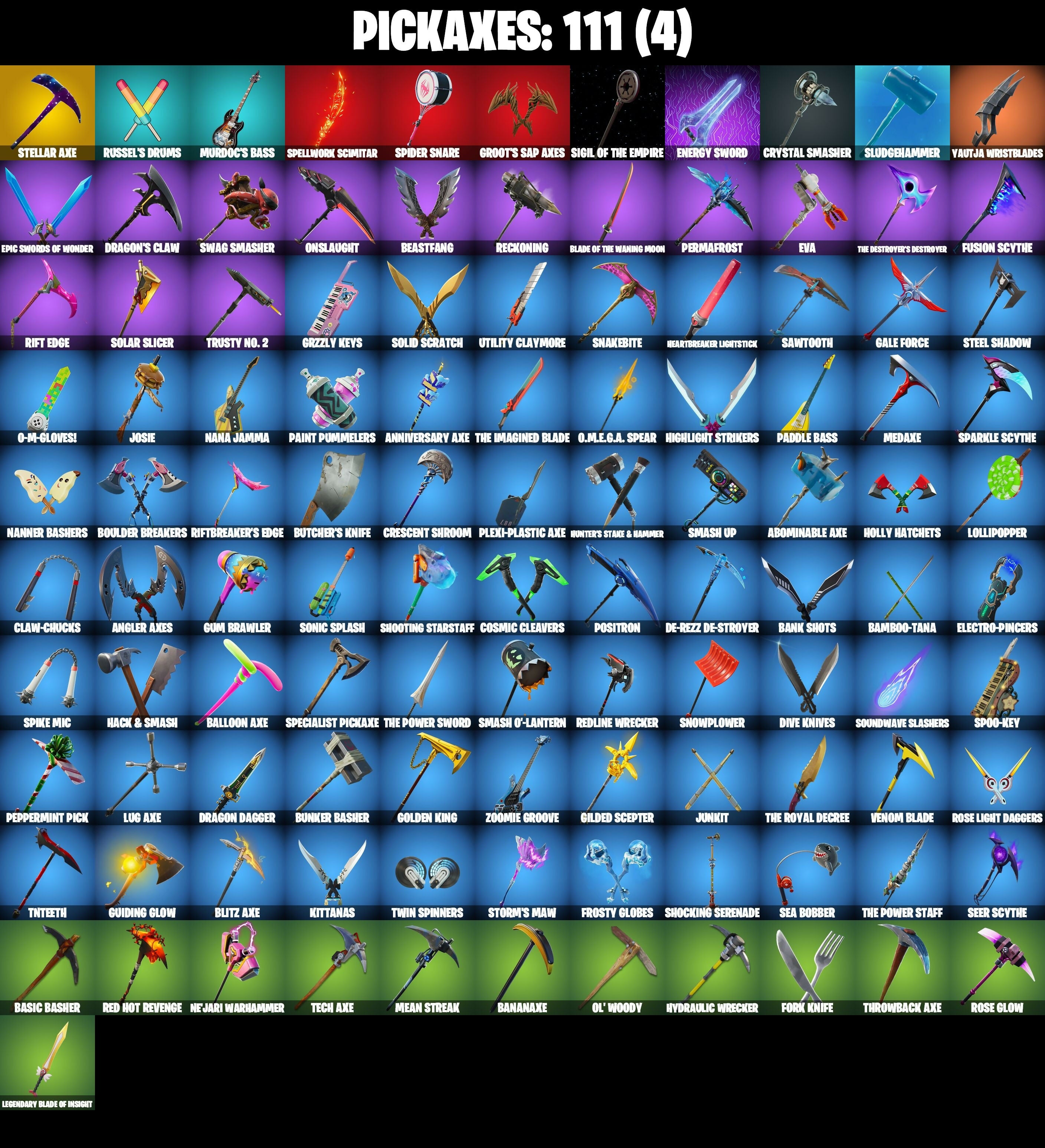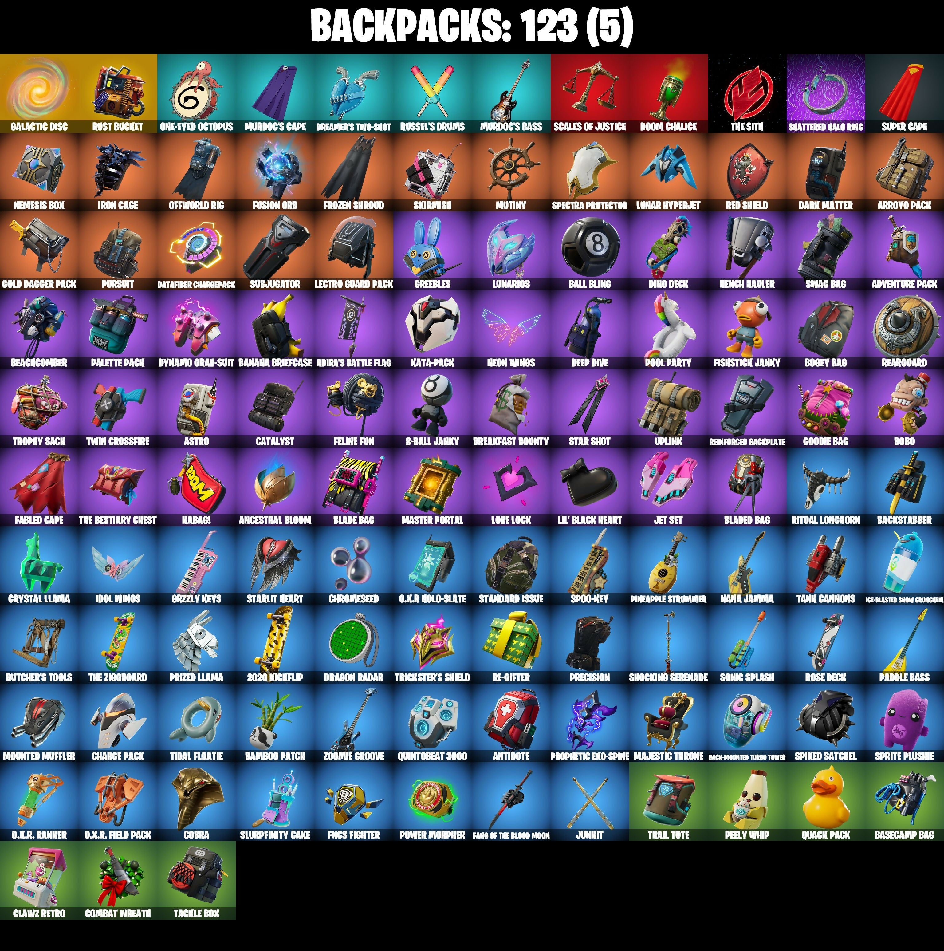 2020 Kickflip, 8-Ball Janky, 8-Ball Vs Scratch, 8-Ball Vs Scratch (Corrupted), Abominable Axe, Adira's Battle Flag, Adventure Pack, Agent Patch, Agent Peely, Ancestral Bloom, Angler Axes, Anniversary Axe, Antidote, Arroyo Pack, Ascend!, Astro, Astroworld Cyclone, Augury, Back-Mounted Turbo Tower, Backstabber, Ball Bling, Baller, Balloon Axe, Bamboo Patch, Bamboo-Tana, Banana Bomber, Banana Briefcase, Bananaxe, Bank Shots, Base Jumper, Basecamp Bag, Basic Basher, Battle Bloom, Battle Gamer Mae, Battle Mode, Battlehawk, Beach Umbrella, Beachcomber, Beastfang, Beep Beep, Best Mates, Big Haul, Bike To Go, Blackheart, Blackheart (Stage 8), Blade Bag, Blade of the Waning Moon, Bladed Bag, Blitz Axe, Blowing Bubbles, Bobo, Bogey Bag, Boing!, Bombs Away!, Boogie Down, Boomin', Boulder Breakers, Bounty 'Brella, Breakdown, Breakfast Bounty, Breakneck, Brutus, Bubbloon, Bunker Basher, Butcher's Knife, Butcher's Tools, Buzz Beat, Calamity, Calamity (Stage 5), Calculated, Call Me, Cameo Vs Chic, Carbide, Carbon, Catalyst, Charge Pack, Choice Knit, Chromebrella, Chromeseed, Cinder, Classified, Claw-chucks, Clawz Retro, Clean Sweep, Cobalt, Cobra, Coin Flip, Combat Wreath, Comfy Cats, Conga, Conquest, Cosmic Cleavers, Crashbella, Crazy Eight, Crescent Shroom, Crimson Scout, Crossfire, Crowning Achievement, Cruiser, Crystal Llama, Crystal Smasher, Cuddly Cloudcruiser, Cyclo Curl, DJ Yonder, Dab, Dabstand, Dagger Dance, Danica, Dark Matter, Dark Voyager, Datafiber Chargepack, De-Rezz De-Stroyer, Deadpool, Deep Dive, Dino Deck, Dino Megazord, Dino Megazord (Dragonlord Battle Wolf), Dire Flyer, Discovery, Dive Knives, Doom Chalice, Downpour, Downshift, Dragon Dagger, Dragon Dagger's Song, Dragon Radar, Dragon Stance, Dragon's Claw, Dreamer's Two-Shot, Drift (Stage 5), Droop, Dynamo Grav-Suit, Electro Shuffle, Electro-Pincers, Elite Agent, Energy Sword, Enforcer, Epic Swords of Wonder, Equalizer, Eva, Explorer Emilie, FNCS Fighter, Fabled Cape, Fang Of The Blood Moon, Feline Fun, Field Flyer, Fiery Descent, Finger Guns, Fishstick Janky, Flapjack Flyer, Flippin' Away, Flippin' Incredible, For O.X.R.!, Fork Knife, Fortilla Flier, Founder's Glider, Founder's Umbrella, Fox Clan 'Brella, Fox Drifter, Frequency Flyer, Frosty Globes, Frozen Shroud, Fusion, Fusion Coil, Fusion Orb, Fusion Scythe, Galactic Disc, Galaxy, Gale Force, Gear Specialist Maya, General's War Table, Gentleman's Dab, Giddy-Up, Gilded Scepter, Gldar 3000, Glider, Gold Dagger Pack, Golden King, Golf Clap, Good Guy, Good Sportsmanship, Goodie Bag, Greebles, Green Ranger, Green Ranger (White Ranger), Grizzly Keys, Groot's Sap Axes, Groove Jam, Guiding Glow, Gum Brawler, Gunn-Brella, Hack & Smash, Hana Park, Heart Sign, Heartbreaker Lightstick, Hello Friend, Hench Hauler, High Five, High Octane, Highlight Strikers, Holly Hatchets, Holographic, Hula Hoopin', Hunter's Skyblade, Hunter's Stake & Hammer, Huntress, Hybrid, Hybrid (Stage 4), Hydraulic Wrecker, Hype, Hype!, I Declare!, I'm The Visual, Ice-Blasted Snow Cruncher, Idol Wings, Impact 'Brella, Imperial March, Intrepid, Invasion, Io Field Flyer, Iron Cage, It Is Finished, It's... You?, Jayne, Jaywalking, Jet Set, Josie, Journey Vs Hazard, Joystick Jumper, Jubilation, Junk Bucket, Junkit, K.O. Cruiser, Kabag!, Kata-Pack, Keep It Mello, Kick Ups, Kingsley, Kittanas, Laguna, Lectro Guard Pack, Legendary Blade of Insight, Lil' Black Heart, Lil' Ducky Train, Lil' Ghost, Lil' Zord, Llama Bell, Llamacorn Express, Lockstep, Lollipopper, Love It!, Love Lock, Lt. Evergreen, Lt. Ripp Slade, Lug Axe, Lunar Hyperjet, Lunar Skyspan, Lunarios, Majestic Throne, Mancake, Mandalorian, Marsh Walk, Master Mix, Master Portal, Mave, Mean Streak, Meat Grinder, Mecha Team Leader, Medaxe, Mega-Brella, Meowscles, Metalmark, Mic Drop, Microflip, Midas (Fully Golden), Mighty Marvel 'Brella, Millennium Falcon, Mission Specialist, Moonwalker, Mounted Muffler, Mr. Dappermint, Murdoc, Murdoc's Bass, Murdoc's Cape, Mutiny, Nailed It, Nana Jamma, Nanner Bashers, Ne'jari Warhammer, Nemesis Box, Neon Wings, O-m-gloves!, O.M.E.G.A. Spear, O.X.R Field Pack, O.X.R Holo-Slate, O.X.R Ranker, O.X.R. 'Brella, O.X.R. Drifter, Offworld Rig, Ol' Woody, Ollie, Omega, Omen Hunter Calamity, Omen Hunter Calamity (Corrupted Omen Calamity), One-Eyed Octopus, Onslaught, Onyx Winter, Orange Justice, Paddle Bass, Paint Pummelers, Palette Pack, Palm Leaf, Panda Parade, Pandemonium, Paper Parasol, Paws & Claws, Peely, Peely Whip, Peppermint Pick, Permafrost, Picnic, Pig The Butcher, Pineapple Strummer, Pixel Pilot, Plexplastic Axe, Polar Peely, Pony Up, Pool Party, Popcorn, Positron, Power Morpher, Precision, Predator, Prized Llama, Prophetic Exo-Spine, Pursuit, Quack Pack, Quintobeat 3000, Ragnarok (Stage 6), Rainbow Rider, Raven, Razor Crest, Re-Gifter, Rearguard, Reckoning, Red Hot Revenge, Red Knight, Red Robin's Wings, Red Shield, Red Strike, Redline, Redline Racer, Redline Racer (Afterburn Racer), Redline Scout, Redline Wrecker, Reese, Regal Wave, Reinforced Backplate, Remedy Vs Toxin, Reporting For Duty, Rescue Board, Rescue Run, Respect, Respect The Peace, Ride The Pony, Rift Break, Rift Edge, Riftbreaker's Edge, Riftreaver Drift, Rippley Vs Sludge, Ritual Longhorn, Rock Out, Rogue Agent, Rook, Rose Deck, Rose Glow, Rose Light Daggers, Rose Rider, Rose Team Leader, Royale Air, Running Man, Russel, Russel's Drums, Rust Bucket, Rust Lord, Sad Trombone, Salute, Salvaged Chute, Sawtooth, Scales Of Justice, Scarlet Commander, Sea Bobber, Sedona, Seer Scythe, Sentinel, Seven Glider, Seven Signet, Shaolin Sip, Sharpshooter, Shattered Halo Ring, Shocking Serenade, Shooting Starstaff, Side Hustle, Sidewinder, Sigil of the Empire, Sing Along, Skellefish, Skirmish, Sky Serpents, Sky Trawler, Skye, Sledgehammer, Slow Clap, Sludgehammer, Slurpfinity Cake, Smash O'-Lantern, Smash Up, Snakebite, Snoozefest, Snowfall, Snowflake, Snowplower, Snowshaker, So Square, Solar Slicer, Solid Scratch, Sonic Splash, Soundwave Slashers, Sparkle Scythe, Sparkle Supreme,