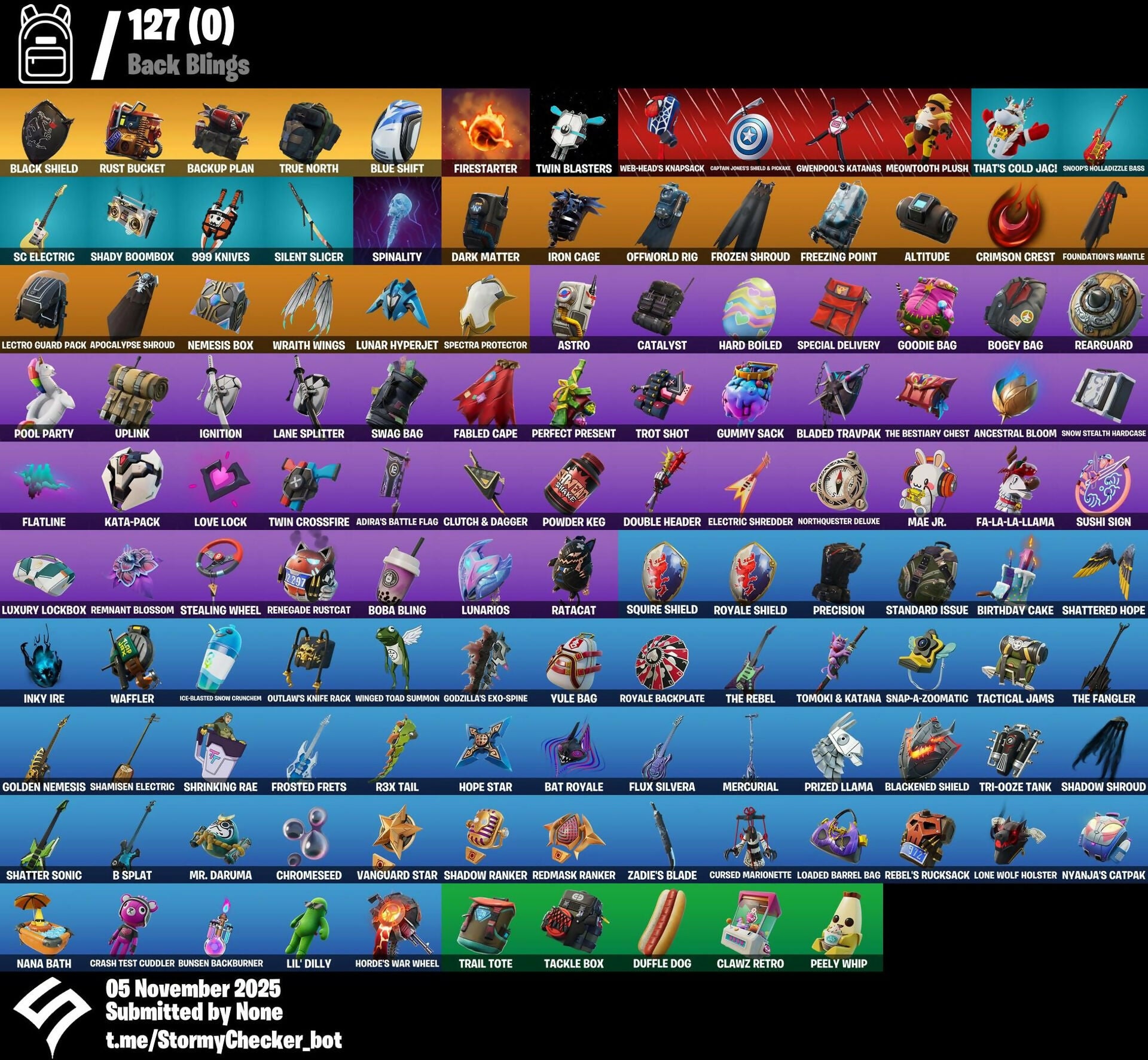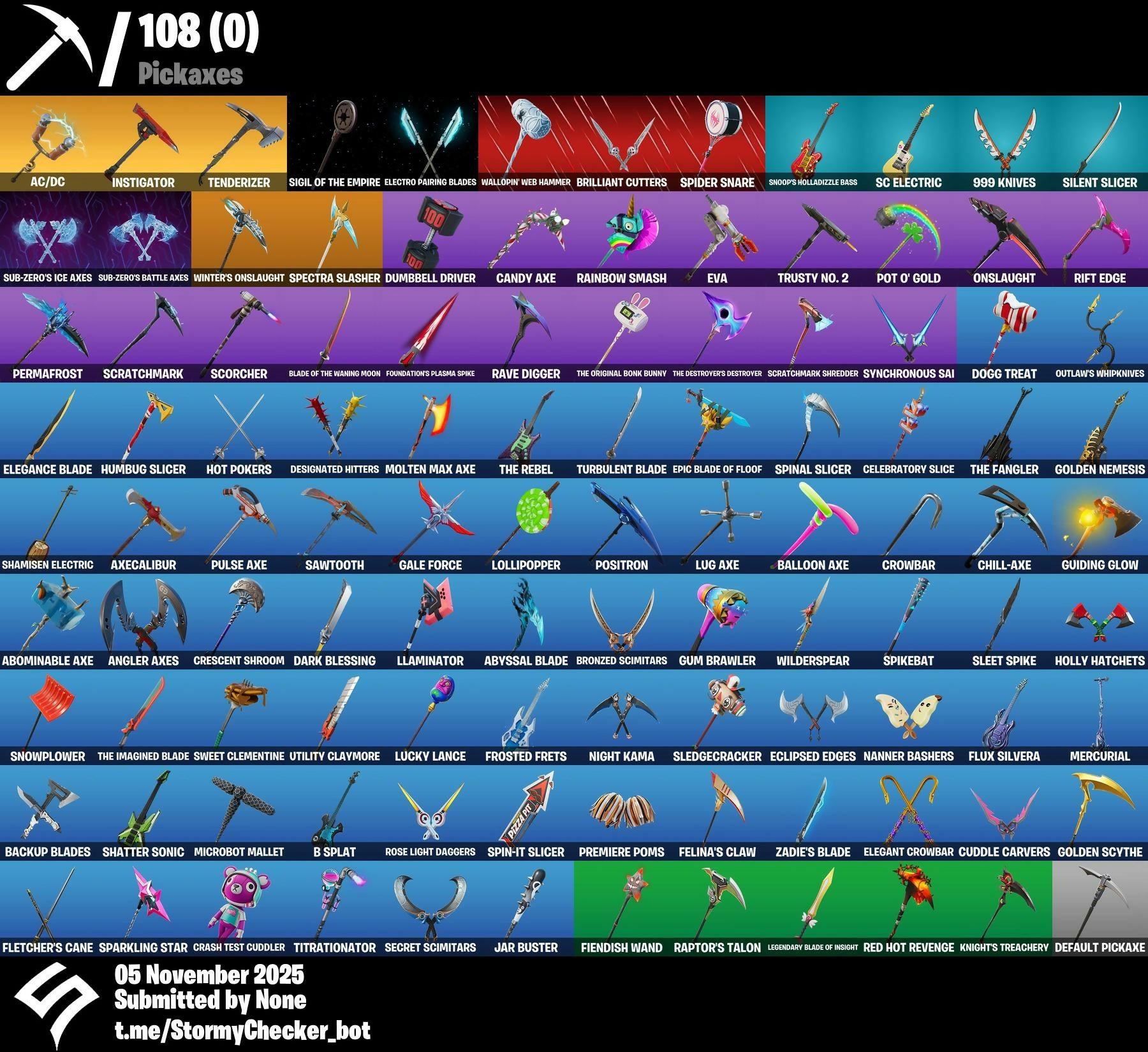 999 Knives, Abominable Axe, Absenz, Abyssal Blade, Ac/Dc, Adira's Battle Flag, Afk, Aftermath, Ahsoka Tano, Altitude, Ancestral Bloom, Angler Axes, Antonia, Apocalypse Shroud, Arctic Adeline, Astro, Axecalibur, B Splat, Backup Blades, Backup Plan, Balloon Axe, Baron's Hoard, Bat Royale, Battlehawk, Best Mates, Bet, Big Dill, Birthday Cake, Black Knight, Black Shield, Blackened Shield, Blade Of The Waning Moon, Bladed Travpak, Blaze, Bloomin' Bouquet, Blue Shift, Blue Squire, Blue Streak, Blue Striker, Blue Team Leader, Boba Bling, Bogey Bag, Boneless, Boogie Down, Boot It, Breakdown, Breakin', Brilliant Cutters, Brite Bomber, Bronzed Scimitars, Brseason1, Bunsen Backburner, Calculated, Candy Axe, Captain Llamerica, Carbide, Cassidy Quinn, Cat Flip, Catalyst, Cauldron Chill, Celebratory Slice, Chill-Axe, Choice Knit, Chromeseed, Clawz Retro, Close To You, Clutch & Dagger, Count It!, Crack It, Crash Test Cuddler, Crescent Shroom, Crimson Crest, Crowbar, Crowning Achievement, Cuddle Carvers, Cursed Marionette, Cyclo Curl, Dab, Dagger Dance, Dance Moves, Dark Blessing, Dark Matter, Dark Voyager, Default Pickaxe, Designated Hitters, Dice Roll, Do The 'Split, Dogg Treat, Double Header, Doze Dab, Drift, Duelist's Card Trick, Duffle Dog, Dumbbell Driver, D’Ark, Eclipsed Edges, Electric Shredder, Electro Pairing Blades, Electro Shuffle, Elegance Blade, Elegant Crowbar, Elite Agent, Epic Blade Of Floof, Eva, Fa-La-La-Llama, Fabled Cape, Felina, Felina's Claw, Fiendish Wand, Firestarter, Fish Thicc, Fist Bump, Flaky Feast, Flapper, Flashback Breakdown, Flatline, Fletcher Kane, Fletcher's Cane, Floss, Flux Silvera, Foundation's Mantle, Foundations Plasma Spike, Freestylin', Freezing Point, Frostbite, Frosted Frets, Frozen Shroud, Frozen Treat Cart, Gale Force, Gentleman's Dab, Godzilla's Exo-Spine, Golden Nemesis, Golden Scythe, Golf Clap, Goodie Bag, Groove Jam, Guiding Glow, Gum Brawler, Gumbo, Gummy Sack, Gwenpool's Katanas, Hard Boiled, Harlowe, Have A Seat, Haven, Havoc, Headhunter Prime, Hello Friend, Heron Stance Hero, High Five, Holly Hatchets, Hope, Hope Star, Horde's War Wheel, Hot Pokers, Hulk Smash!, Humbug Slicer, Huntress, Hype, Hypnot-Eyes, I'm A Mystery, Ice-Blasted Snow Crunchem, Ignition, Imperial March, Infinite Dab, Inky Ire, Instigator, Iron Cage, It Is Finished, It's Chemistry!, It's... You?, Jar Buster, Jet Signals, Joss, Journey Vs Hazard, Jubilation, Kado Thorne, Kata-Pack, Keisha Cross, Khaby Lame, Knight's Treachery, Krisabelle, Lane Splitter, Lazy Shuffle, Lectro Guard Pack, Legendary Blade Of Insight, Lil Split, Lil' Dilly, Lil' Longboat, Lil' Monster, Lil' Prancer, Lil' T-6 Shuttle, Llaminator, Loaded Barrel Bag, Lollipopper, Lone Wolf Holster, Looking Good, Love It!, Love Lock, Lt. John Llama, Lucky Lance, Lug Axe, Lunar Charge, Lunar Hyperjet, Lunarios, Luxury Lockbox, Lynx, Mae, Mae Jr., Major Mancake, Make It Rain, Make Some Waves, Meowtooth Plush, Mercurial, Microbot Mallet, Mine, Mission Specialist, Molten Max Axe, Moonwalker, Mr. Daruma, Mwahaha, Nana Bath, Nanner Bashers, Nemesis Box, Night Kama, Nog Ops, Nolan Chance, Northquester Deluxe, Nyanja's Catpak, Offworld Rig, Omega, Omegarok, Onslaught, Orange Justice, Outlaw Midas, Outlaw's Knife Rack, Outlaw's Mugshot, Outlaw's Strut, Outlaw's Whipknives, Overtaker, Party Hips, Peely Whip, Perfect Present, Permafrost, Piper Pace, Pitcycle, Point & Shoot, Polar Peely, Polychrome Sunset, Pony Up, Pool Party, Popcorn, Positron, Pot O' Gold, Powder Keg, Precision, Premiere Poms, Prized Llama, Pulse Axe, R3X Tail, Rabbit Raider, Rage Quit, Ragnarok, Rainbow Smash, Raptor's Talon, Ratacat, Rave Digger, Raven, Raven's Legion, Rearguard, Rebel's Rucksack, Recon Raptor, Red Card, Red Hot Revenge, Redline, Redmask Ranker, Regal Wave, Remnant Blossom, Renegade Lynx, Renegade Rustcat, Respect, Respect The Peace, Ride The Pony, Rift Edge, Rock Paper Scissors, Rogue Agent, Ronin, Rook, Rose Light Daggers, Royale Backplate, Royale Knight, Royale Shield, Rust Bucket, Rust Lord, SC Electric, Salute, Santa Dogg, Sawtooth, Scorcher, Scratchmark, Scratchmark Shredder, Secret Scimitars, Sgt. Green Clover, Sgt. Winter, Shadow Boxer, Shadow Play: Toad, Shadow Ranker, Shadow Shroud, Shady Boombox, Shamisen Electric, Shanta, Shatter Sonic, Shattered Hope, Shimmer, Shrinking Rae, Sigil Of The Empire, Silent Slicer, Skull Ranger, Slayer Juice Wrld, Sled Ready Goff, Sledgecracker, Sledgehammer, Sleet Spike, Slim Shady, Slipstream, Slow Clap, Snap, Snap-A-Zoomatic, Snoop's Holidazzle Bass, Snoop's Holladizzle Bass, Snow Stealth Hardcase, Snow Stealth Slone, Snowplower, Sparkle Specialist, Sparkling Star, Special Delivery, Spectra Knight, Spectra Protector, Spectra Slasher, Spider Snare, Spider-Man, Spikebat, Spin-It Slicer, Spinal Slicer, Spinality, Squad Leader, Squire Shield, Stand Surfer, Standard Issue, Stargazing, Stealing Wheel, Steamed, Step It Up, Sub Commander, Sub-Zero (Mk3), Sub-Zero's Battle Axes, Sub-Zero's Ice Axes, Sun Strider, Sushi Sign, Swag Bag, Sweet Clementine, Sweet!, Swipe It, Swirl Girl, Synchronous Sai, Tackle Box, Tactical Jams, Take 14, Take It Slow, Take The Elf, Take The L, Teknique, Tenderizer, That's Cold Jac!, The Ace, The Bestiary Chest, The Big Bang, The Break, The Break Shot, The Destroyer's Destroyer, The Dip, The Fangler, The Foundation, The Imagined Blade, The Original Bonk Bunny, The Reaper, The Rebel, The Robot, The Visitor, The Worm, Titrationator, Toasty Roast, Tomatohead, Tomoki & Katana, Trail Tote, Trailblazer, Tri-Ooze Tank, Trot Shot, True North, Trusty No. 2, Turbulent Blade, Turk Vs Riptide, Twin Blasters, Twin Crossfire, Uplink, Utility Claymore, Valentina, Valentina's Verve, Valor, Vanguard Star, Waffler, Wallopin' Web Hammer, Waterworks, Wave, Web-Head's Knapsack, Whiteout, Wilderspear, Winged Toad Summon, Wingman, Winter's Onslaught, Wraith Wings, X-Lord, Xo (Only If You Say Yes), Yay!, You're Awesome, Yule Bag, Yulejacket, Zadie's Blade, Zenith, Zoey