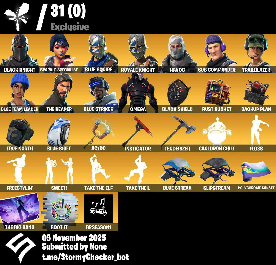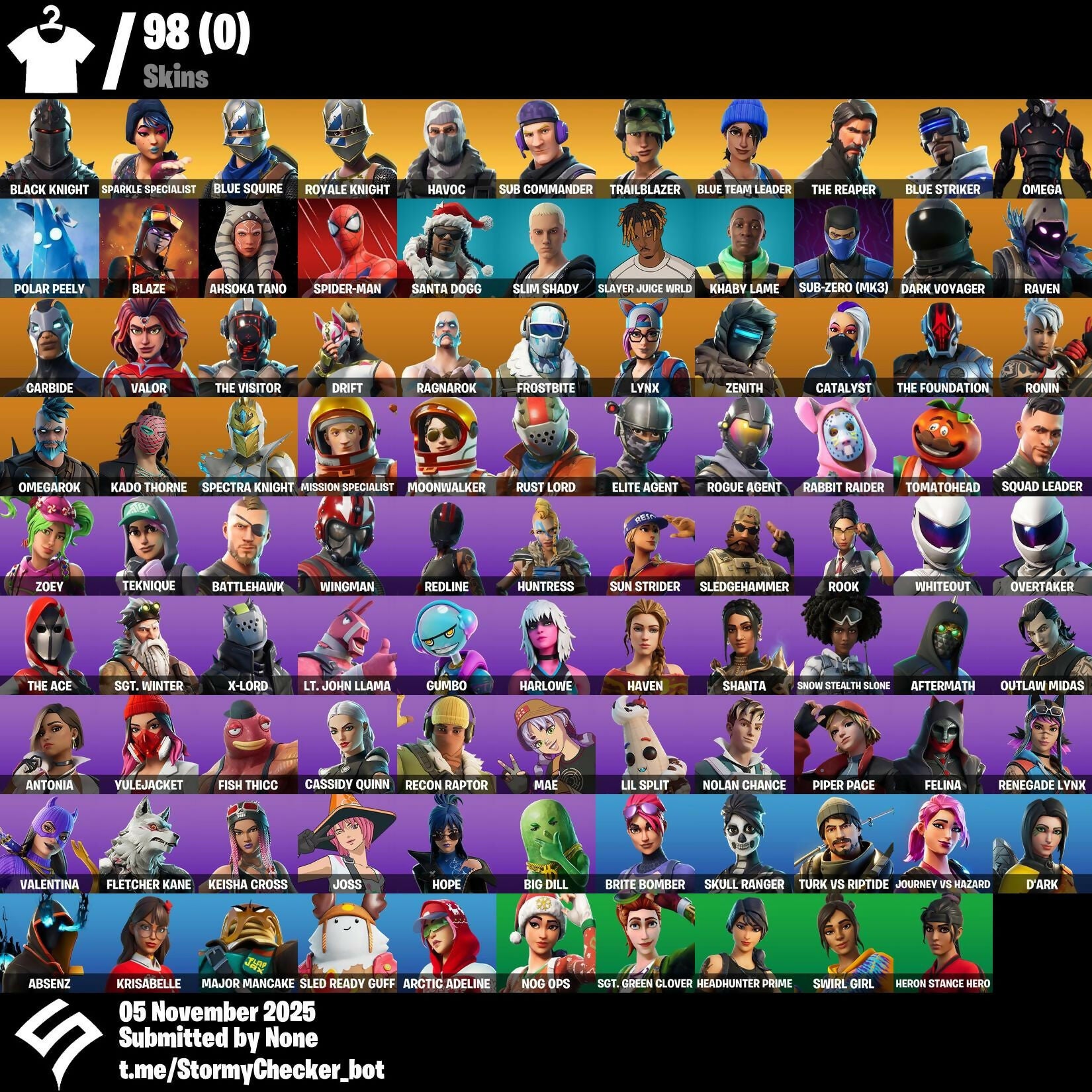 98 Skins ✅ Black Knight ✅ Sparkle Specialist ✅ Blue Squire ✅ Royale Knight ✅ Havoc ✅ Sub Commander ✅ Trailblazer ✅ AC/DC ✅ Instigator ✅ Tenderizer ✅