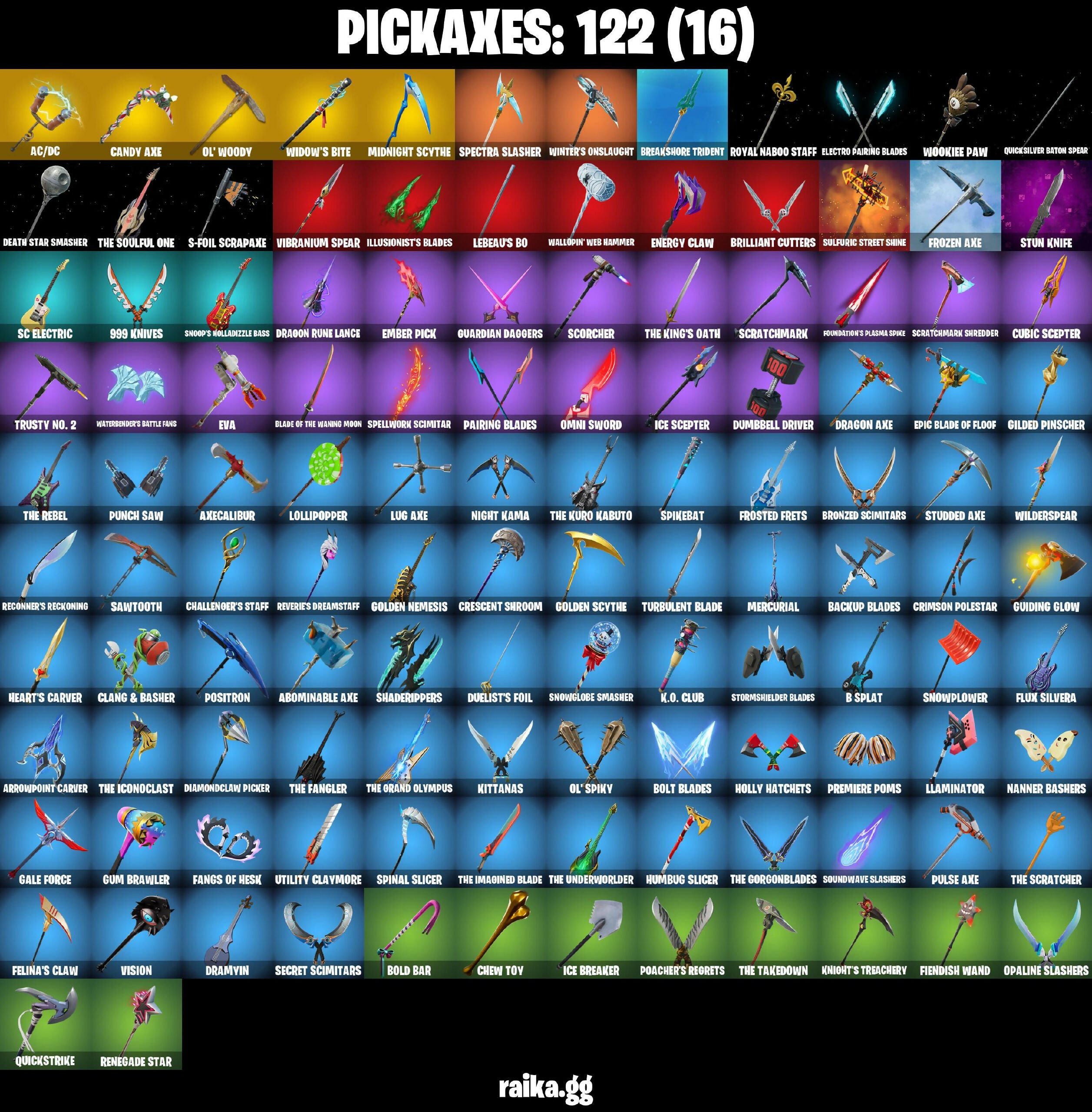 999 Knives, Abominable Axe, Ac/Dc, Adira, Aphrodite, Arm The Pumpkin!, Arrowpoint Carver, Artemis, Aura, Avatar's Flourish, Axecalibur, B Splat, Backup Blades, Battle Bus, Battlehawk, Bear Hug, Behold!, Best Mates, Billy, Birdie, Black Knight, Black Shield, Blade of the Waning Moon, Bloomin' Bouquet, Blowin' Up, Blue Squire, Bold Bar, Bolt Blades, Bombastic, Boogie Down, Breakshore Trident, Breezy, Brilliant Cutters, Bronzed Scimitars, Bunny Hop, Calculated, Call Me, Candy Axe, Captain Llamerica, Carbide, Card Drop, Cat Flip, Cauldron Chill, Cerberus, Challenger's Staff, Chew Toy, Choice Knit, Clang & Basher, Cobalt, Conch Call, Conjure Weapon, Crescent Shroom, Crimson Polestar, Criss Cross, Crowning Achievement, Cubic Scepter, Cyclo Curl, Dagger Dance, Dark Bomber, Dark Side, Dark Voyager, Death Star Smasher, Diamond Throne, Diamondclaw Picker, Distraction Dance, Do The Split, Doctor Strange, Doze Dab, Dragon Axe, Dragon Rune Lance, Dramyin, Duelist's Foil, Dumbbell Driver, Electro Pairing Blades, Elite Agent, Ember Pick, Energy Claw, Epic Blade of Floof, Erisa, Eva, Everybody Loves Me, Evie, Fallen Love Ranger, Fangs of Hesk, Felina, Felina's Claw, Fiendish Wand, Finger Guns, Firework, Fist Pump, Flapper, Flashback Breakdown, Flippin' Sexy, Floss, Flux Silvera, Foil Flex, Foundation's Plasma Spike, Free Flow, Frosted Frets, Frozen Axe, Gale Force, Gentleman's Dab, Get Funky, Gilded Pinscher, Golden Nemesis, Golden Scythe, Golf Clap, Grand Salute, Guardian Daggers, Guiding Glow, Gum Brawler, Gumbo, Gun Show, Gunnar, Harlowe, Harmonizer, Haven, Heart Sign, Heart's Carver, Hello Friend, Holiday Boxy, Holly Hatchets, Hope, Hot Marat, Hot Stuff, Humbug Slicer, Hype, I'm A Mystery, Ice Breaker, Ice Scepter, Ice Spice, Illusionist's Blades, Infinite Dab, Iridia Vayne, It Is Finished, It's... You?, Jabba Switchway, Jet Signals, Jump Around, K.O. Club, Kiara K.O., Kittanas, Knife Sharpener, Knight's Treachery, Korra, Krisabelle, Laugh It Up, Lebeau's Bo, Lewis Hamilton, Lil Split, Lil' Longboat, Lil' Monster, Llama Bell, Llaminator, Lollipopor, Love It!, Lt. John Llama, Lug Axe, Lunar Charge, Lynx, Make A Seat, Mchargirse Assault Trooper, Medusa, Mercurial, Mic Drop, Midnight Scythe, Mini Dogfight, Mission Specialist, Montague, Moonlit Mystery, Moonwalker, Mwahaha, Mysterious Fate, Nanner Bashers, Night Kama, Ninja Stance: Donnie, Ninja Stance: Leo, Ninja Stance: Mikey, Ninja Stance: Raph, Nisha, Ol' Spiky, Ol' Woody, Omegarok, Omni Sword, Onesie, Opaline Slashers, Orange Justice, Origami Battalion, Oscar, Pairing Blades, Par Patroller, Party Diva, Peter Griffin, Poacher's Regrets, Point & Shoot, Point It Out, Polar Peely, Polarity, Pony Up, Popcorn, Popular Vibe, Poseidon, Positron, Powder, Premiere Poms, Prowler, Pulse Axe, Punch Saw, Quicksilver Baton Spear, Quickstrike, Radiant Striker, Raven's Legion, Reconner's Reckoning, Regal Wave, Renegade Lynx, Renegade Star, Respect, Respect The Peace, Revel, Reverie, Reverie's Dreamstaff, Ride The Pony, Rock Paper Scissors, Rogue Agent, Ronin, Royal Naboo Staff, Royale Knight, Runway Racer, Rust Bucket, Rust Lord, S-Foil Scrapaxe, Salute, Santa Dogg, Sasquatchin', Sawtooth, Sc Electric, Scarlet Commander, Scorcher, Scorecard, Scratchmark, Scratchmark Shredder, Secret Scimitars, Segway Tour, Serpentine Summoning, Sgt. Winter, Shadebox, Shaderippers, Shanta, Shimmer, Silas Hesh, Skull Scout, Slayer Juice Wrld, Slim Shady, Slow Clap, Snap, Snoop's Holladizzle Bass, Snowflake, Snowglobe Smasher, Snowplower, Solid Snake, Soundwave Slashers, Sparkle Specialist, Spectra Knight, Spectra Slasher, Spellwork Scimitar, Spider-Man, Spikebat, Spinal Slicer, Sproing!, Steady, Stella, Stormshielder Blades, Studded Axe, Stun Knife, Sulfuric Street Shine, Summit Striker, Surf Witch, Surfin' Bird, Sweet Swing, Sweet!, T-Pose, Take A Bow, Take The Elf, Take The L, Team Burger, Tectonic Komplex, Teknique, Tempest Flight, The Ace, The Break Shot, The Fangler, The Foundation, The Gorgonblades, The Grand Olympus, The Ice King, The Iconoclast, The Imagined, The Imagined Blade, The King's Oath, The Kuro Kabuto, The Origin, The Reaper, The Rebel, The Robot, The Scratcher, The Soulful One, The Takedown, The Underworlder, The Weekend Combat, The Worm, Tigeress, Trog, True Love, Trusty No. 2, Tsuki 2.0, Turbulent Blade, Unwrapped, Utility Claymore, Valeria, Valor, Vanguard's Charge, Vengeance Jones, Vibranium Spear, Vision, Wallopin' Web Hammer, Waterbender's Battle Fans, Waterworks, Wave, Whiplash, Widow's Bite, Wilderspear, Winter's Onslaught, Winterfest Bushranger, Wookiee Paw, Yulejacket, Zenith, Zeus, Zoey